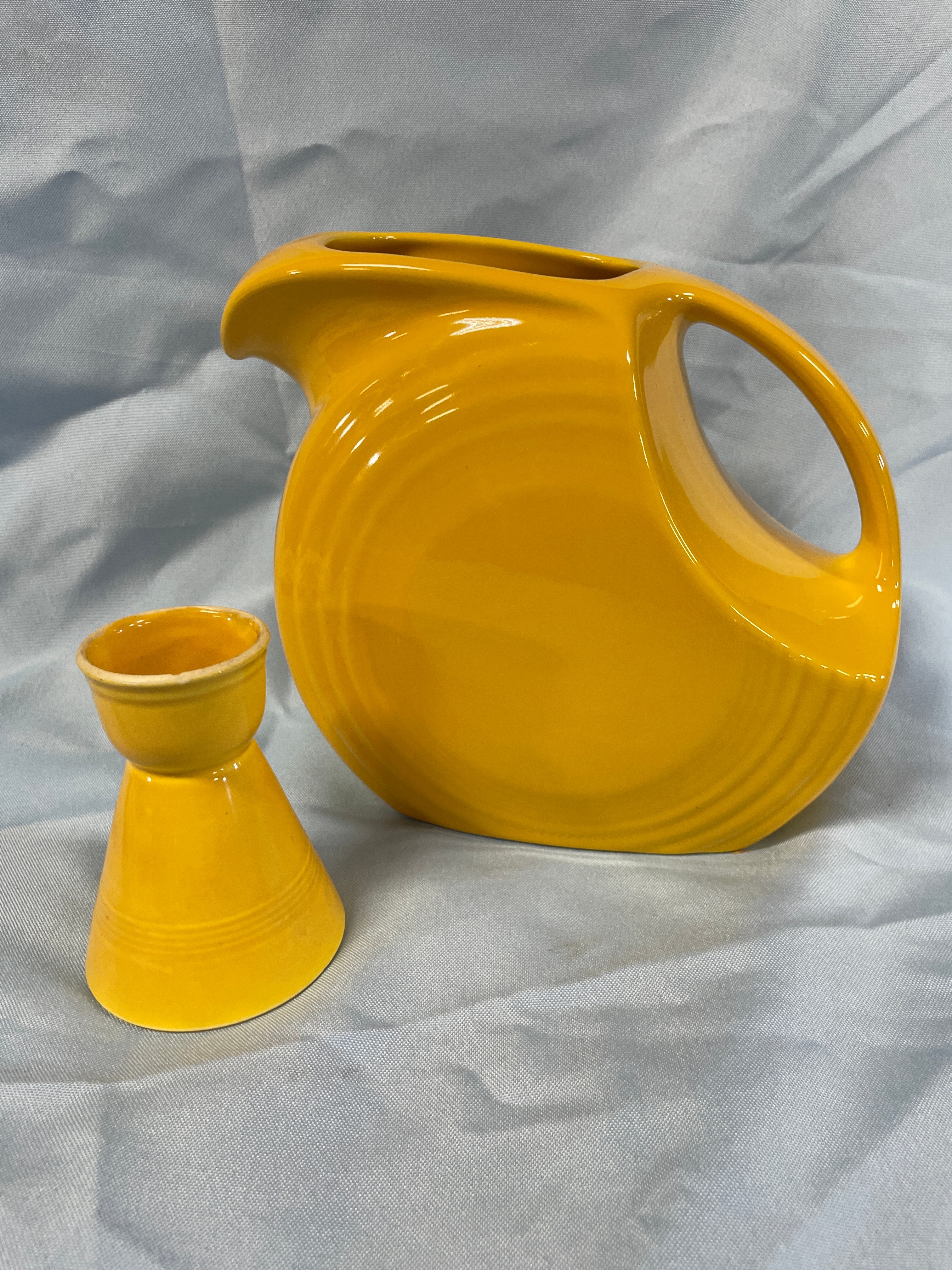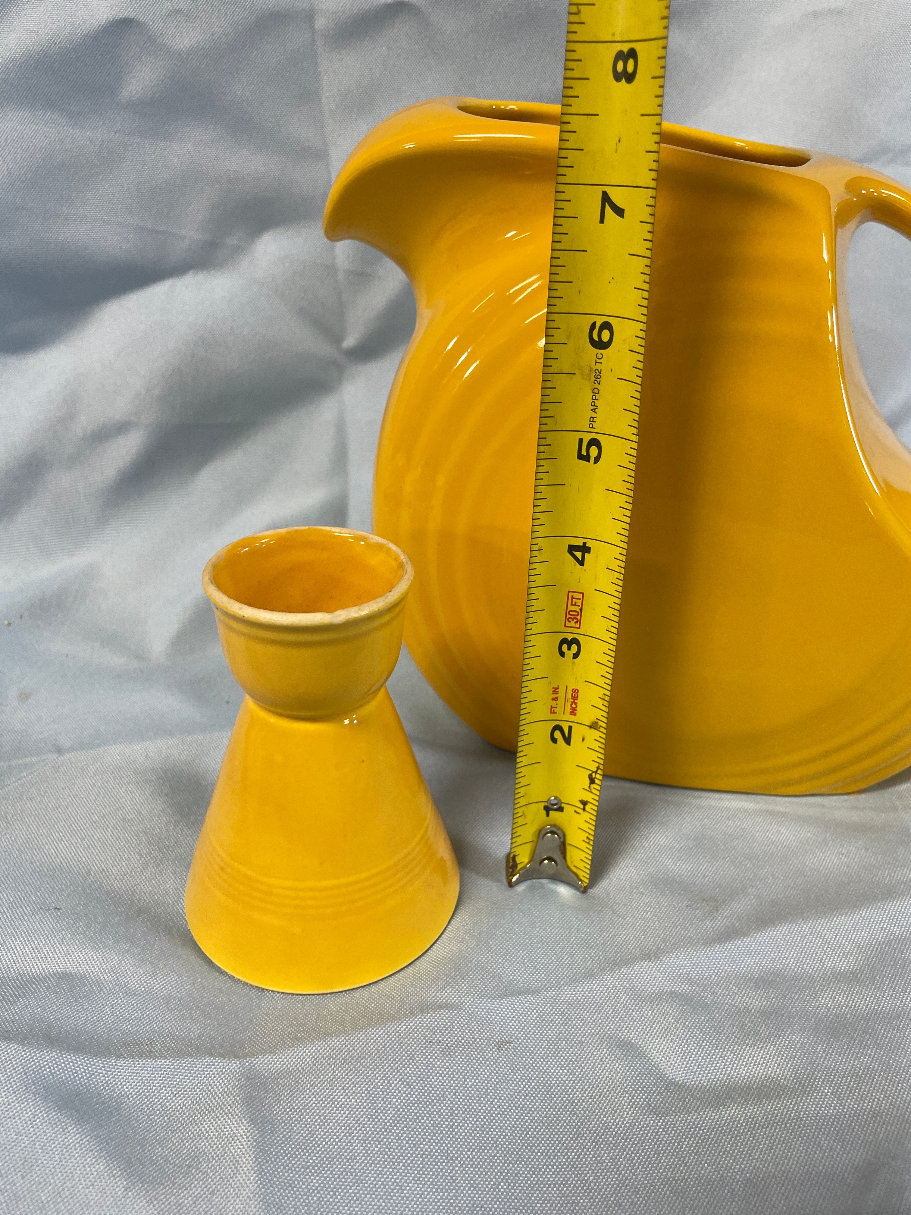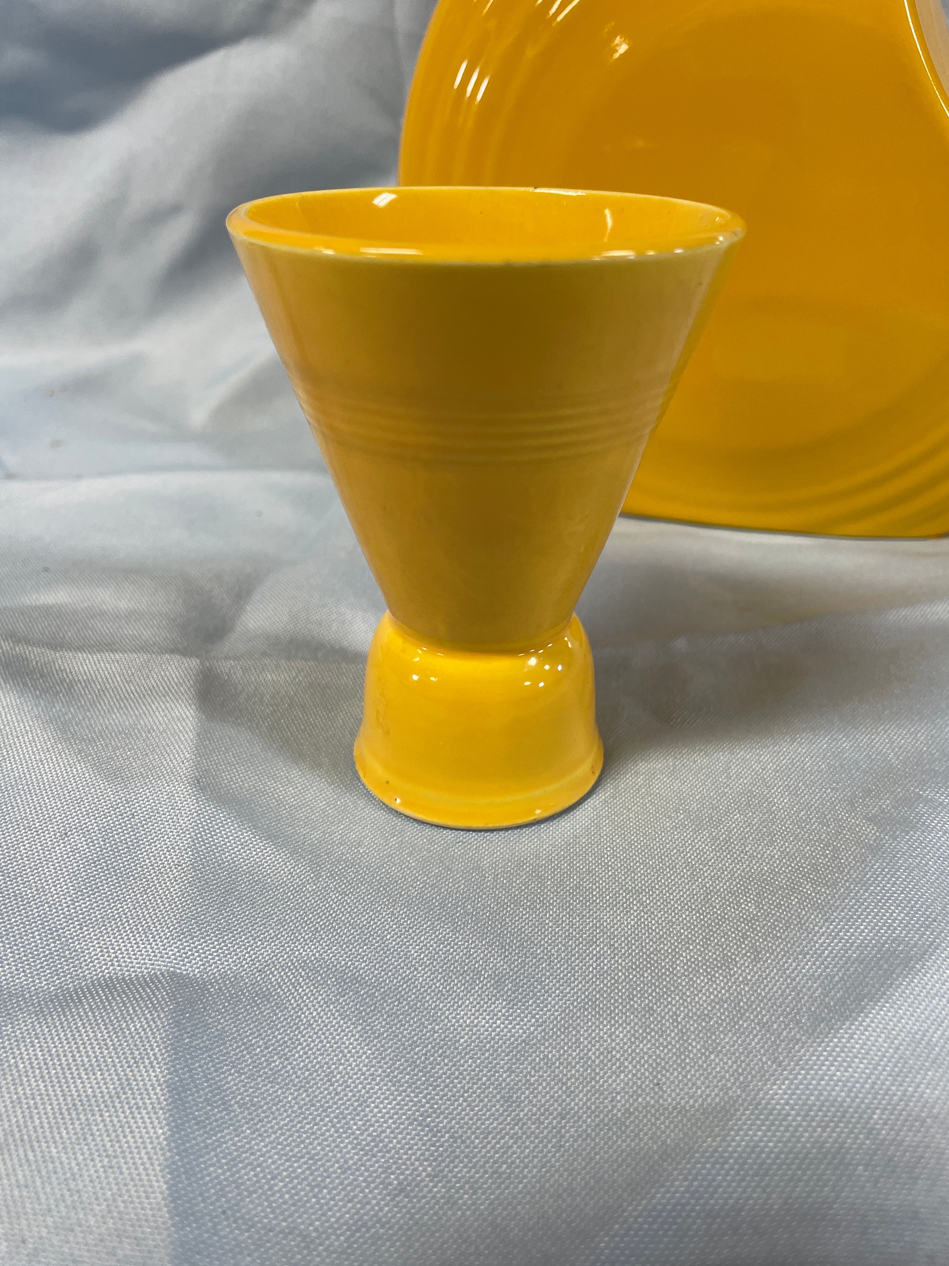 A yellow ceramic pitcher and egg cup the jigger measuring approximately 3.5 inches tall, with the pitcher inscribed “Fiesta Made in USA HL1” on its base.