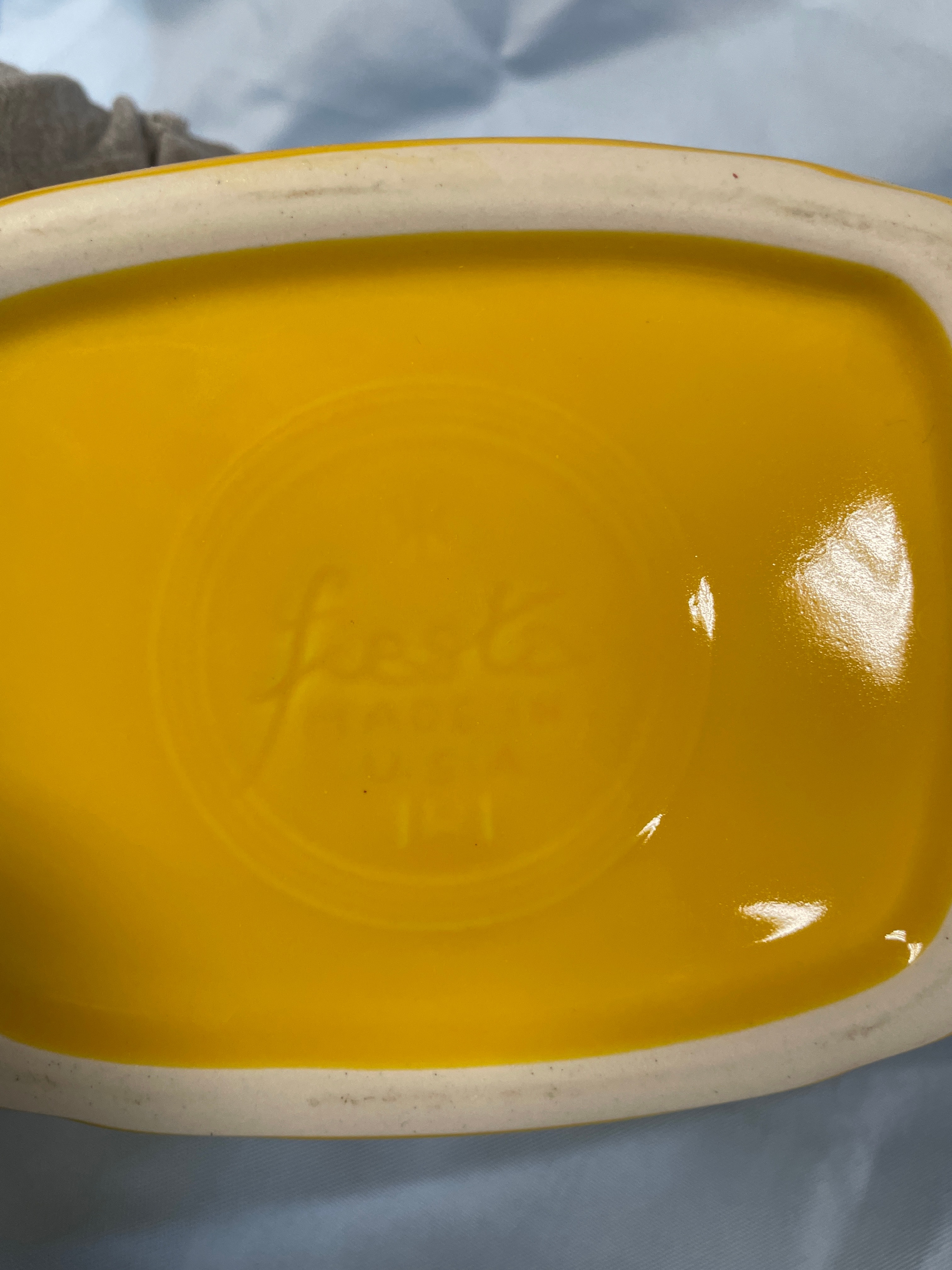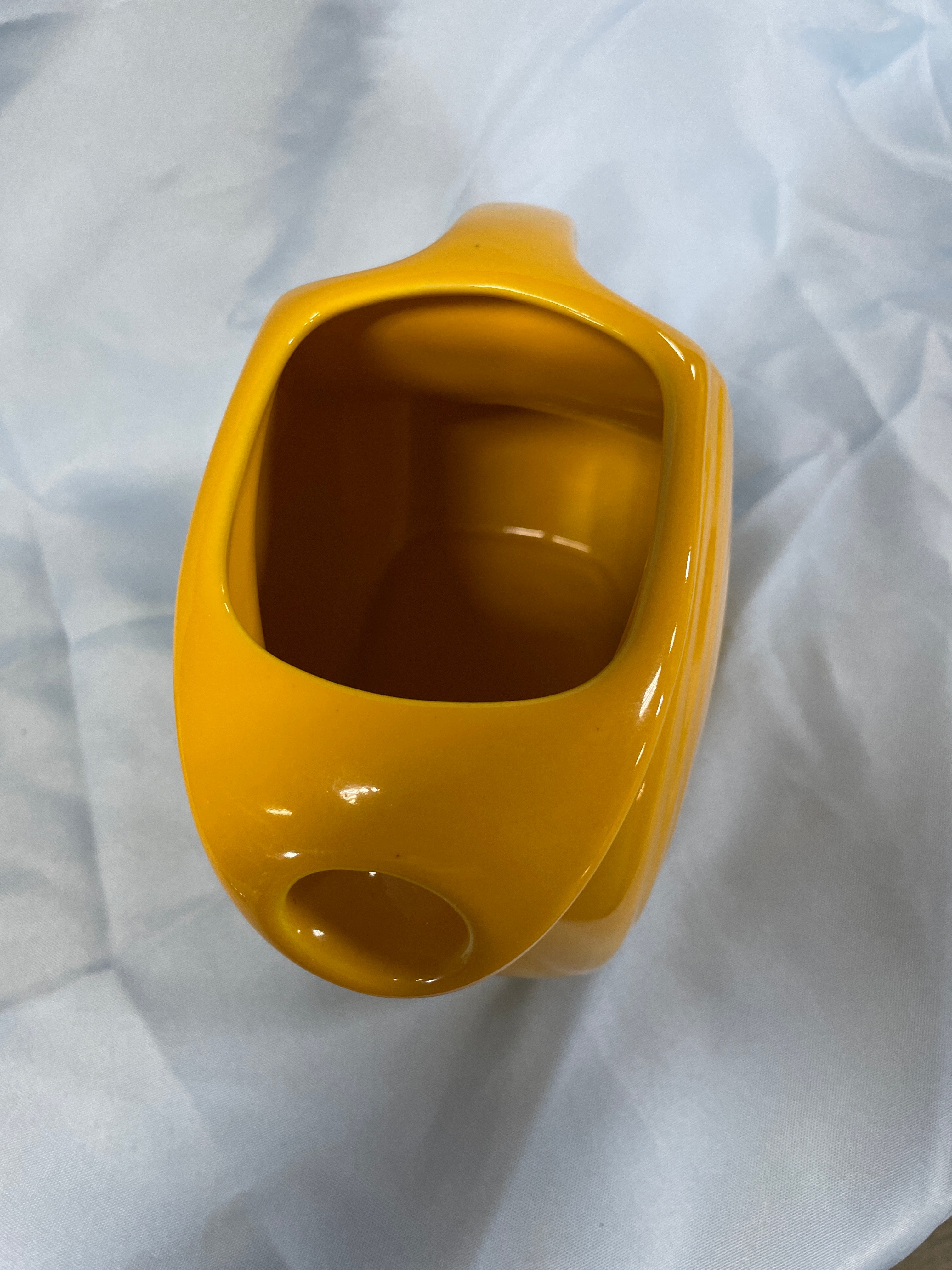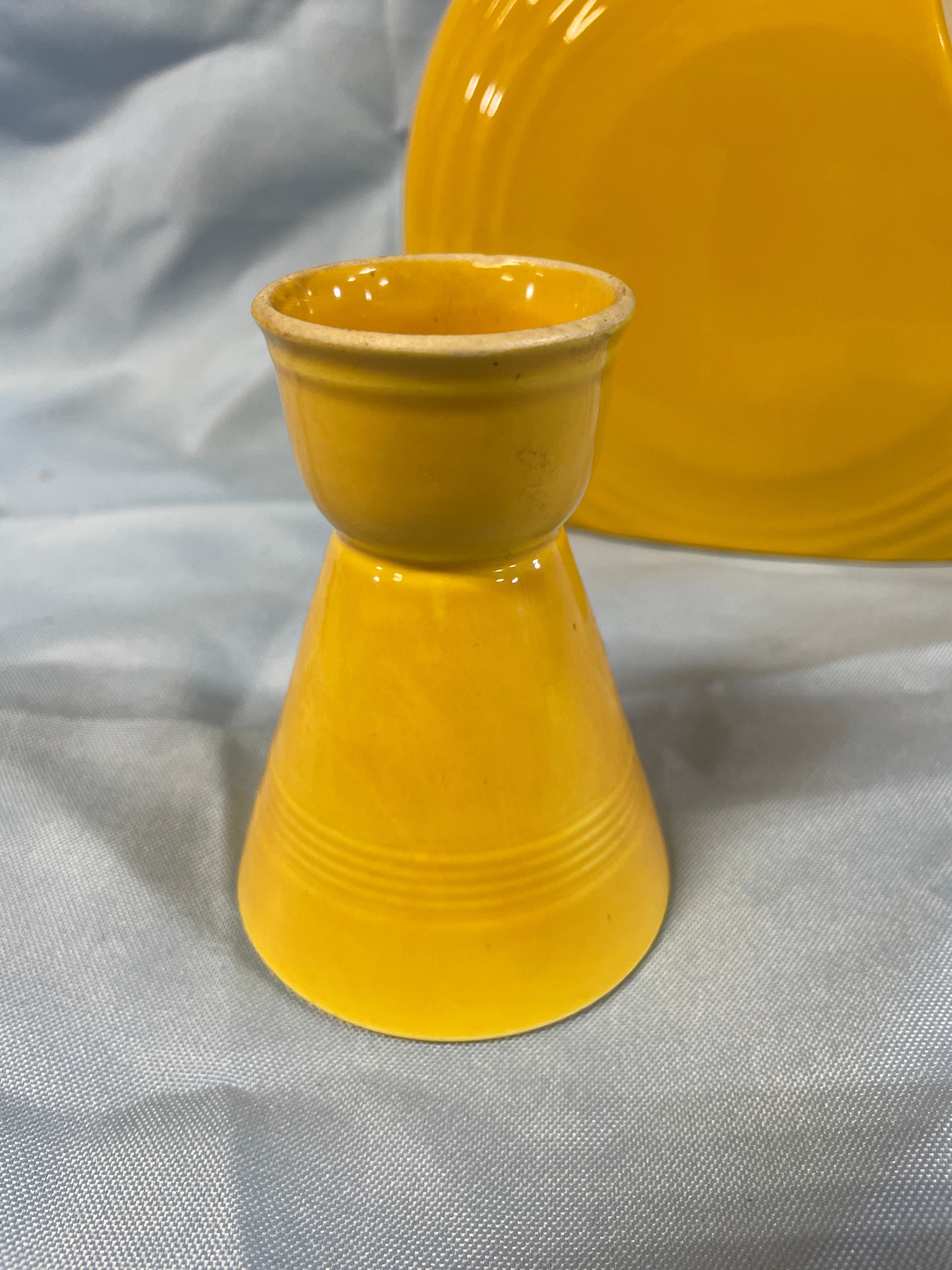 A yellow ceramic pitcher and egg cup the jigger measuring approximately 3.5 inches tall, with the pitcher inscribed “Fiesta Made in USA HL1” on its base.