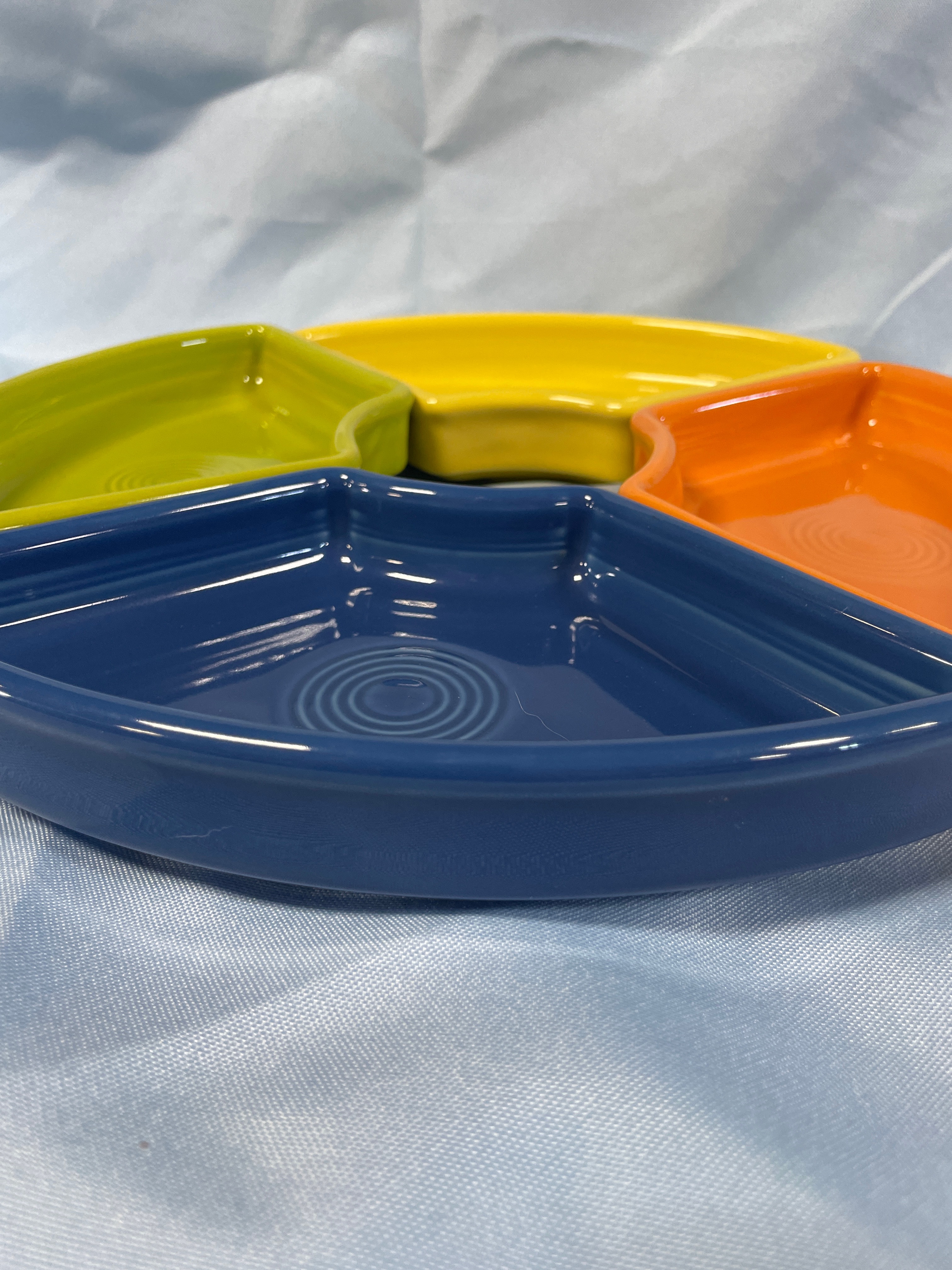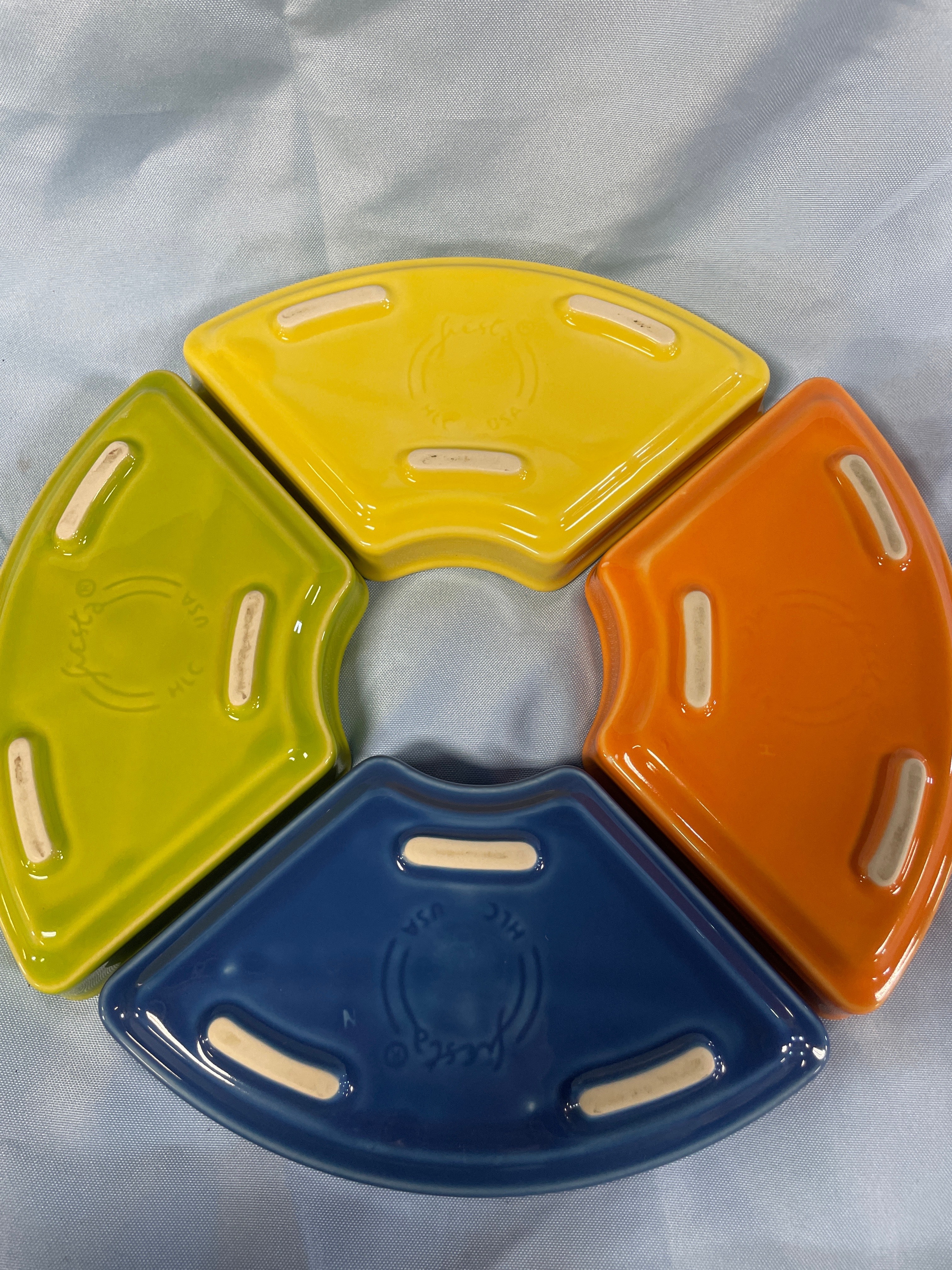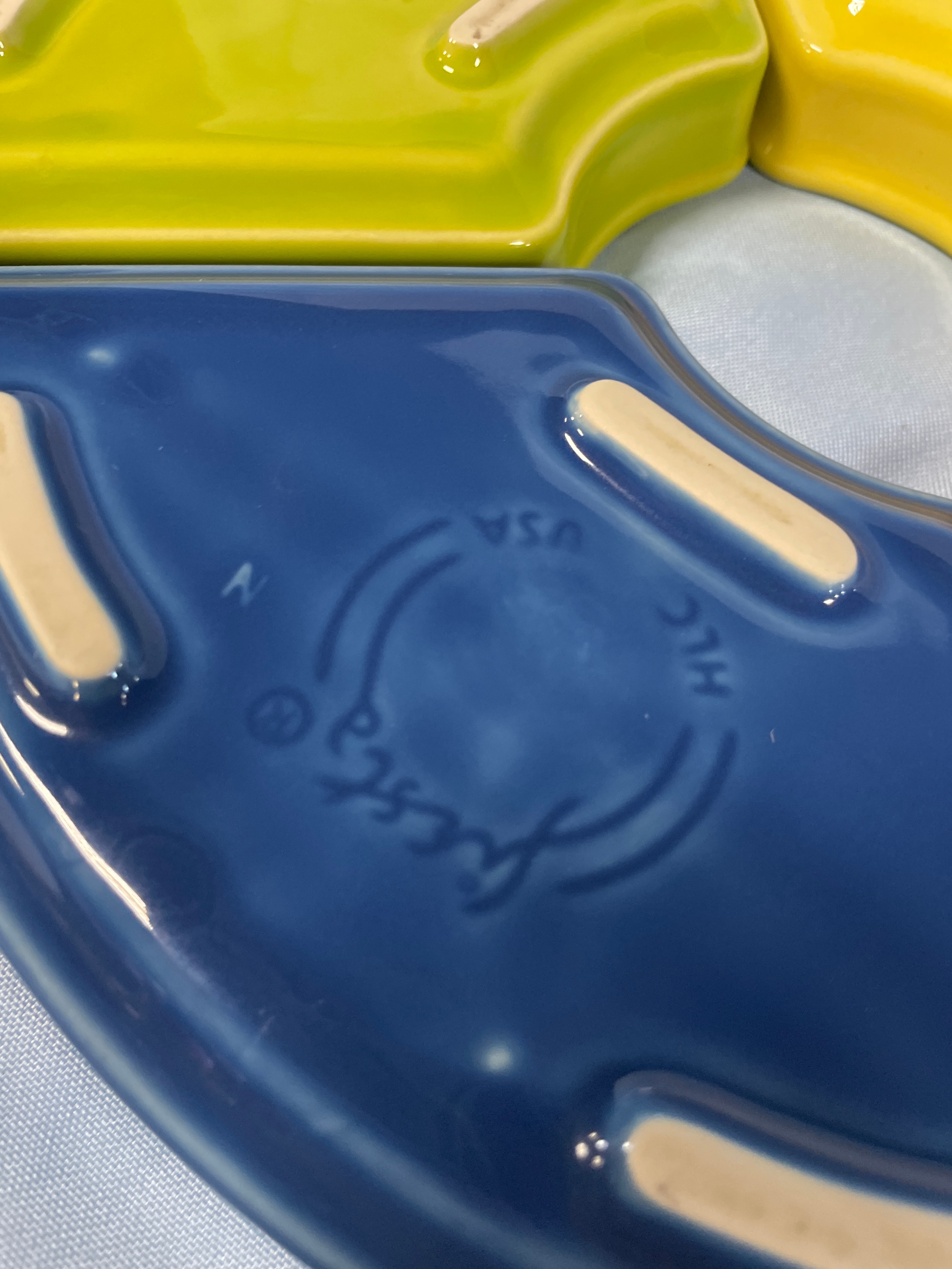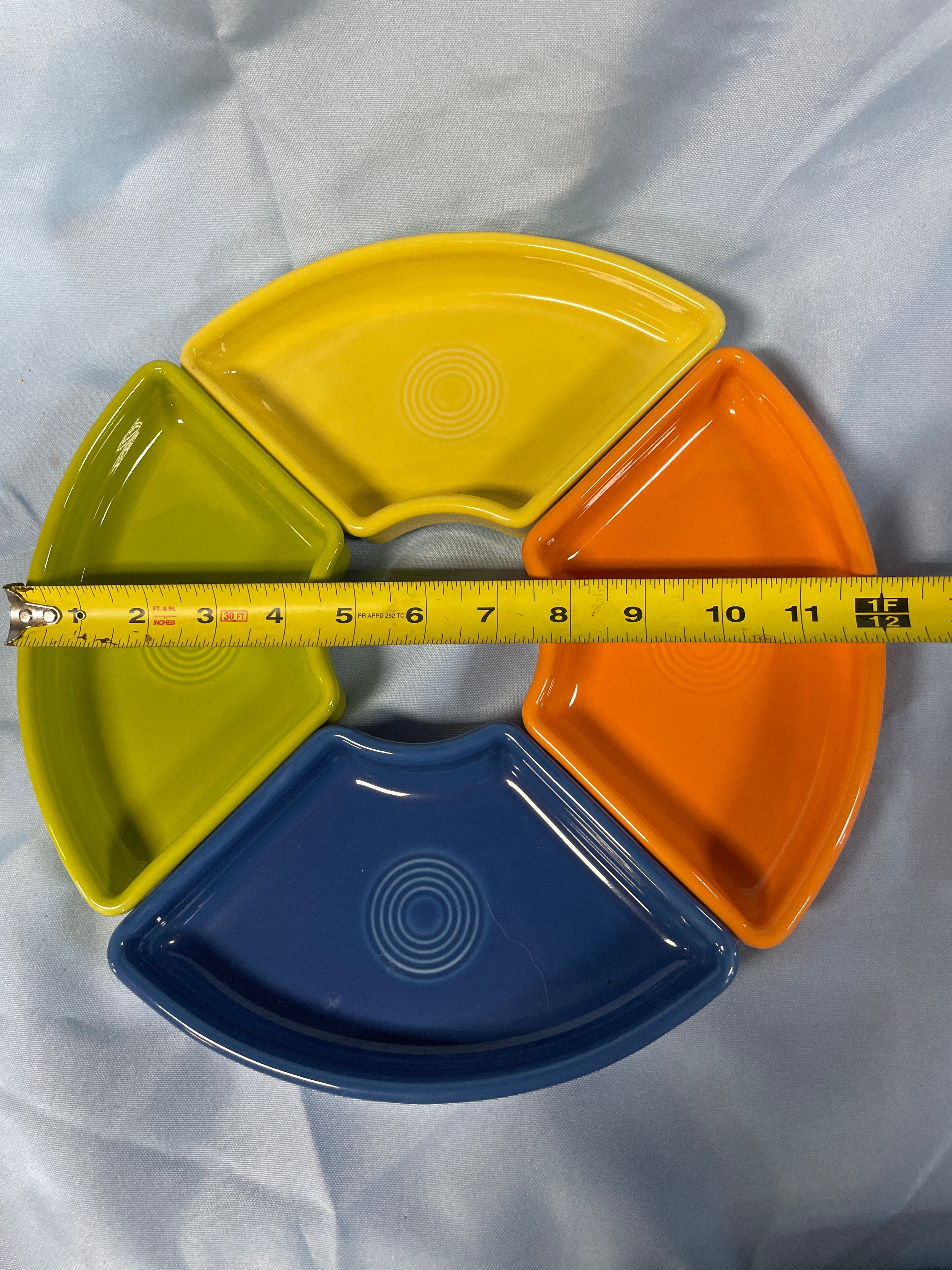Four fan-shaped Fiesta ceramic serving dishes in yellow, lime green, orange, and blue, each marked “Fiesta ® HLC USA” on the bottom, measuring approximately 11.5 inches in diameter when assembled.