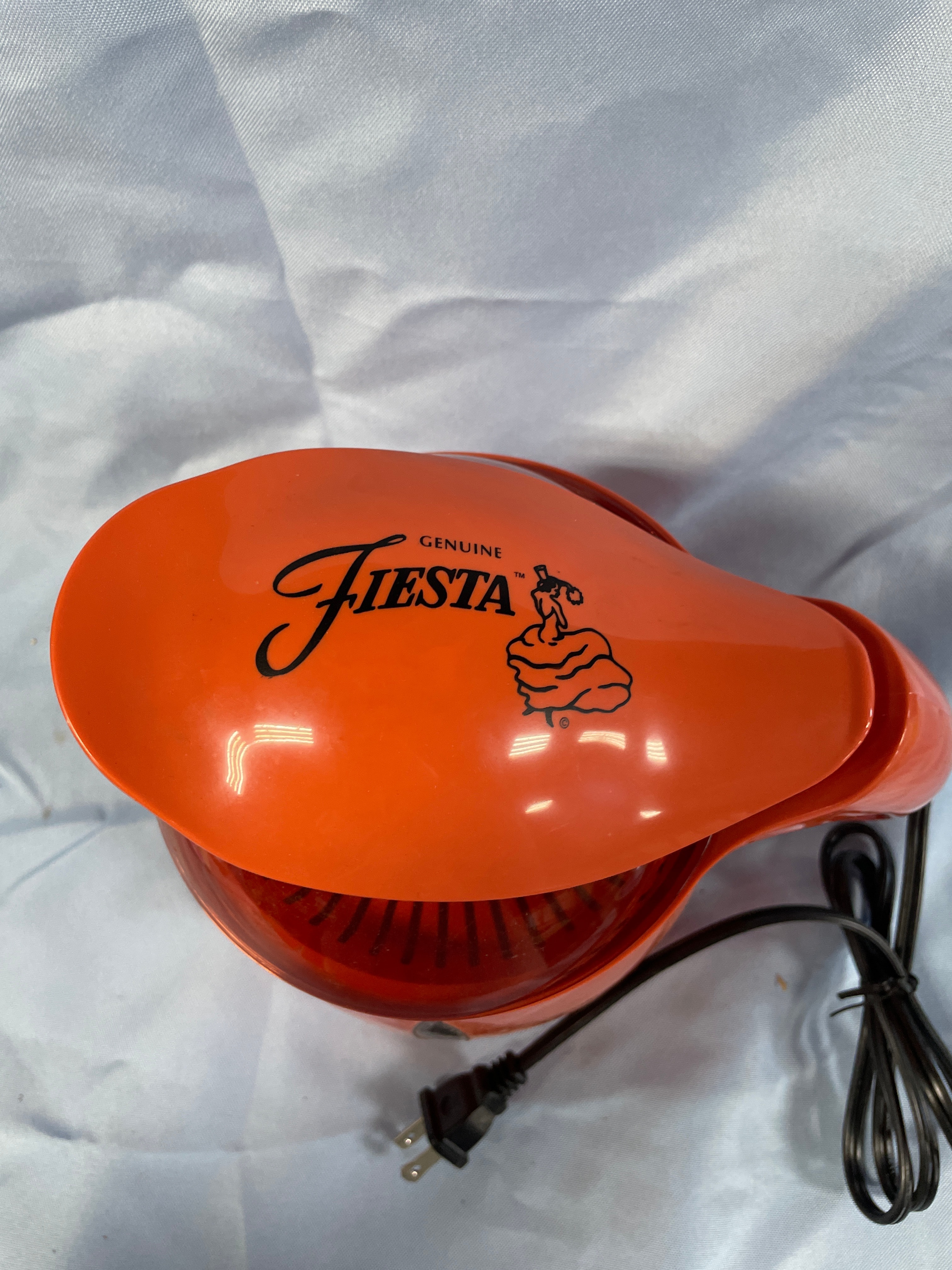 An orange electric citrus juicer with a translucent orange lid, black power cord, and ‘GENUINE FIESTA™’ dancer logo, model CJ-110P.