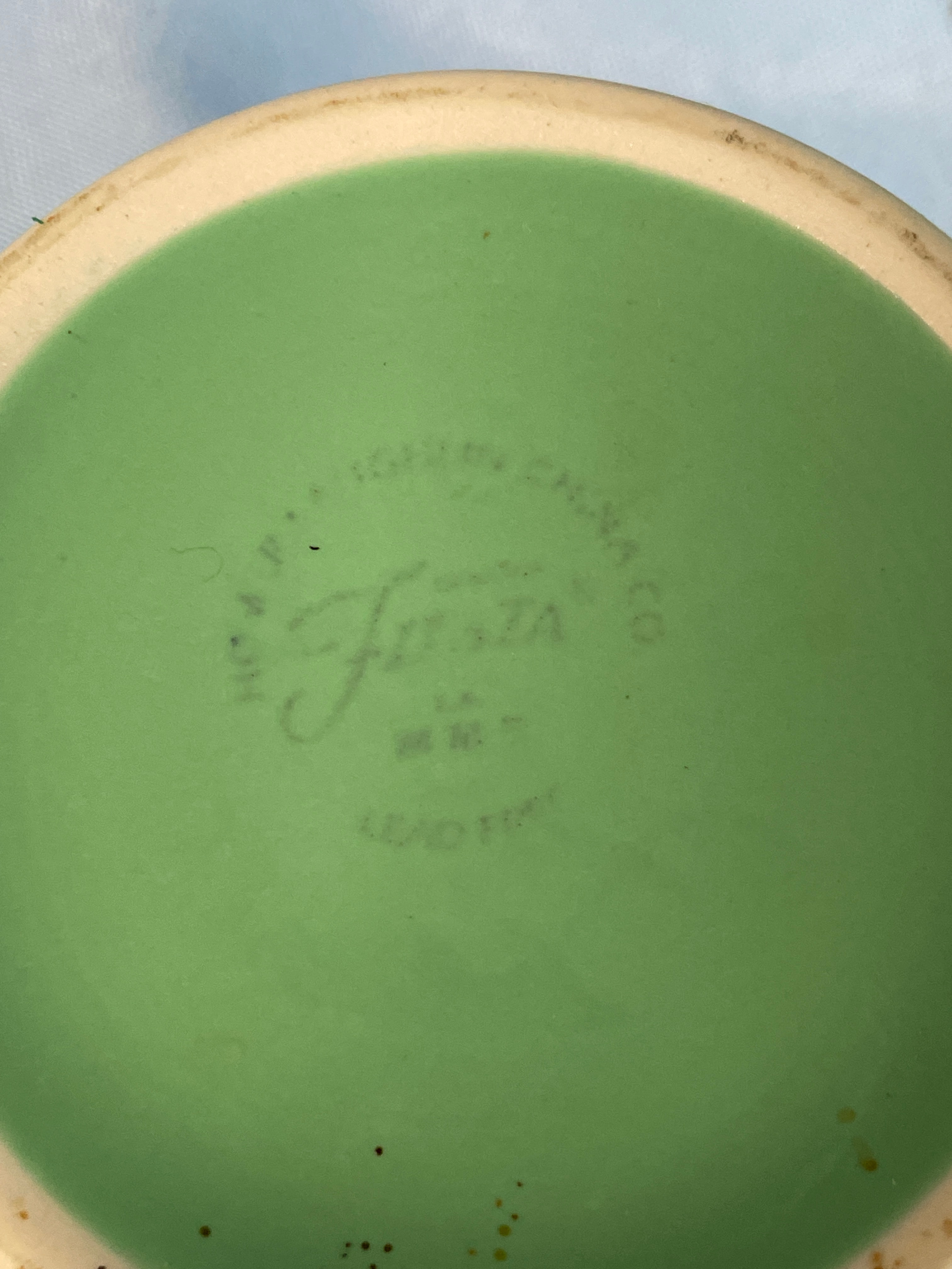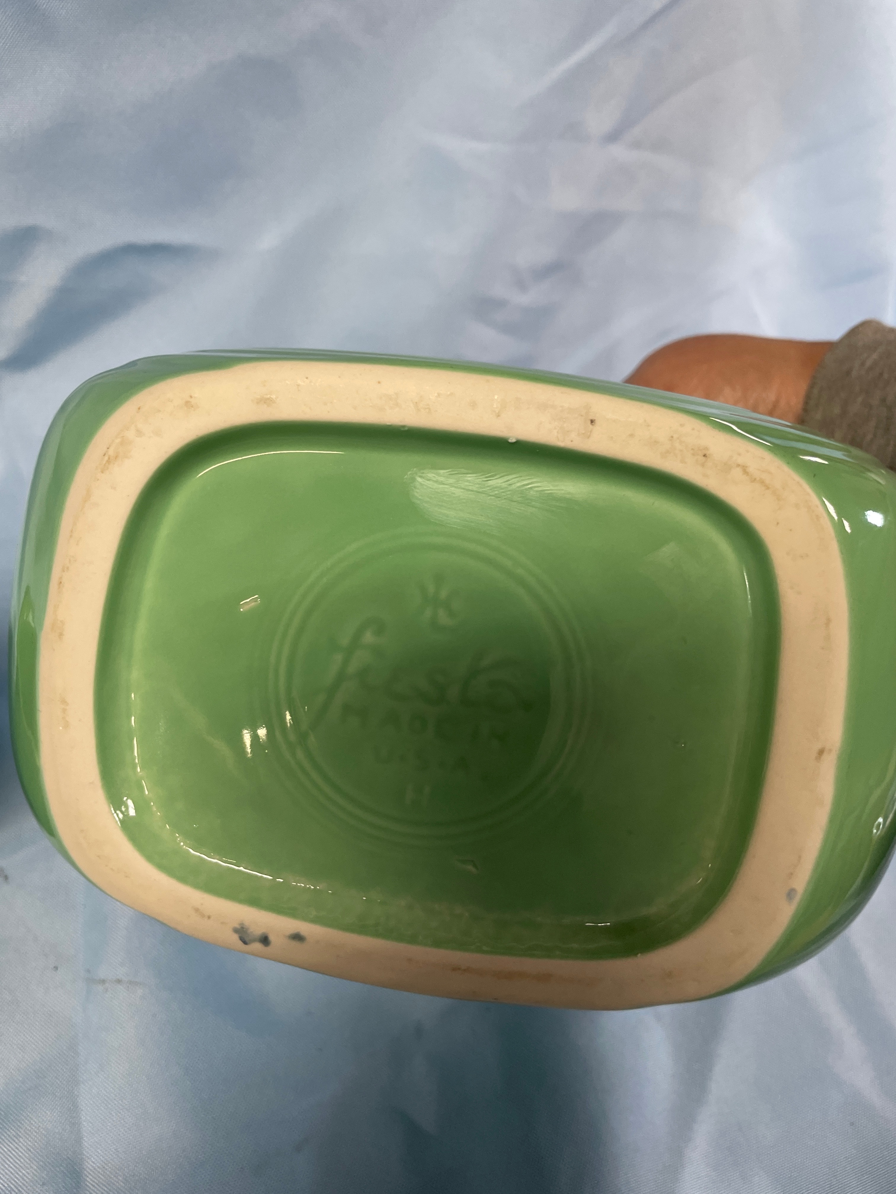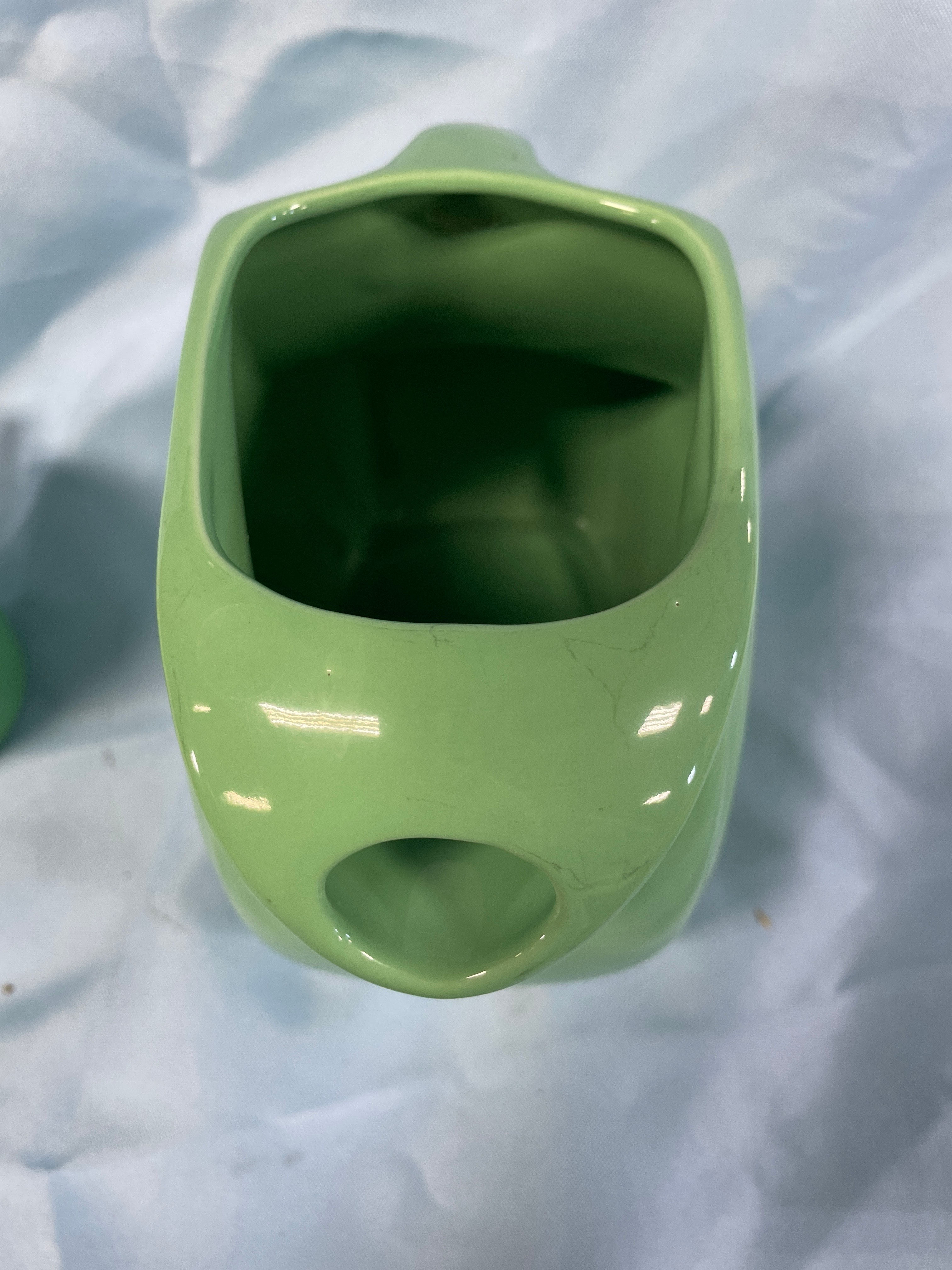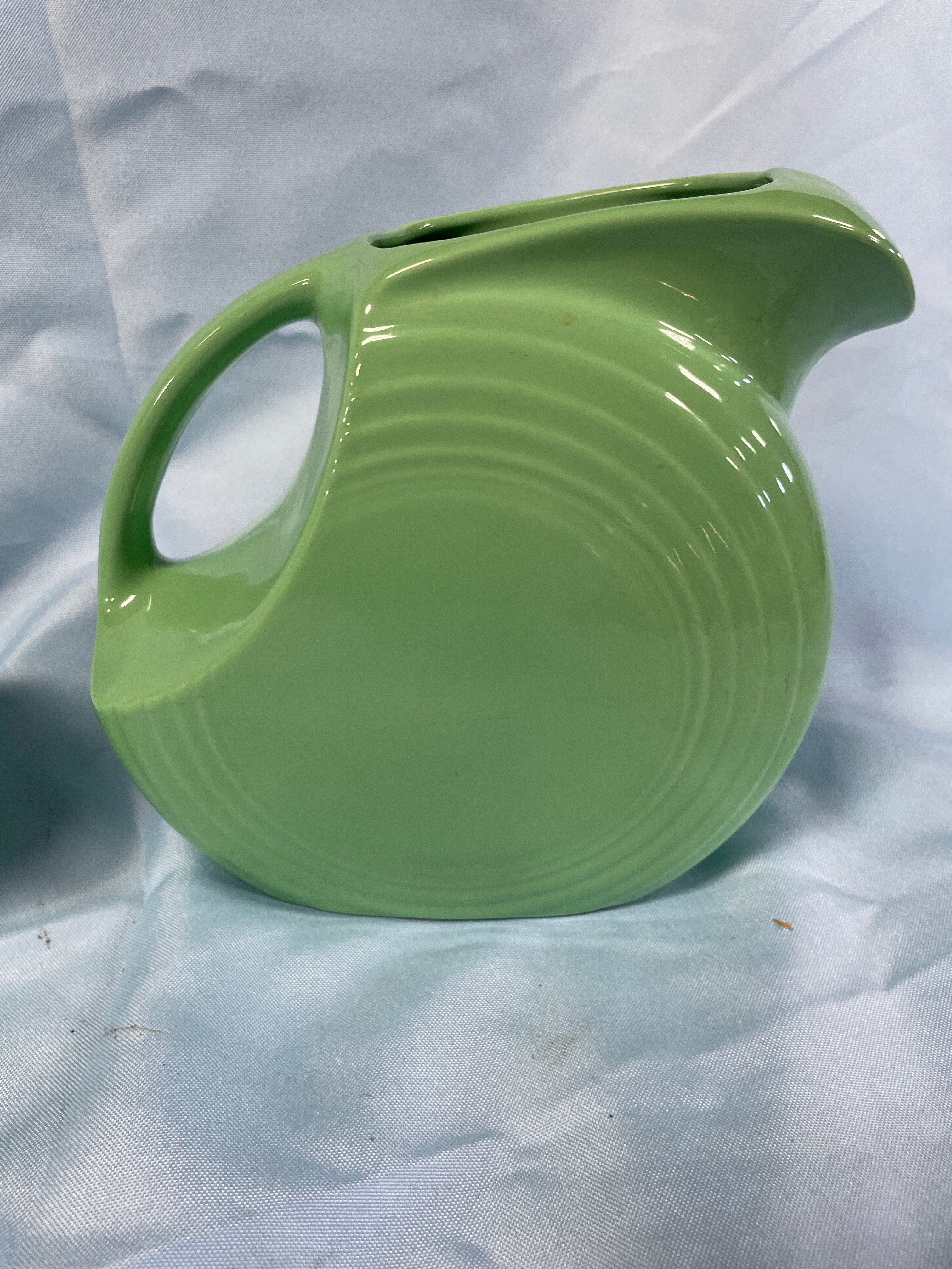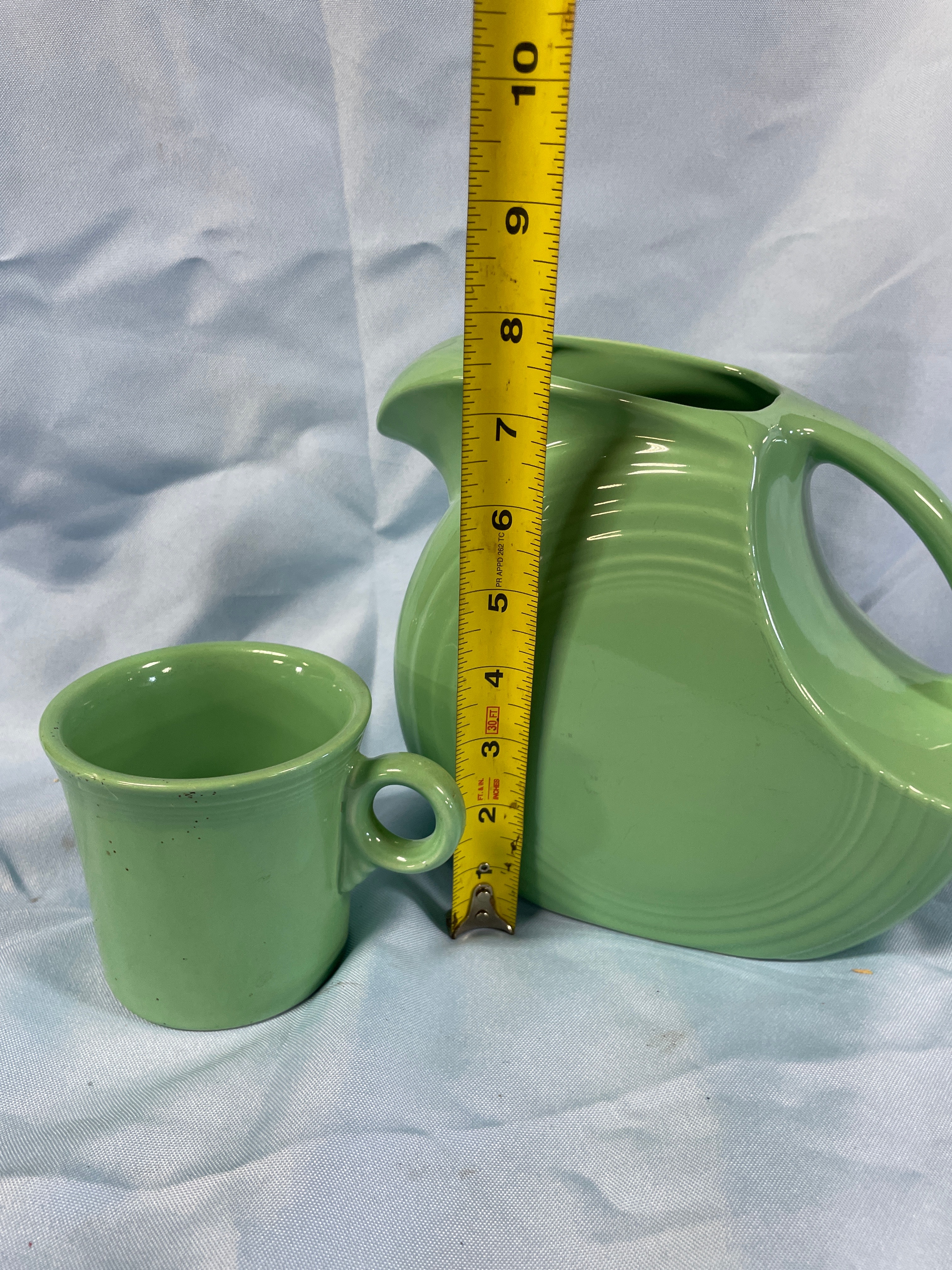 A green Fiesta pitcher and one green Fiesta mug, both marked “Fiesta” and “MADE IN U.S.A.”, with the pitcher measuring approximately 7.5 inches tall.