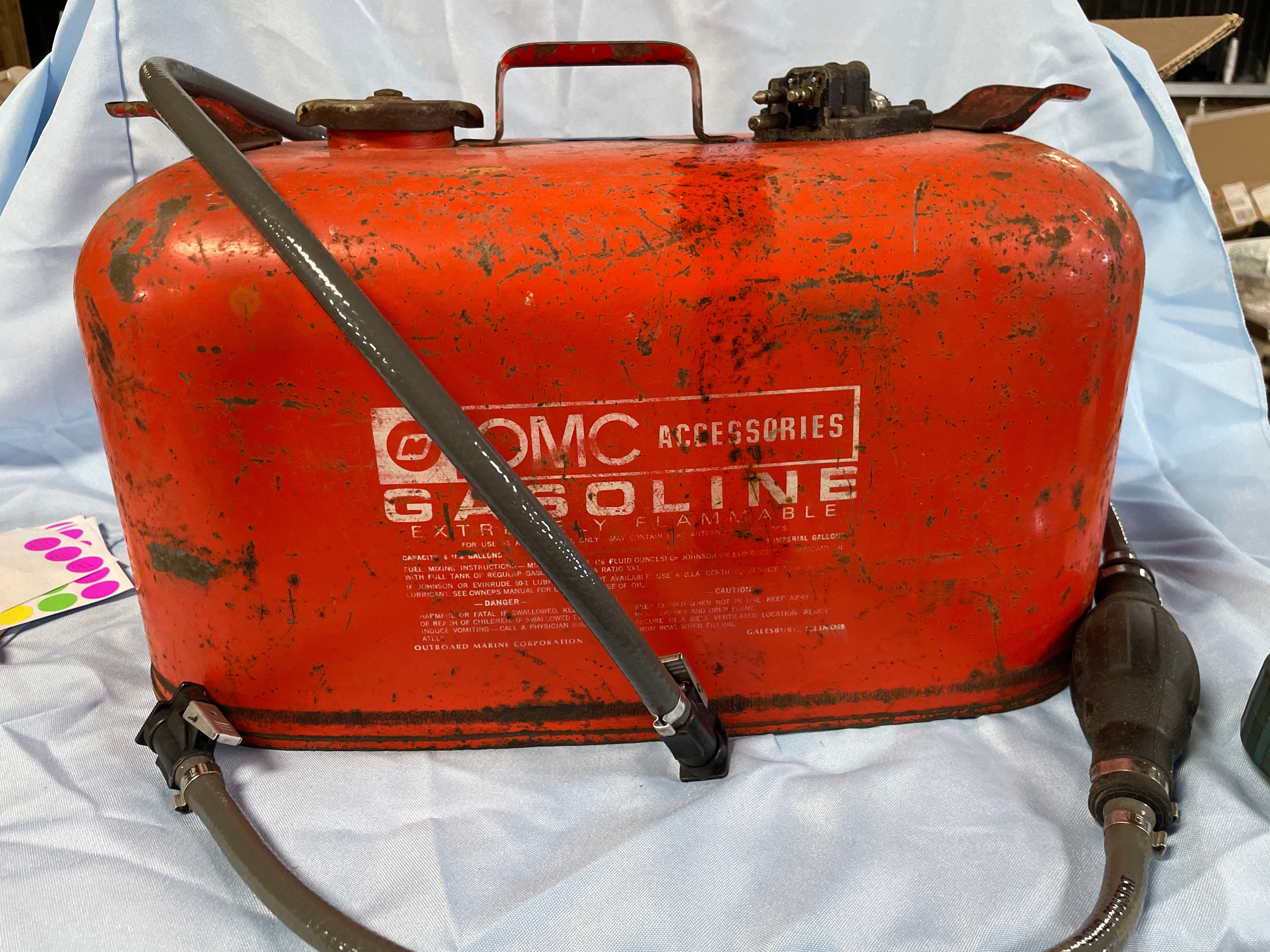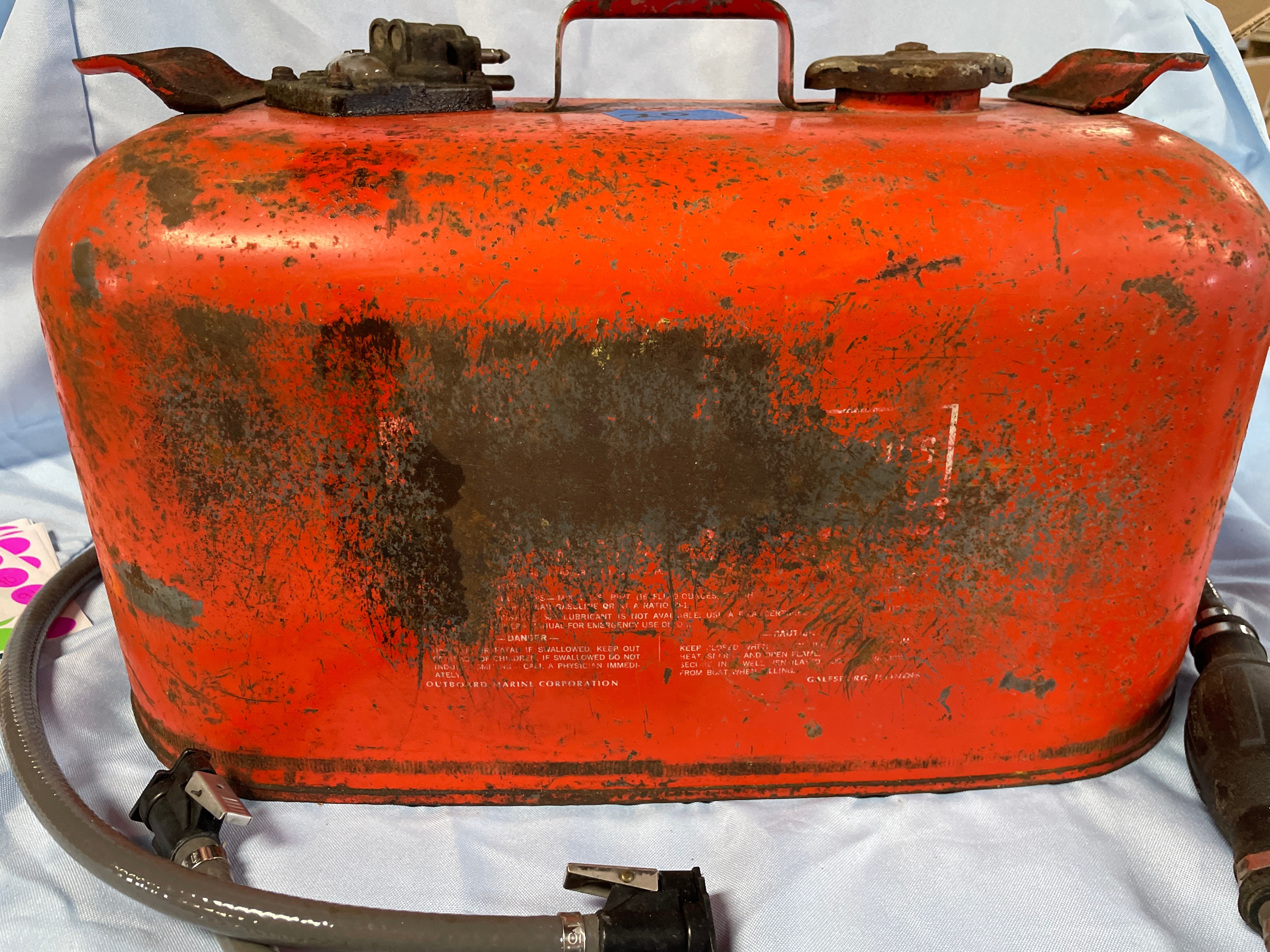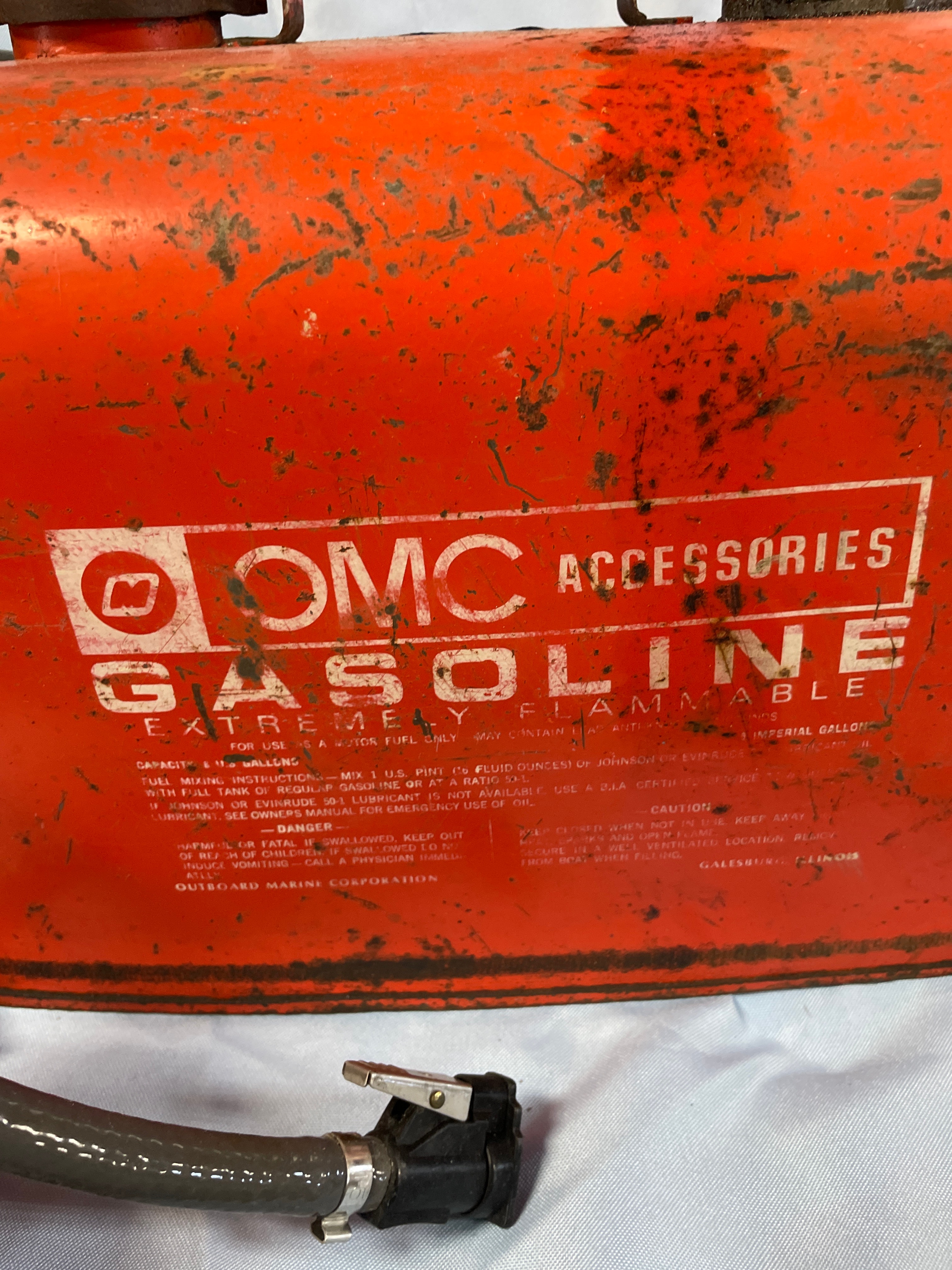 An orange, weathered OMC ACCESSORIES “GASOLINE EXTREMELY FLAMMABLE” outboard motor fuel tank from OUTBOARD MARINE CORPORATION, GALESBURG, ILLINOIS, with an attached grey fuel line and primer bulb, and usage and warning labels.