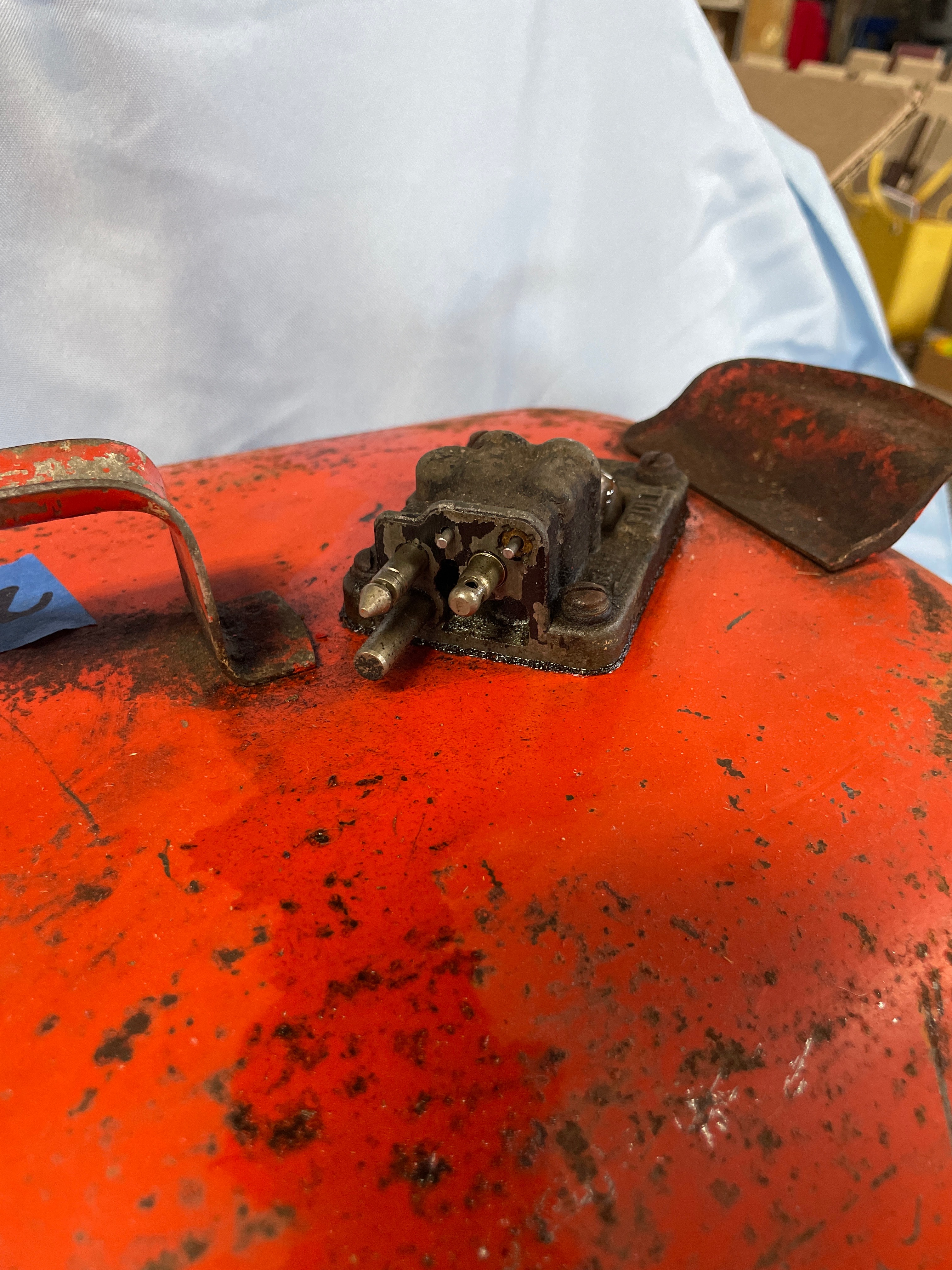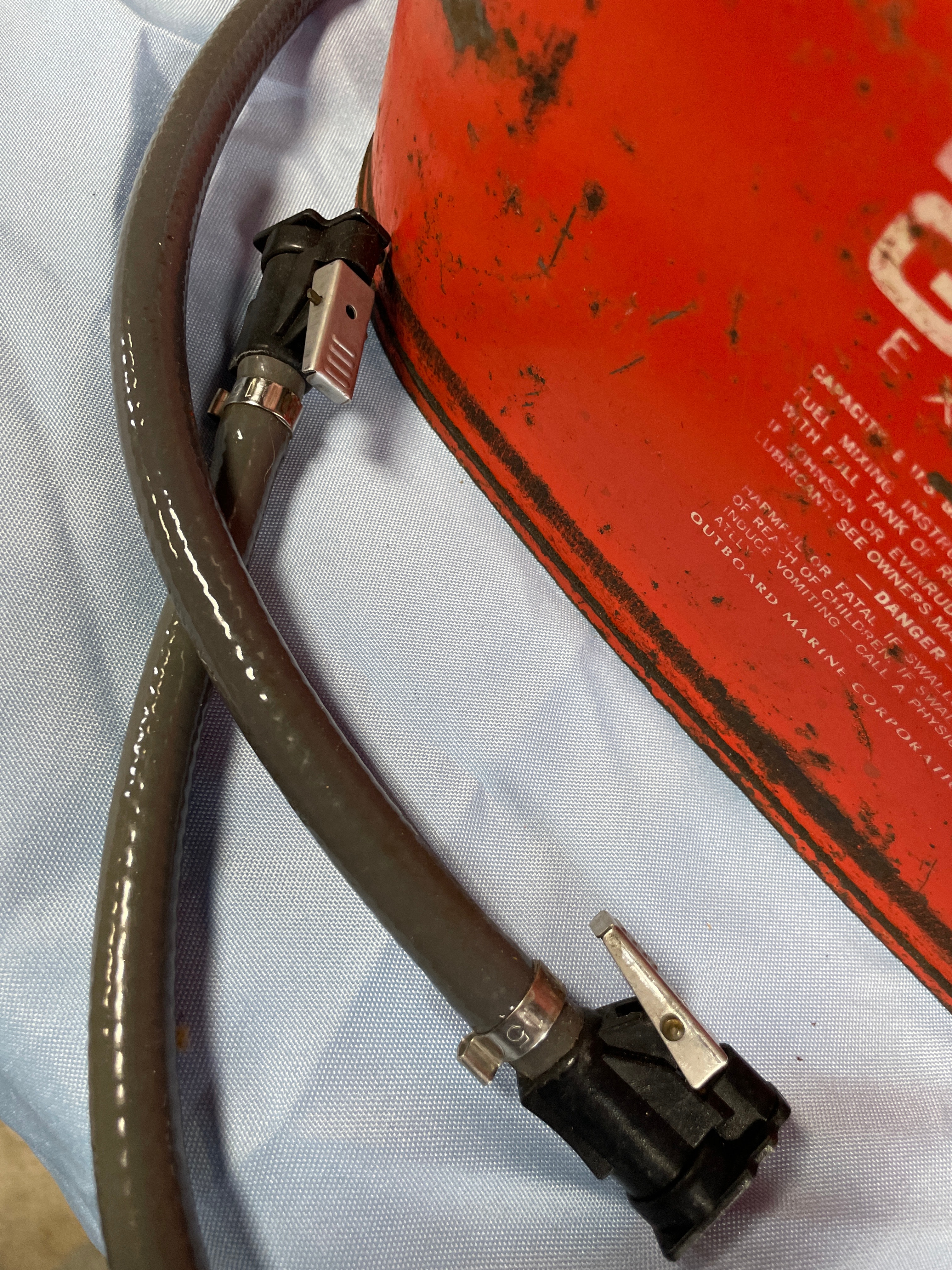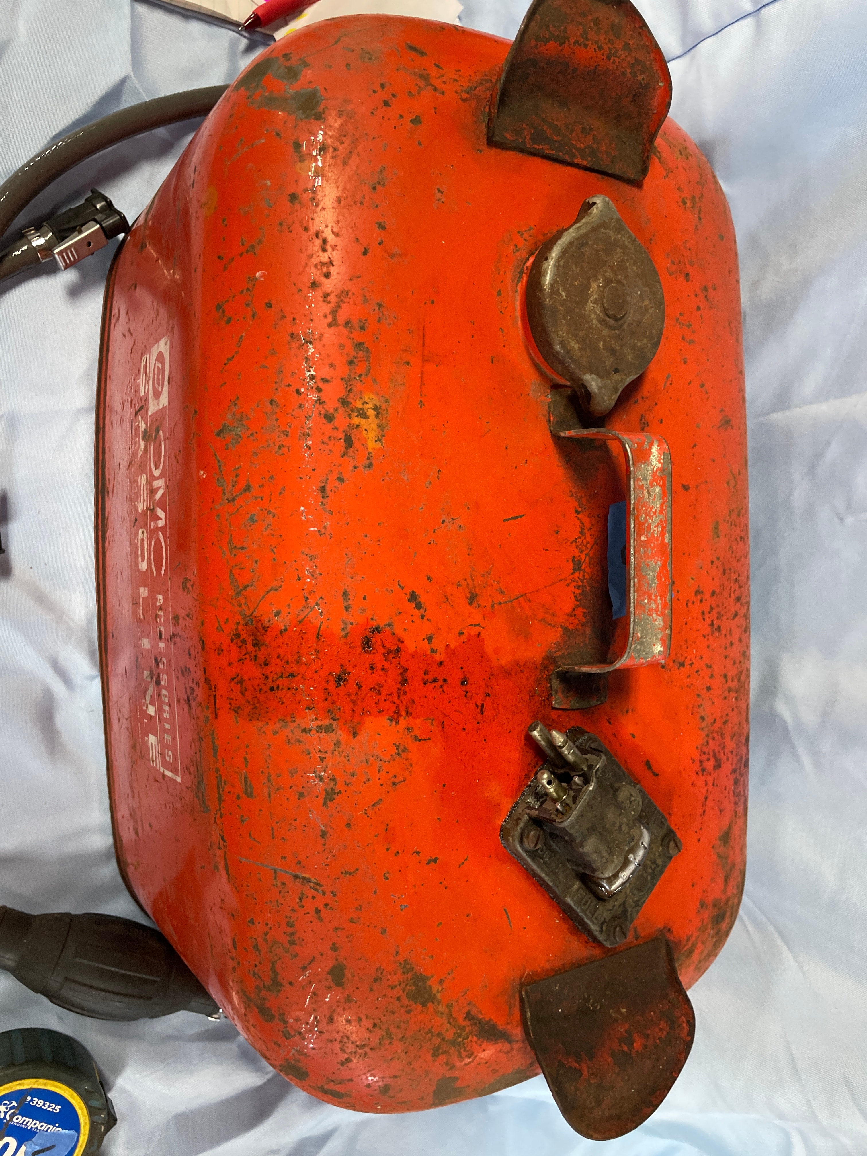 An orange, weathered OMC ACCESSORIES “GASOLINE EXTREMELY FLAMMABLE” outboard motor fuel tank from OUTBOARD MARINE CORPORATION, GALESBURG, ILLINOIS, with an attached grey fuel line and primer bulb, and usage and warning labels.