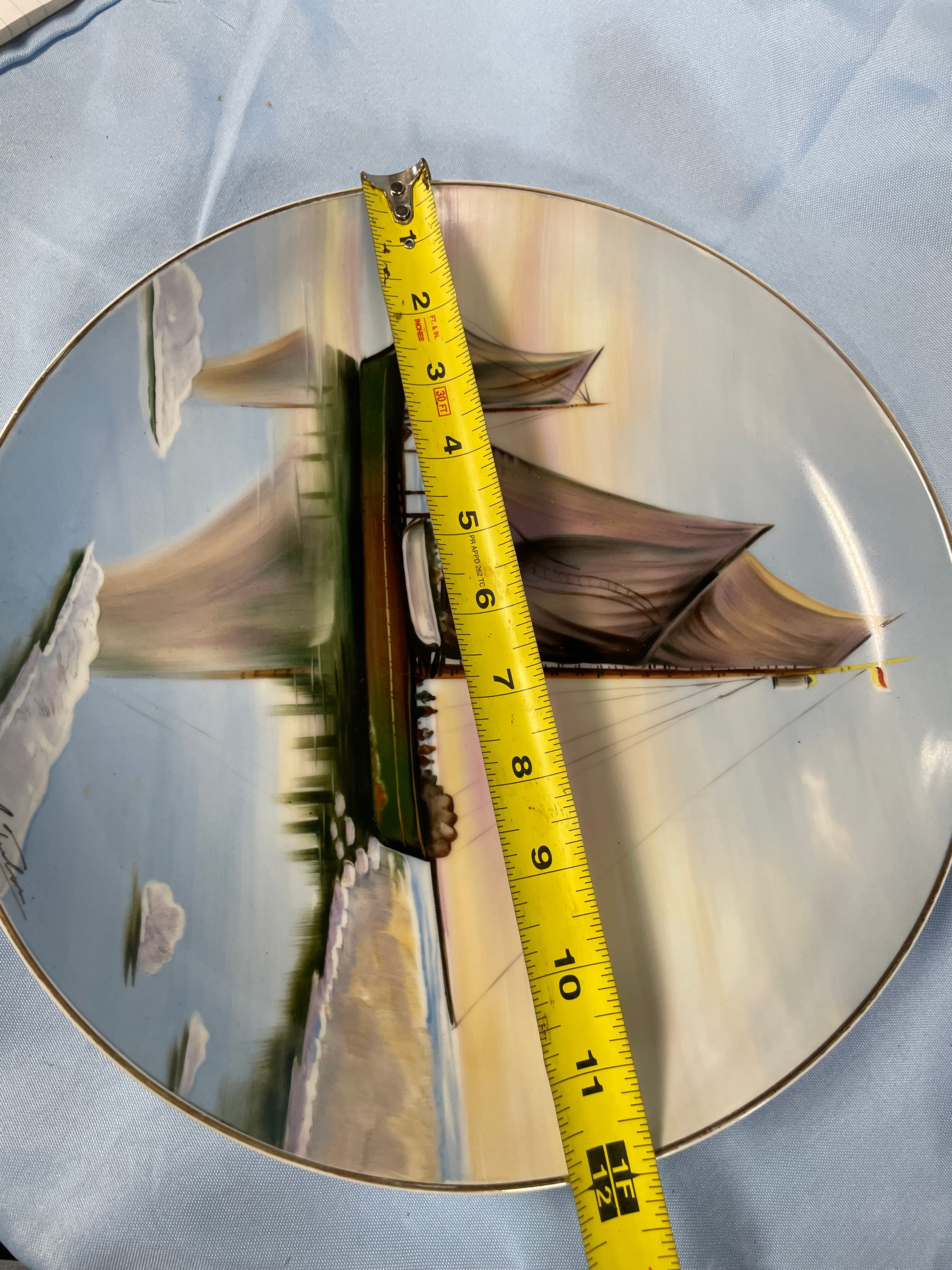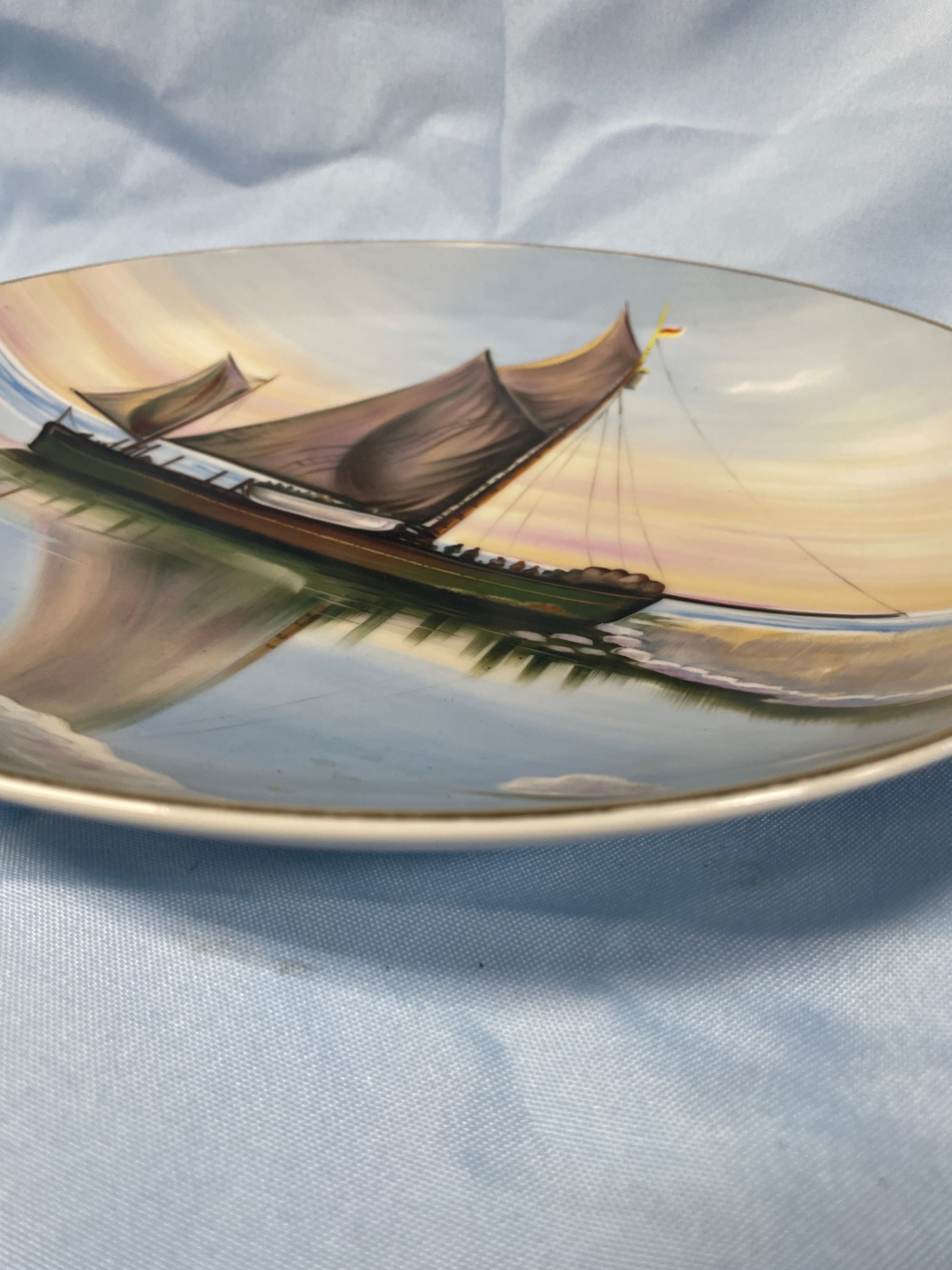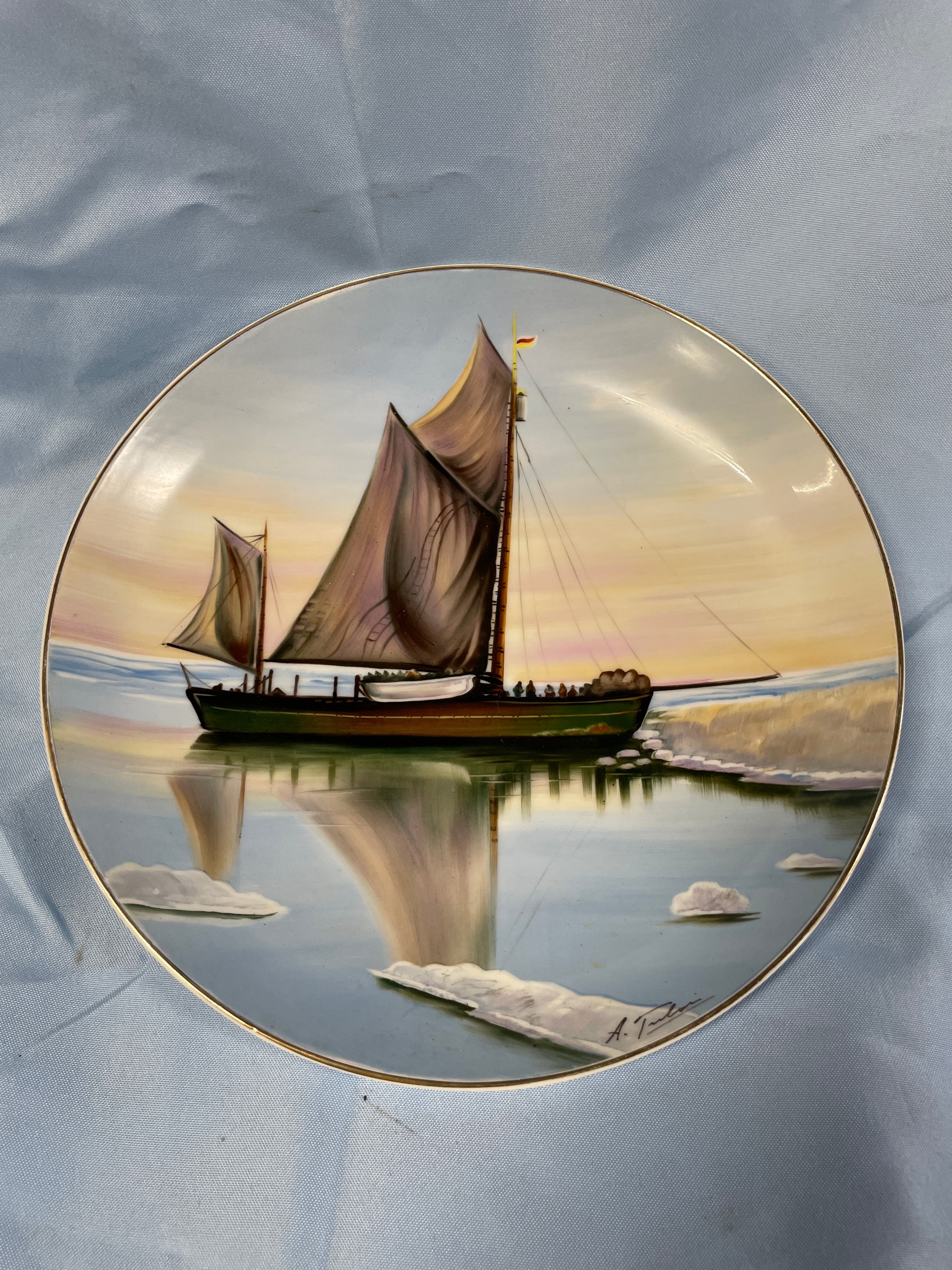 A single, round, decorative plate, approximately 10 inches in diameter, features a hand-painted sailing ship with brown sails, dark green hull, blue water, colorful sunset sky, gold rim, and artist’s signature ‘A. T. Z’.