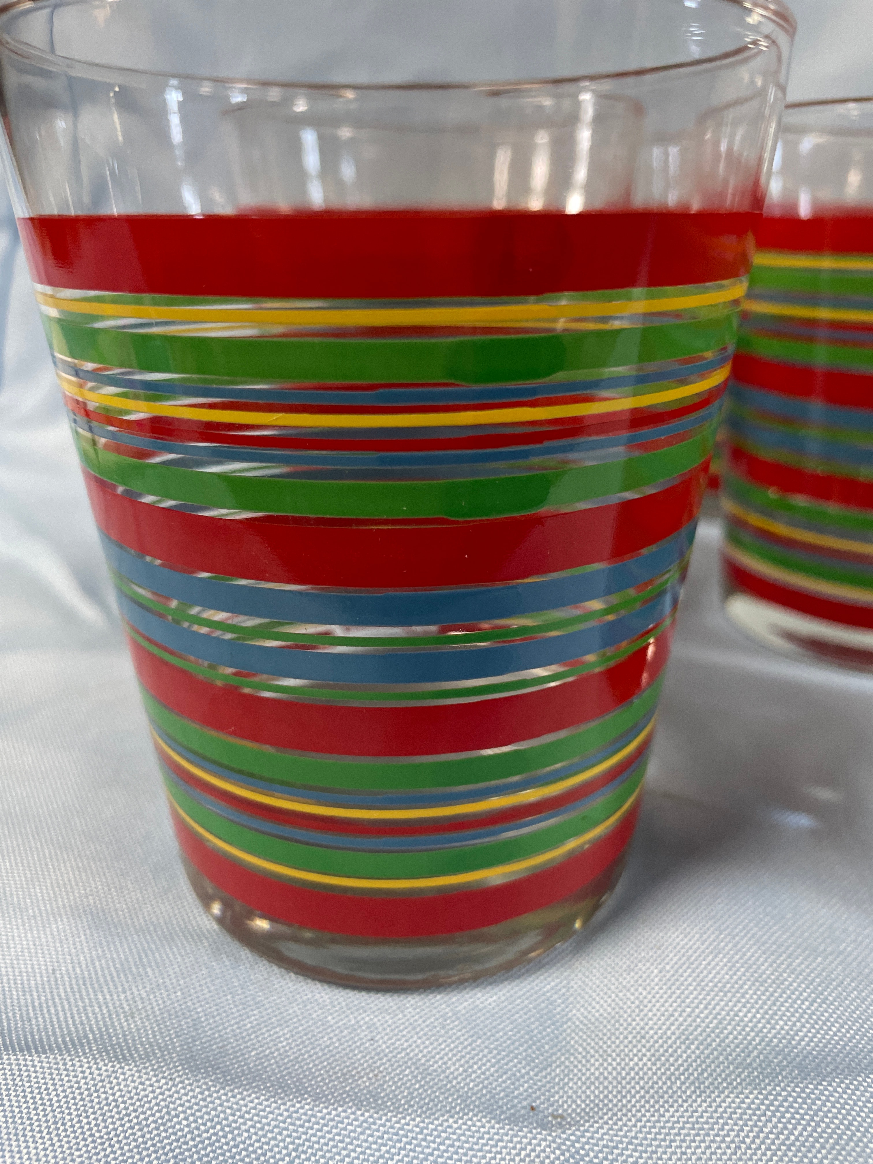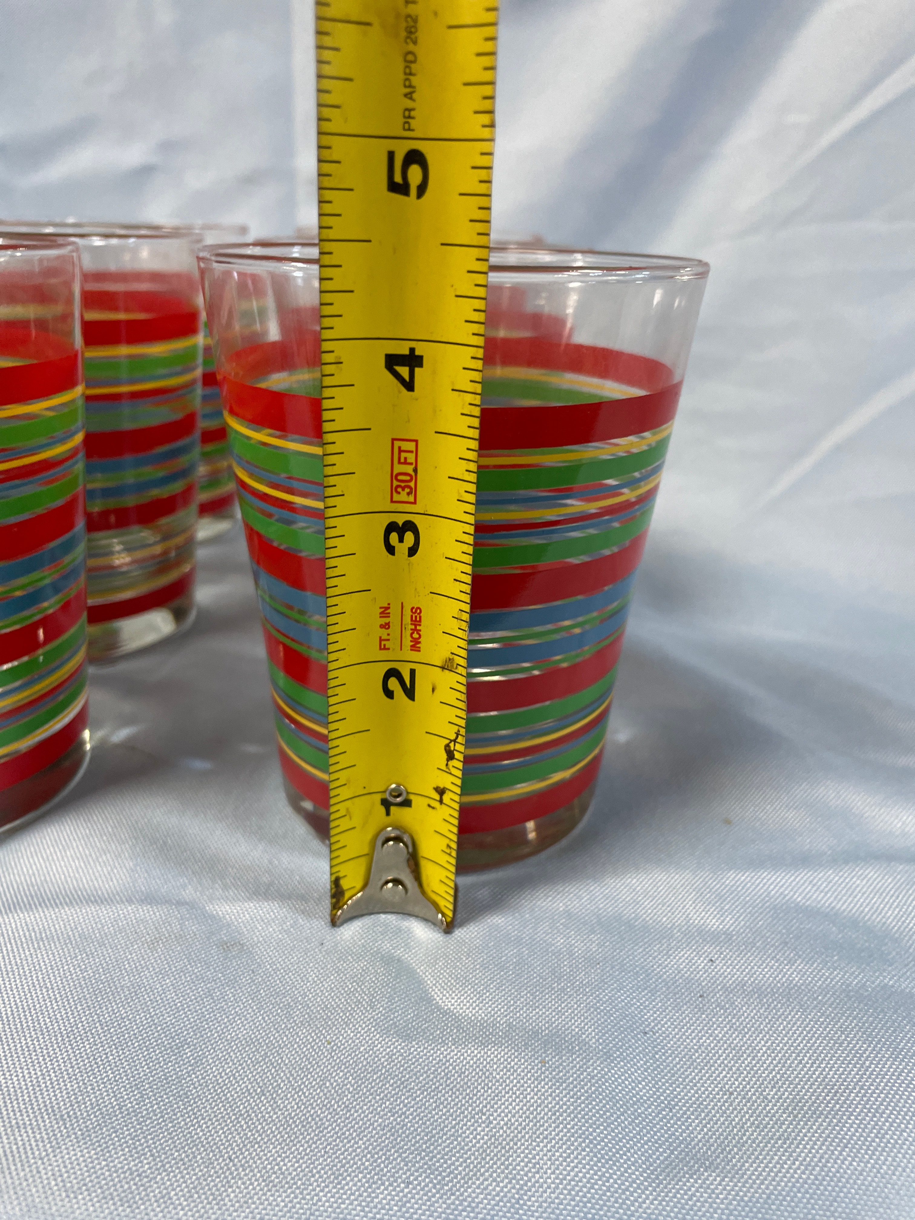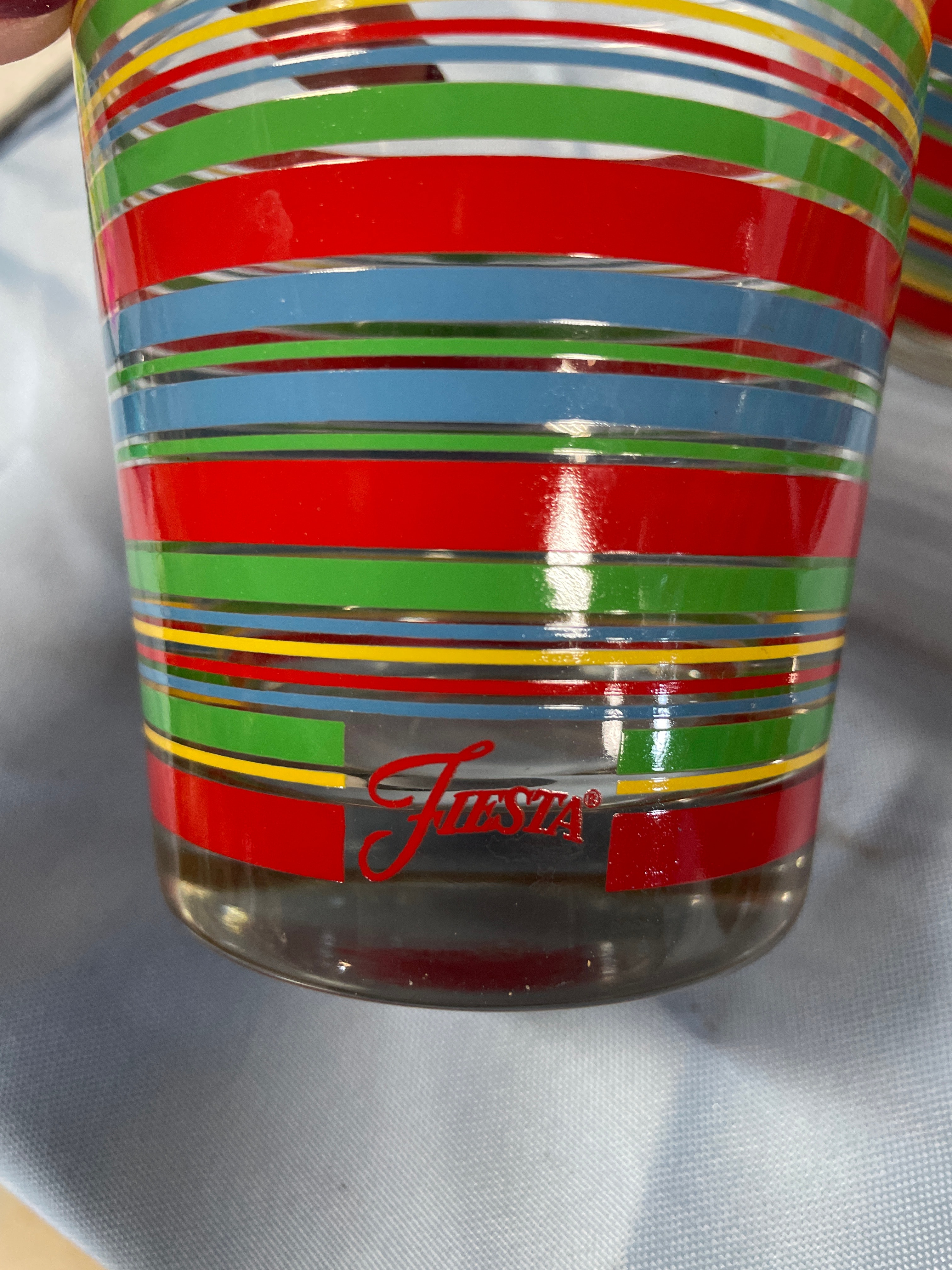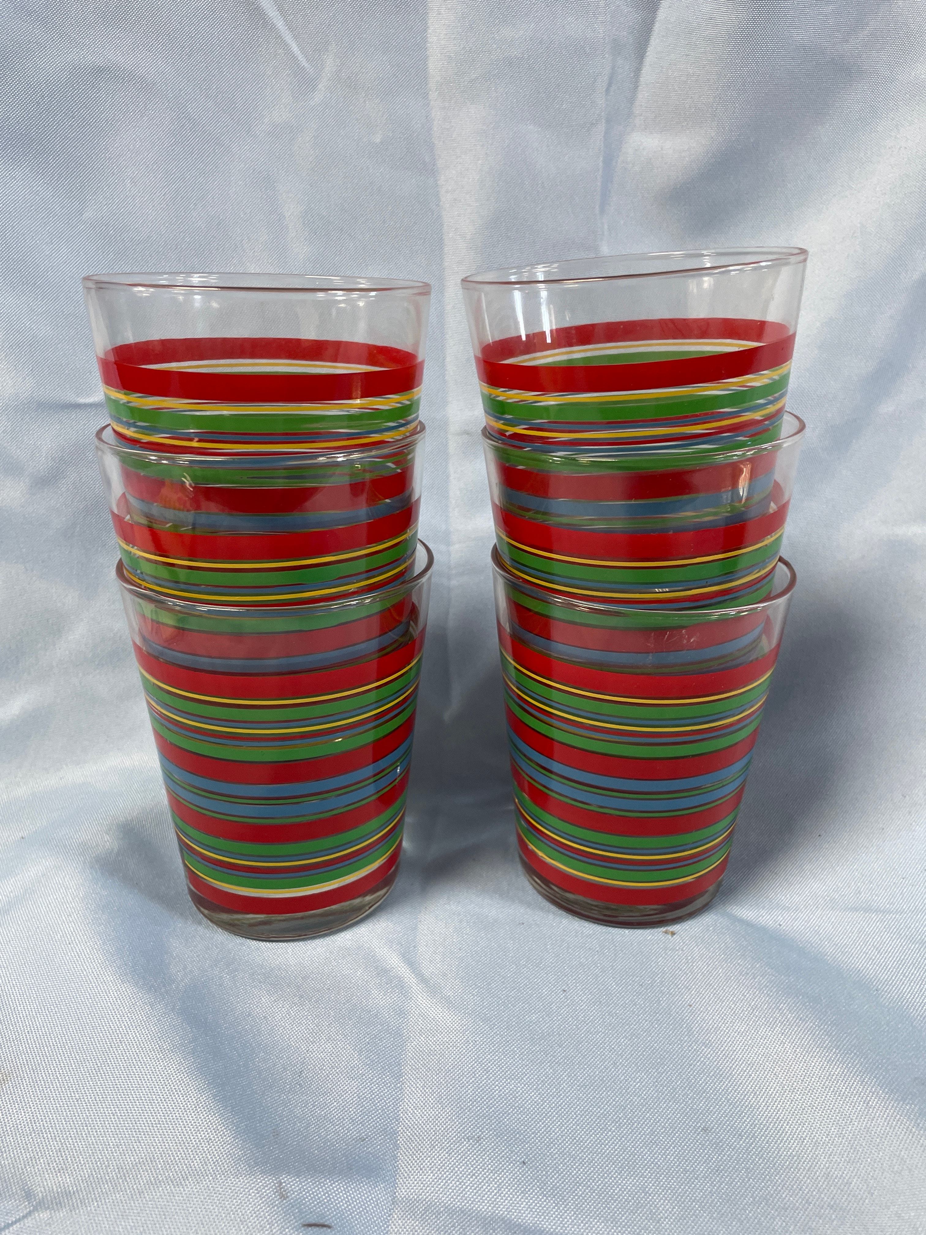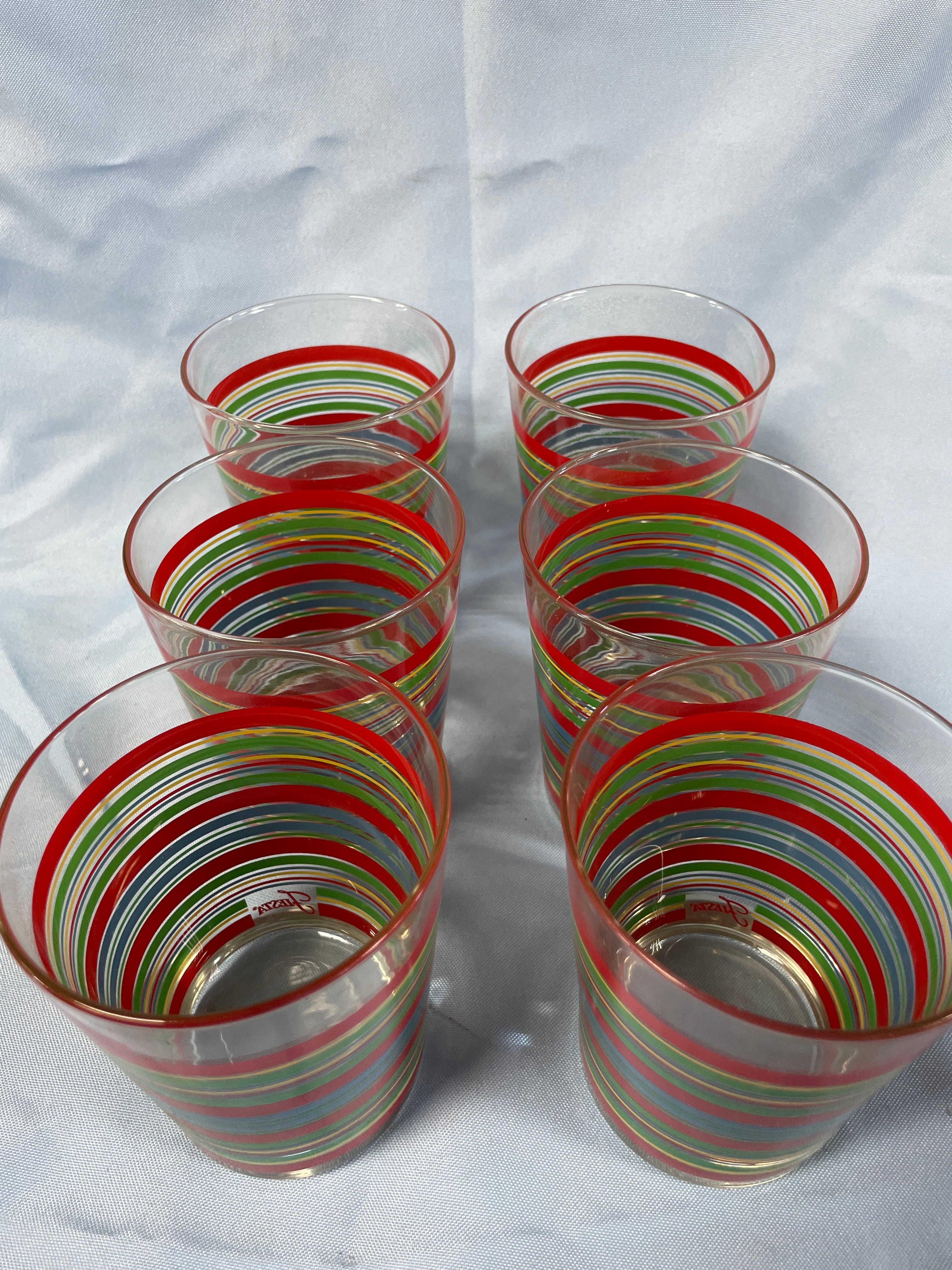 Six clear glass drinking tumblers, each approximately 4.5 inches tall, decorated with horizontal stripes in red, green, yellow, and blue, and featuring the red cursive “Fiesta” brand name on the side near the base.
