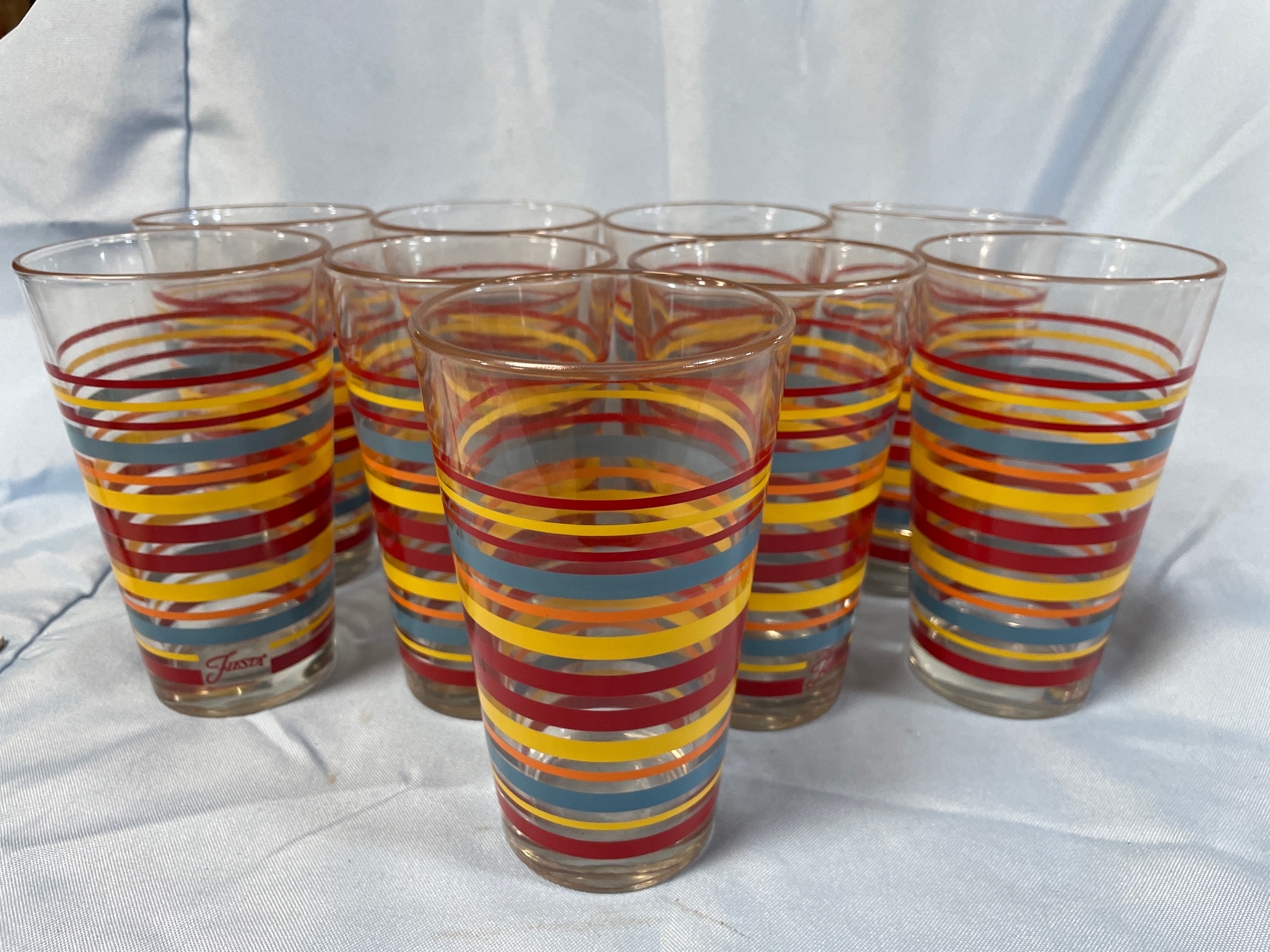 A set of clear glass tumblers featuring multicolor horizontal stripes, each approximately 5.5 inches tall.