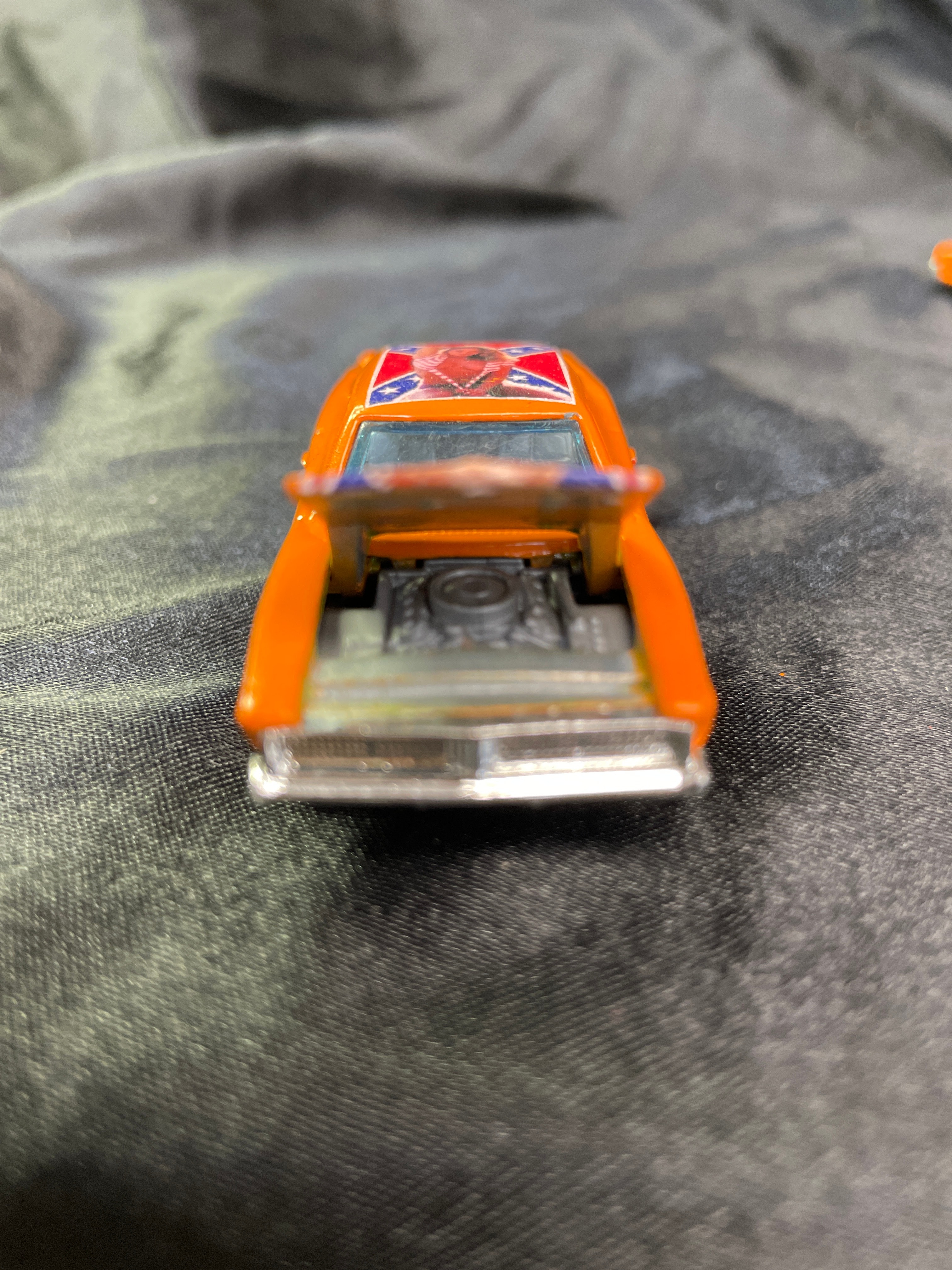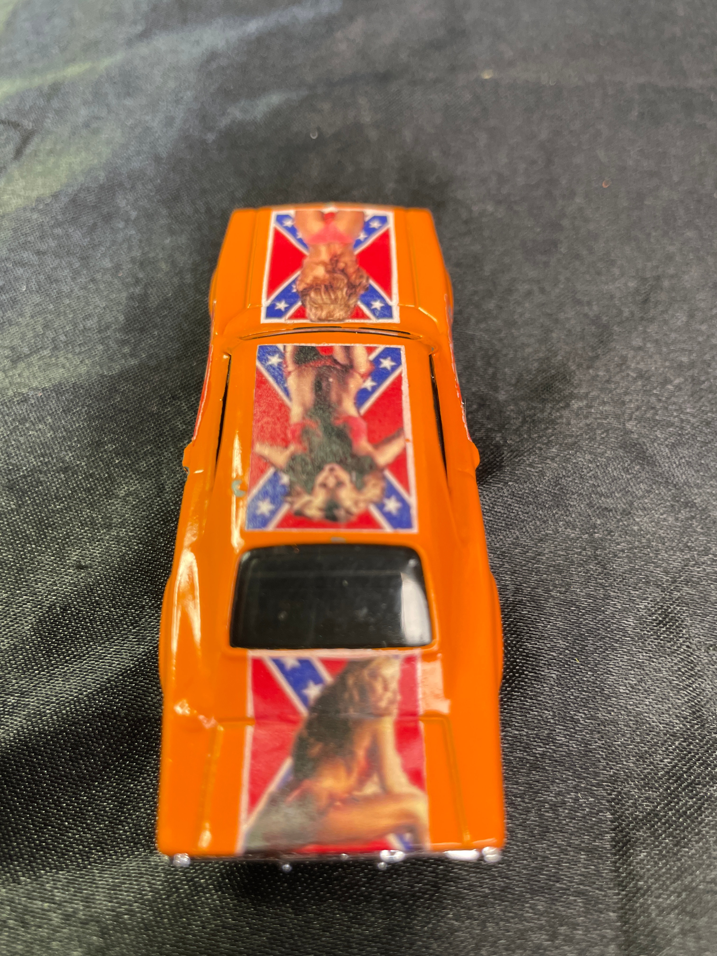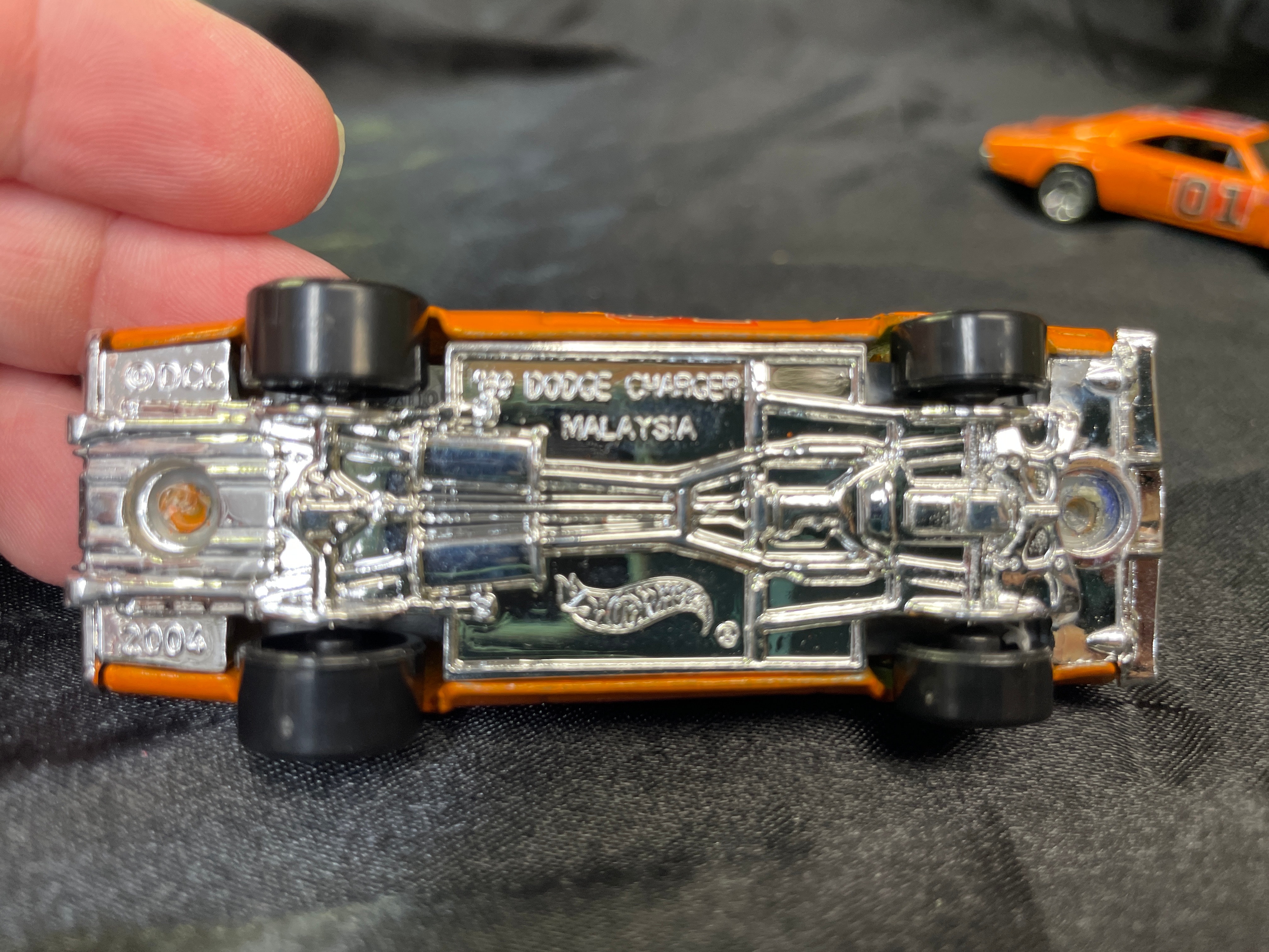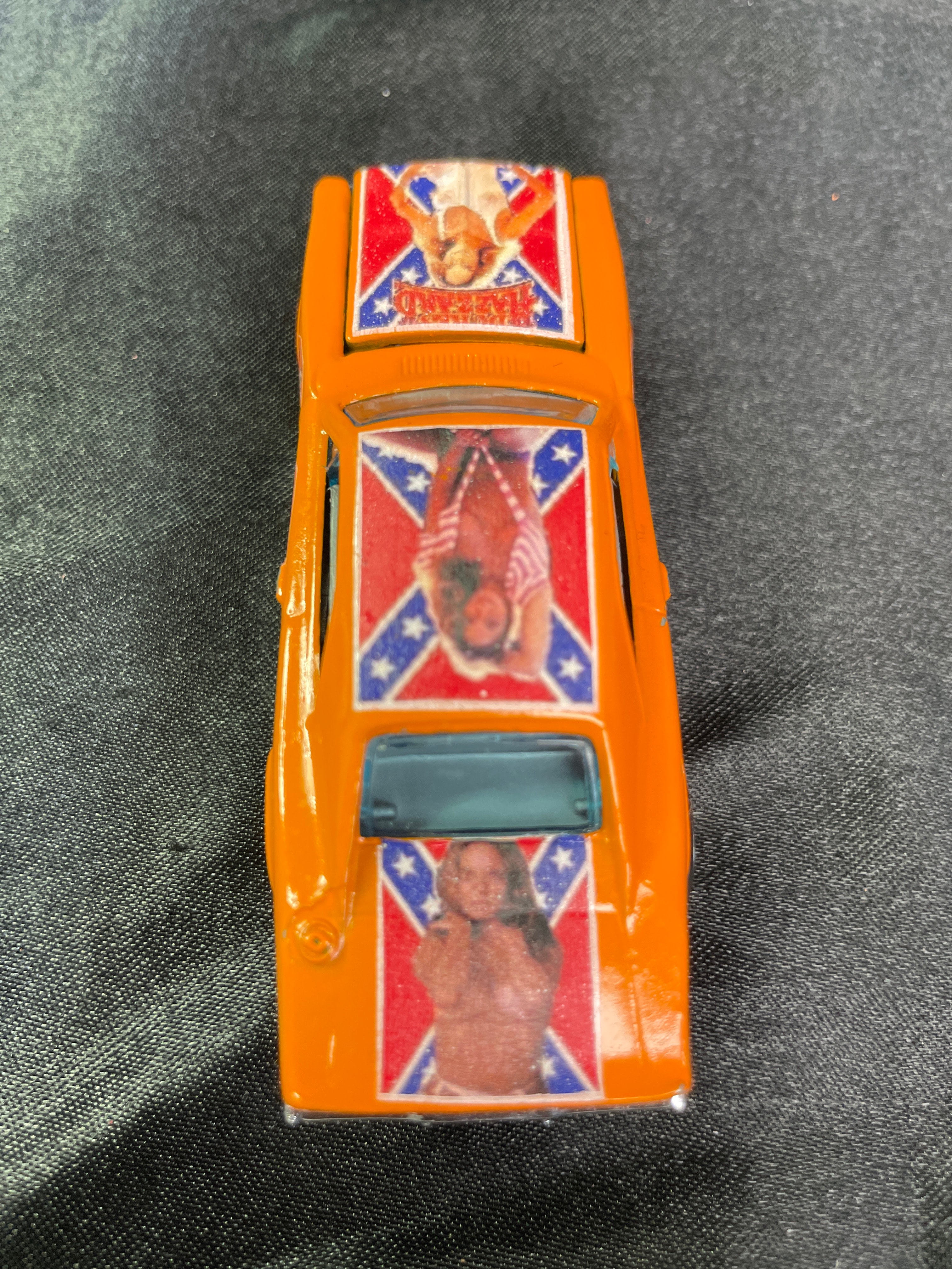 A Pair of Mattel Hot Wheels '69 Dodge Charger 500 "Dukes of Hazzard General Lee" Die-Cast Cars, 2004 and 2014, with Custom Decals perhaps paint too Dunno if these we made this way or someone made them