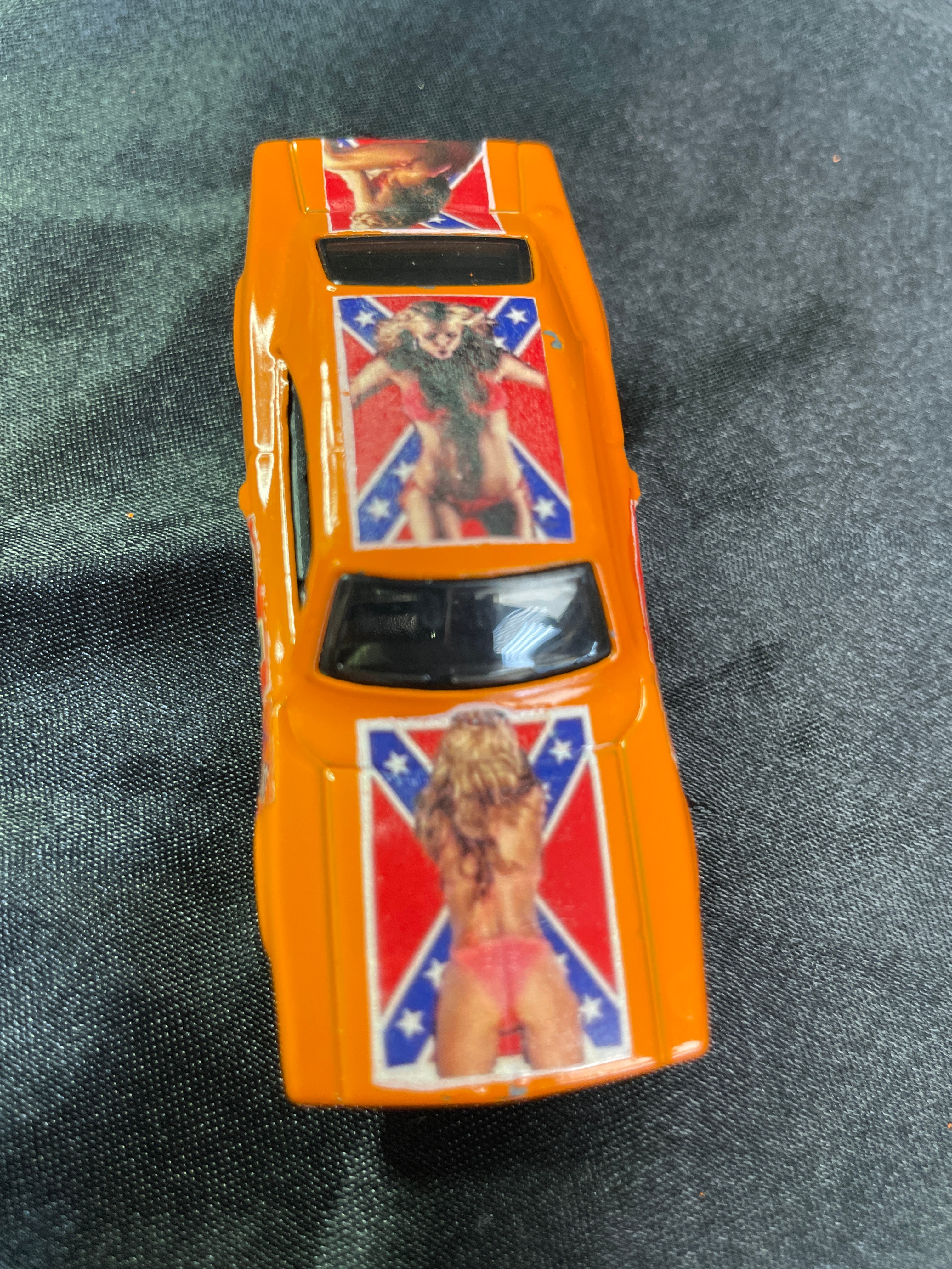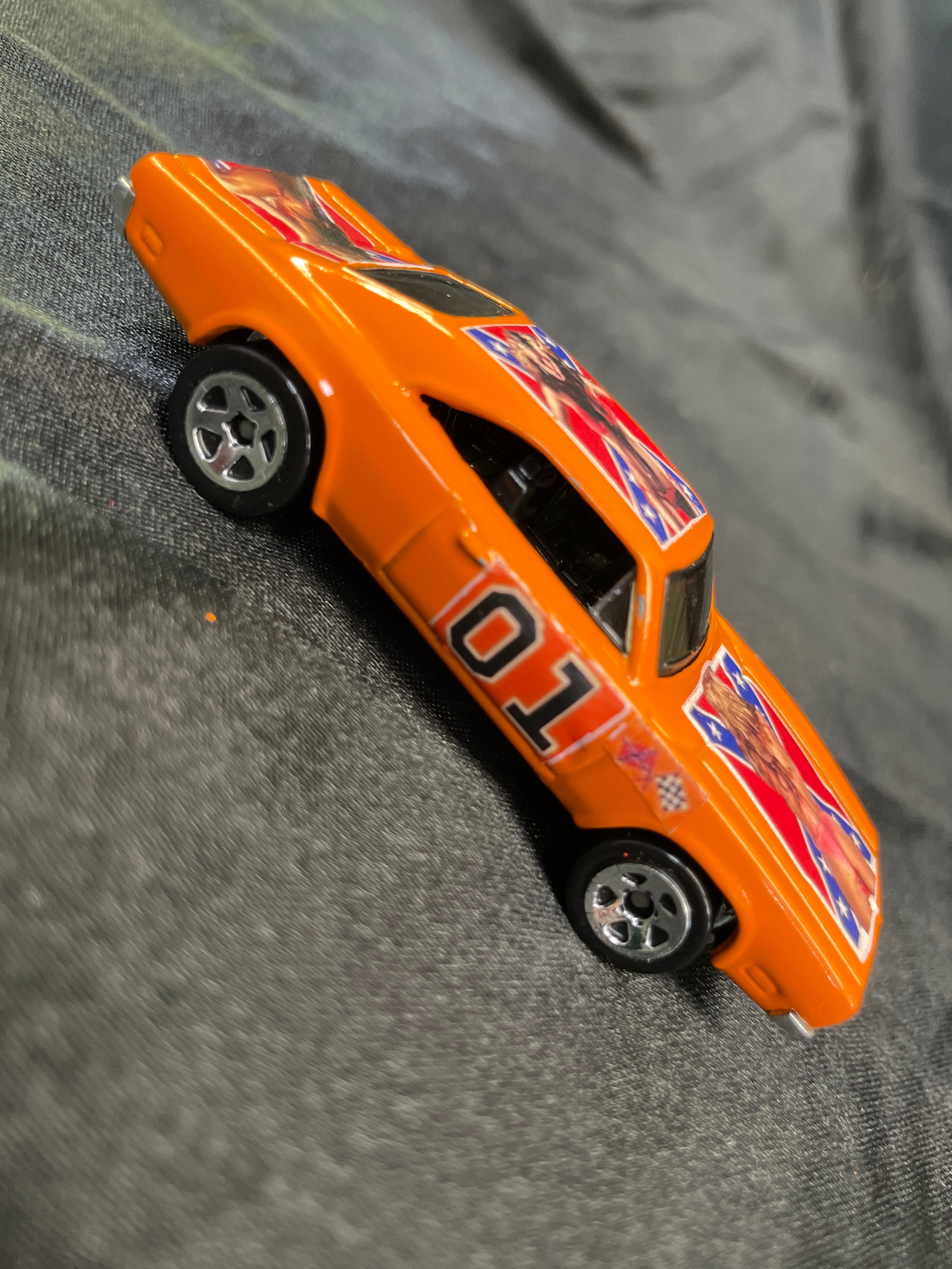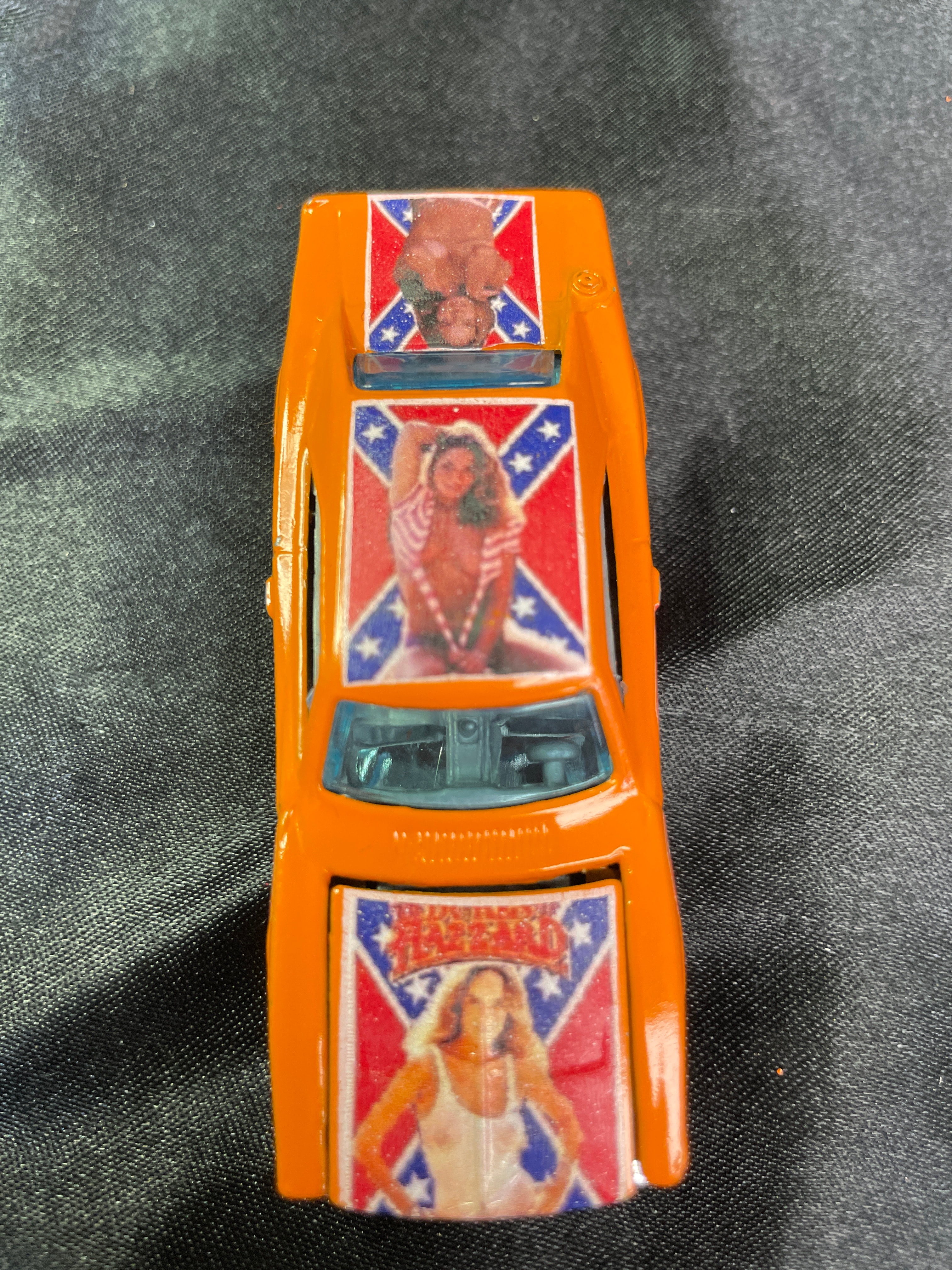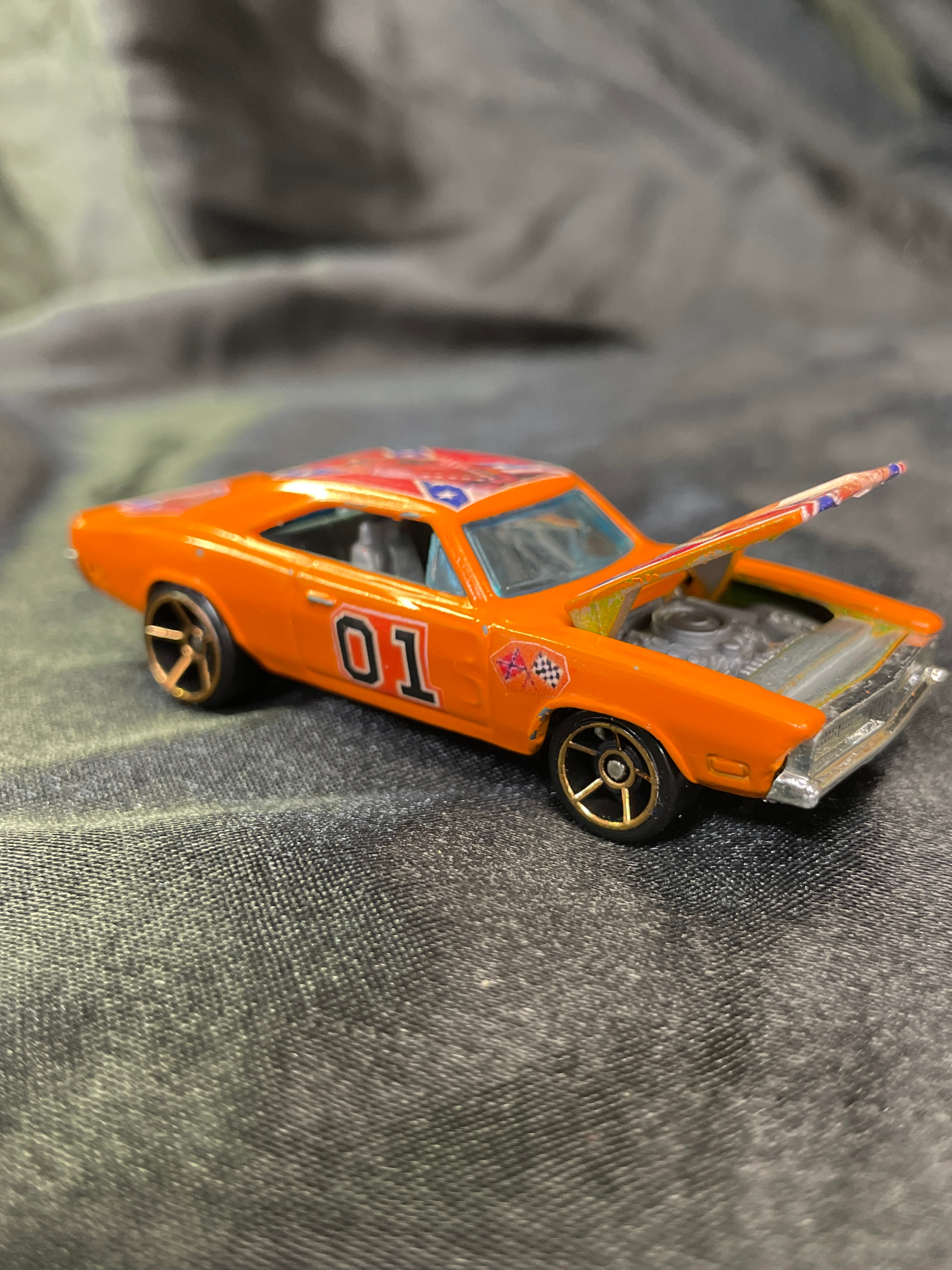 A Pair of Mattel Hot Wheels '69 Dodge Charger 500 "Dukes of Hazzard General Lee" Die-Cast Cars, 2004 and 2014, with Custom Decals perhaps paint too Dunno if these we made this way or someone made them