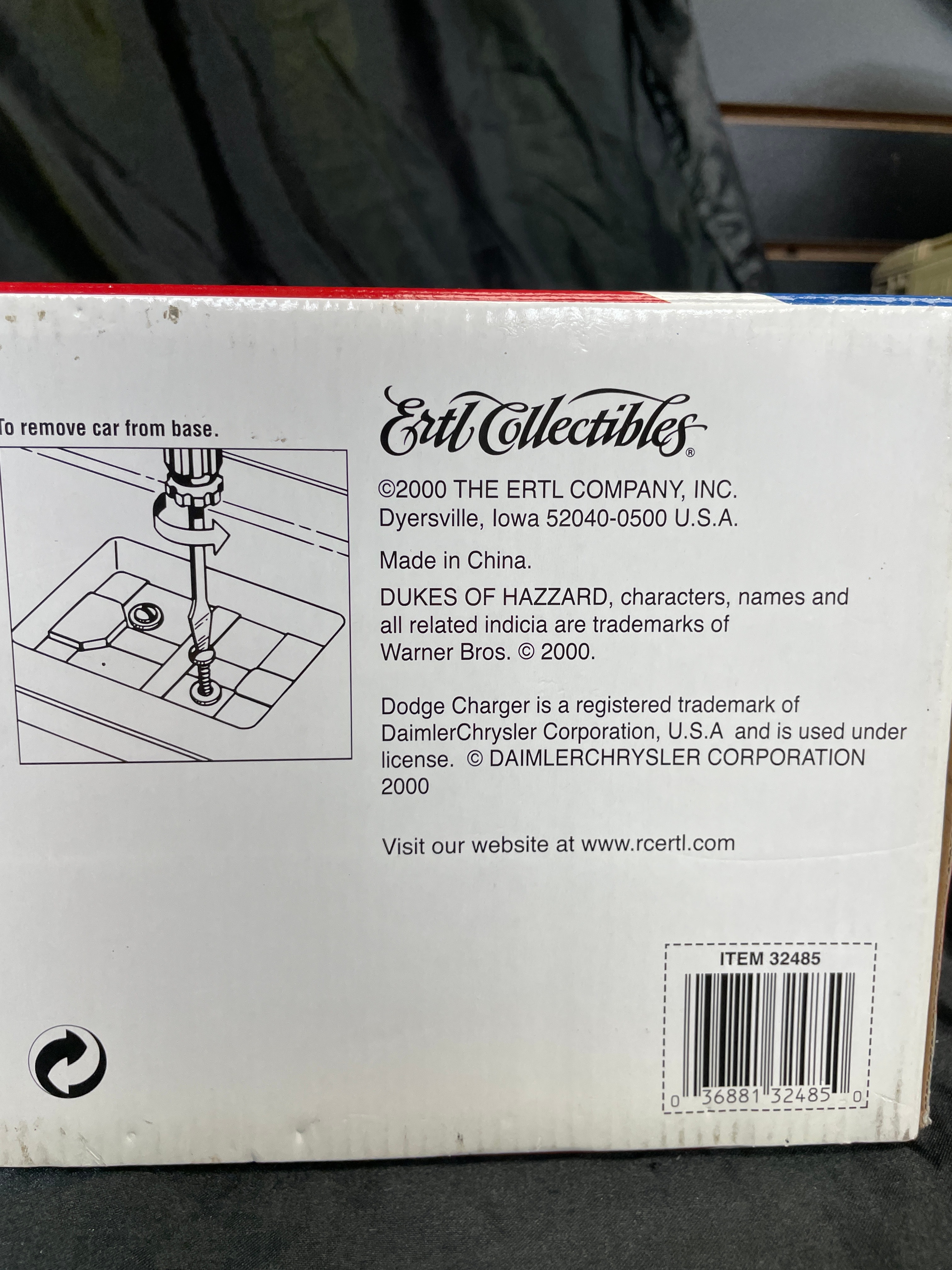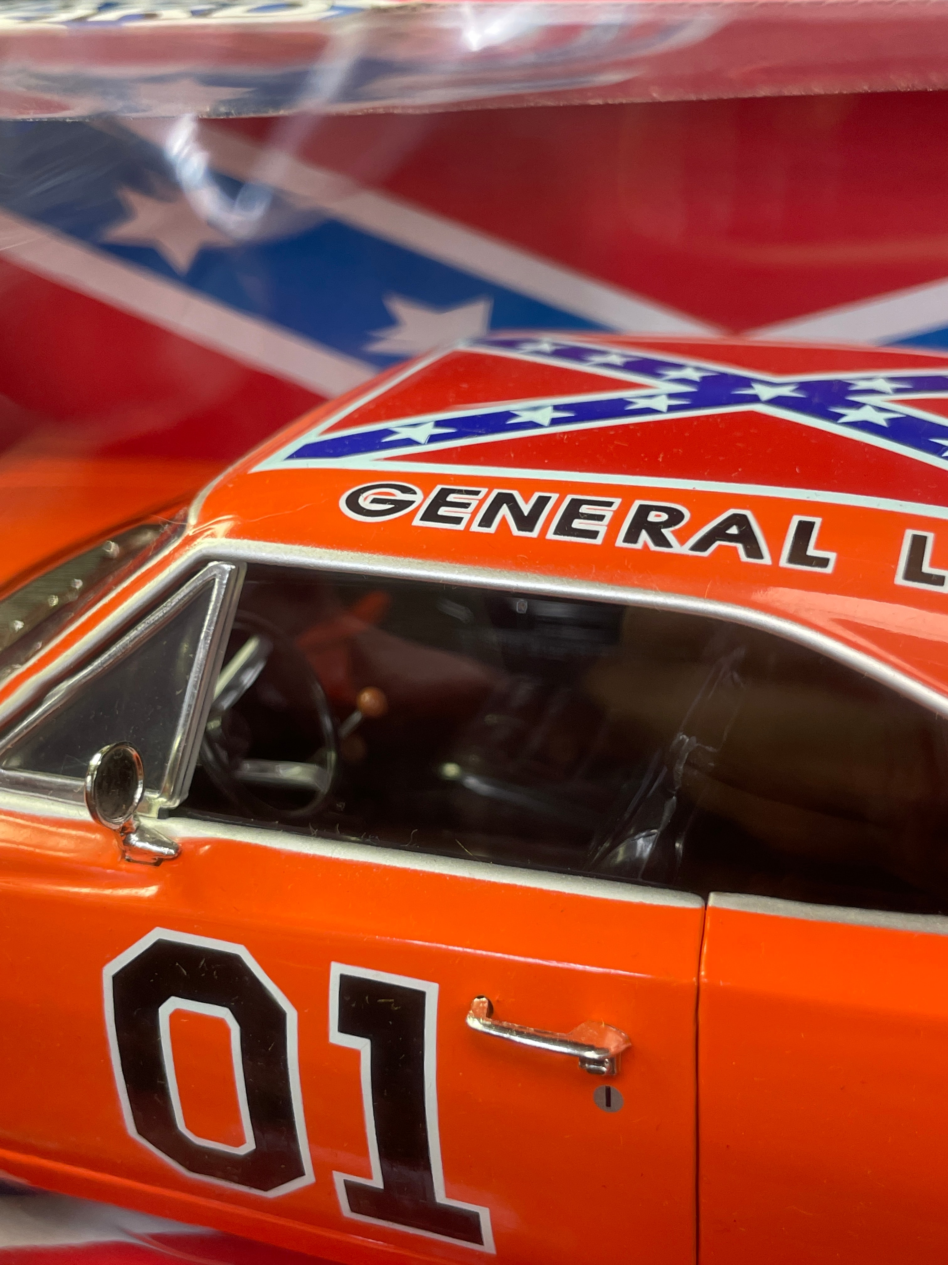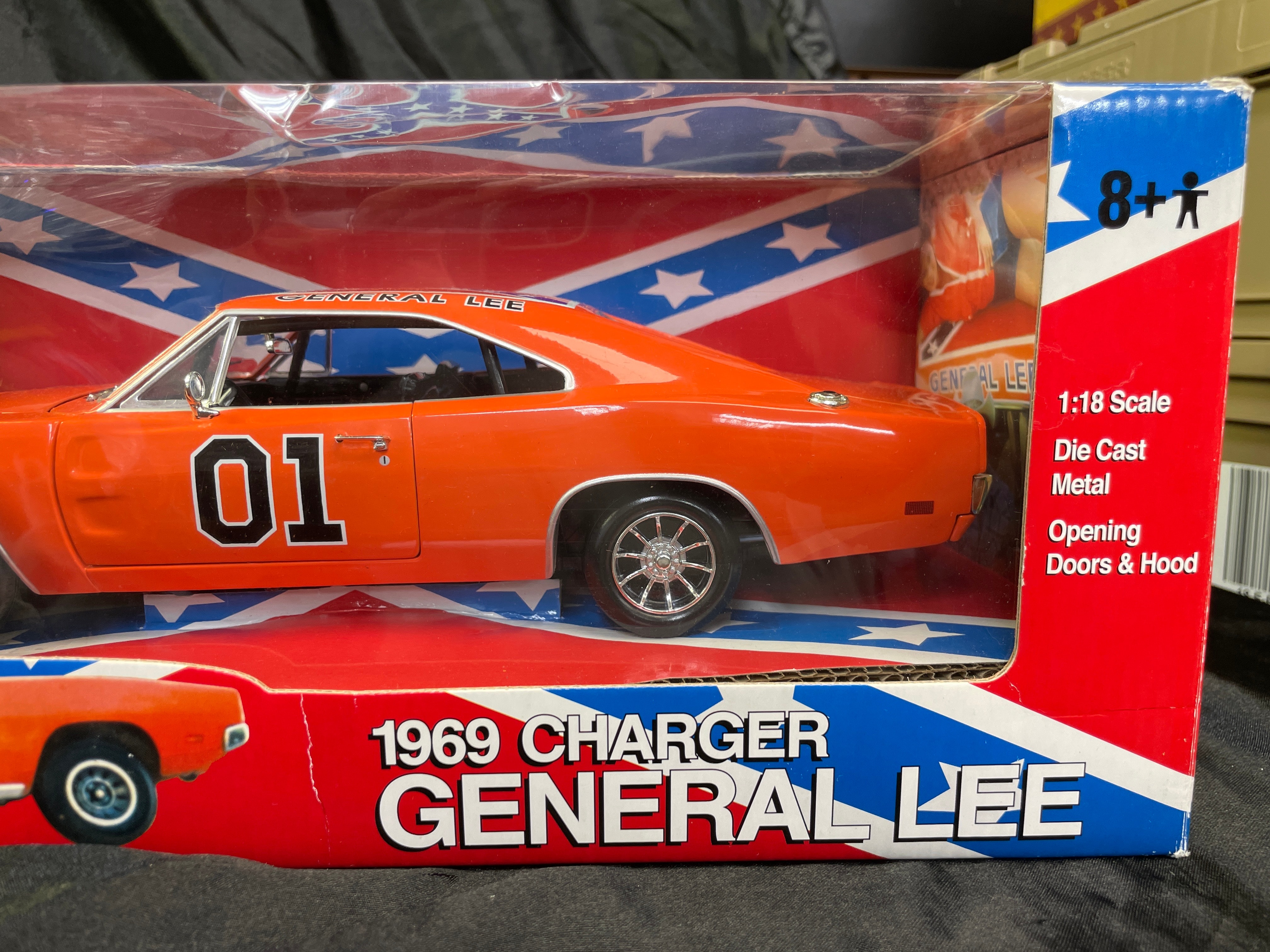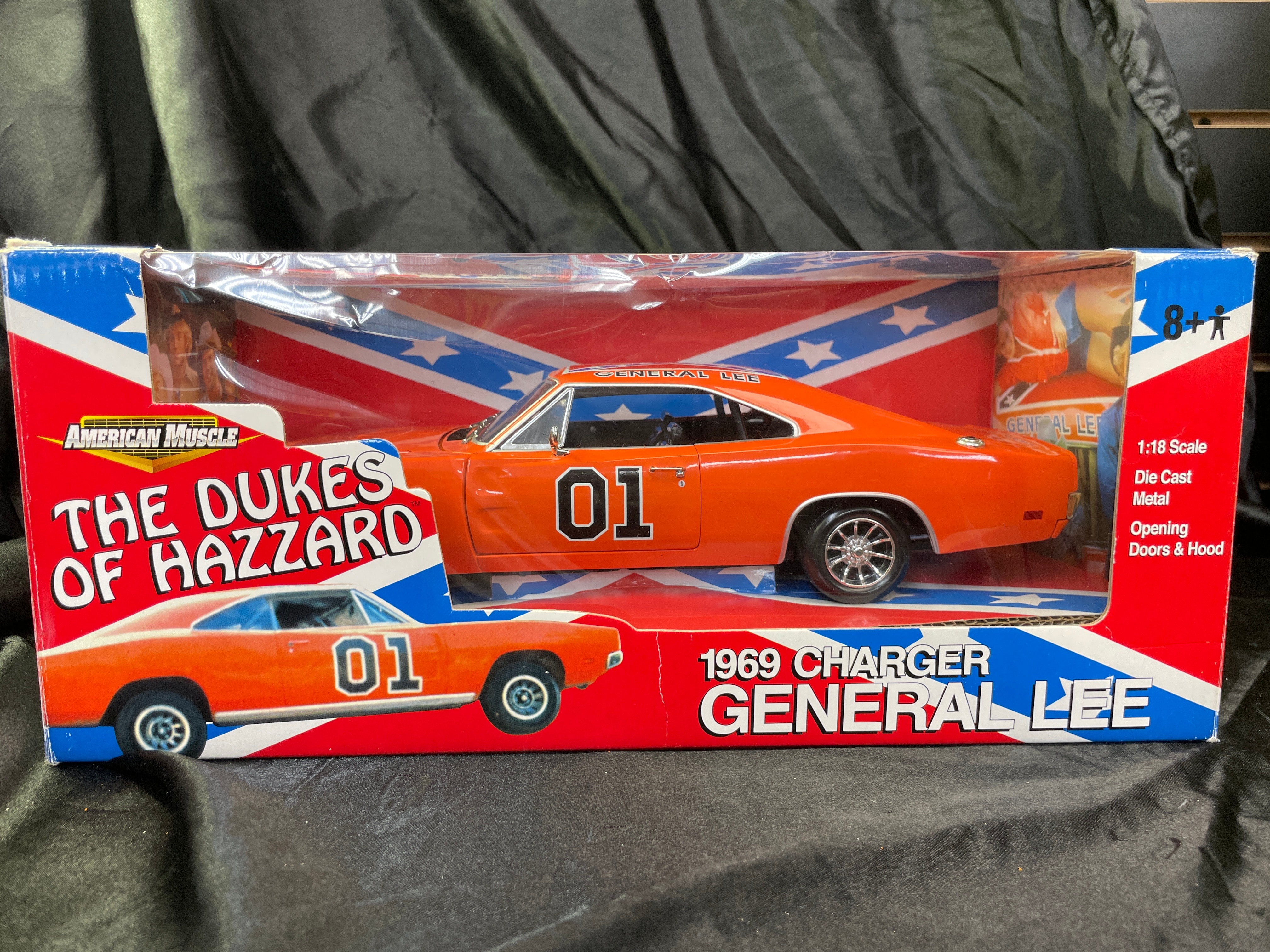 An Ertl American Muscle 1:18 scale die-cast metal model of the 1969 Dodge Charger, famously known as the “General Lee” from “The Dukes of Hazzard” television series. The model is finished in bright orange with the racing number “01” prominently displayed on its doors and the Confederate Battle Flag design with “GENERAL LEE” text on its roof. Features include opening doors and hood. The model is presented new in its original “AMERICAN MUSCLE” branded box by Ertl Collectibles, which features a clear plastic window, character images, and descriptive text. The packaging is marked with copyright information from 2000, indicating manufacture by The Ertl Company in China, and bears item number 32485 along with standard safety warnings repeated in multiple languages.