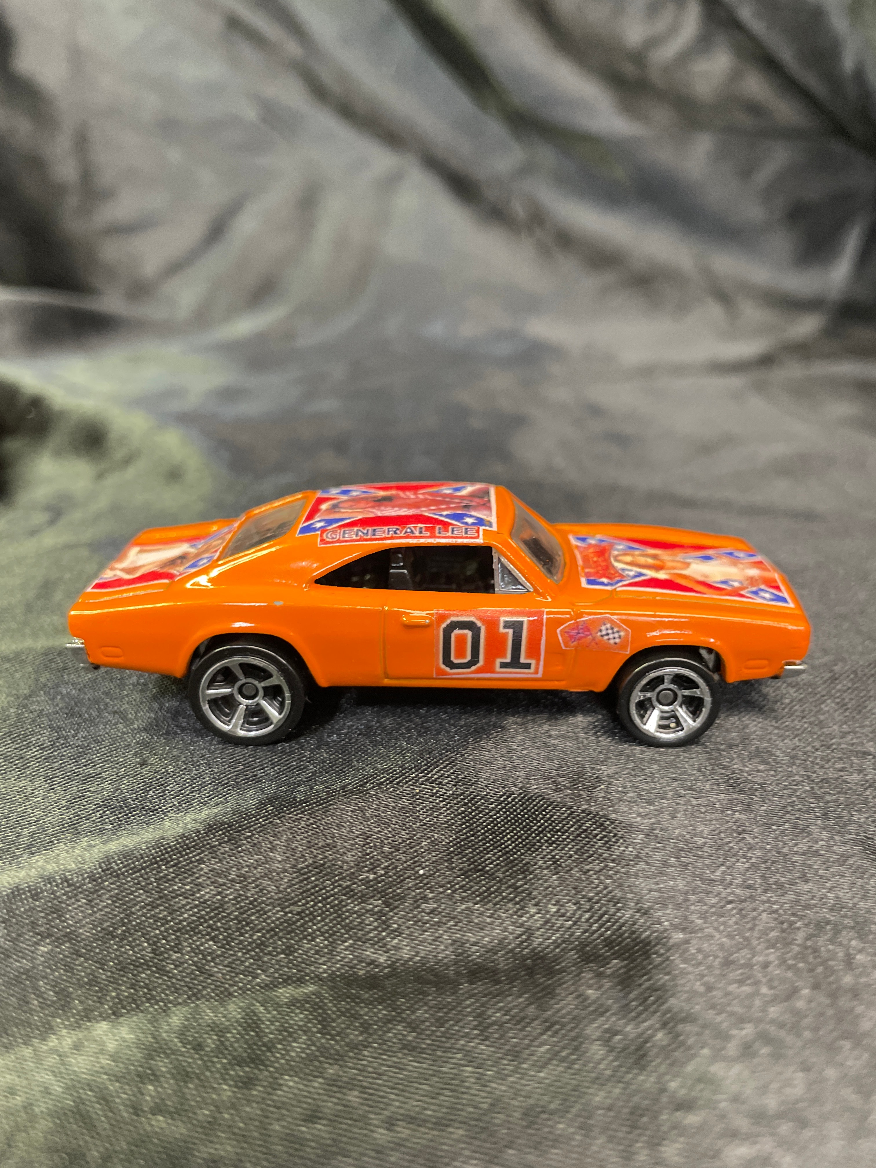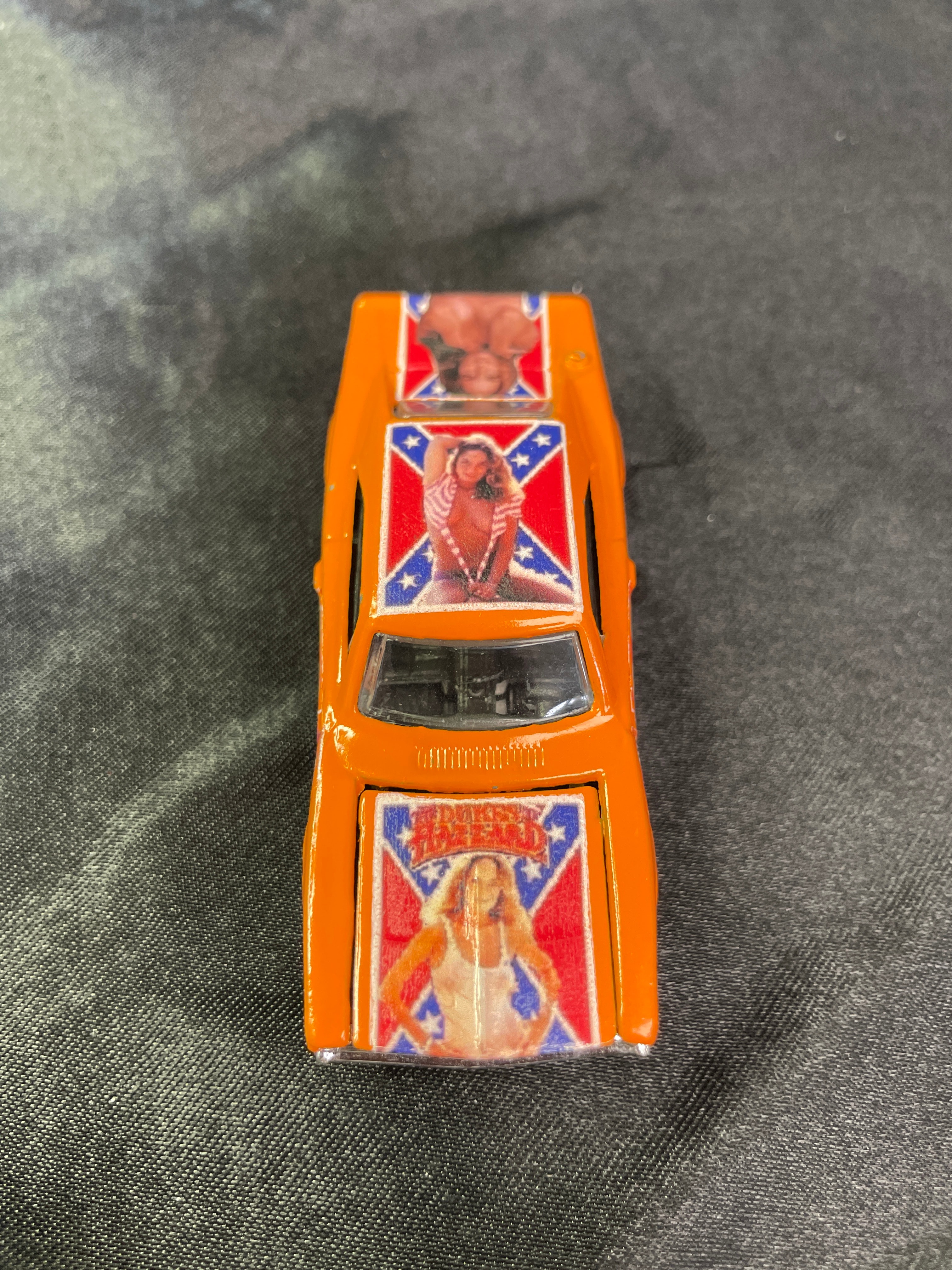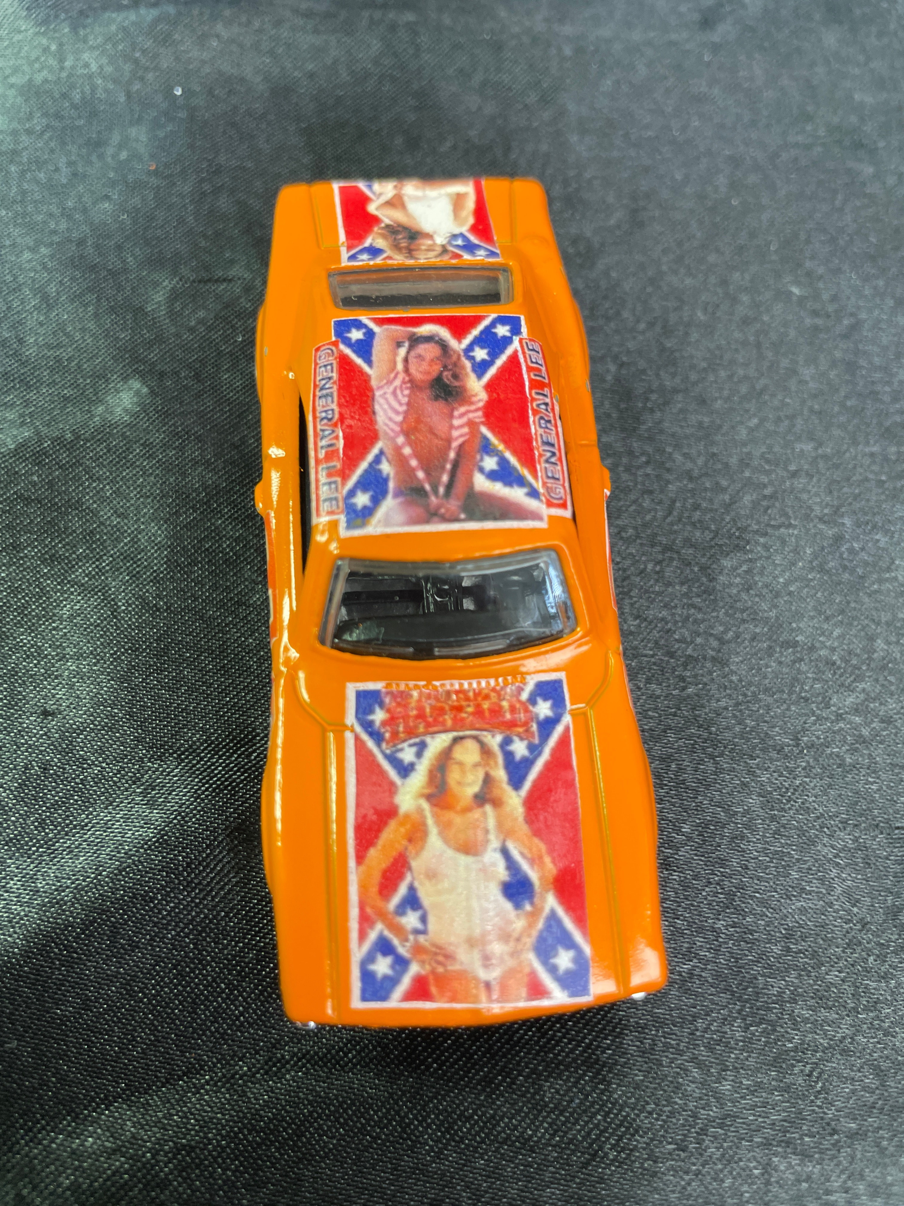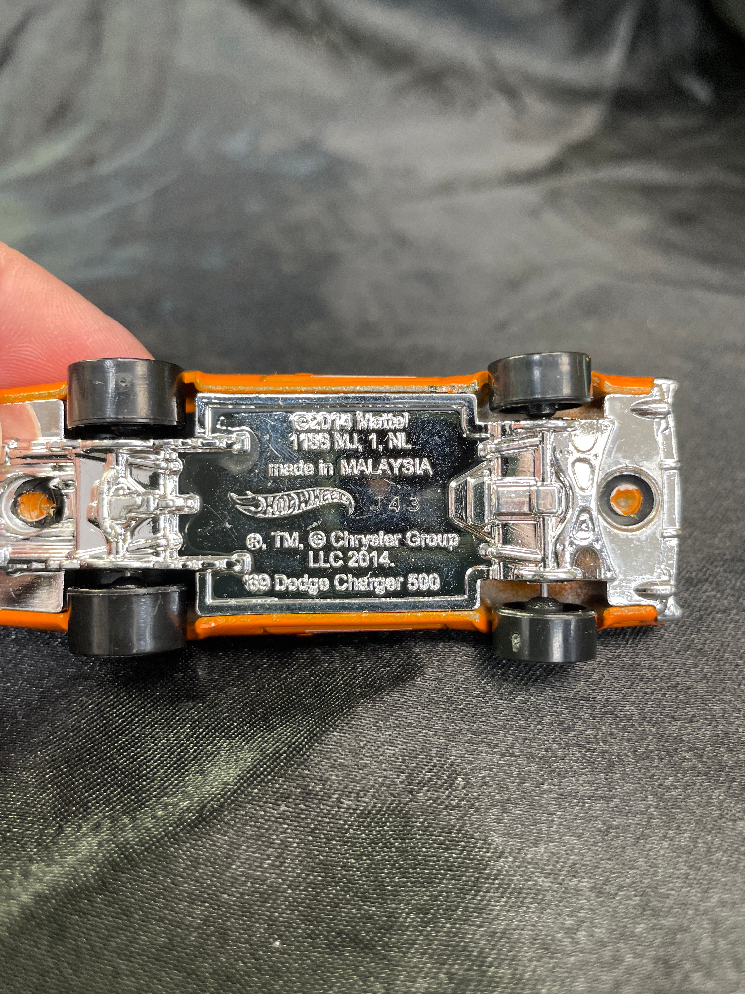 A pair of Hot Wheels ‘General Lee’ ’69 Dodge Charger 500 die-cast toy cars, modeled after the iconic vehicle from ‘The Dukes of Hazzard’ television series. Each car is orange with a prominent ’01’ in black with a white outline on its doors and a checkered racing flag emblem on the front fenders. The hood, roof, and trunk are decorated with a Confederate battle flag motif, overlaid with images of women and the text ‘GENERAL LEE’ on the roof, and ‘DUKES OF HAZZARD’ on the hood and trunk. The underside of one car is marked ‘©2014 Mattel, ‘ ‘1186 MJ 1, NL, ‘ ‘made in MALAYSIA, ‘ and ‘®. TM. © Chrysler Group LLC 2014,’ alongside the Hot Wheels logo and ”69 Dodge Charger 500.’ One car’s hood is shown to open, revealing a detailed engine compartment.