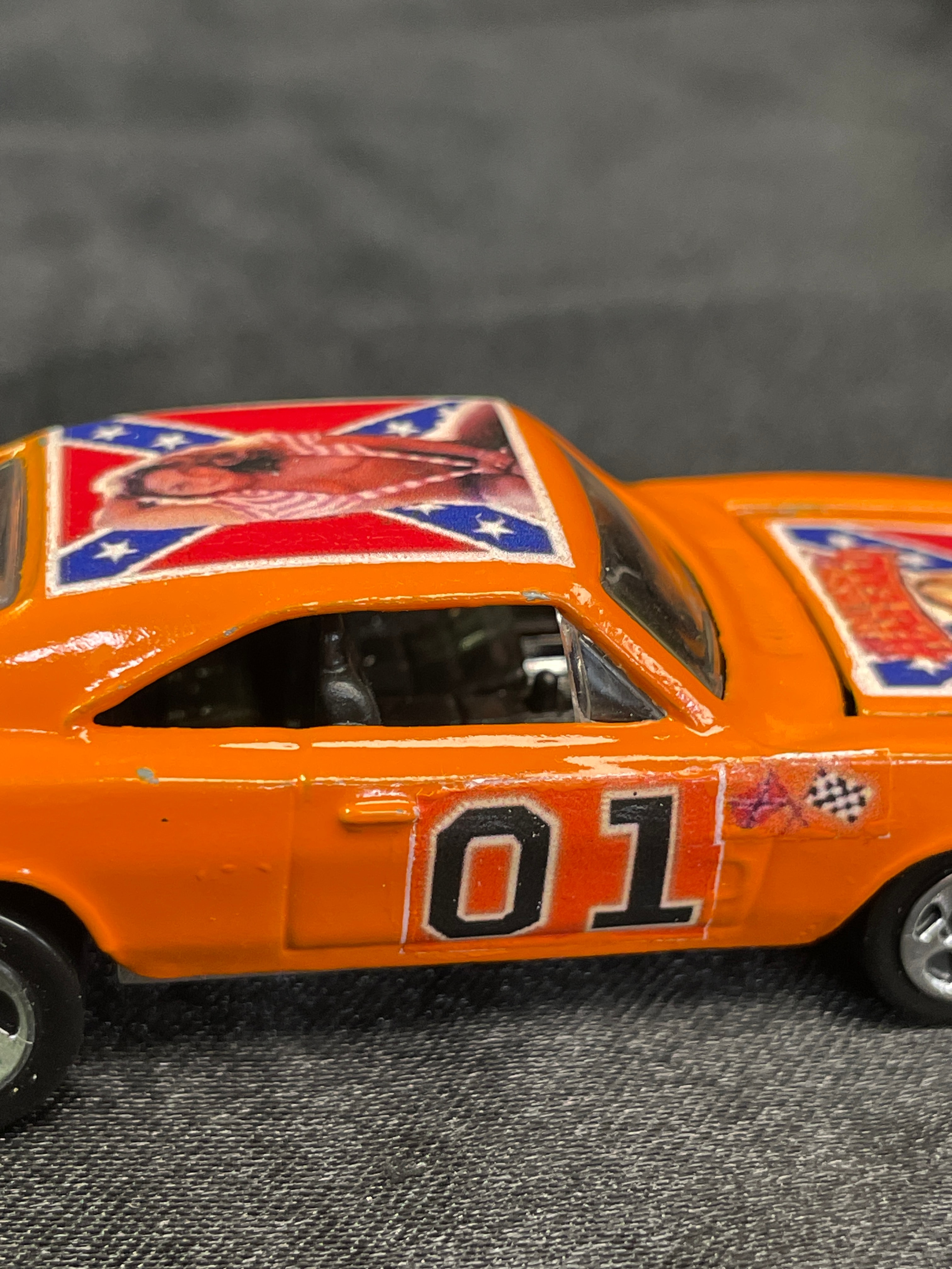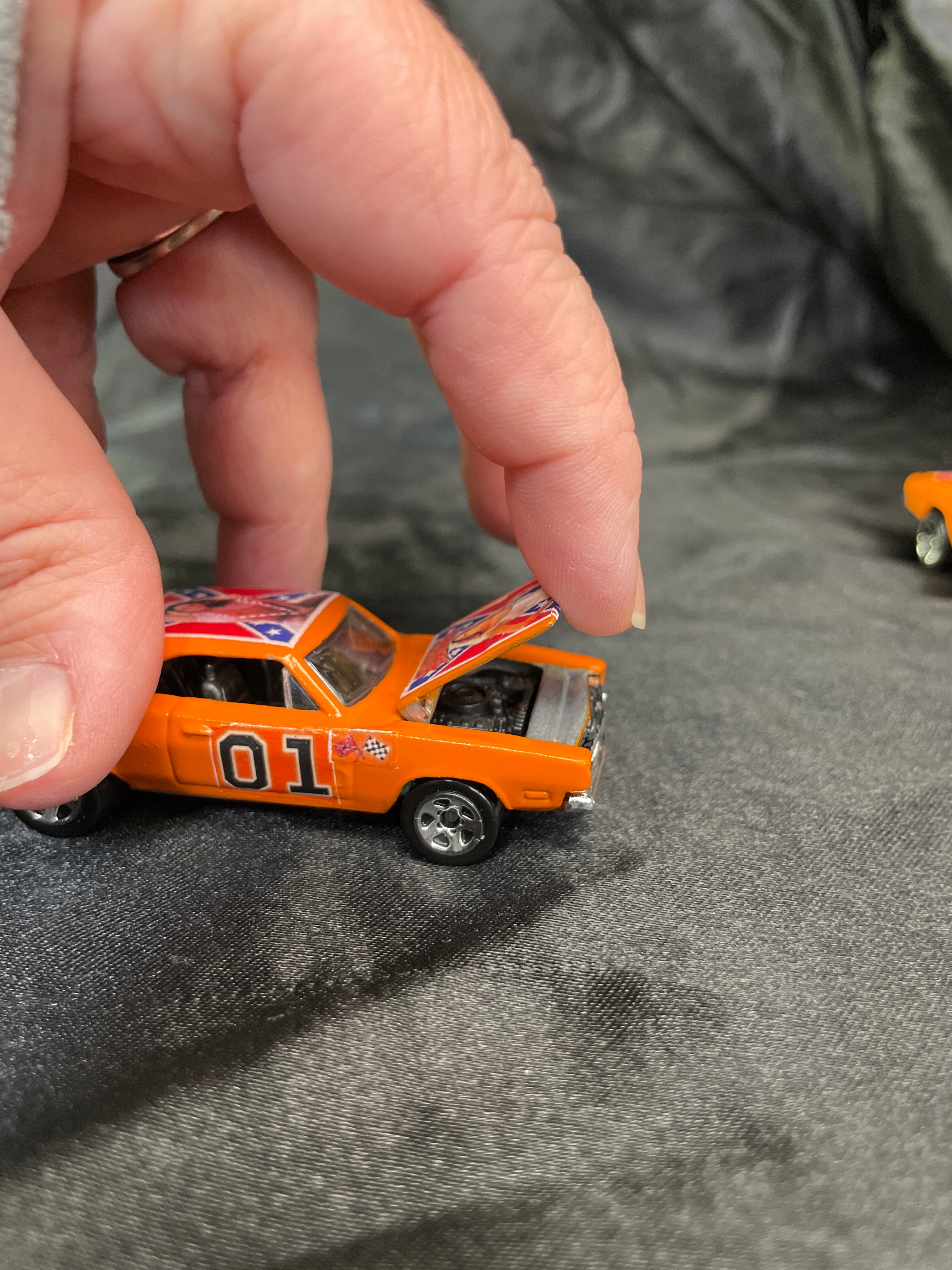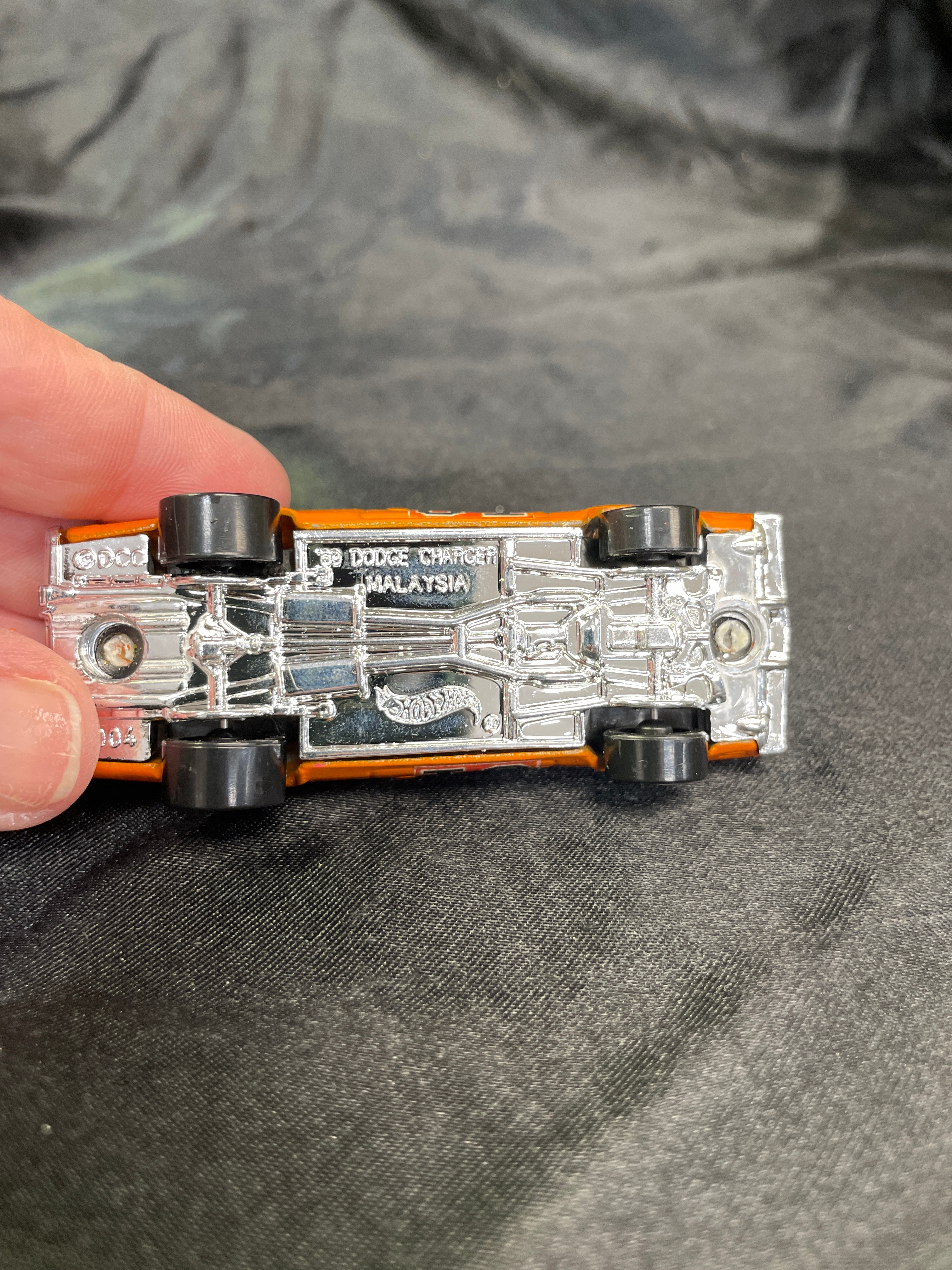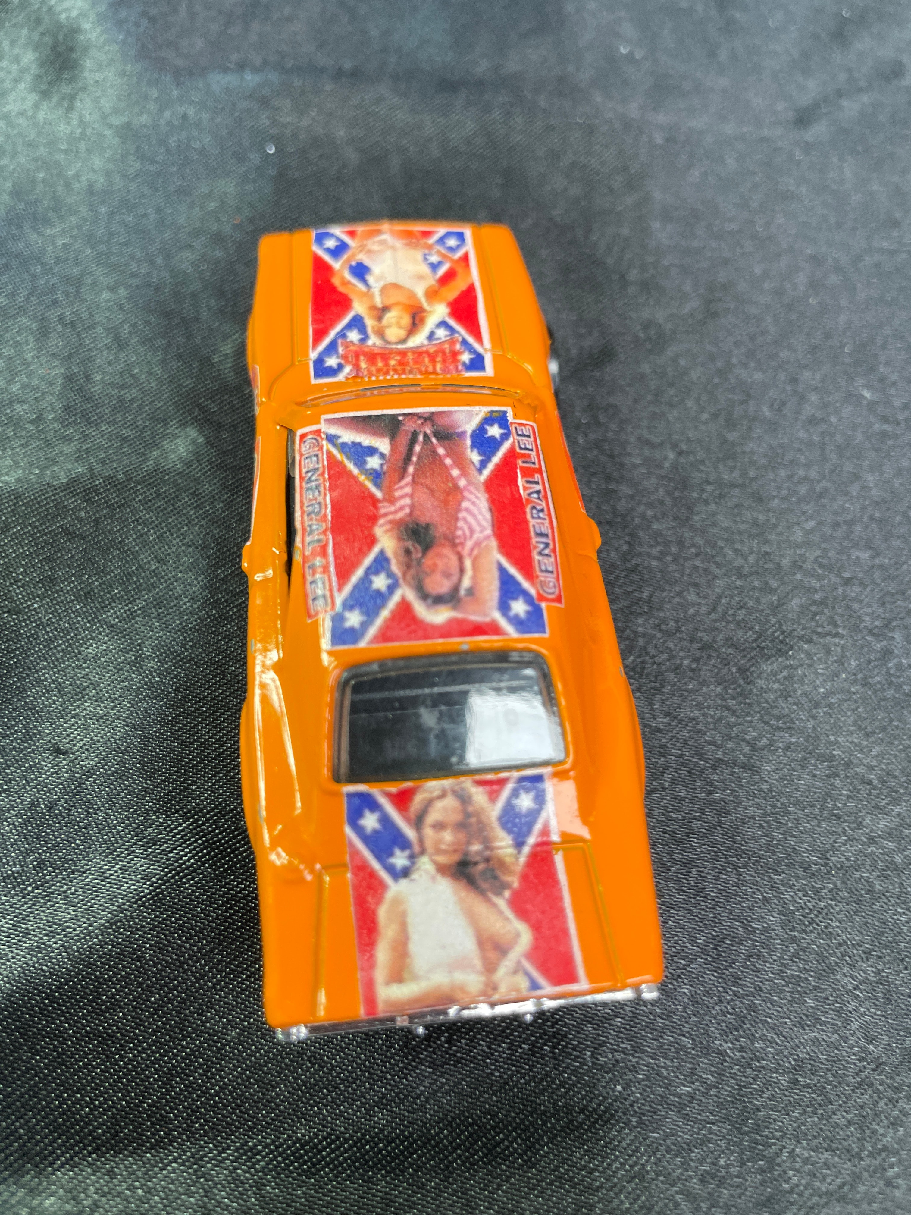 A pair of Hot Wheels ‘General Lee’ ’69 Dodge Charger 500 die-cast toy cars, modeled after the iconic vehicle from ‘The Dukes of Hazzard’ television series. Each car is orange with a prominent ’01’ in black with a white outline on its doors and a checkered racing flag emblem on the front fenders. The hood, roof, and trunk are decorated with a Confederate battle flag motif, overlaid with images of women and the text ‘GENERAL LEE’ on the roof, and ‘DUKES OF HAZZARD’ on the hood and trunk. The underside of one car is marked ‘©2014 Mattel, ‘ ‘1186 MJ 1, NL, ‘ ‘made in MALAYSIA, ‘ and ‘®. TM. © Chrysler Group LLC 2014,’ alongside the Hot Wheels logo and ”69 Dodge Charger 500.’ One car’s hood is shown to open, revealing a detailed engine compartment.