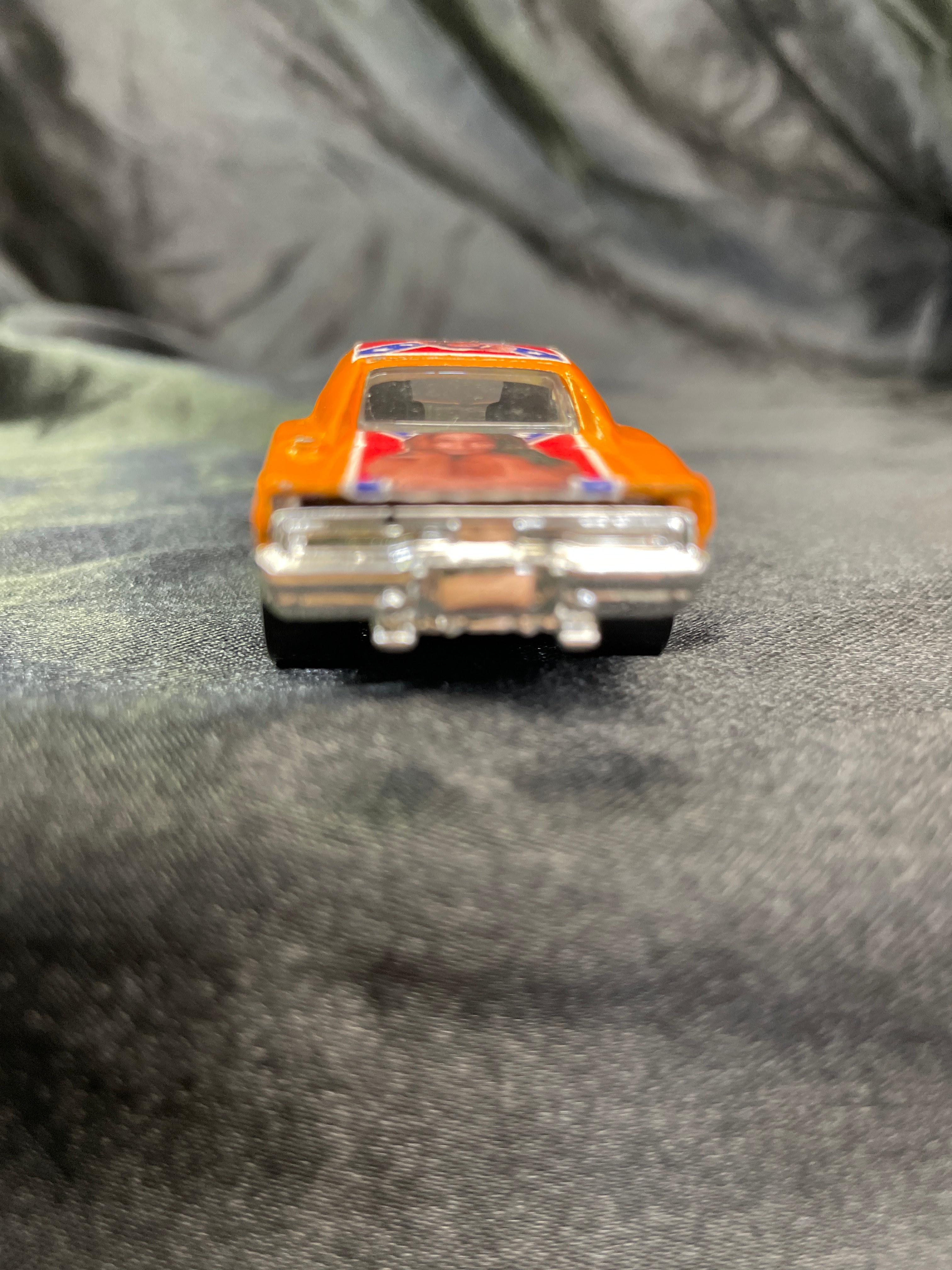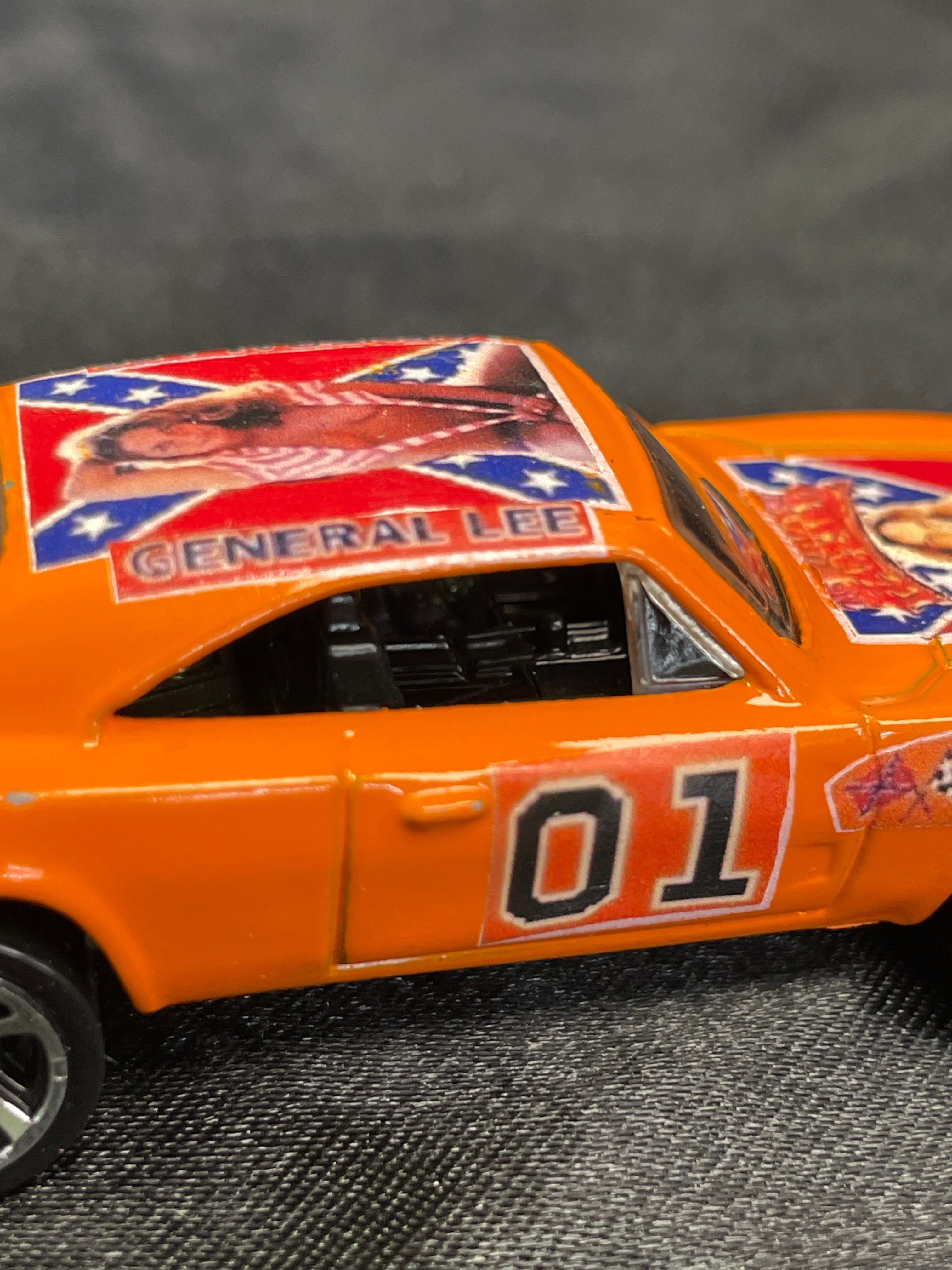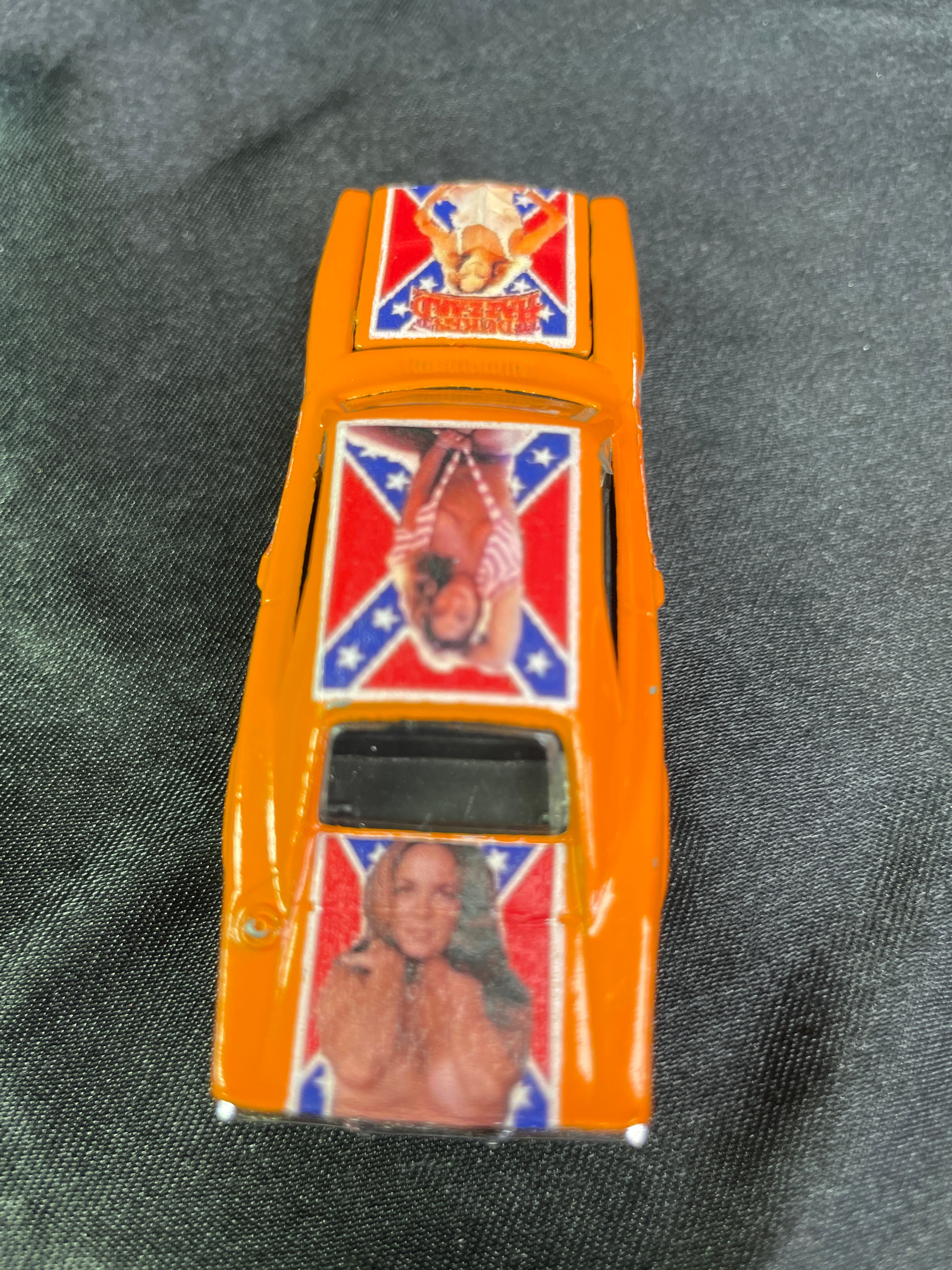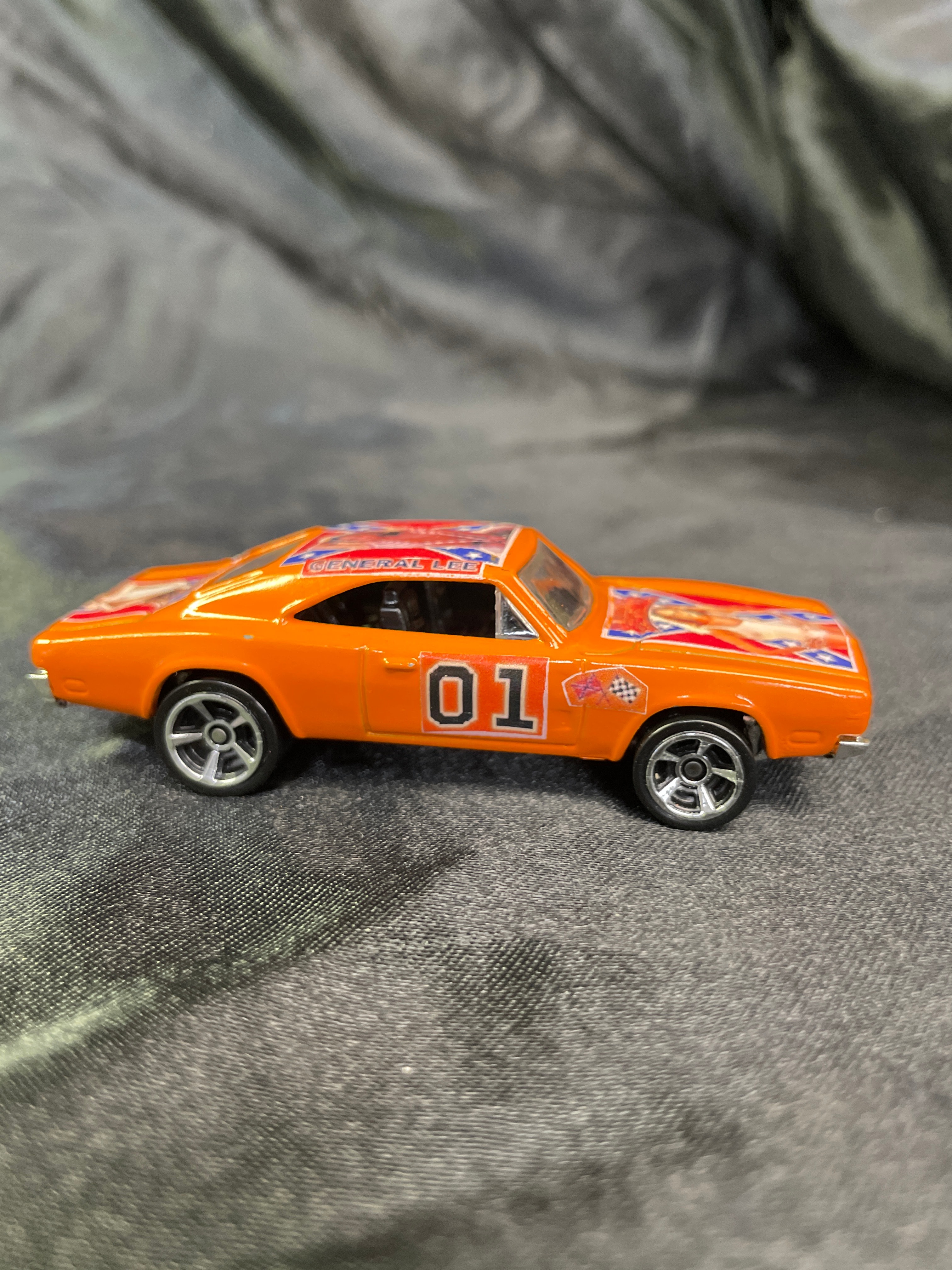 A pair of Hot Wheels ‘General Lee’ ’69 Dodge Charger 500 die-cast toy cars, modeled after the iconic vehicle from ‘The Dukes of Hazzard’ television series. Each car is orange with a prominent ’01’ in black with a white outline on its doors and a checkered racing flag emblem on the front fenders. The hood, roof, and trunk are decorated with a Confederate battle flag motif, overlaid with images of women and the text ‘GENERAL LEE’ on the roof, and ‘DUKES OF HAZZARD’ on the hood and trunk. The underside of one car is marked ‘©2014 Mattel, ‘ ‘1186 MJ 1, NL, ‘ ‘made in MALAYSIA, ‘ and ‘®. TM. © Chrysler Group LLC 2014,’ alongside the Hot Wheels logo and ”69 Dodge Charger 500.’ One car’s hood is shown to open, revealing a detailed engine compartment.