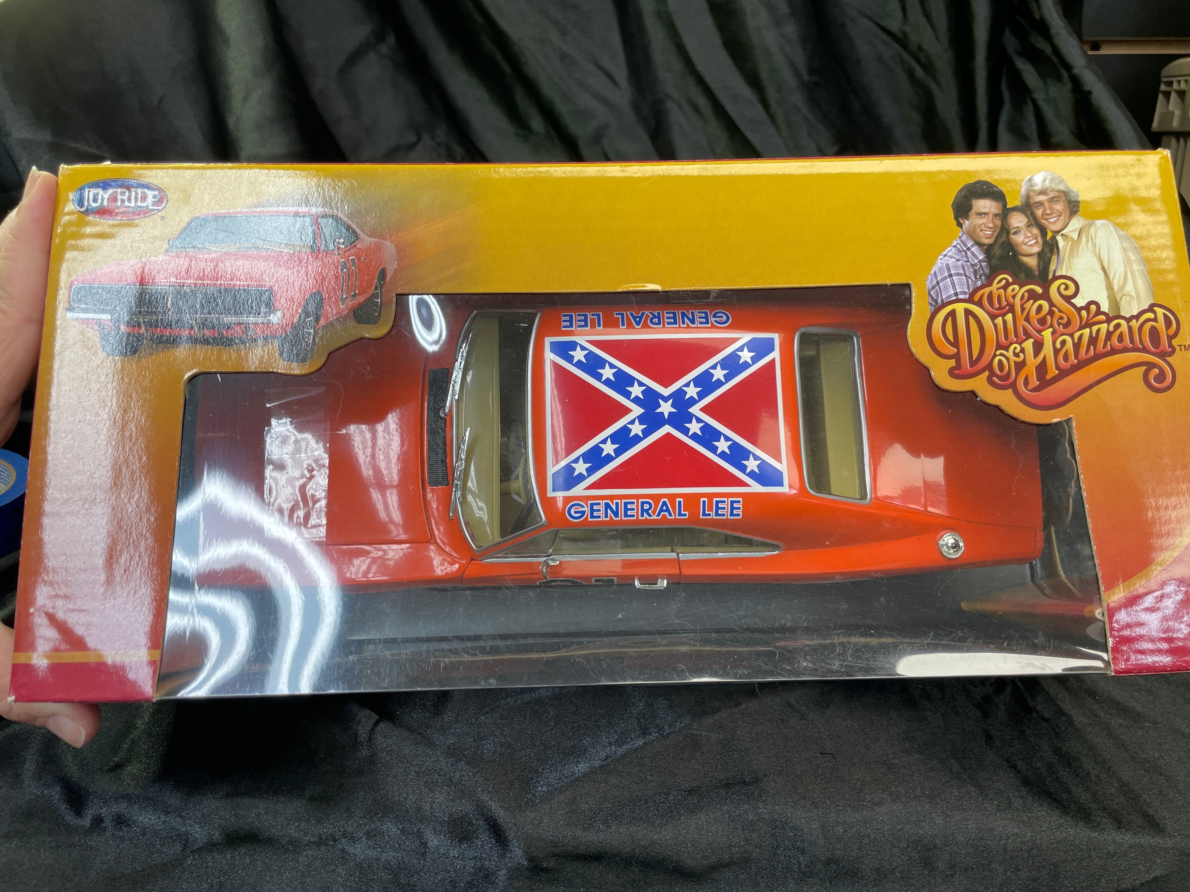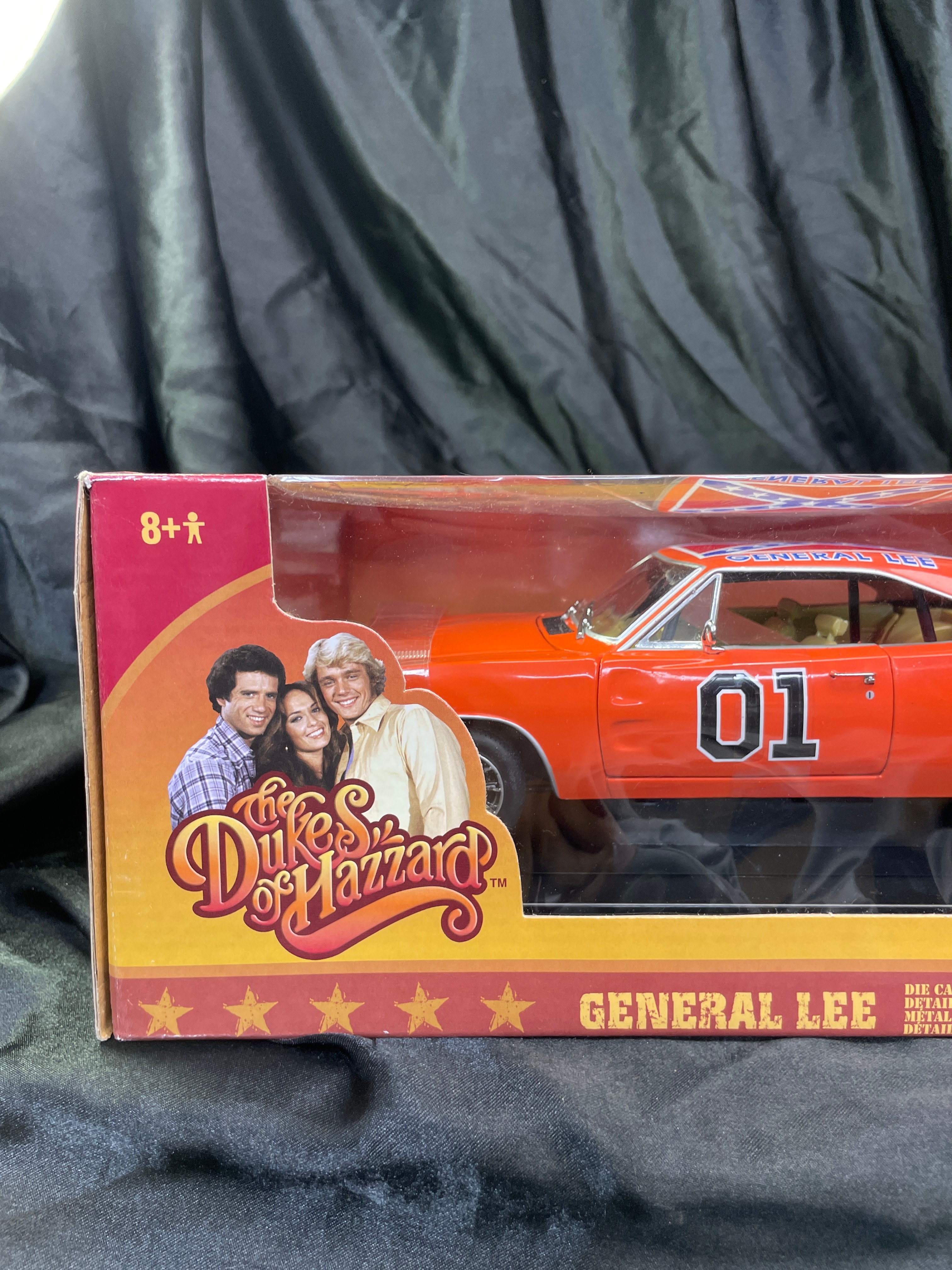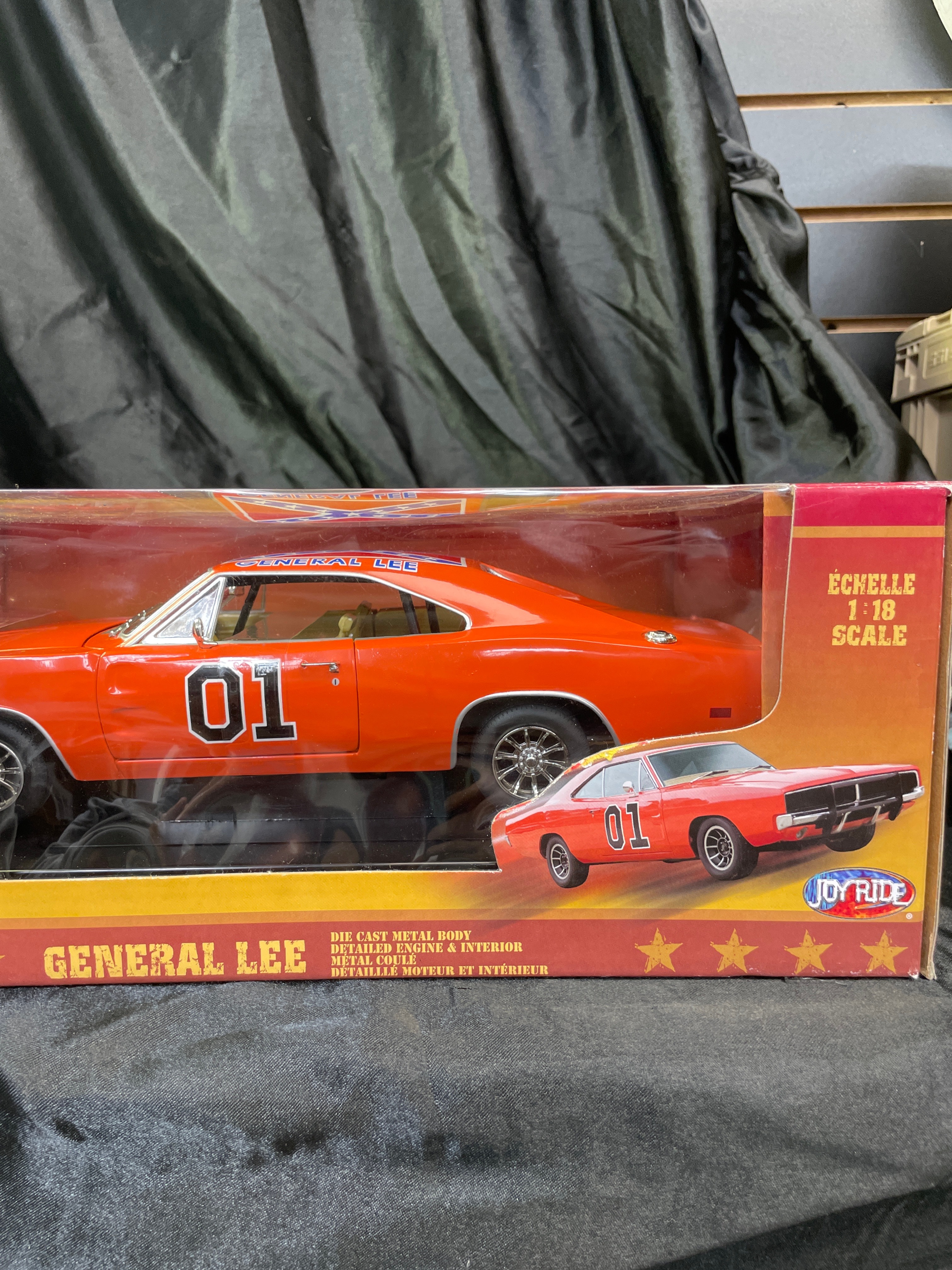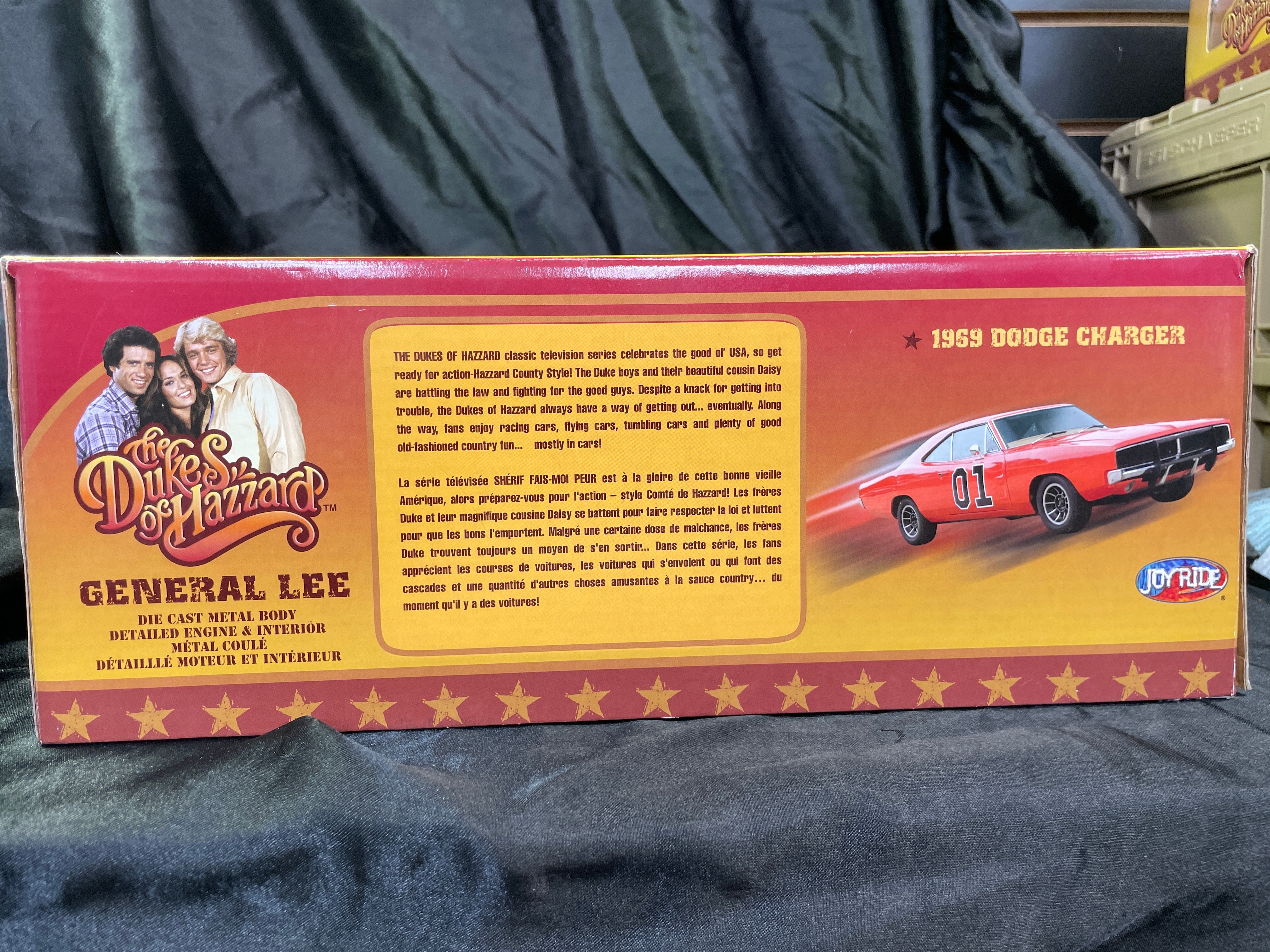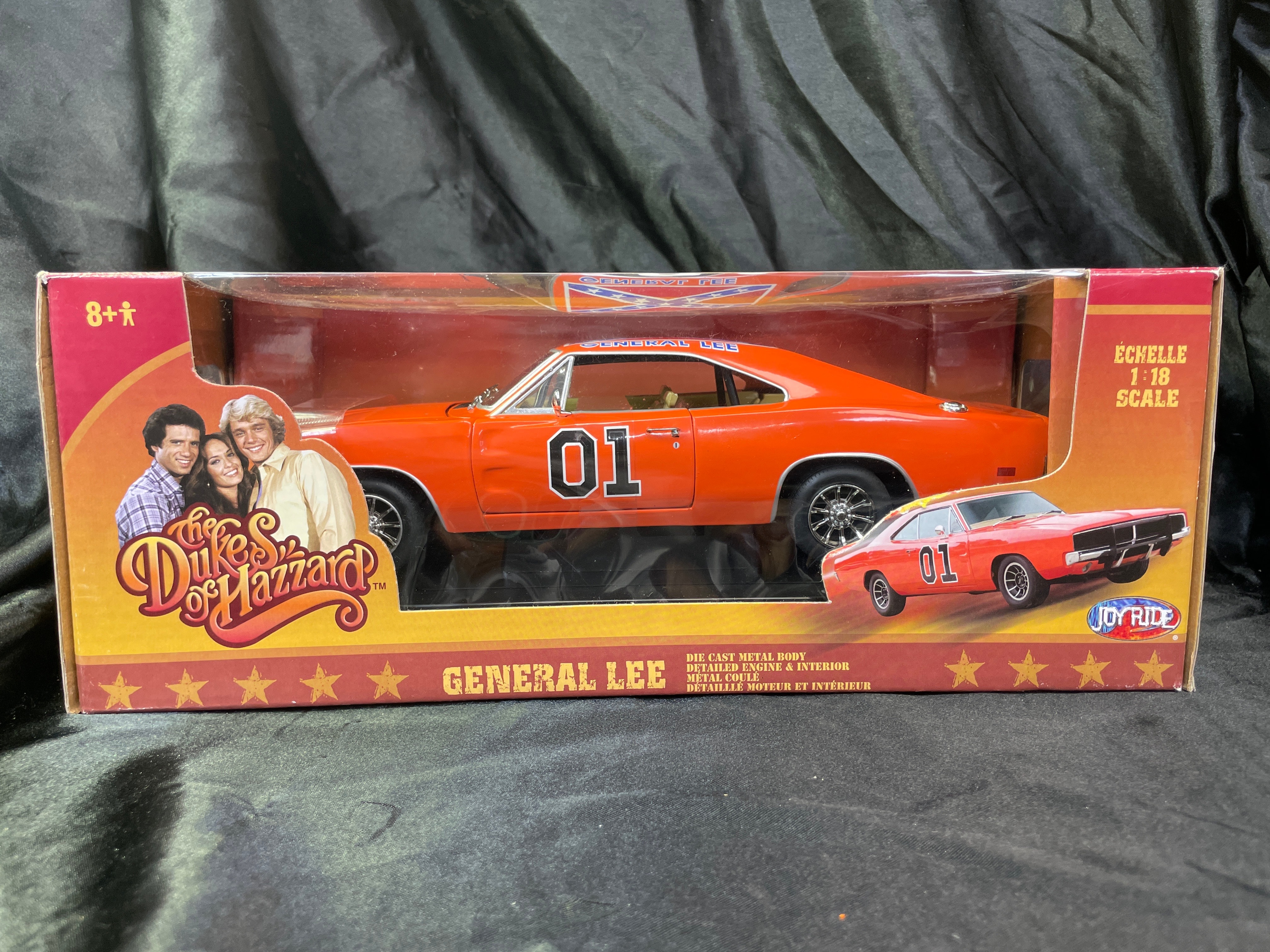 An RC2 Joy Ride ‘The Dukes of Hazzard General Lee’ 1969 Dodge Charger 1:18 scale die-cast model, presented in its original cardboard and clear plastic window box. The model car is predominantly orange with “01” prominently displayed on the doors and a Confederate battle flag motif bearing “GENERAL LEE” on the roof. The packaging identifies it as a product of “JOY RIDE” by “RC2 BRANDS, INC.” with a copyright date of 2006. It features a die-cast metal body with a detailed engine and interior. Further markings include an age recommendation of “8+”, “Made in China, ” and descriptive text about “The Dukes of Hazzard” series in both English and French.
