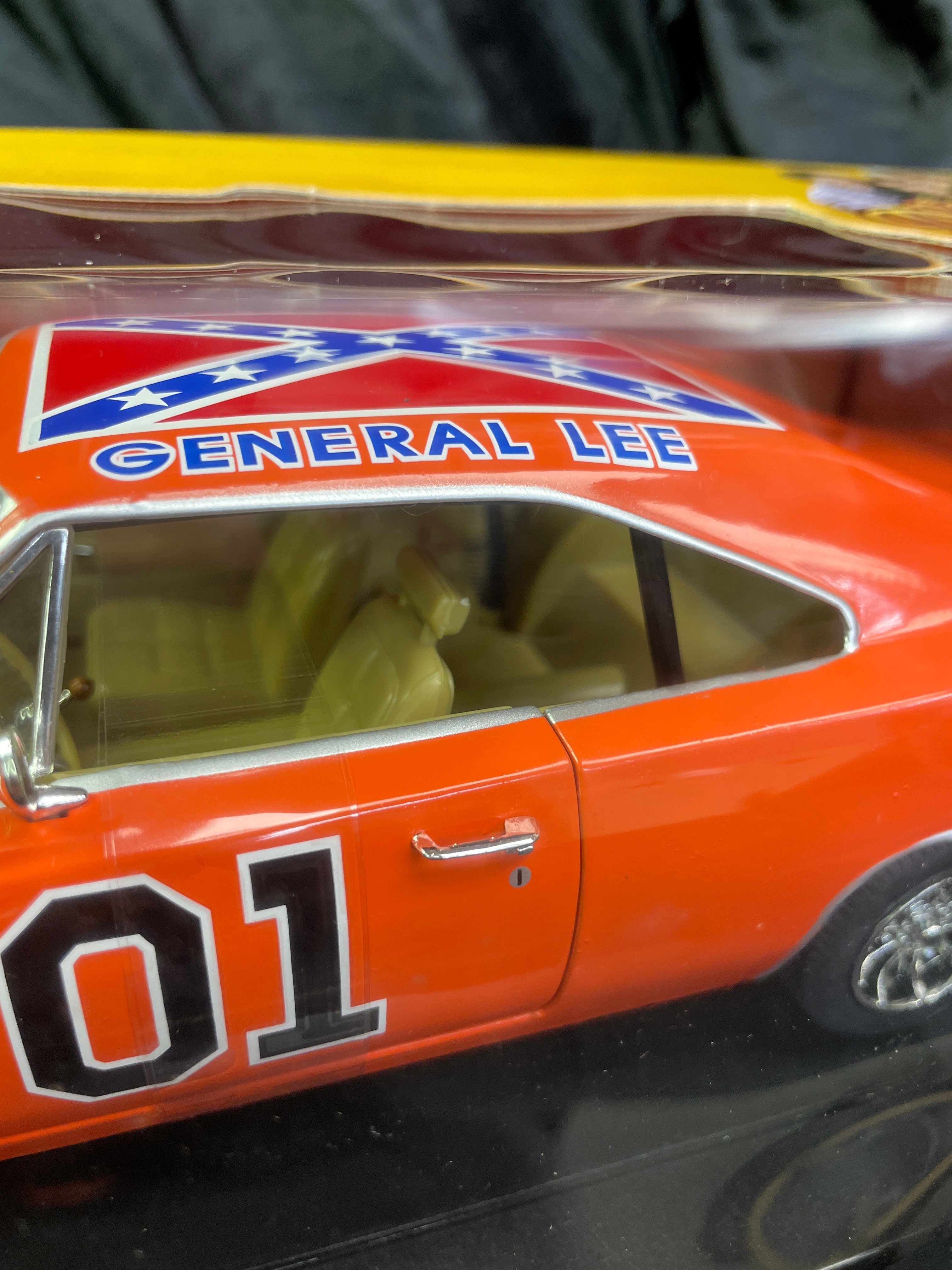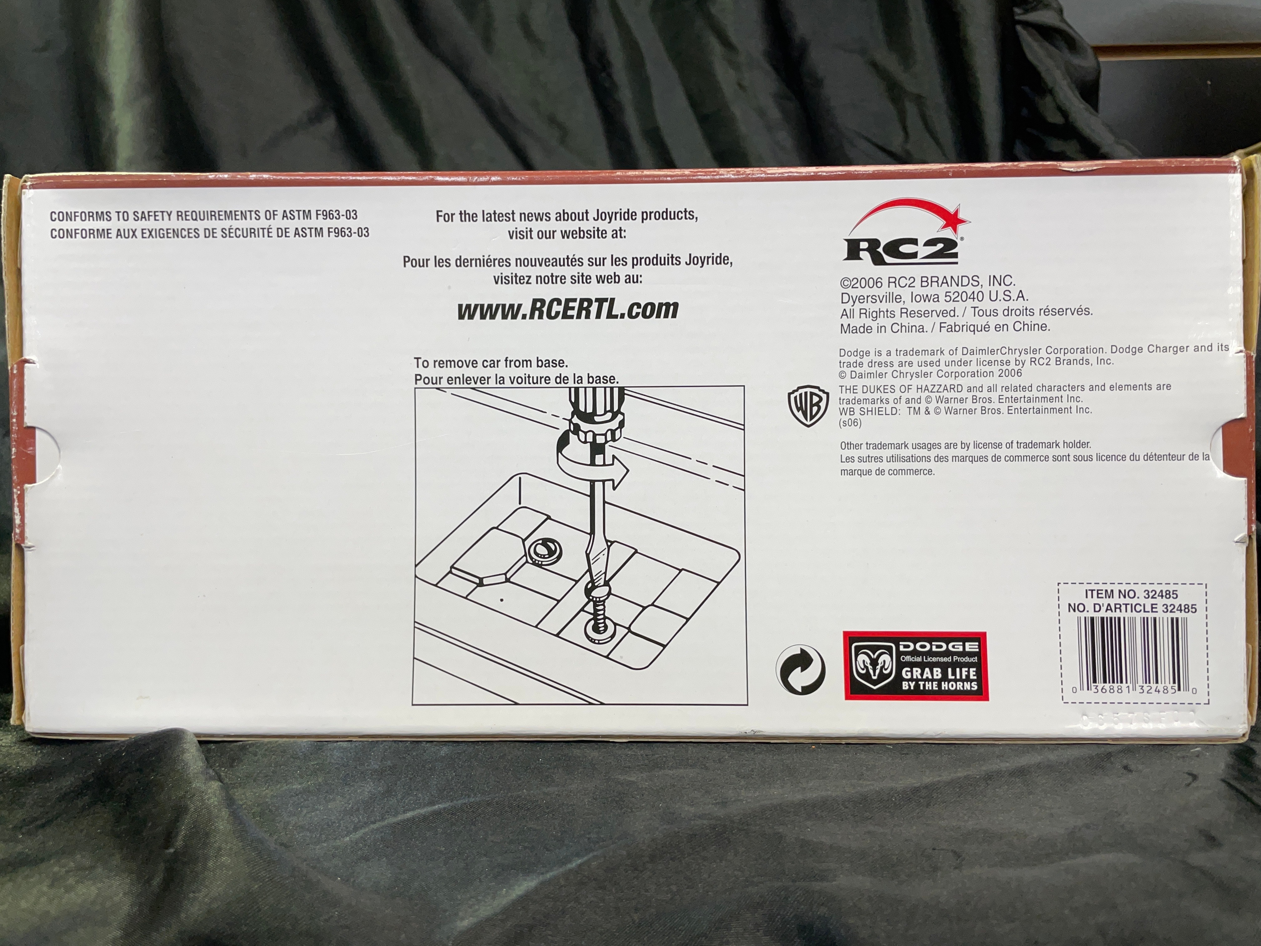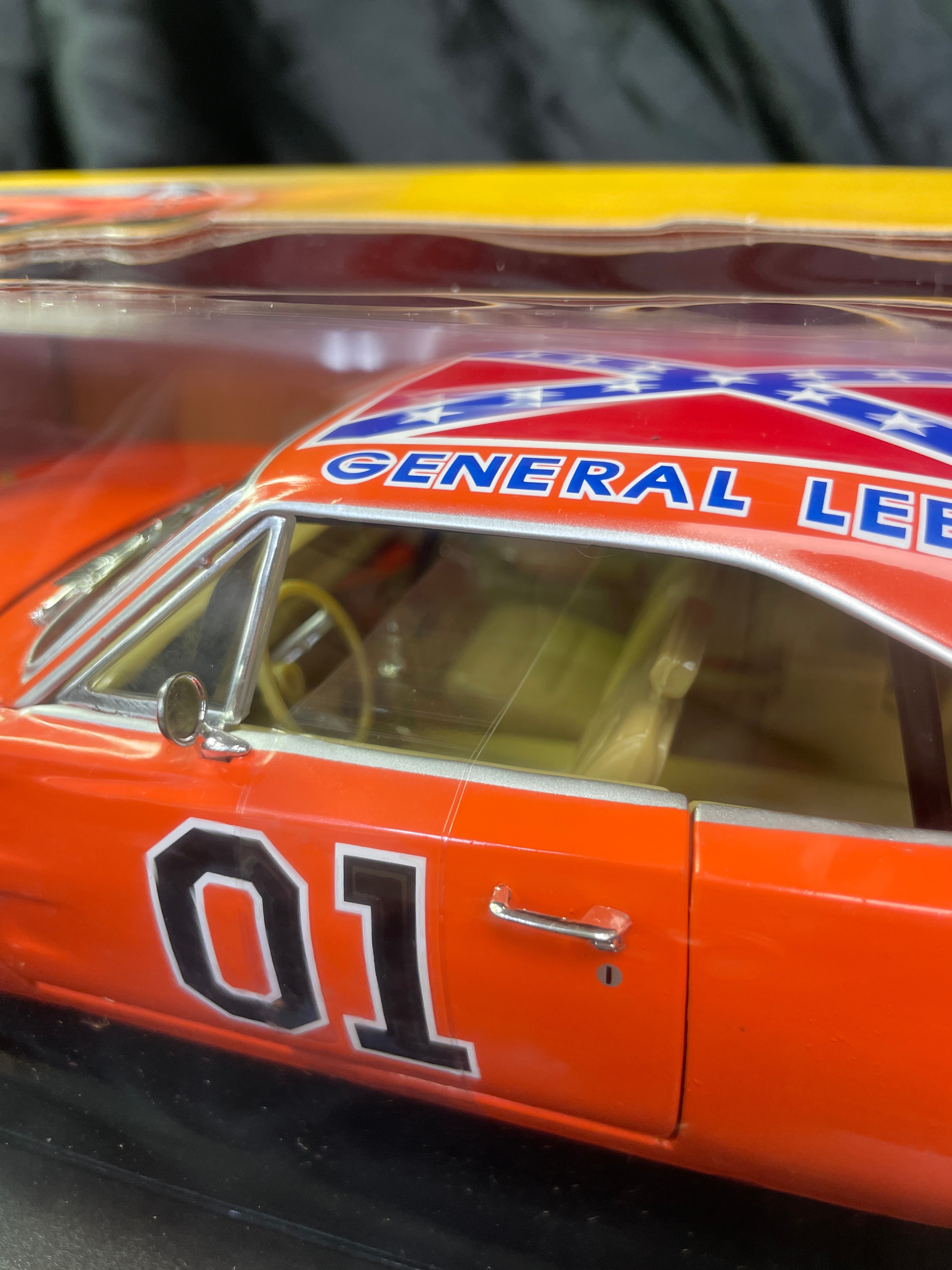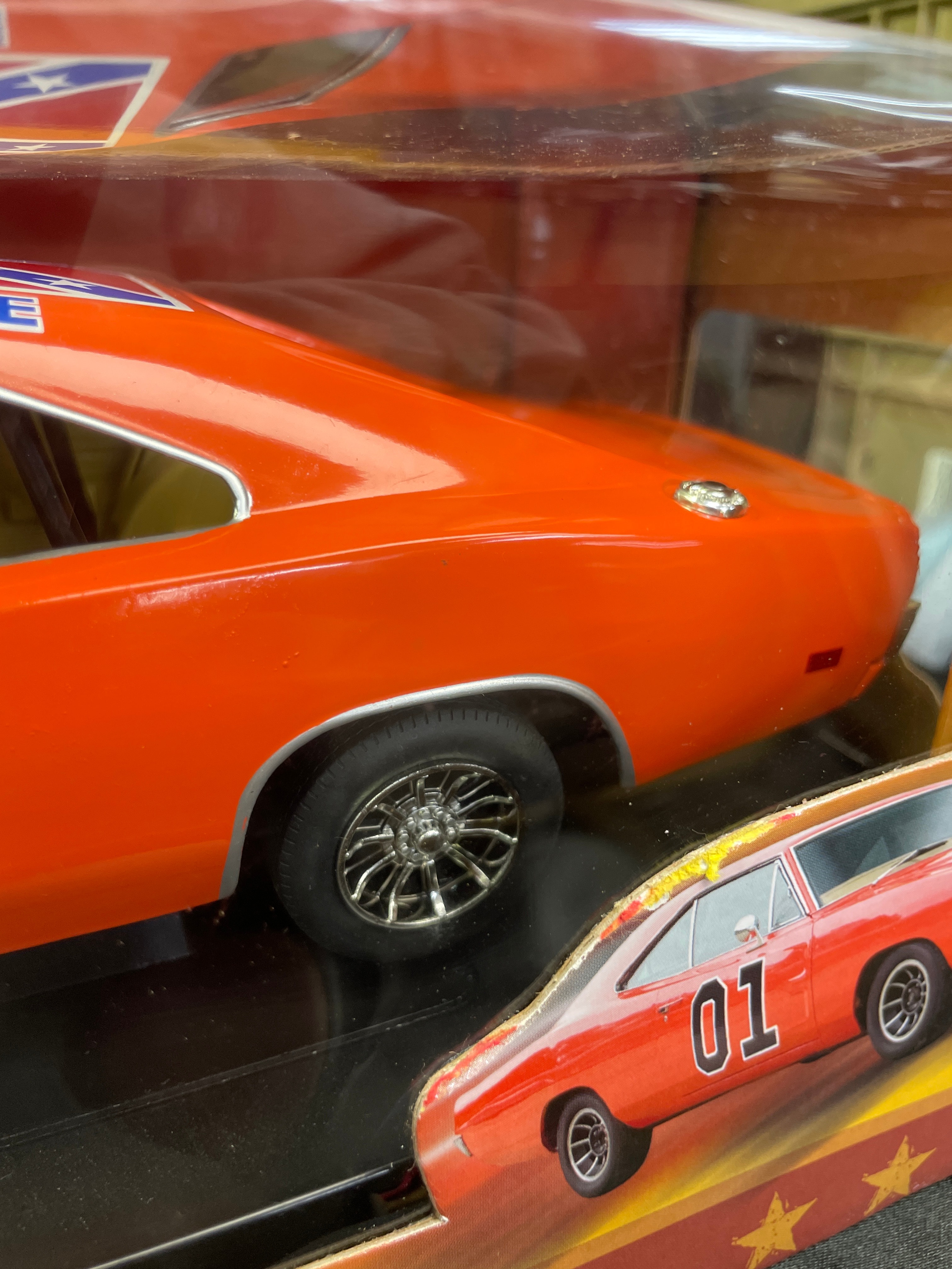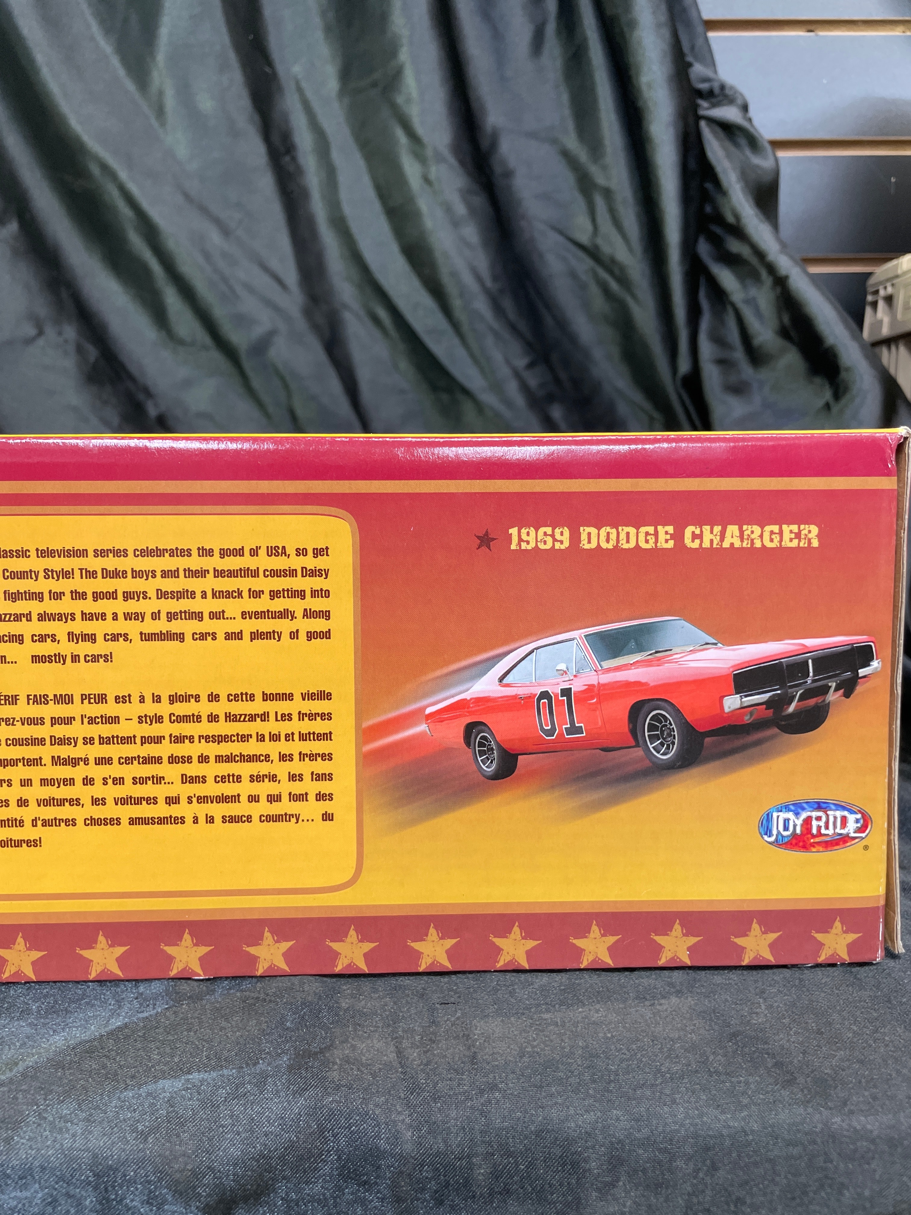 An RC2 Joy Ride ‘The Dukes of Hazzard General Lee’ 1969 Dodge Charger 1:18 scale die-cast model, presented in its original cardboard and clear plastic window box. The model car is predominantly orange with “01” prominently displayed on the doors and a Confederate battle flag motif bearing “GENERAL LEE” on the roof. The packaging identifies it as a product of “JOY RIDE” by “RC2 BRANDS, INC.” with a copyright date of 2006. It features a die-cast metal body with a detailed engine and interior. Further markings include an age recommendation of “8+”, “Made in China, ” and descriptive text about “The Dukes of Hazzard” series in both English and French.