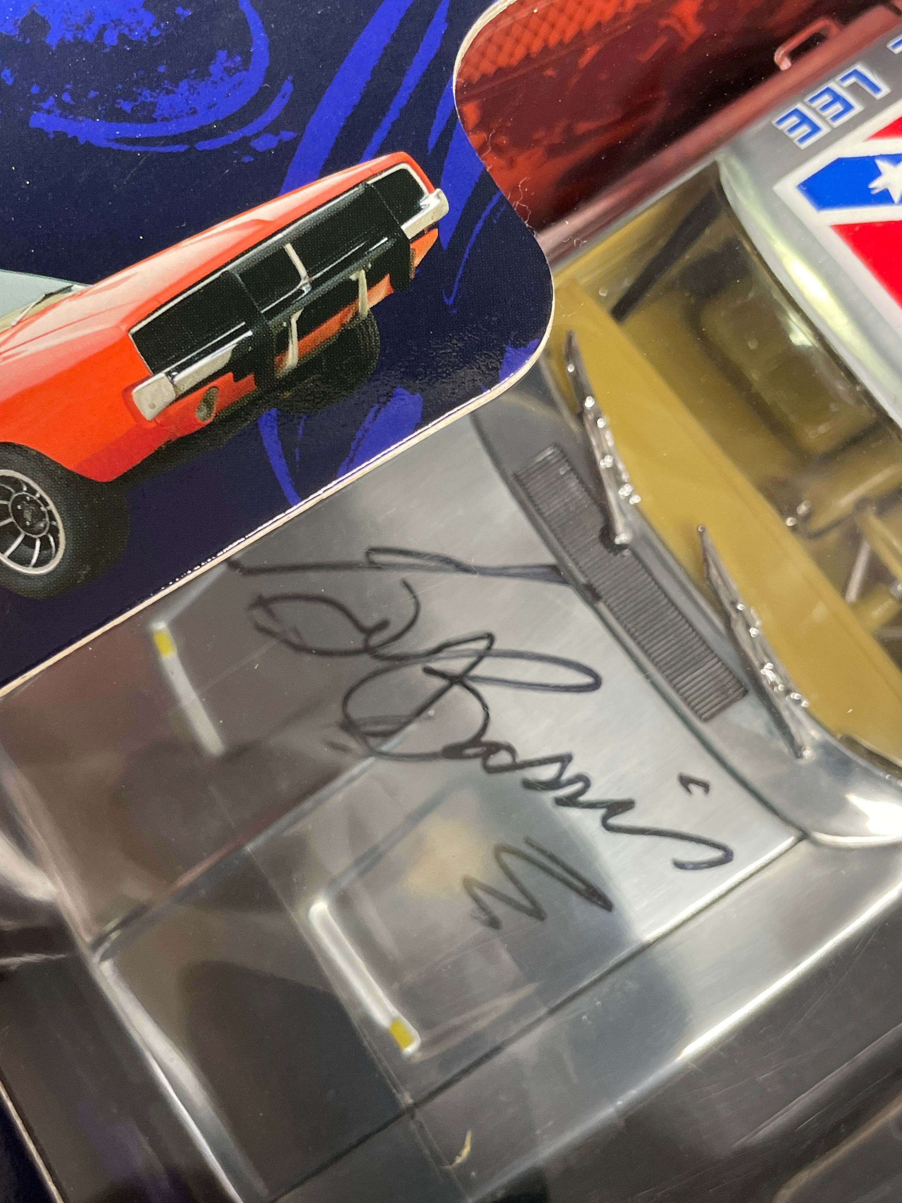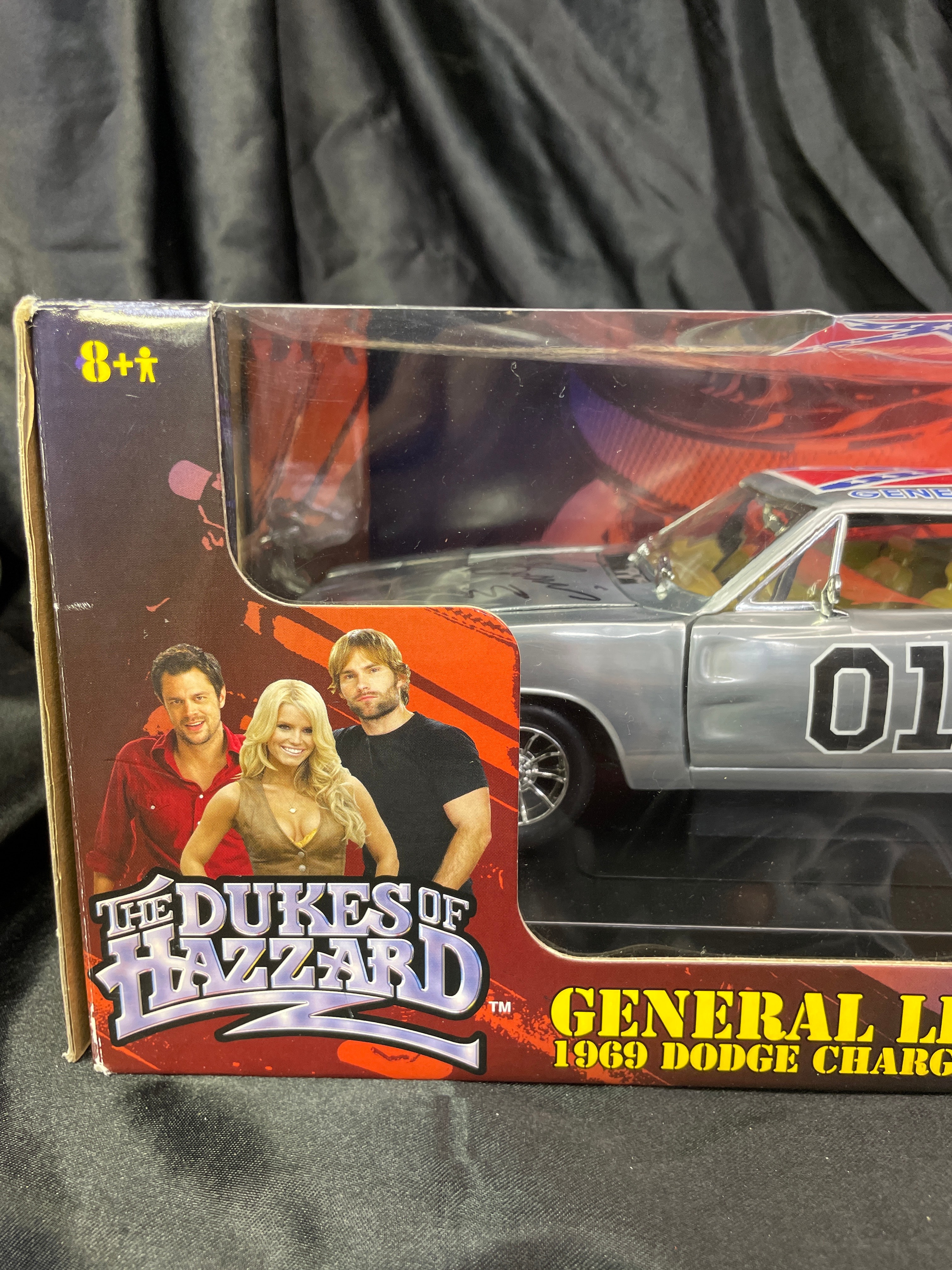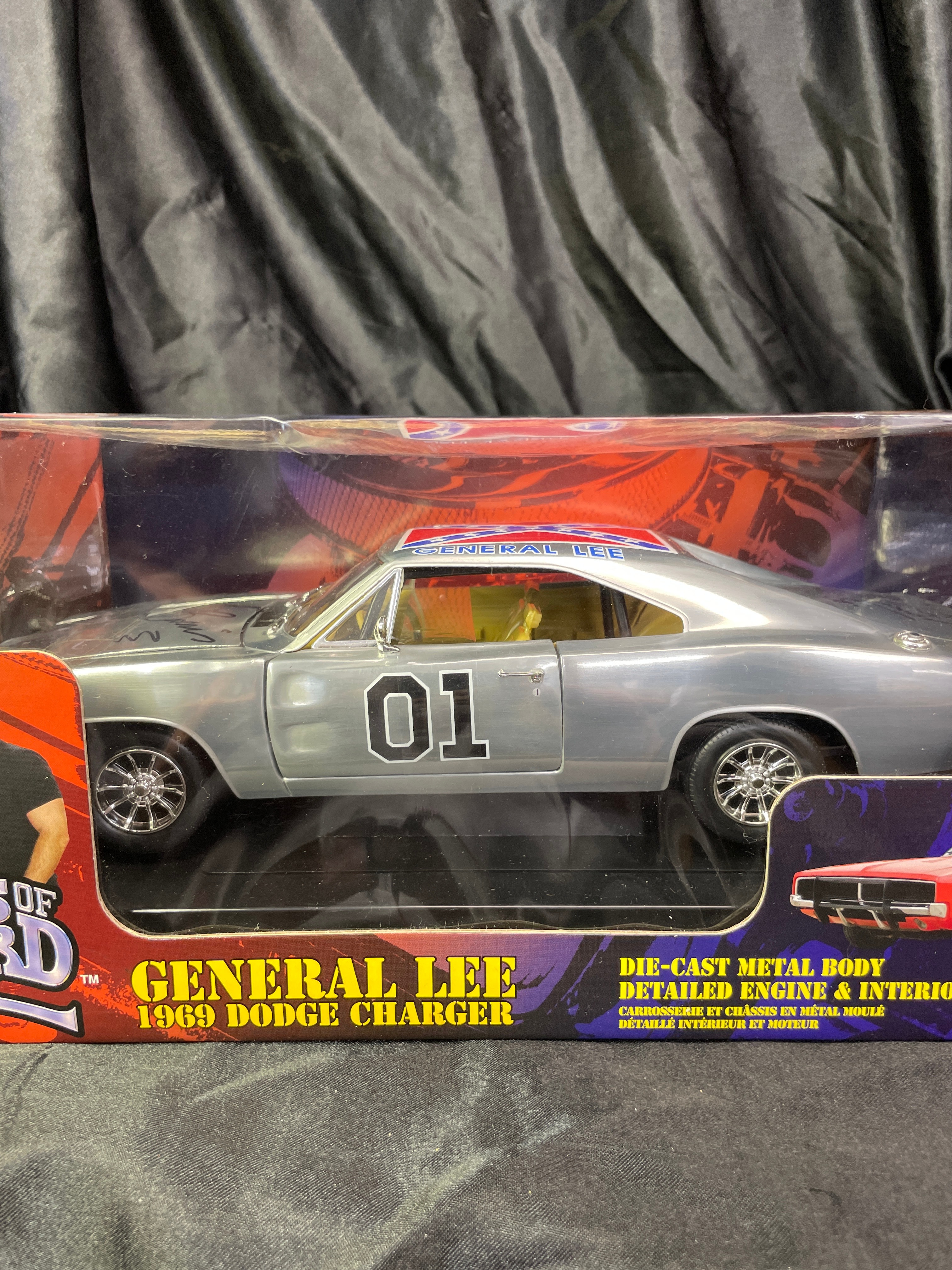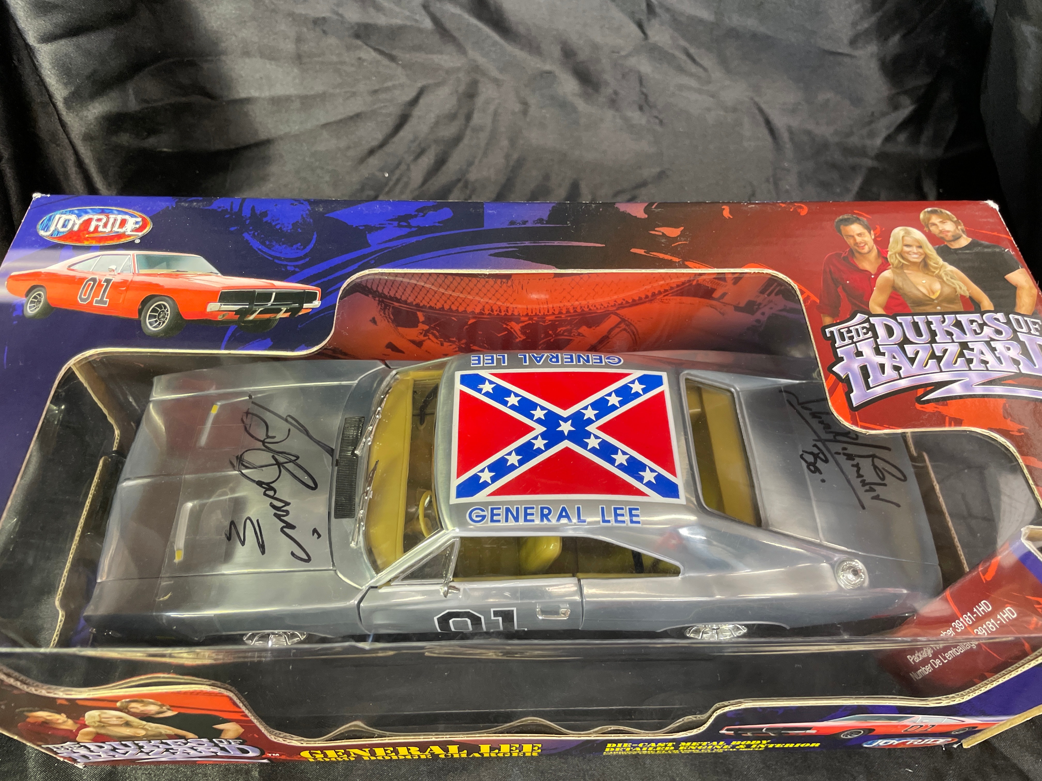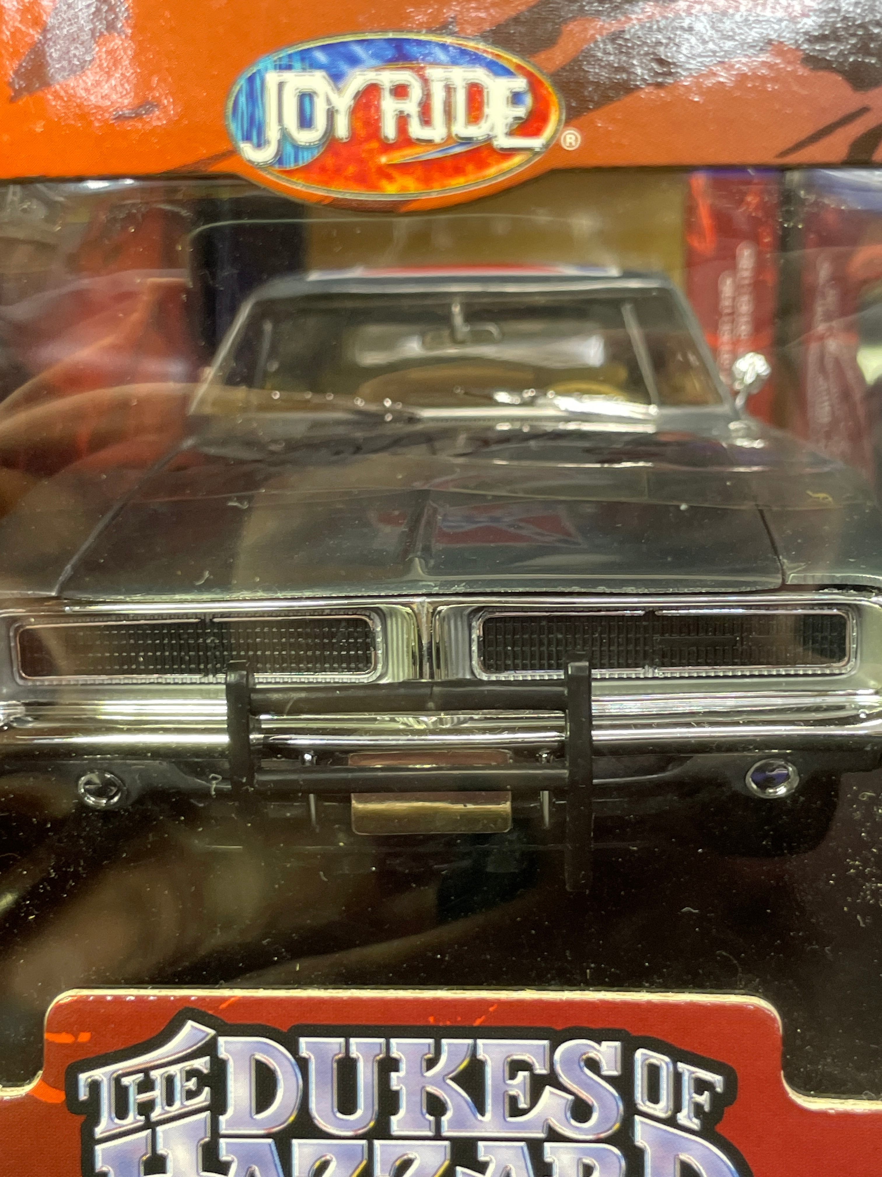 A Joy Ride / Ertl ‘The Dukes of Hazzard General Lee 1969 Dodge Charger 1:18 Diecast Chrom’ model car. This 1:18 scale die-cast model features a silver/chrome body with a yellow interior. The number ’01’ is displayed on the doors, and the roof bears a Confederate battle flag with ‘GENERAL LEE’ text. The model is presented in its original window-display cardboard box, which features graphics of the movie’s cast (Seann William Scott, Jessica Simpson, Johnny Knoxville). The packaging explicitly identifies the item as ‘THE DUKES OF HAZZARD GENERAL LEE 1969 DODGE CHARGER’ by ‘JOY RIDE,’ noting its ‘DIE-CAST METAL BODY DETAILED ENGINE & INTERIOR.’ Text on the box also indicates ‘ÉCHELLE 1:18 SCALE’ and ‘Made in China / Fabriqué en Chine,’ along with ‘©2006 RC2 BRANDS, Inc.’ The clear plastic window of the packaging is visibly autographed with ‘Yee Haw! John Schneider Bo.’ and ‘Tom Wopat.’