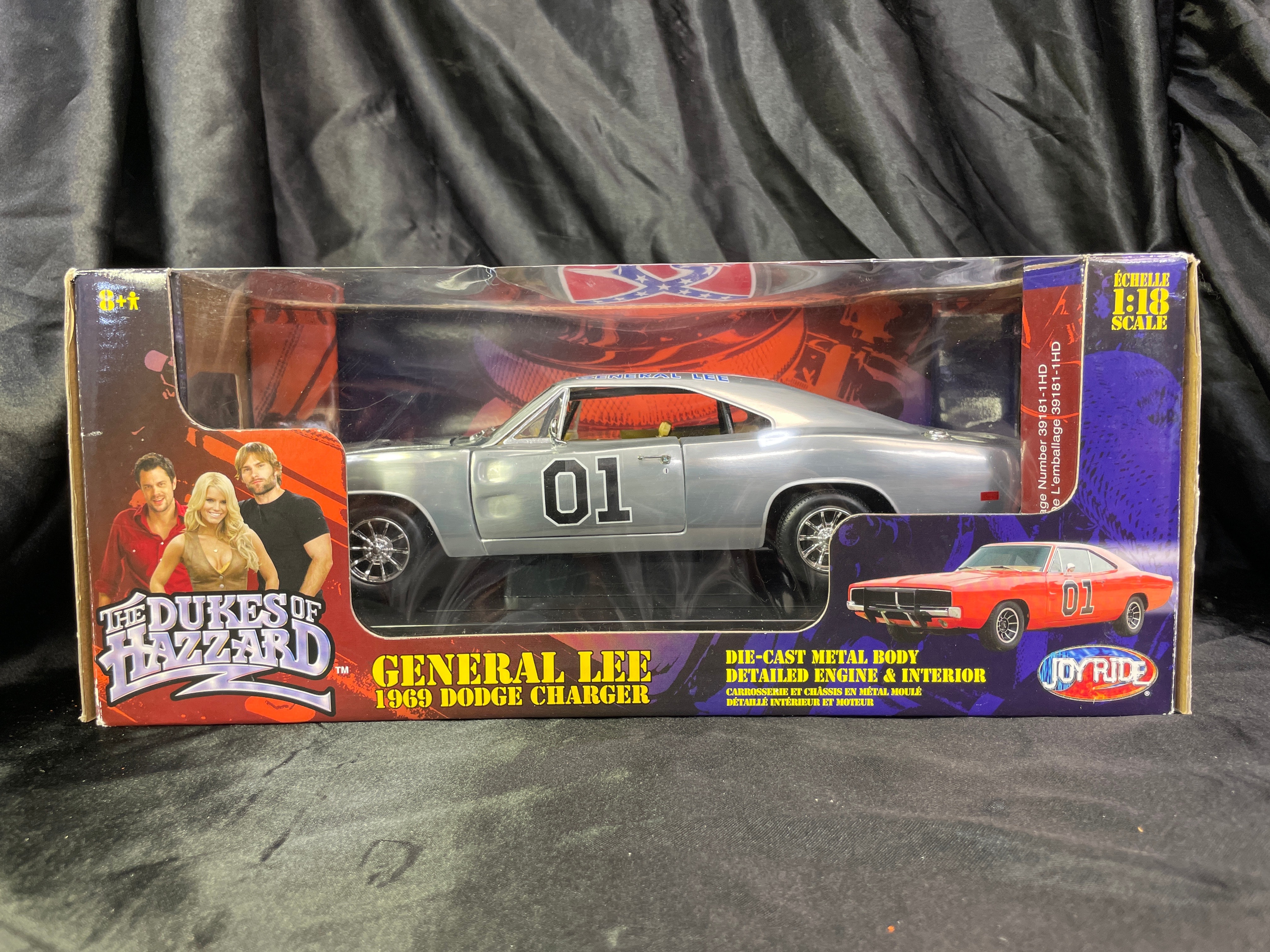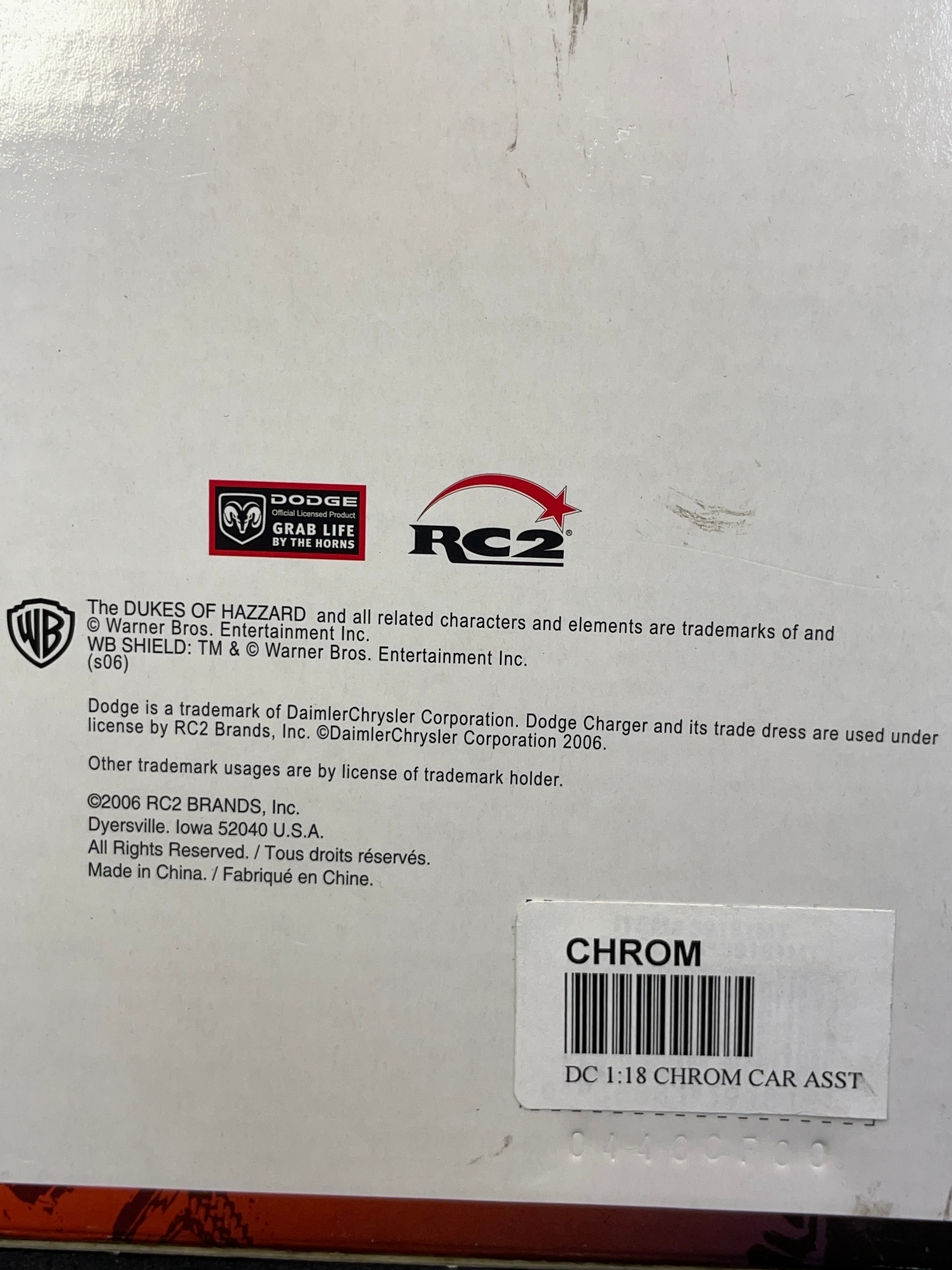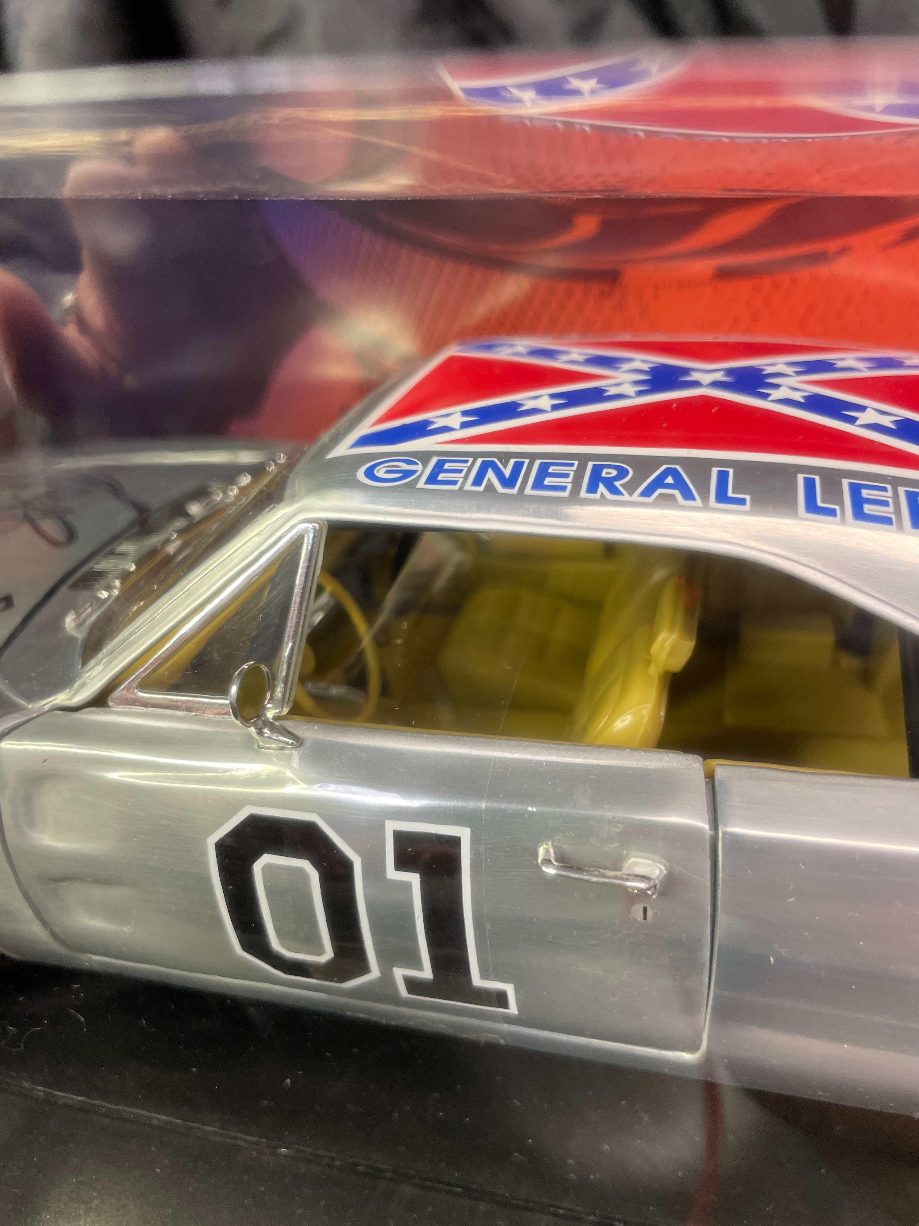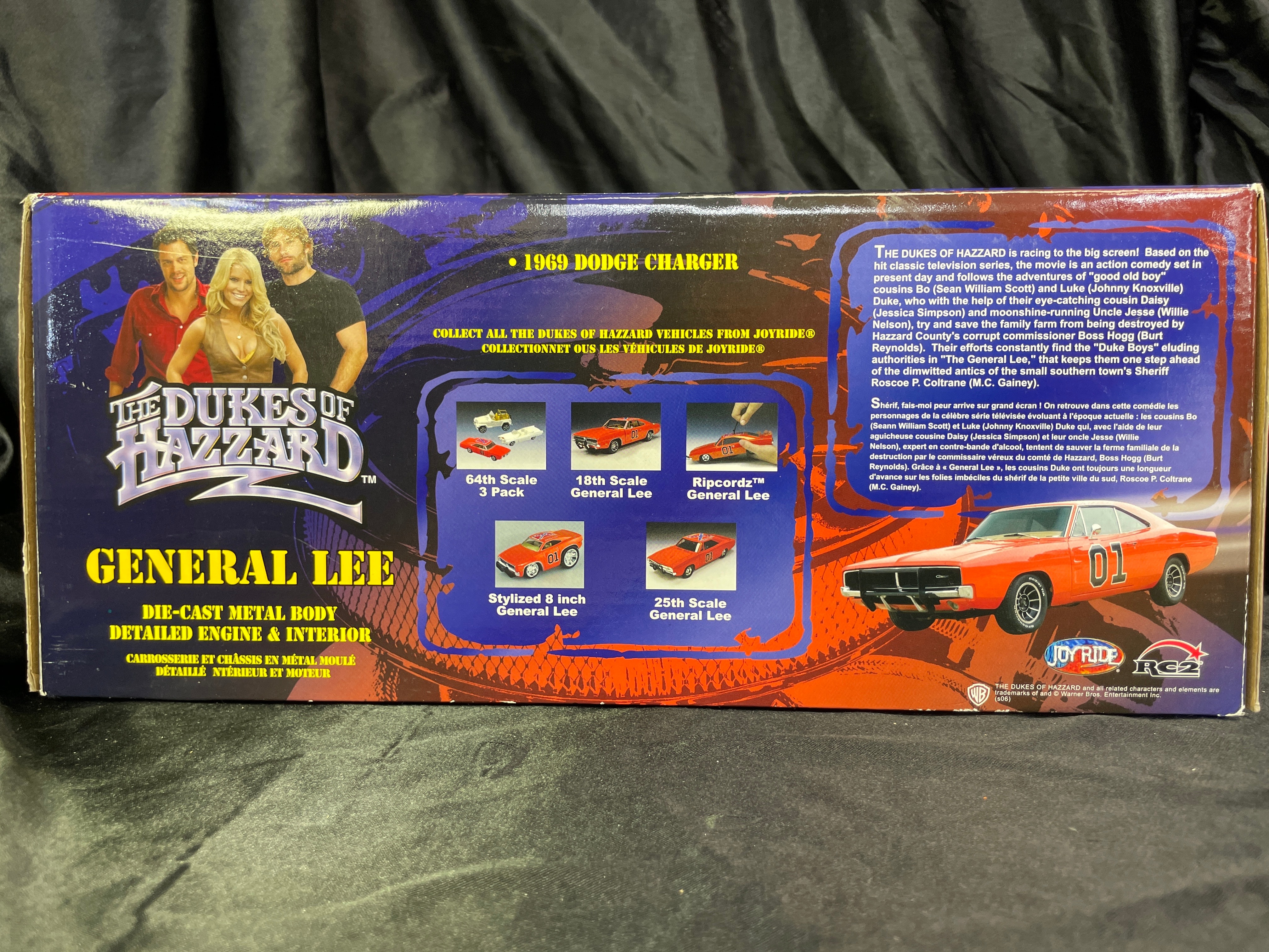 A Joy Ride / Ertl ‘The Dukes of Hazzard General Lee 1969 Dodge Charger 1:18 Diecast Chrom’ model car. This 1:18 scale die-cast model features a silver/chrome body with a yellow interior. The number ’01’ is displayed on the doors, and the roof bears a Confederate battle flag with ‘GENERAL LEE’ text. The model is presented in its original window-display cardboard box, which features graphics of the movie’s cast (Seann William Scott, Jessica Simpson, Johnny Knoxville). The packaging explicitly identifies the item as ‘THE DUKES OF HAZZARD GENERAL LEE 1969 DODGE CHARGER’ by ‘JOY RIDE,’ noting its ‘DIE-CAST METAL BODY DETAILED ENGINE & INTERIOR.’ Text on the box also indicates ‘ÉCHELLE 1:18 SCALE’ and ‘Made in China / Fabriqué en Chine,’ along with ‘©2006 RC2 BRANDS, Inc.’ The clear plastic window of the packaging is visibly autographed with ‘Yee Haw! John Schneider Bo.’ and ‘Tom Wopat.’