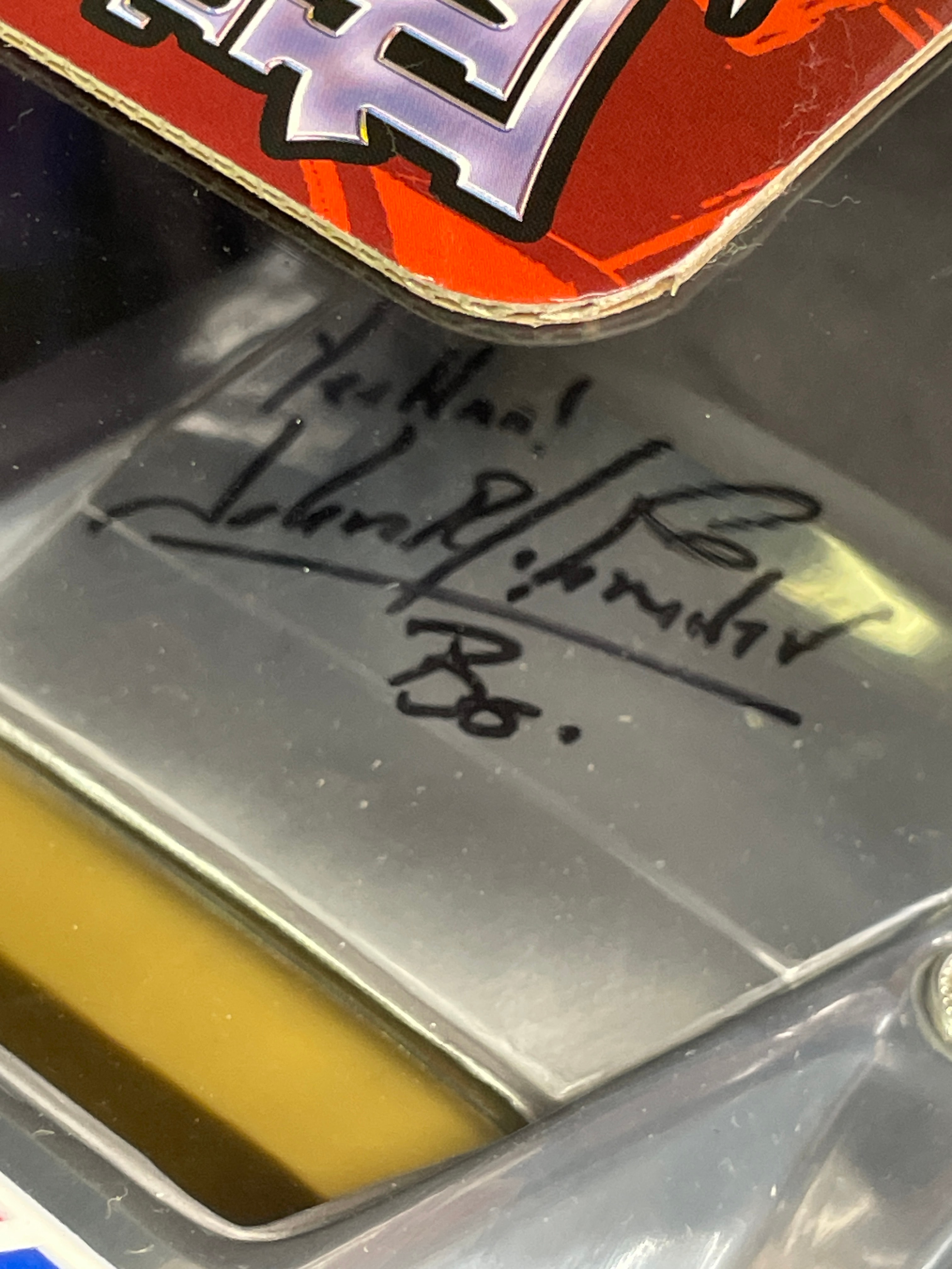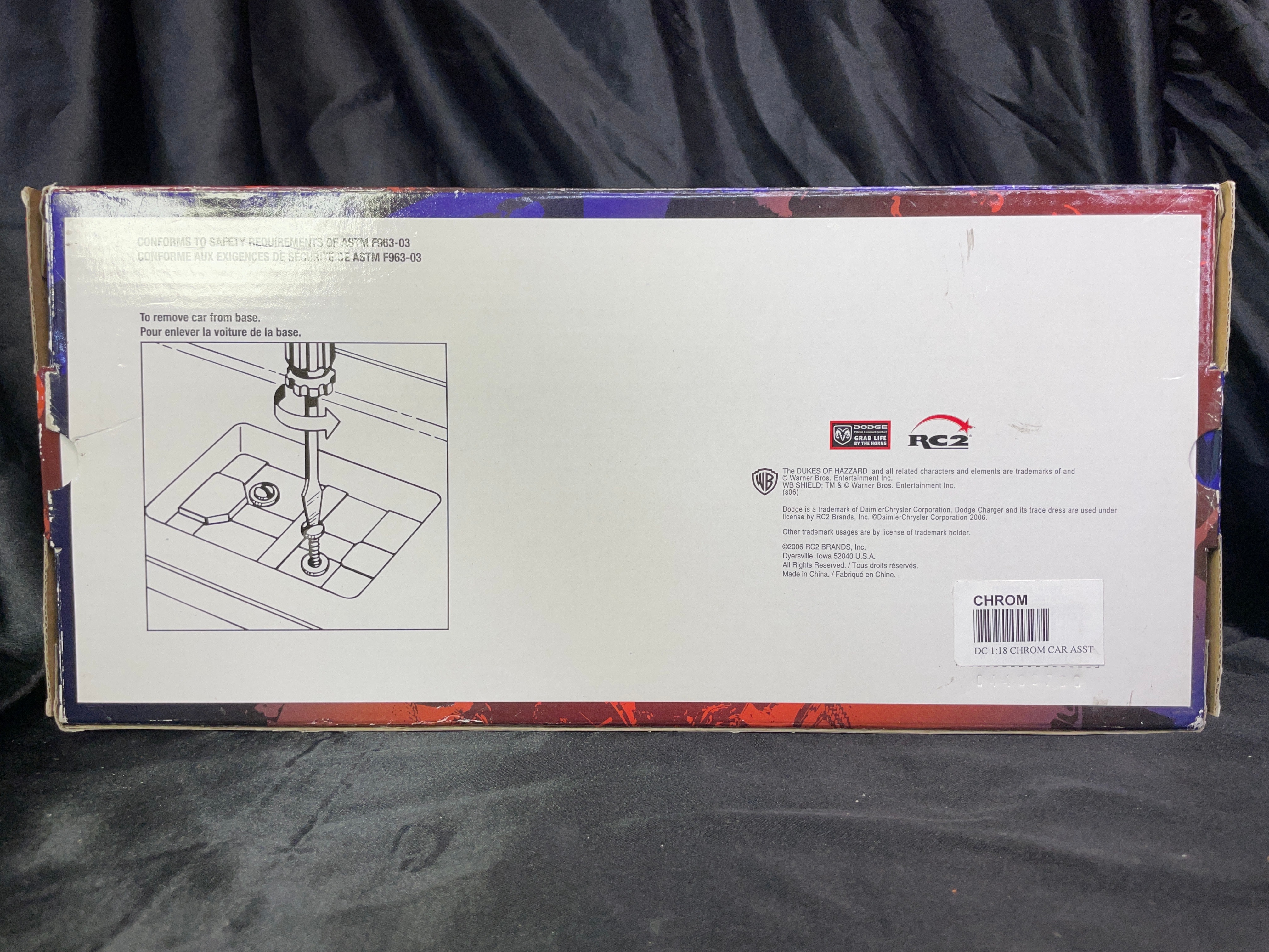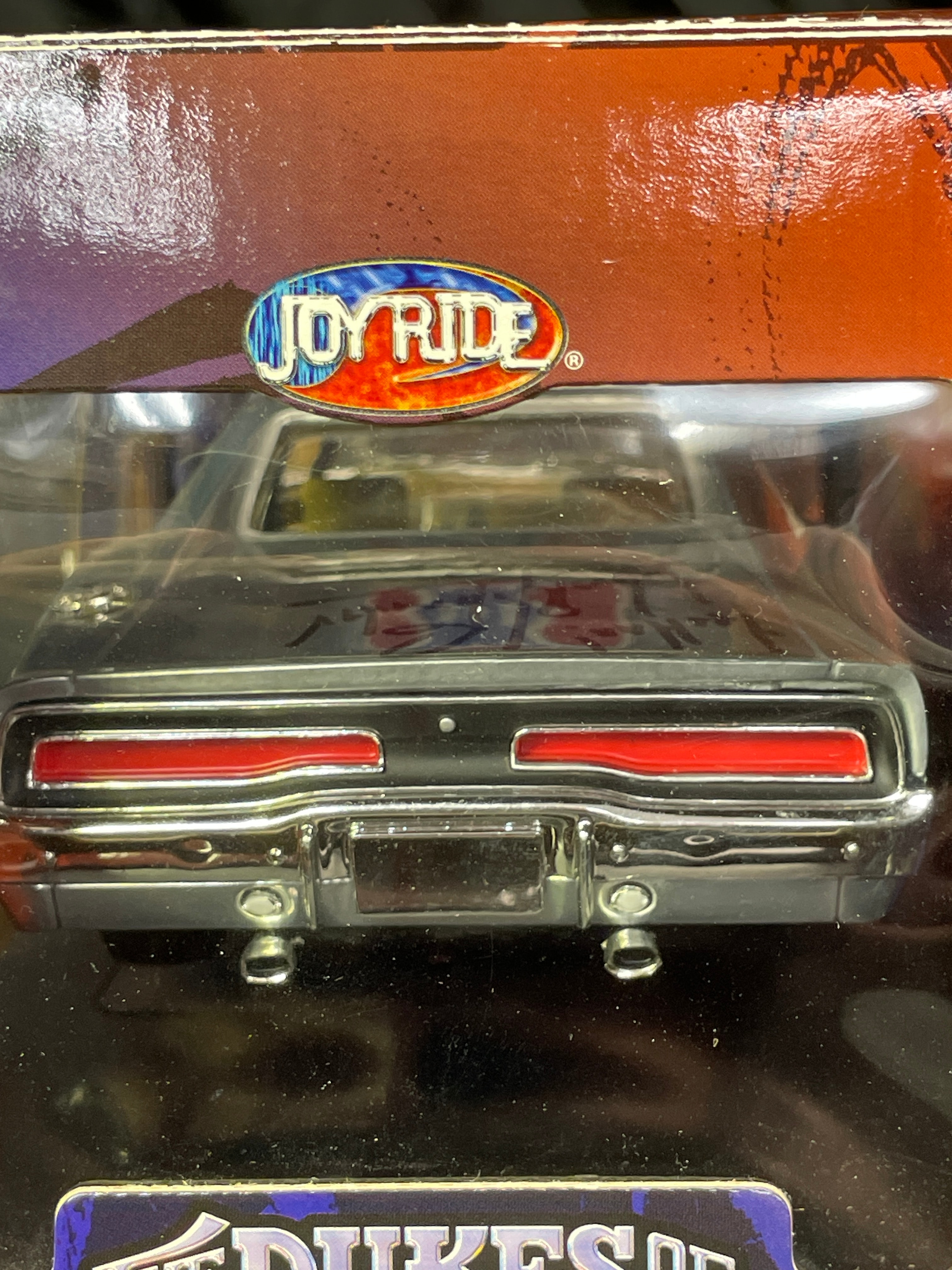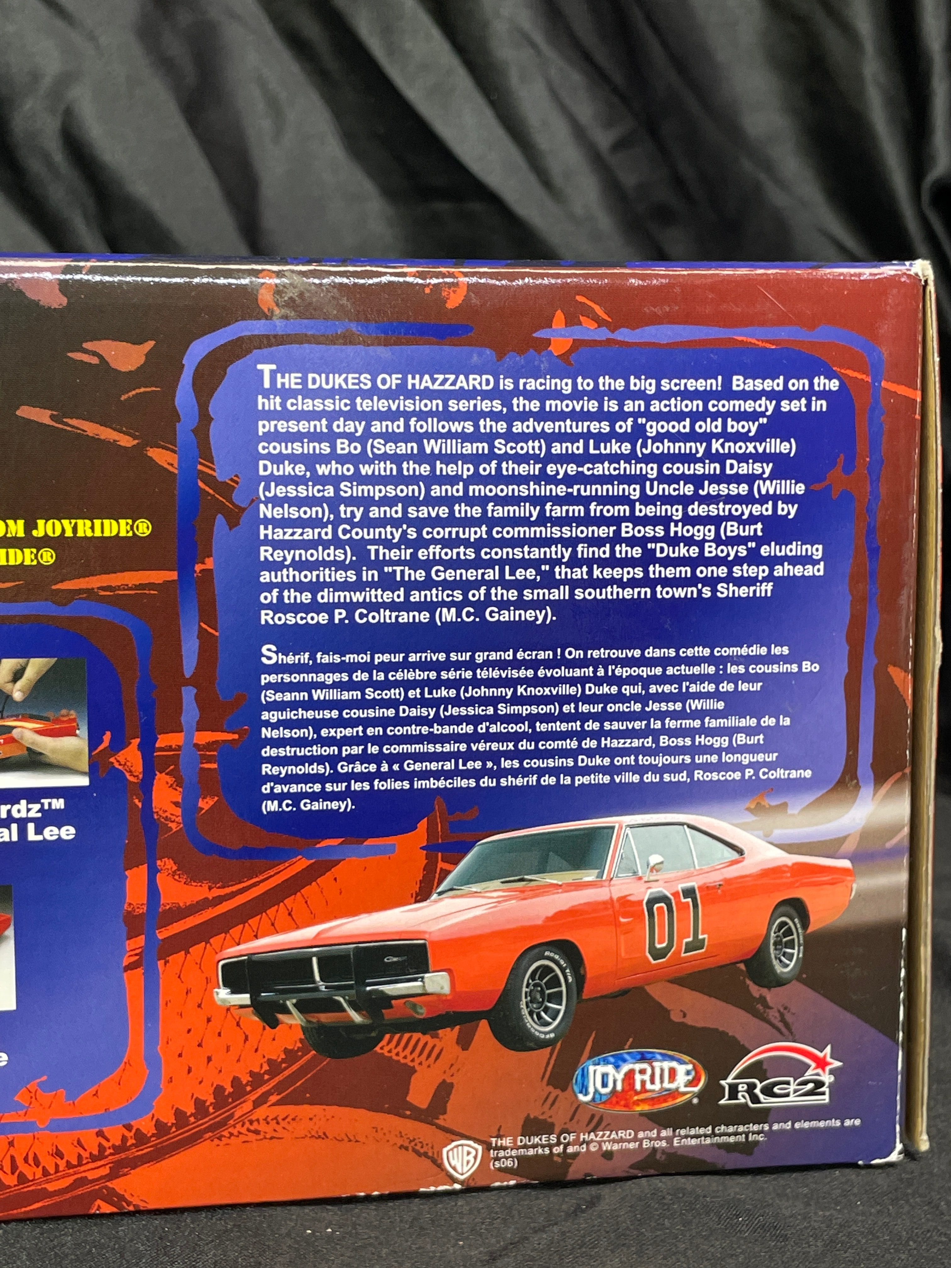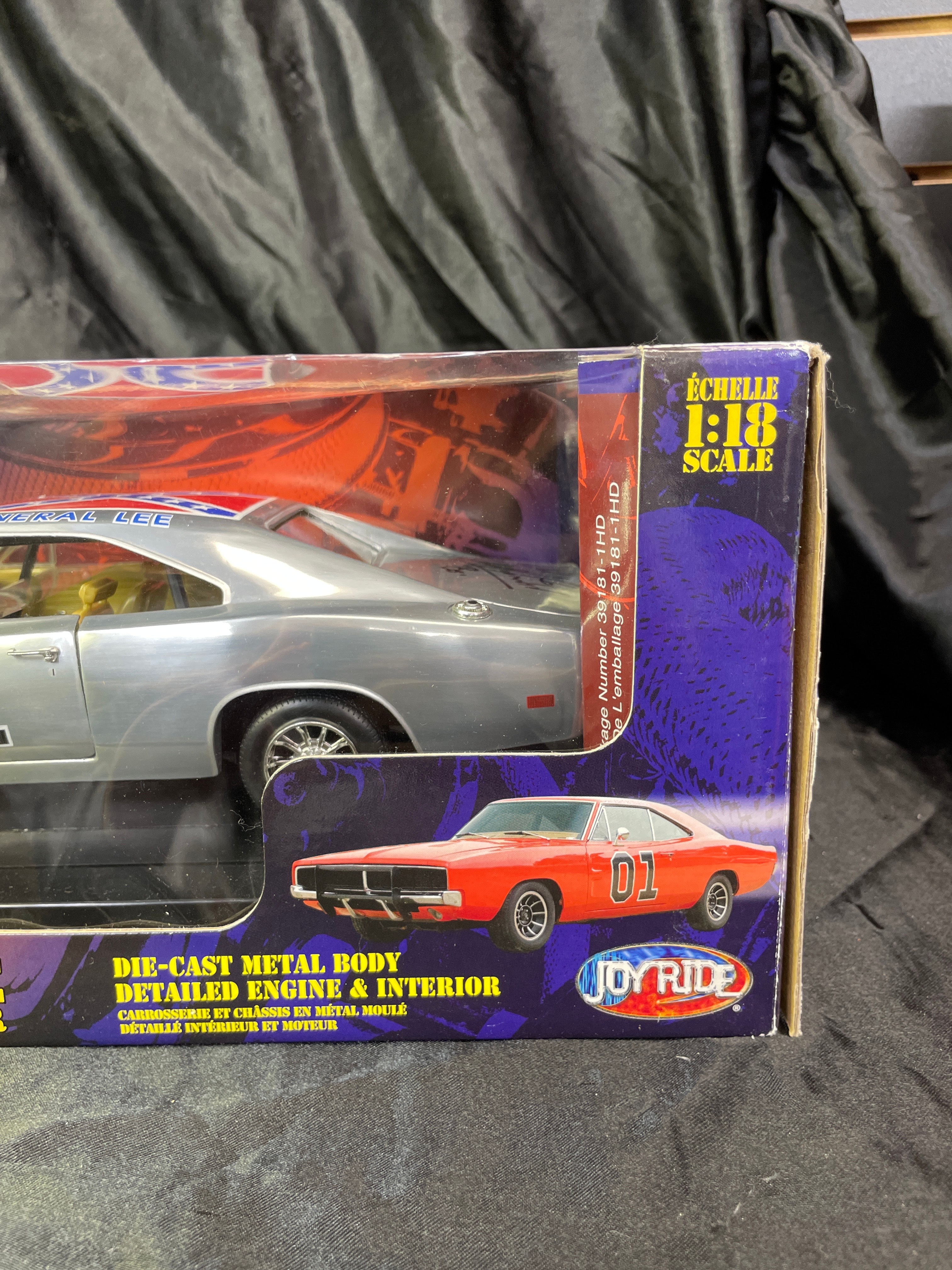 A Joy Ride / Ertl ‘The Dukes of Hazzard General Lee 1969 Dodge Charger 1:18 Diecast Chrom’ model car. This 1:18 scale die-cast model features a silver/chrome body with a yellow interior. The number ’01’ is displayed on the doors, and the roof bears a Confederate battle flag with ‘GENERAL LEE’ text. The model is presented in its original window-display cardboard box, which features graphics of the movie’s cast (Seann William Scott, Jessica Simpson, Johnny Knoxville). The packaging explicitly identifies the item as ‘THE DUKES OF HAZZARD GENERAL LEE 1969 DODGE CHARGER’ by ‘JOY RIDE,’ noting its ‘DIE-CAST METAL BODY DETAILED ENGINE & INTERIOR.’ Text on the box also indicates ‘ÉCHELLE 1:18 SCALE’ and ‘Made in China / Fabriqué en Chine,’ along with ‘©2006 RC2 BRANDS, Inc.’ The clear plastic window of the packaging is visibly autographed with ‘Yee Haw! John Schneider Bo.’ and ‘Tom Wopat.’
