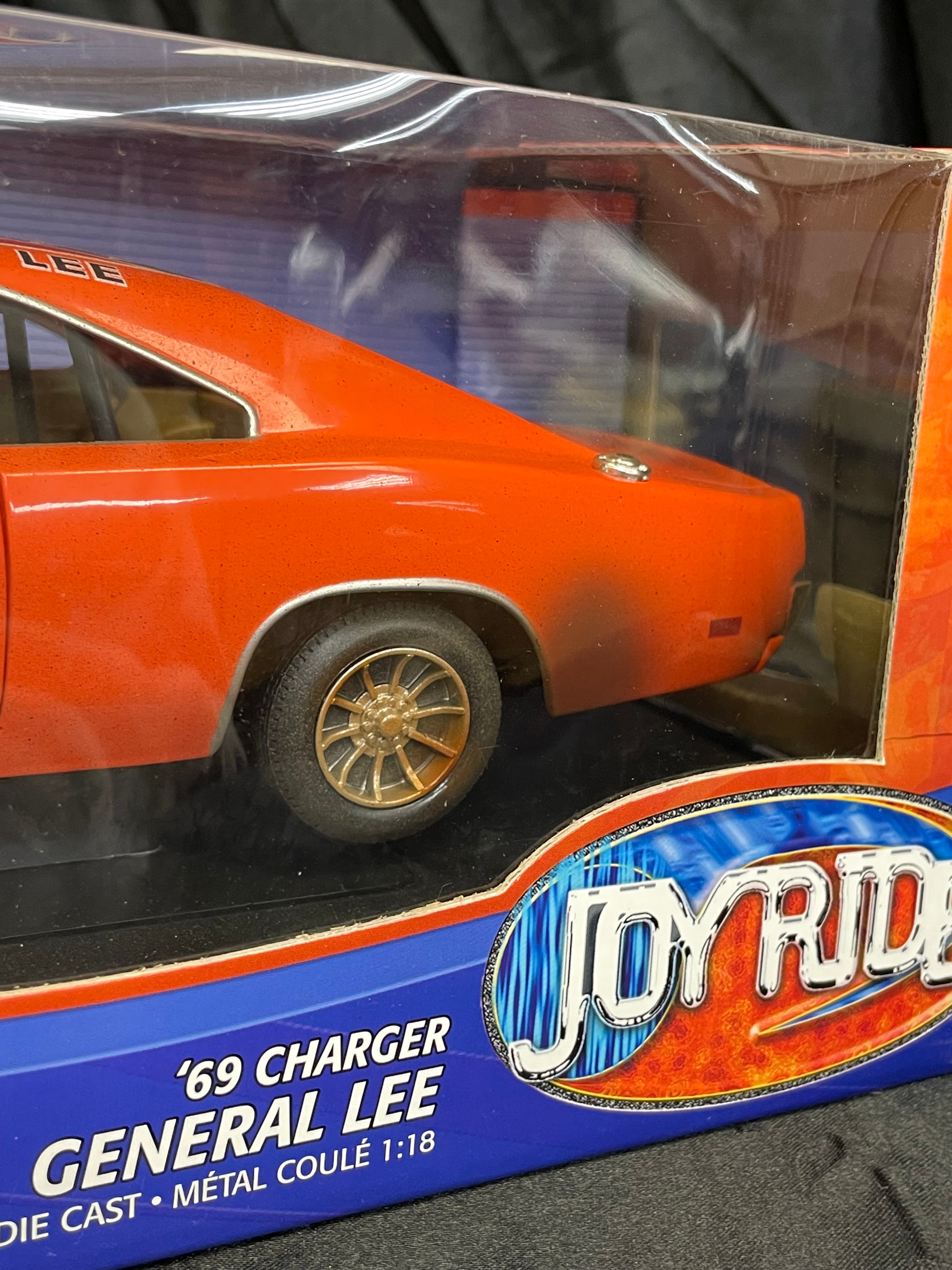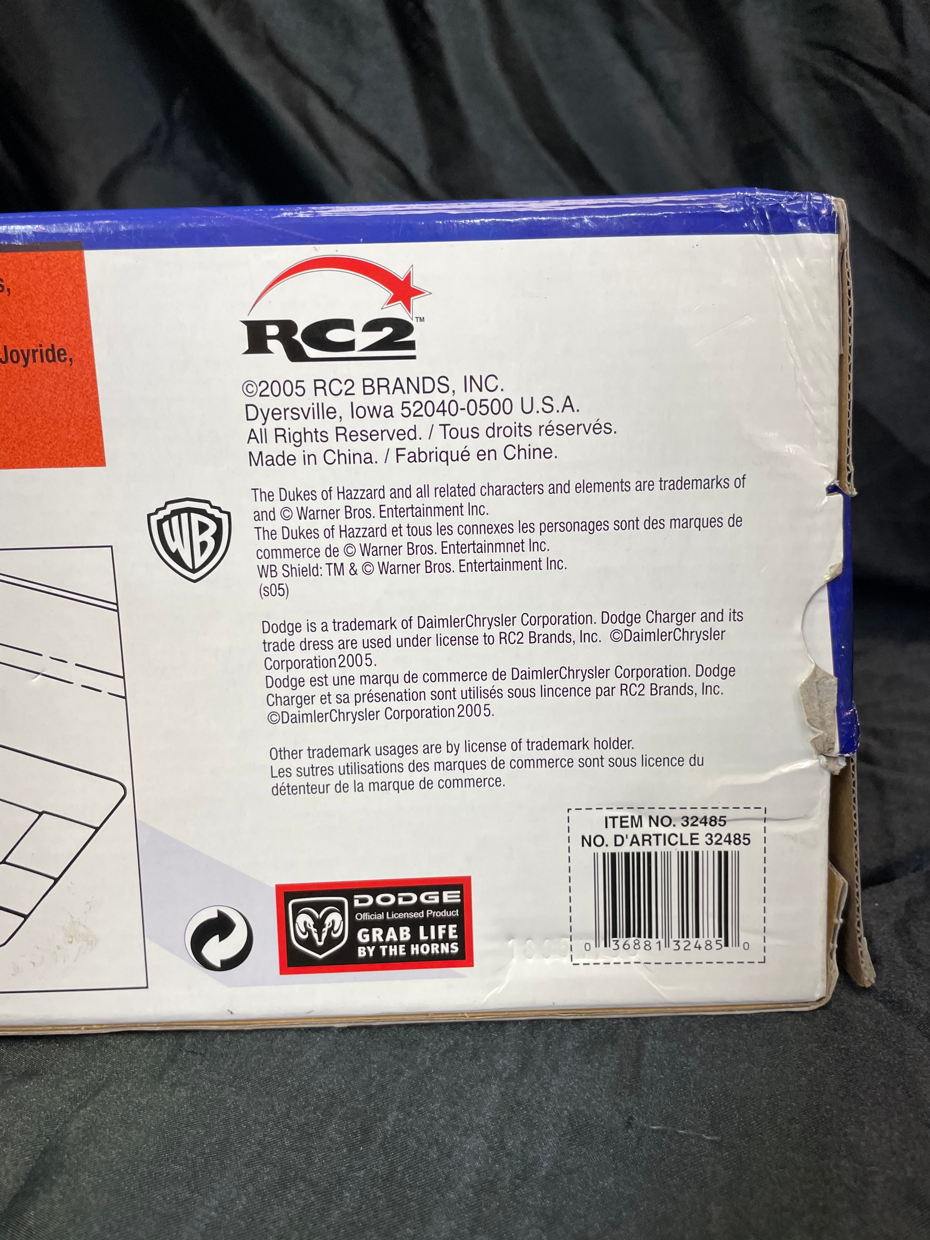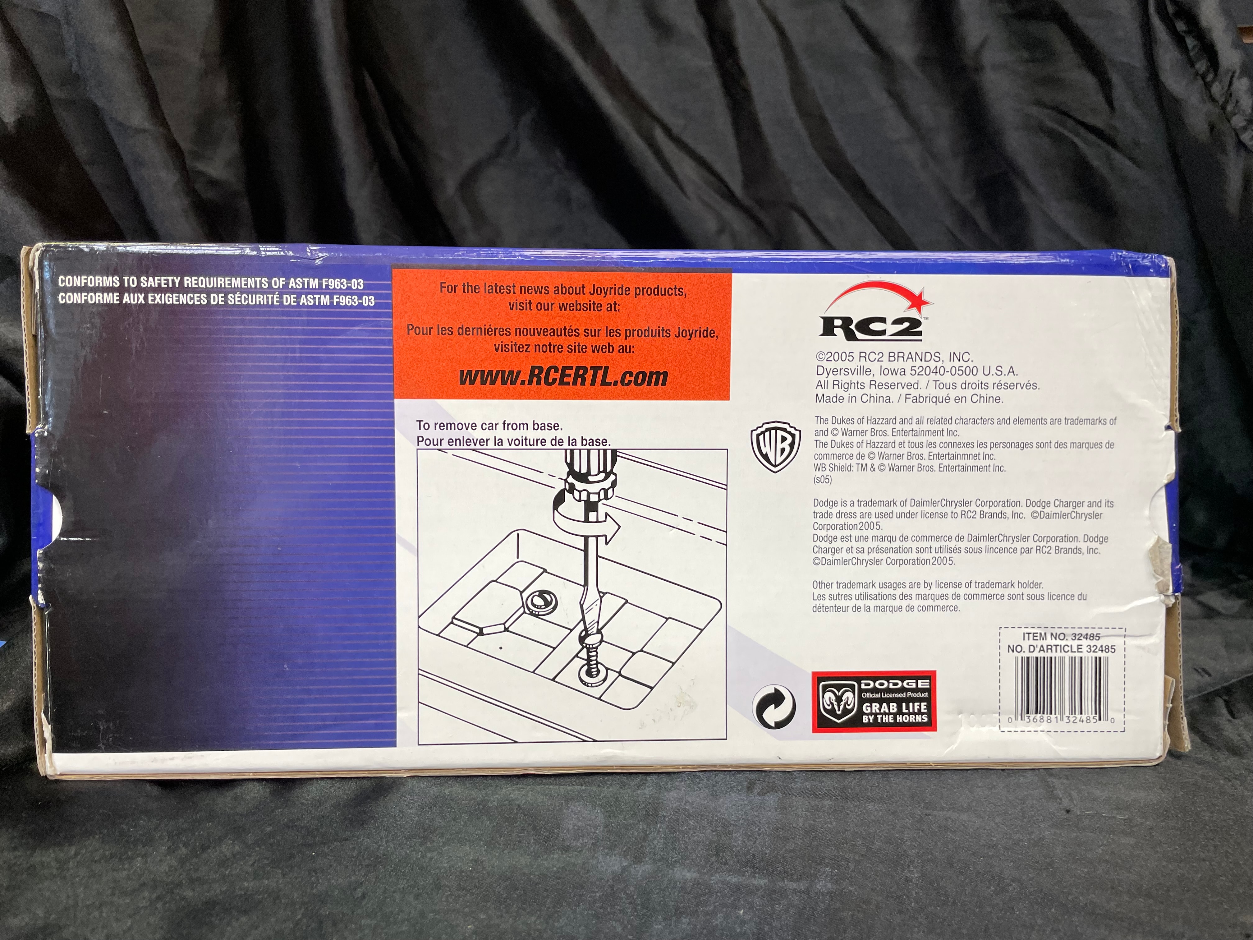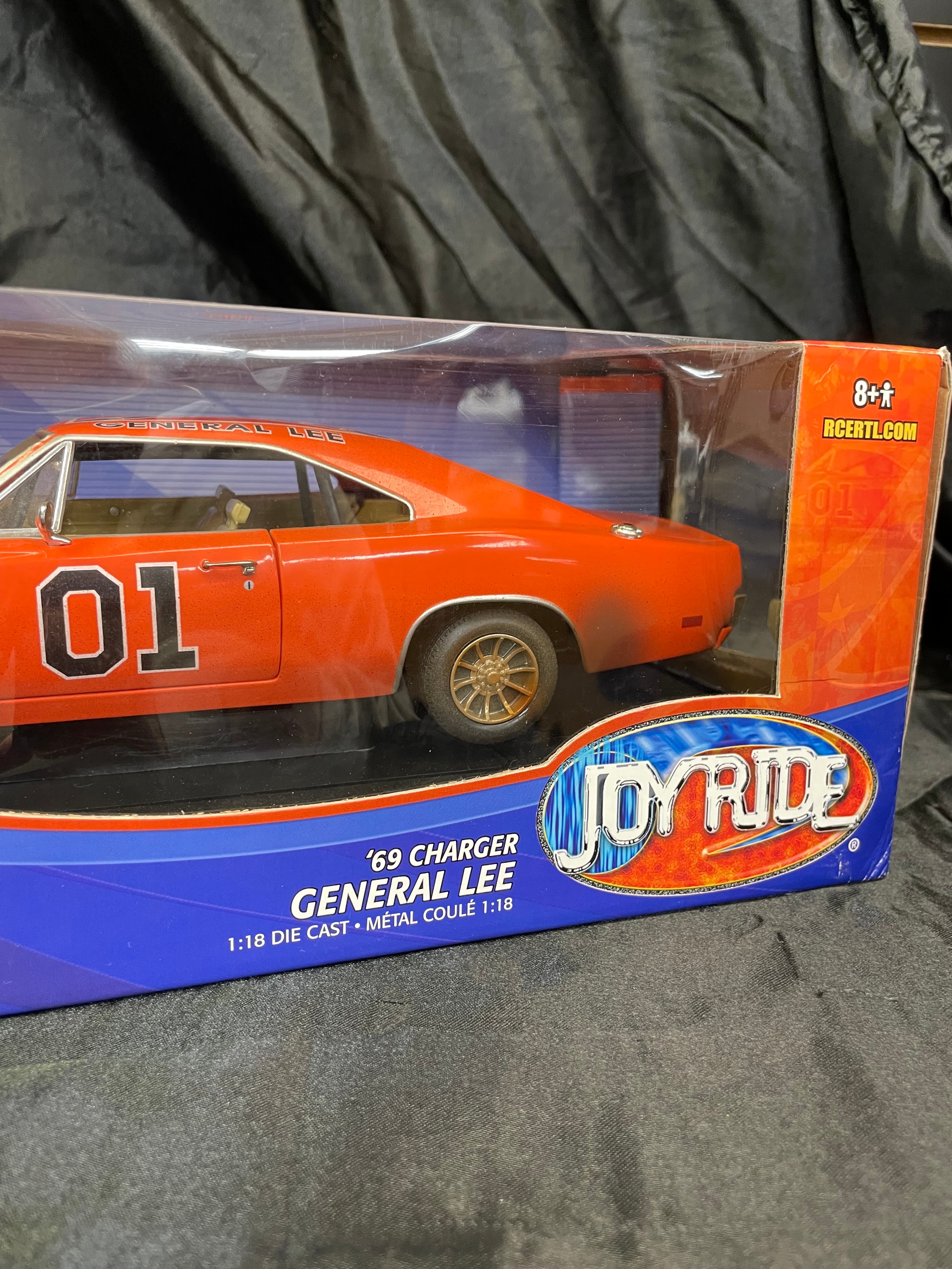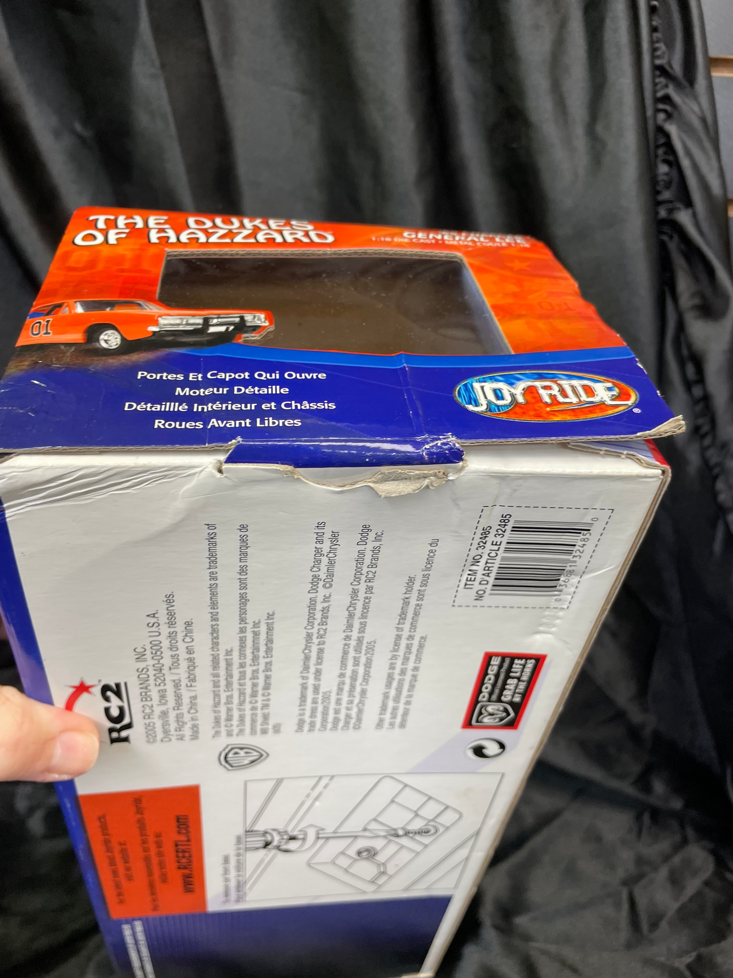 A 1:18 scale die-cast model of the “General Lee” ’69 Charger from “The Dukes of Hazzard, ” produced by Joyride and RC2 Brands, Inc. in 2005, Item No. 32485. The orange model car features the number “01” on its doors and the Confederate battle flag on its roof, with “GENERAL LEE” text visible on the roof and sides. It is presented within a clear plastic window inside its original retail box, which is predominantly orange and blue. The packaging indicates features such as “Opening Doors & Hood, ” “Detailed Engine, ” “Detailed Interior & Chassis, ” and “Steerable Front Wheels.” The box also states “1:18 DIE CAST * MÉTAL COULE 1:18,” “Conforms to Safety Requirements of ASTM F963-03,” and an age rating of “8++.”