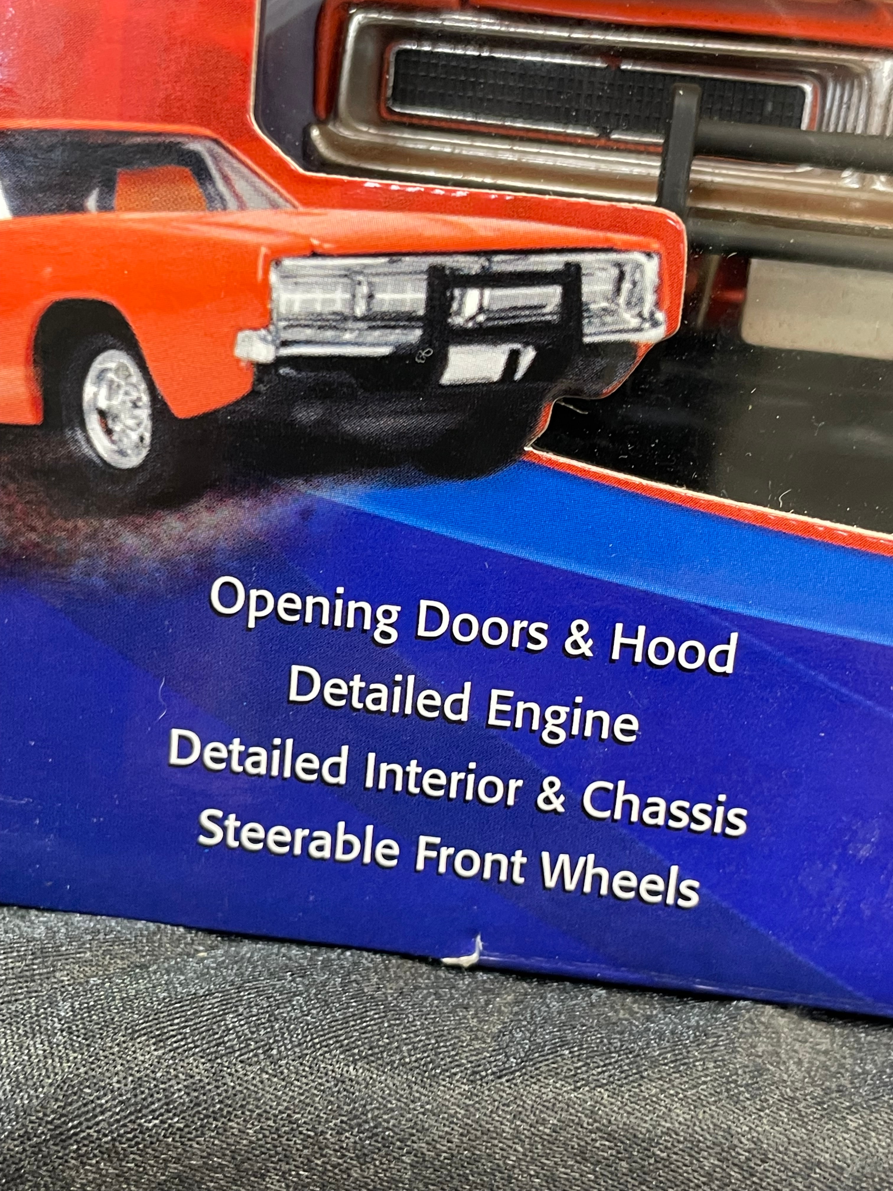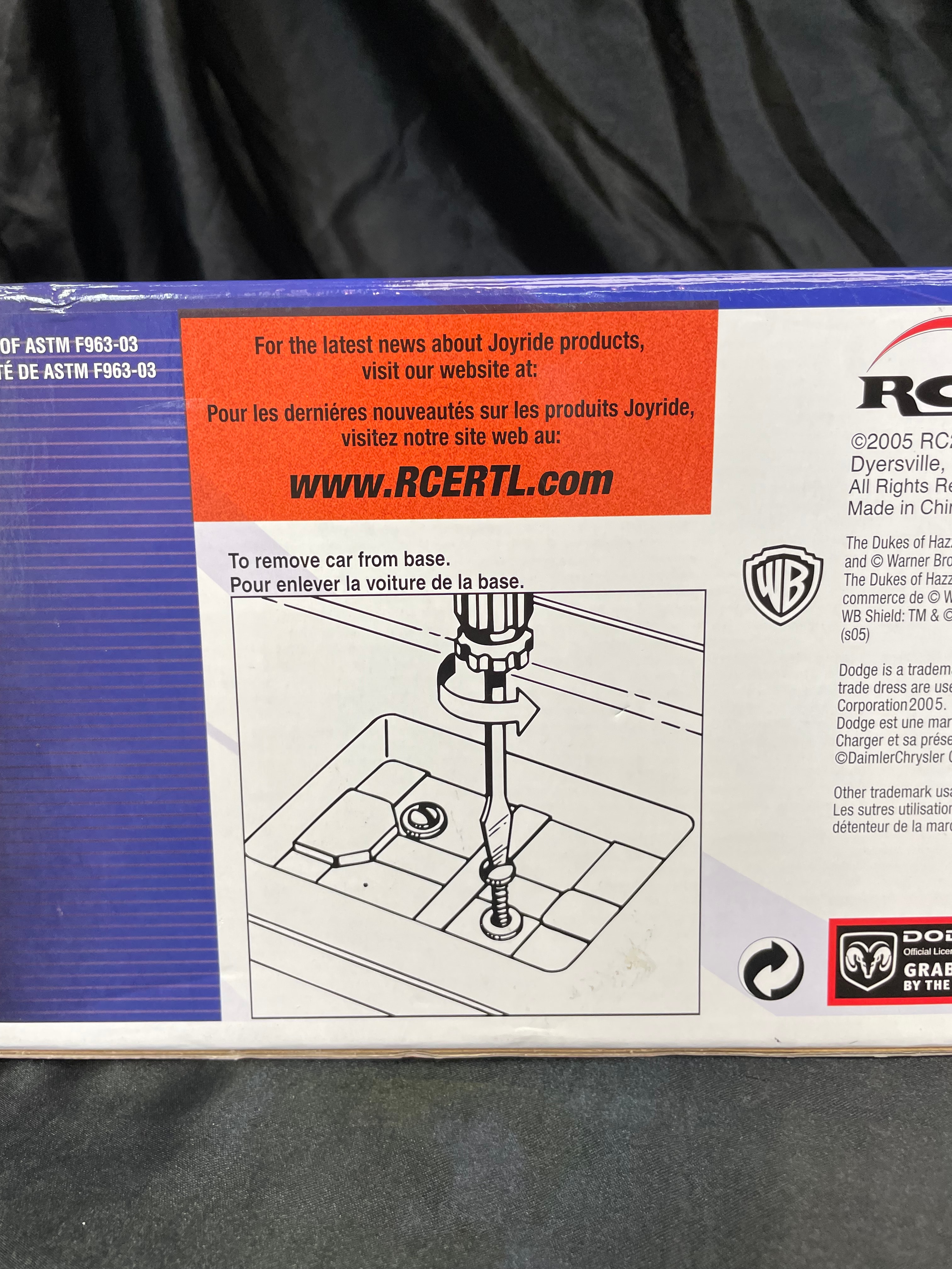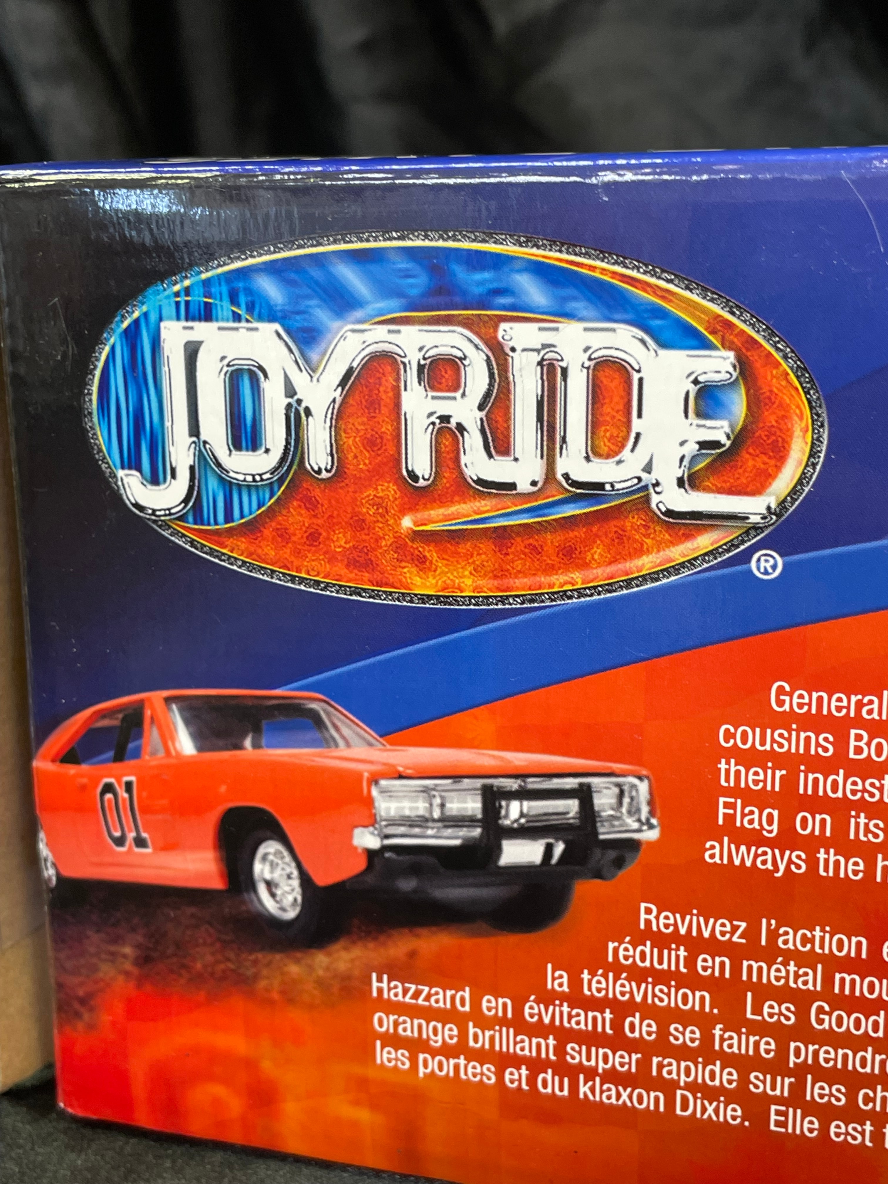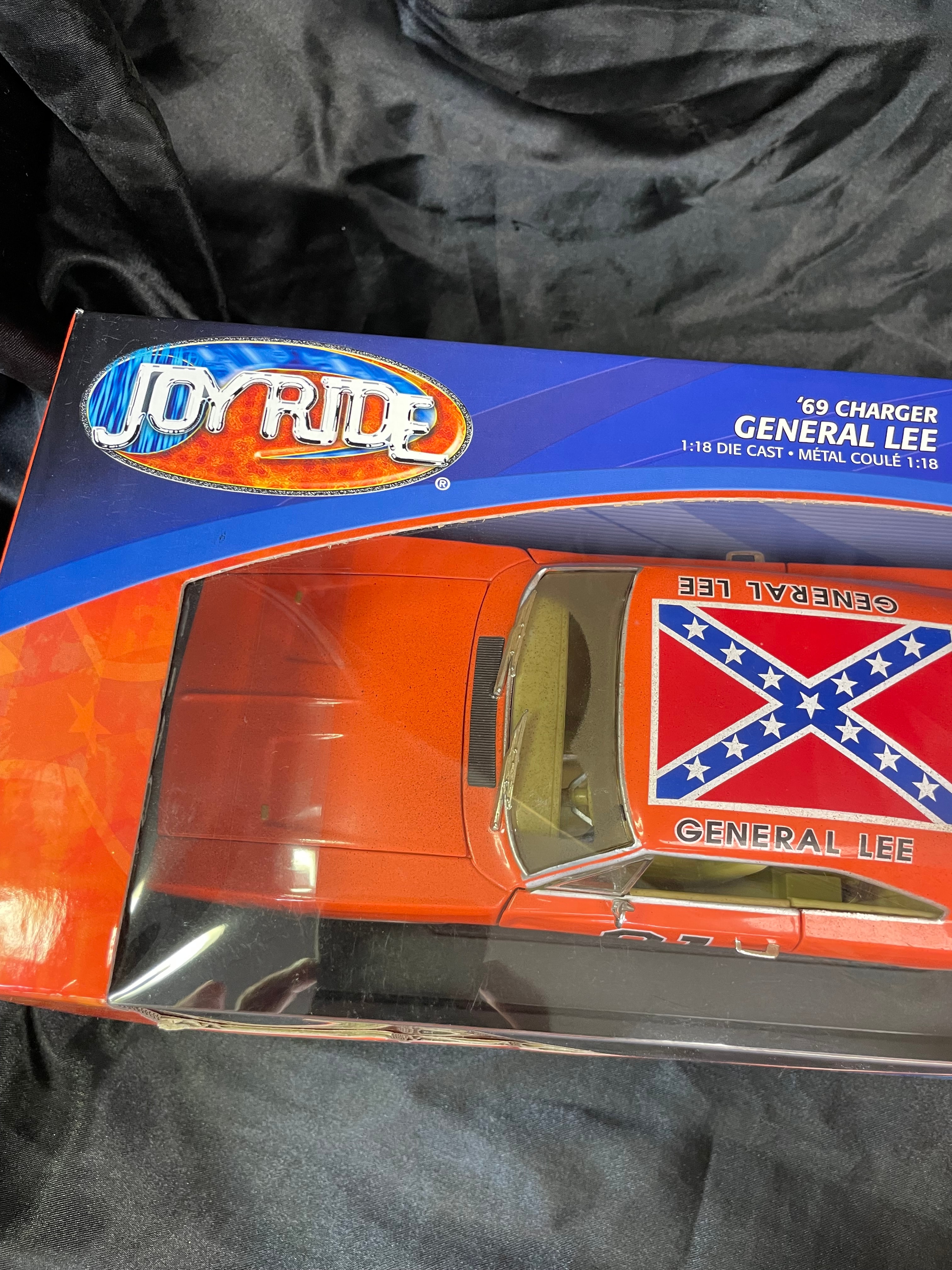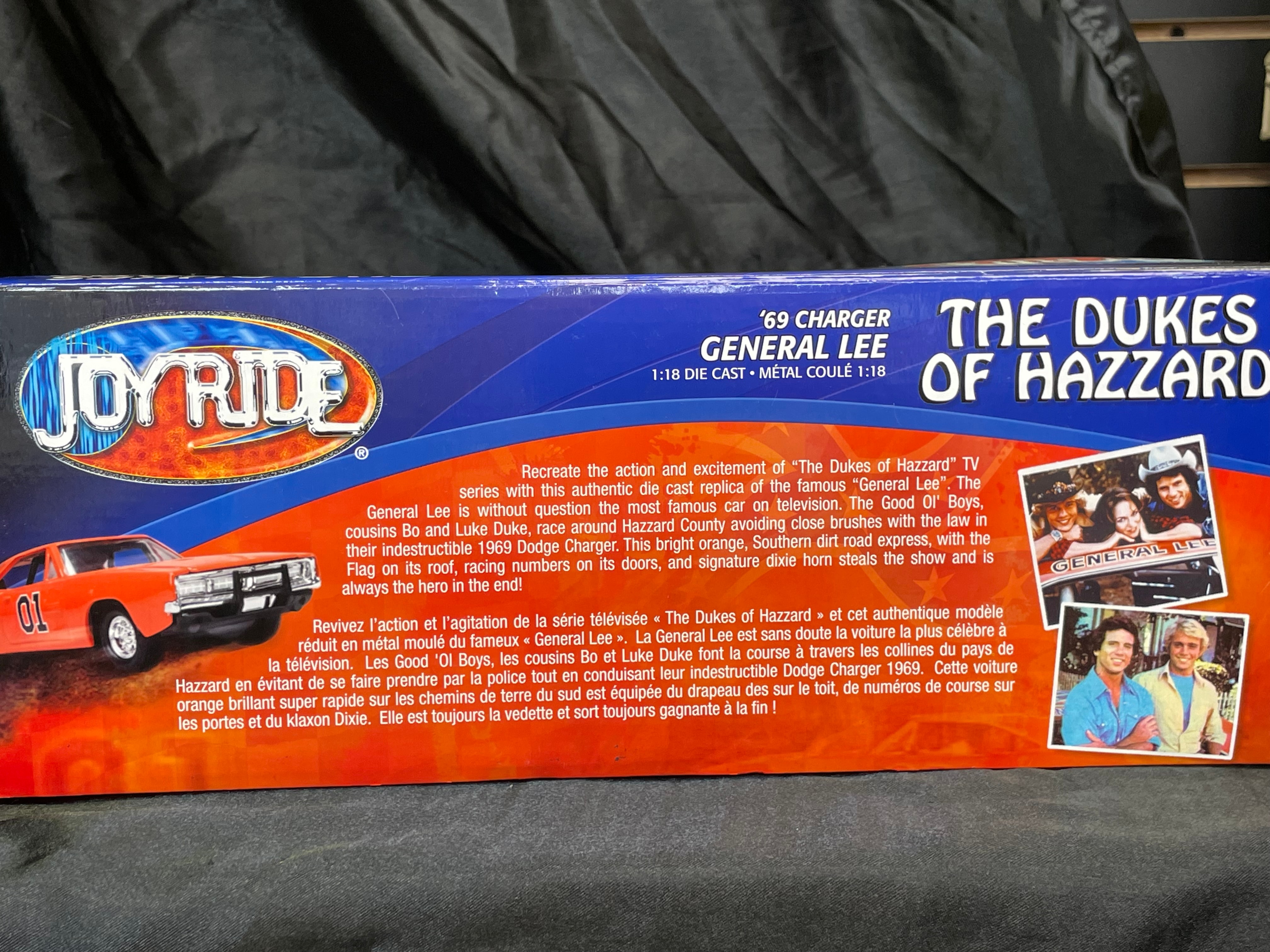 A 1:18 scale die-cast model of the “General Lee” ’69 Charger from “The Dukes of Hazzard, ” produced by Joyride and RC2 Brands, Inc. in 2005, Item No. 32485. The orange model car features the number “01” on its doors and the Confederate battle flag on its roof, with “GENERAL LEE” text visible on the roof and sides. It is presented within a clear plastic window inside its original retail box, which is predominantly orange and blue. The packaging indicates features such as “Opening Doors & Hood, ” “Detailed Engine, ” “Detailed Interior & Chassis, ” and “Steerable Front Wheels.” The box also states “1:18 DIE CAST * MÉTAL COULE 1:18,” “Conforms to Safety Requirements of ASTM F963-03,” and an age rating of “8++.”