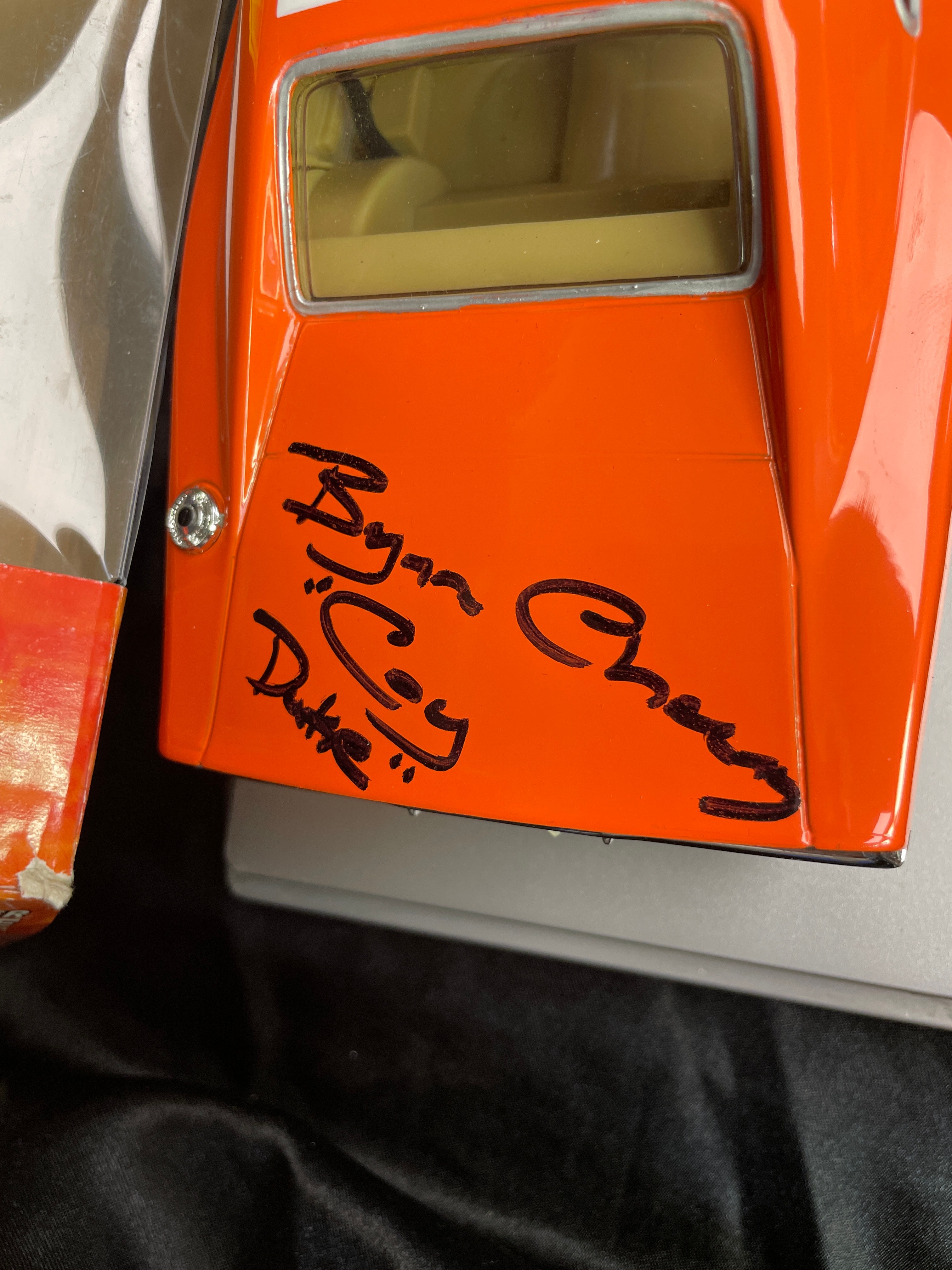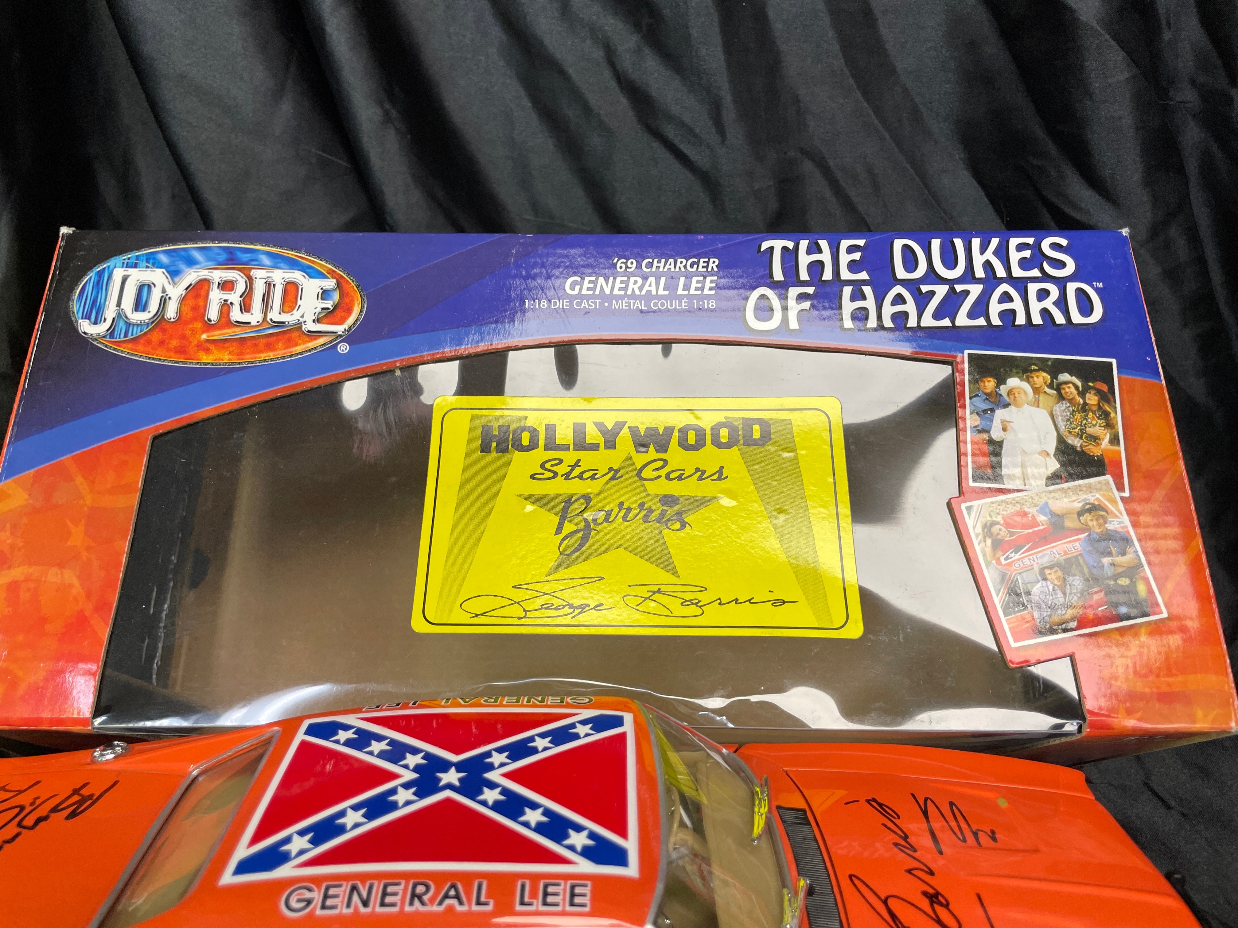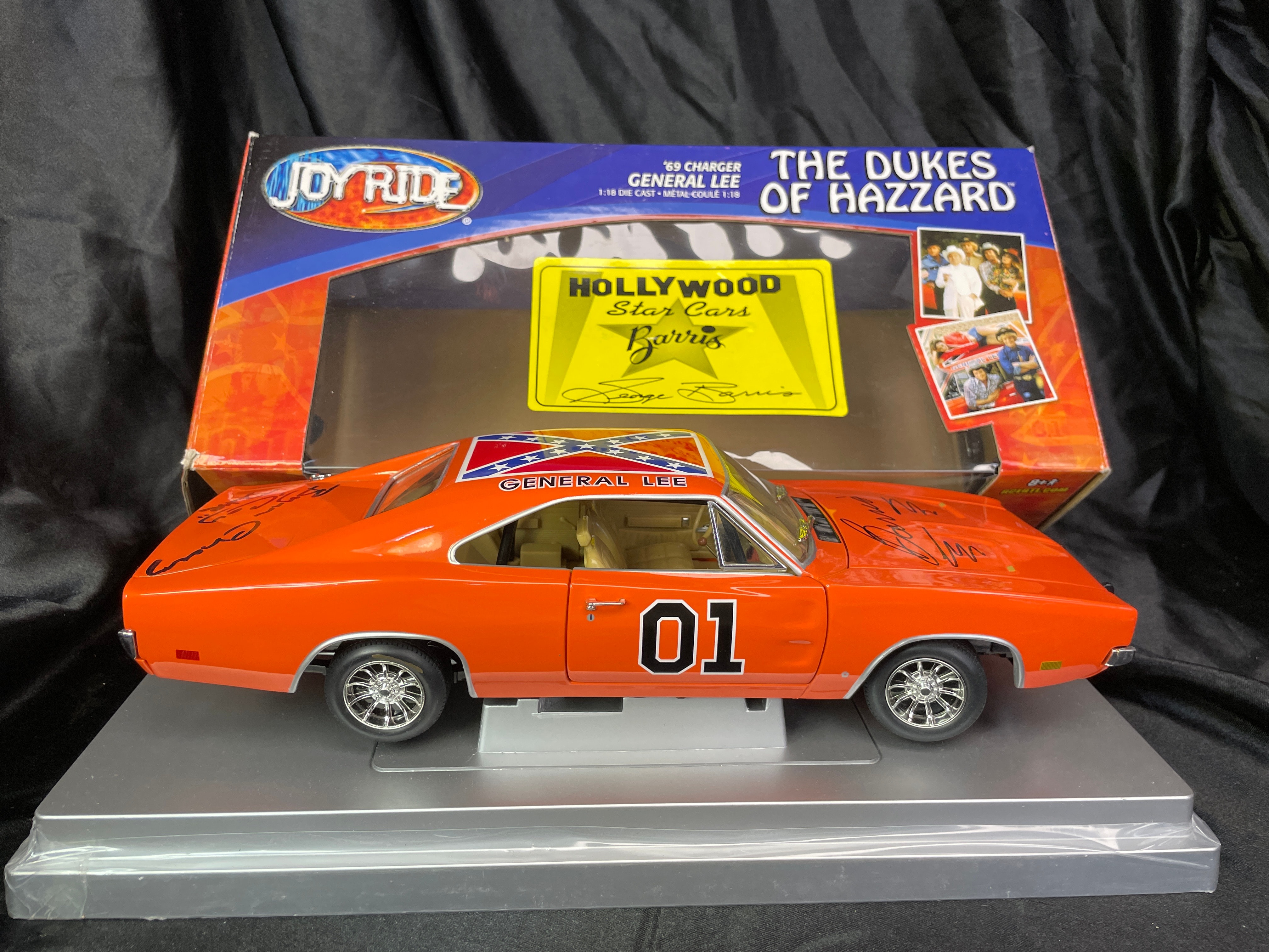 An Ertl American Muscle Joy Ride 1:18 scale die-cast model of the 1969 Dodge Charger ‘General Lee’ from ‘The Dukes of Hazzard’ television series. The orange body features ’01’ on the doors, ‘GENERAL LEE’ above the side windows, and a Confederate battle flag on the roof. It is equipped with a ‘CNH 320 Hazzard County’ license plate. The model includes opening doors and hood, revealing a detailed engine and interior, along with steerable front wheels. The hood is signed ‘Barris Mr’ and the trunk is signed ‘Bryan Chum Duke’ in black marker. It is presented on an ‘AMERICAN MUSCLE ERTL Collectibles’ base and comes with its original ‘JOY RIDE’ branded box (item number 32485, copyright 2005 by RC2 Brands, Inc.). A ‘HOLLYWOOD Star Cars Barris’ sticker is visible in the box window.