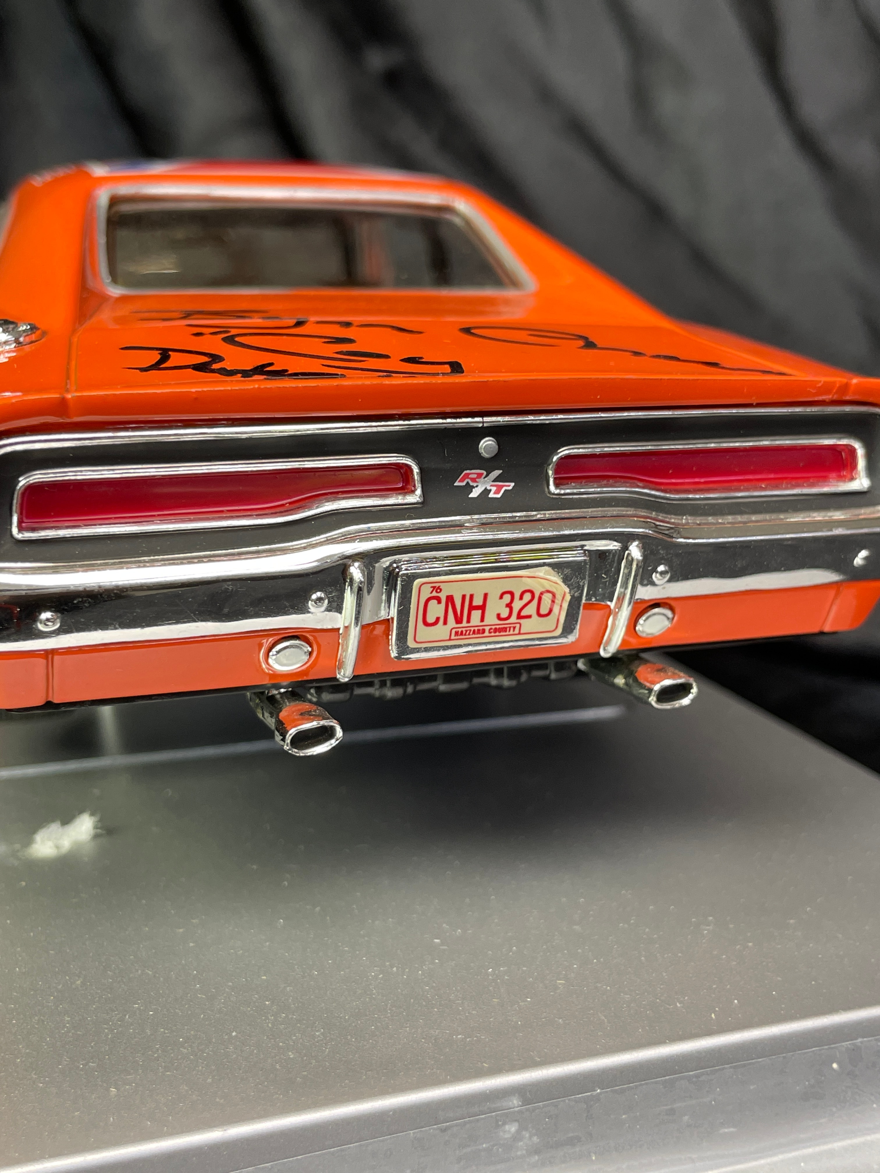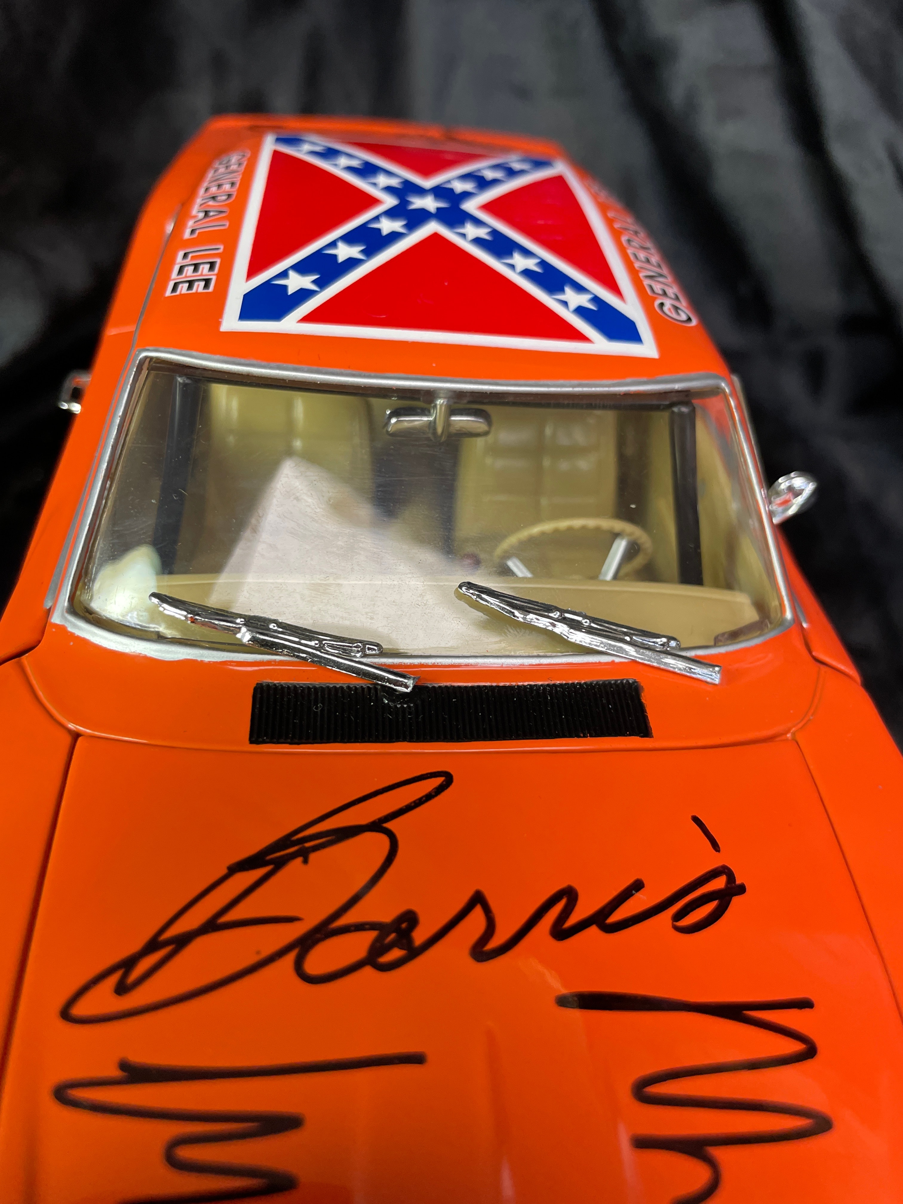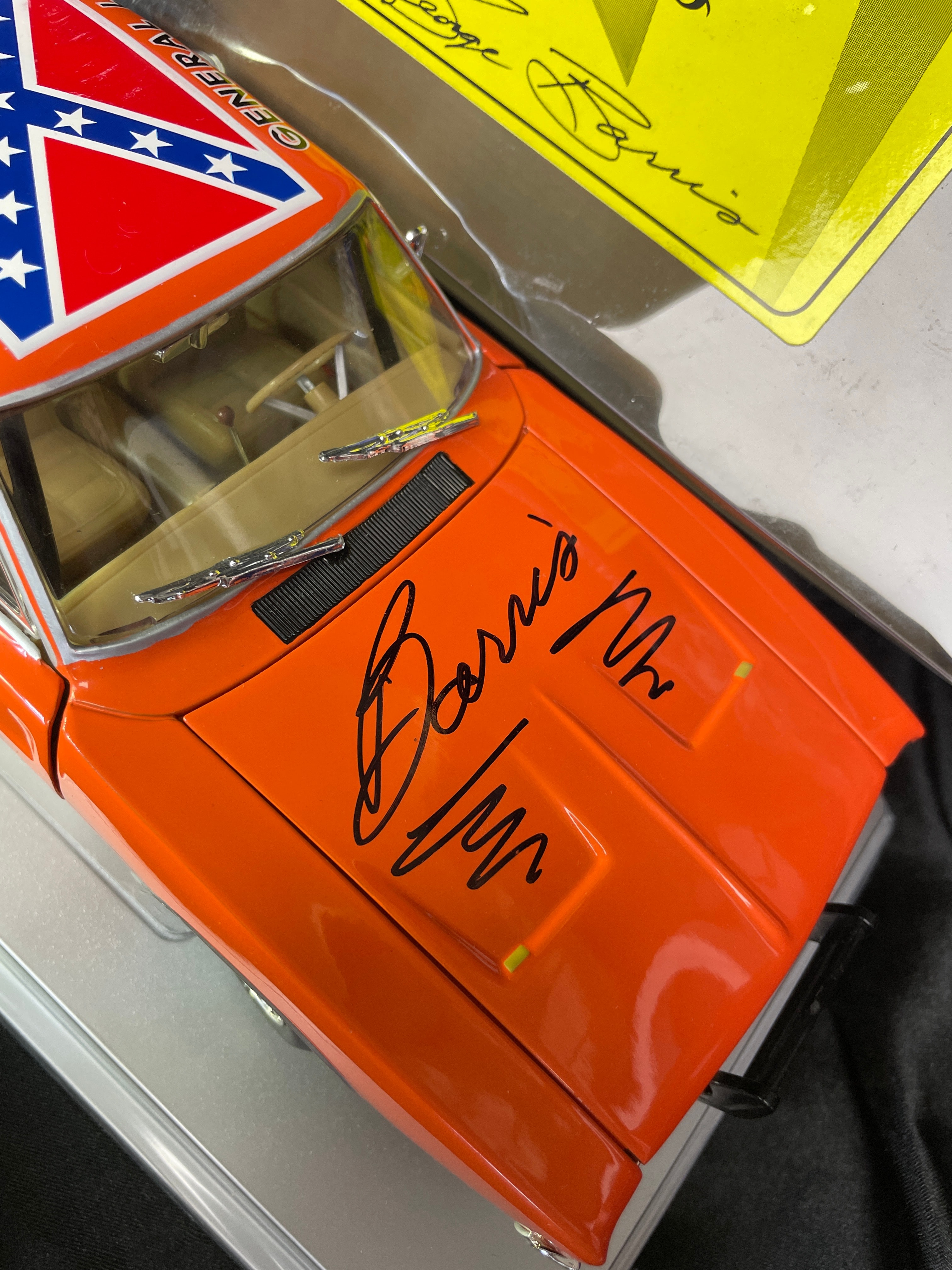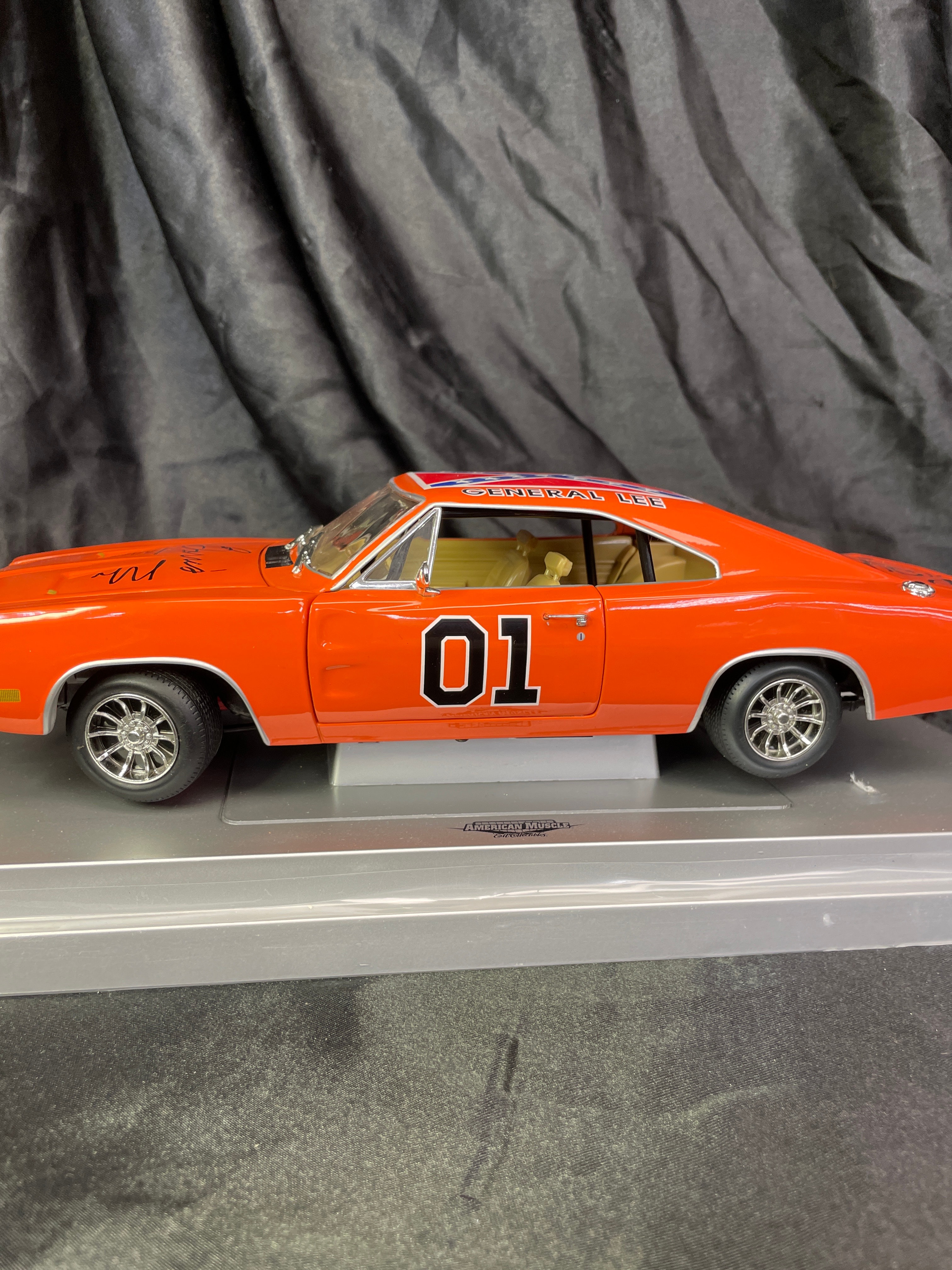 An Ertl American Muscle Joy Ride 1:18 scale die-cast model of the 1969 Dodge Charger ‘General Lee’ from ‘The Dukes of Hazzard’ television series. The orange body features ’01’ on the doors, ‘GENERAL LEE’ above the side windows, and a Confederate battle flag on the roof. It is equipped with a ‘CNH 320 Hazzard County’ license plate. The model includes opening doors and hood, revealing a detailed engine and interior, along with steerable front wheels. The hood is signed ‘Barris Mr’ and the trunk is signed ‘Bryan Chum Duke’ in black marker. It is presented on an ‘AMERICAN MUSCLE ERTL Collectibles’ base and comes with its original ‘JOY RIDE’ branded box (item number 32485, copyright 2005 by RC2 Brands, Inc.). A ‘HOLLYWOOD Star Cars Barris’ sticker is visible in the box window.