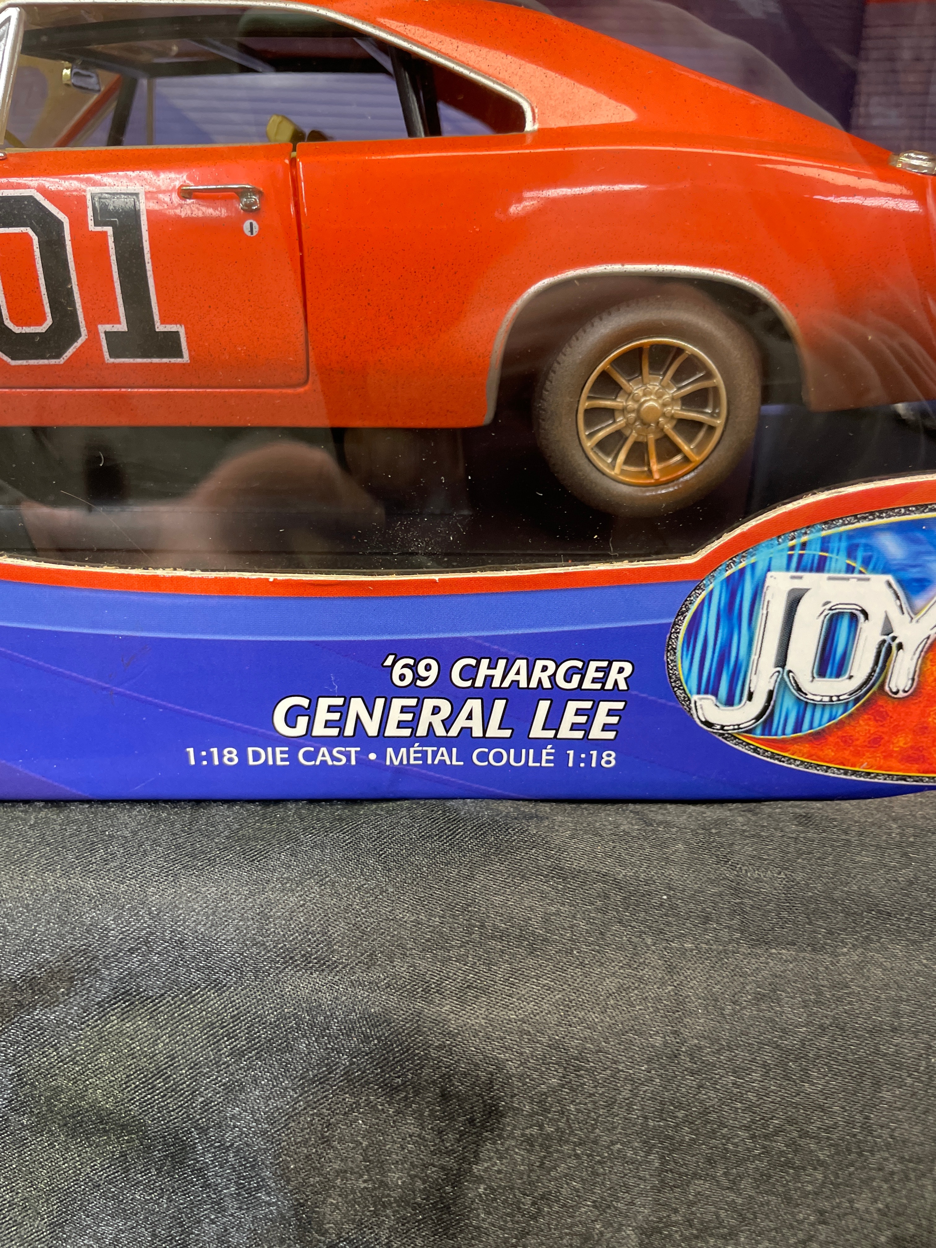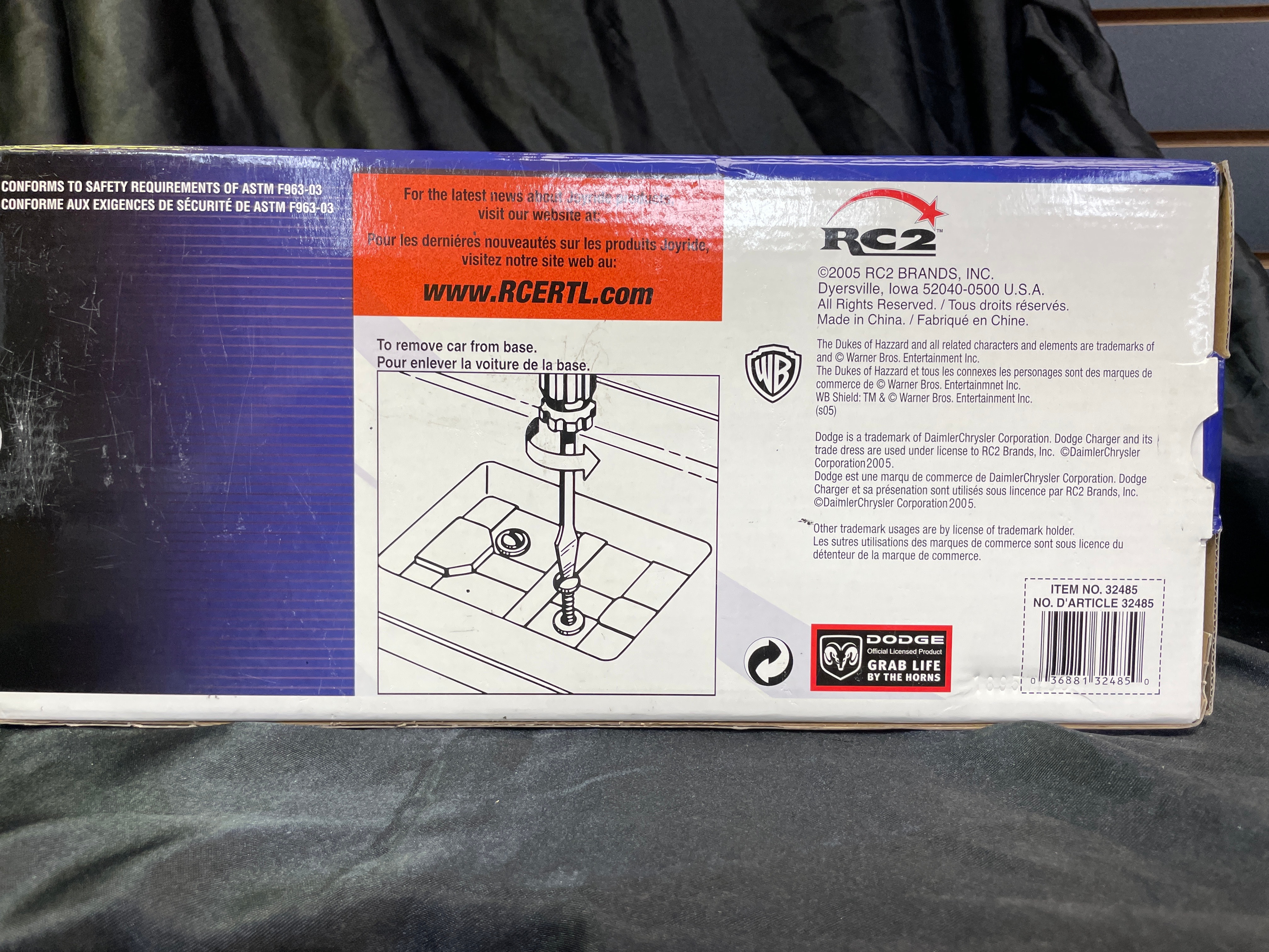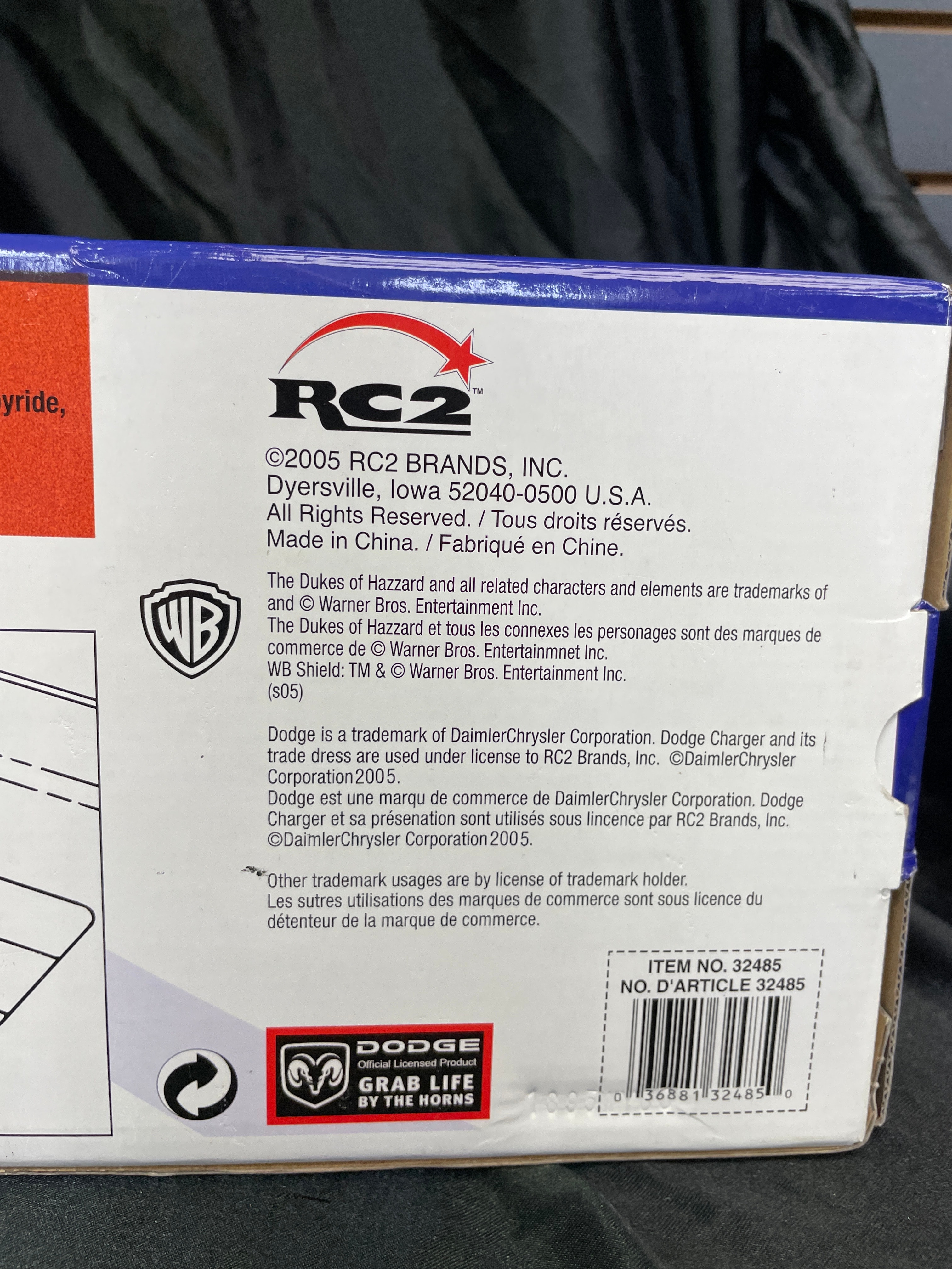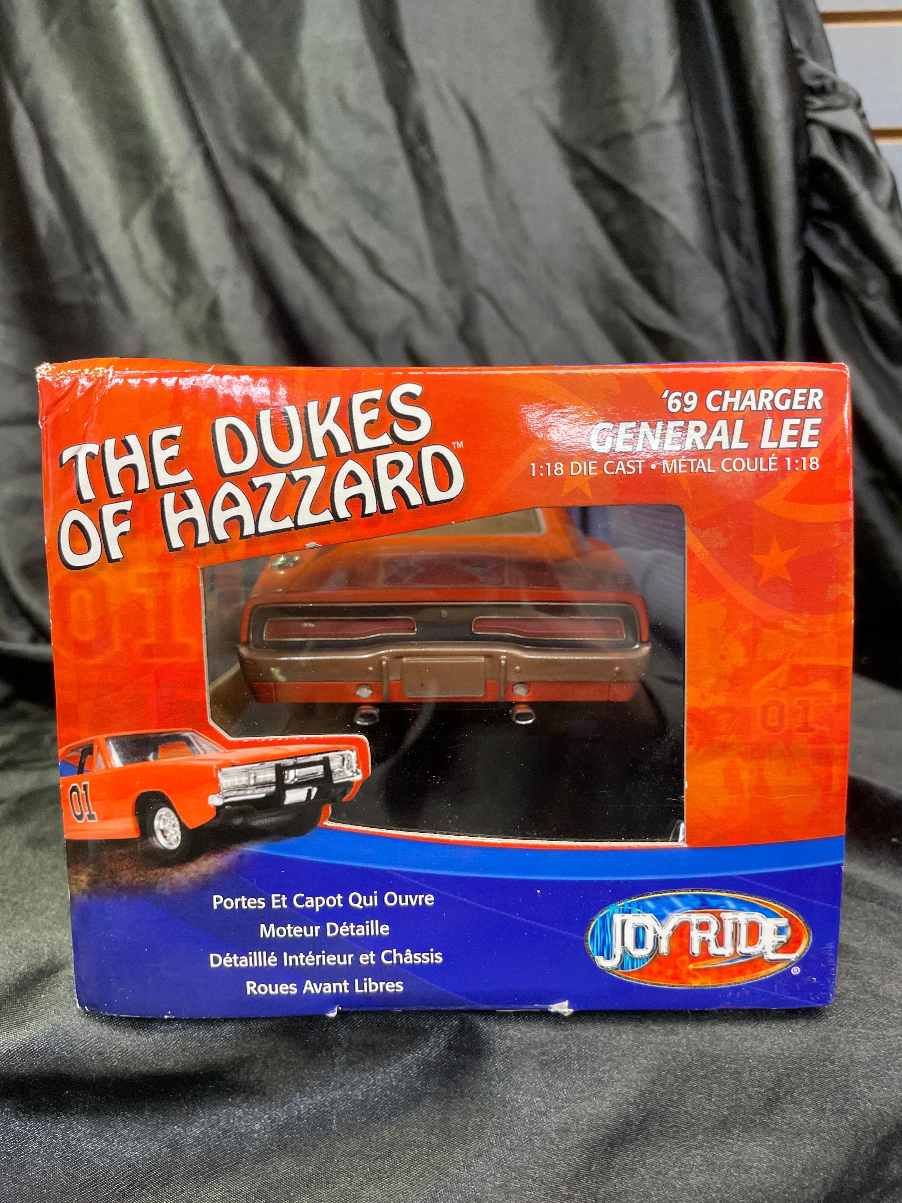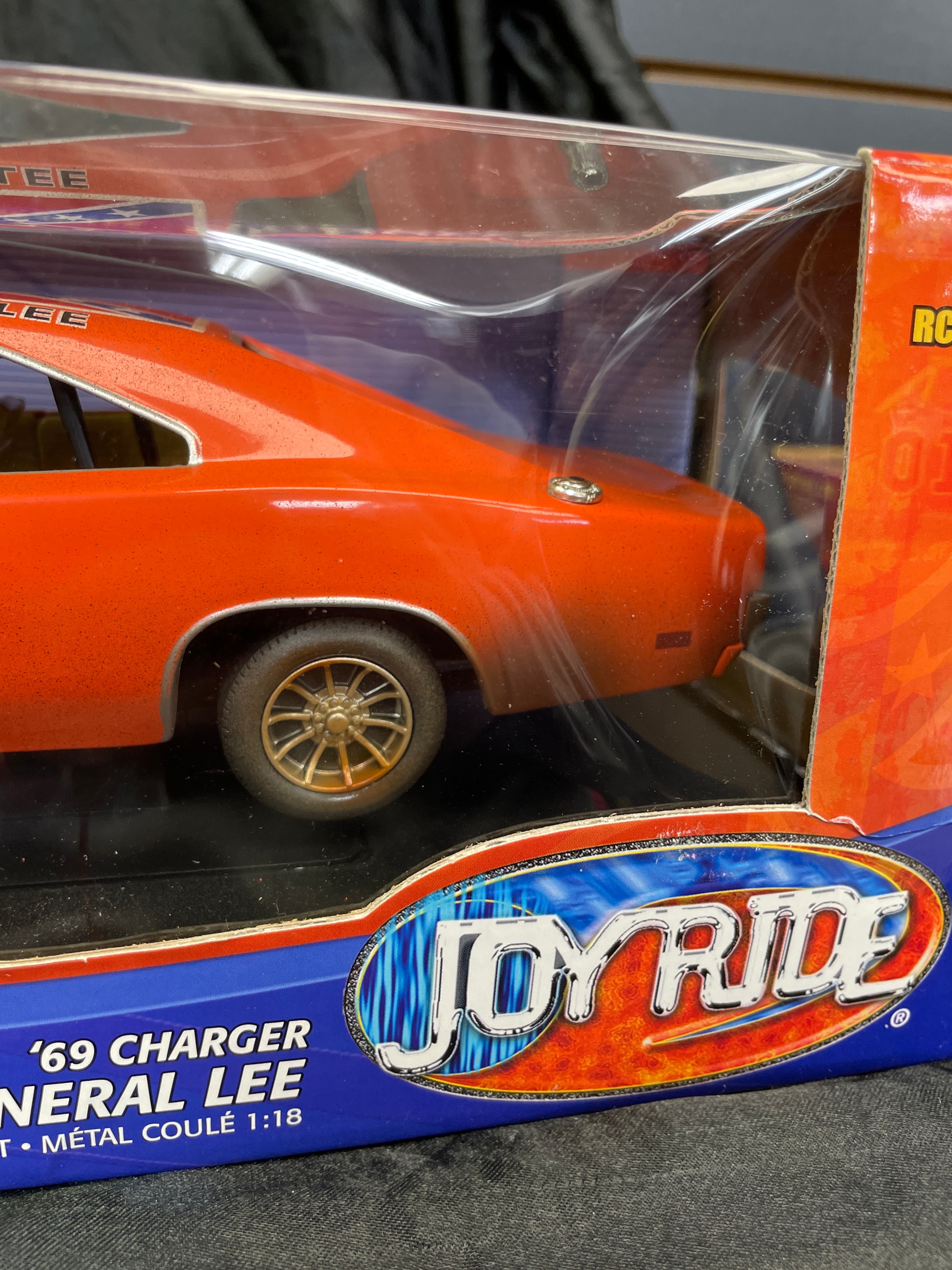 A 1:18 scale die-cast model car, replicating the ‘General Lee,’ a 1969 Dodge Charger from “The Dukes of Hazzard” television series, identified by market consensus as a ‘Dirty Edition’ due to its speckled finish. The model features an orange body with the number “01” on the doors, “GENERAL LEE” lettering, and a Confederate battle flag decal on the roof. Constructed from die-cast metal with plastic components for the interior and details, it is housed in its original, unopened cardboard and plastic window box packaging. The packaging identifies the manufacturer as RC2 Brands, Inc., dated ©2005, and states “Made in China / Fabriqué en Chine.” Other visible markings on the box include “JOY RIDE” branding, “ITEM NO. 32485 / NO. D’ARTICLE 32485,” a “WB” (Warner Bros.) logo, and a “DODGE Official Licensed Product” logo. The model features opening doors and hood, a detailed engine, interior, and chassis, and steerable front wheels. The packaging also notes it “CONFORMS TO SAFETY REQUIREMENTS OF ASTM F963-03 / CONFORME AUX EXIGENCES DE SÉCURITÉ DE ASTM F963-03.” This model is often associated with the Ertl American Muscle line in the collector’s market.