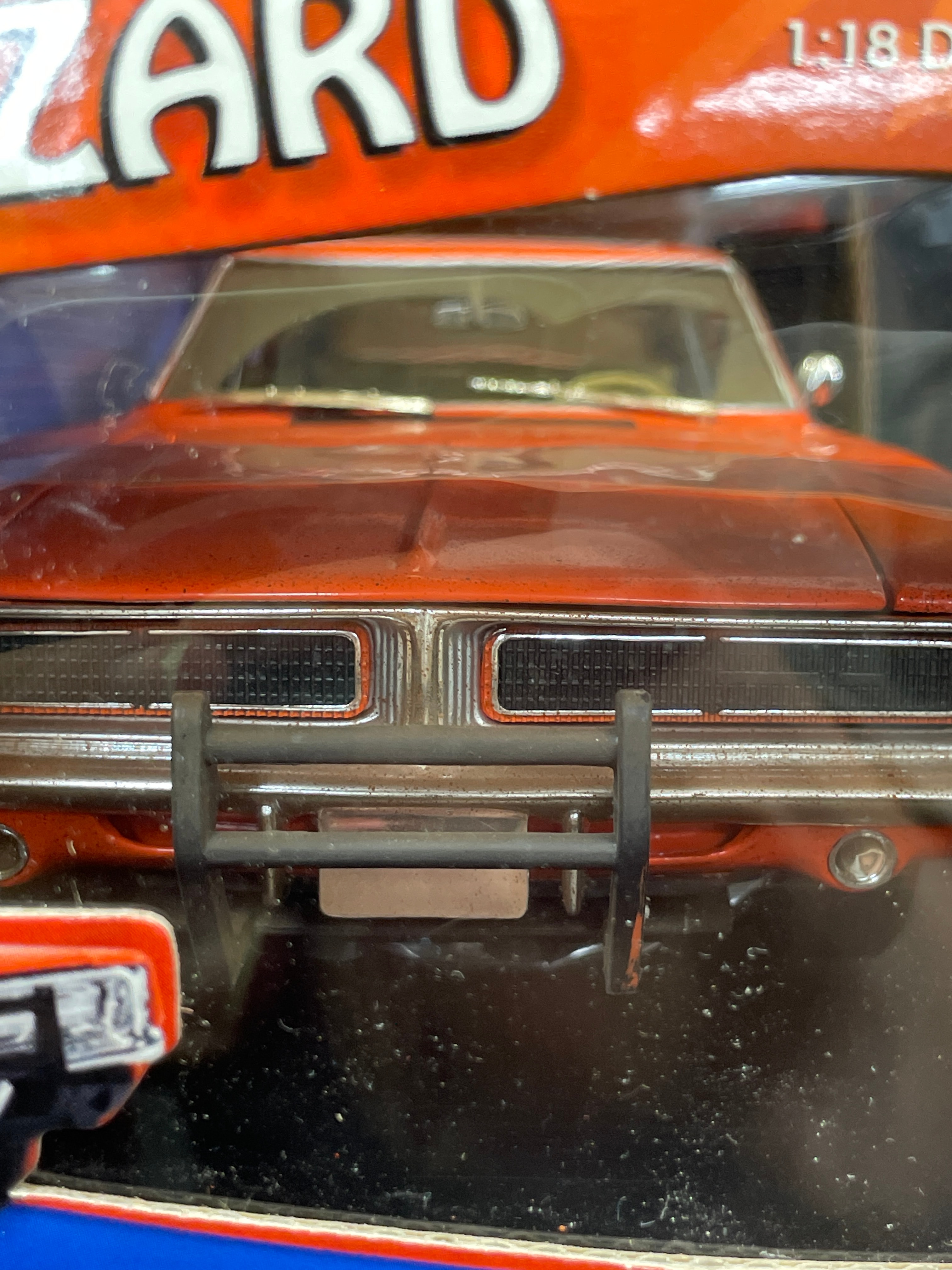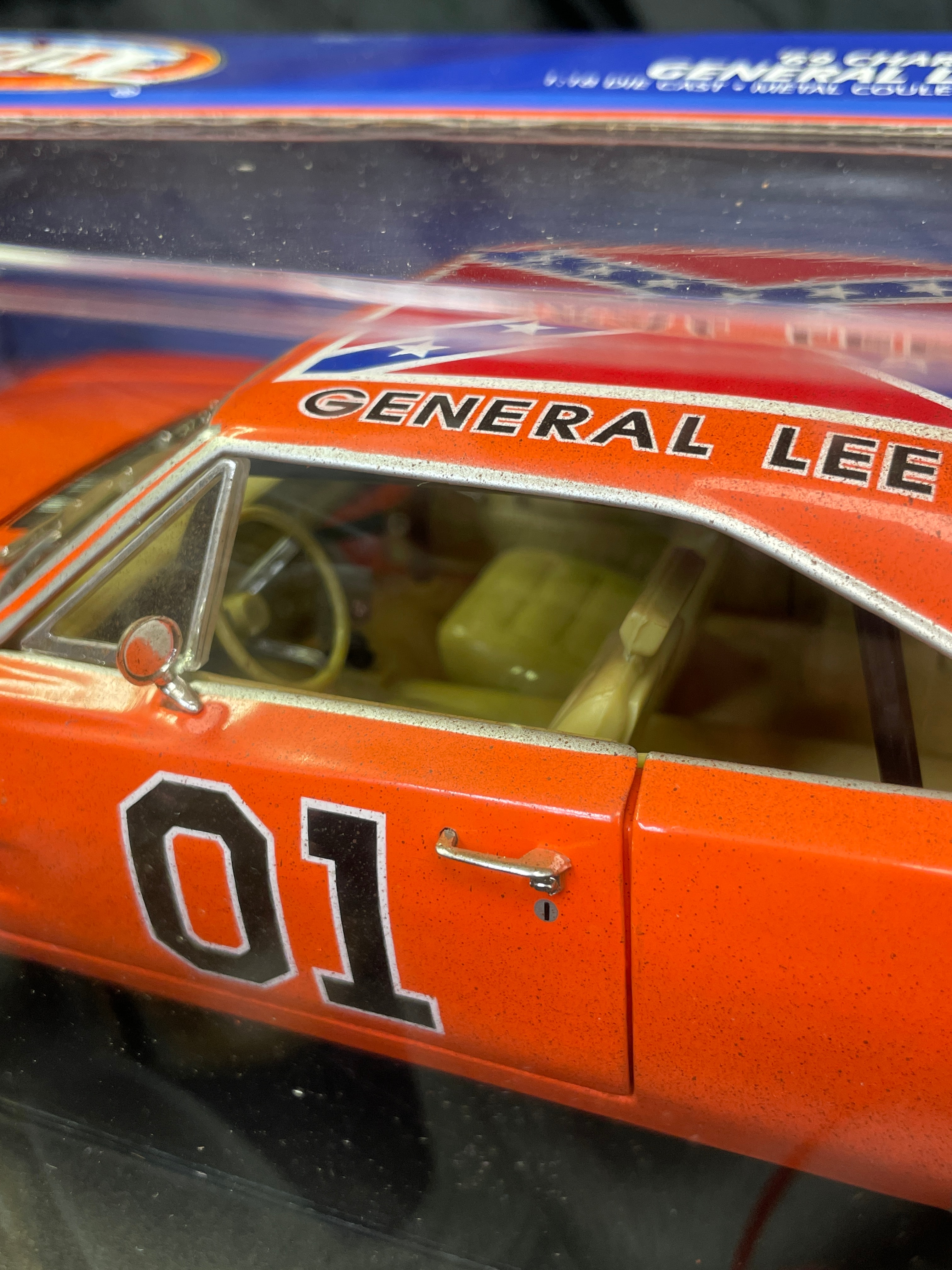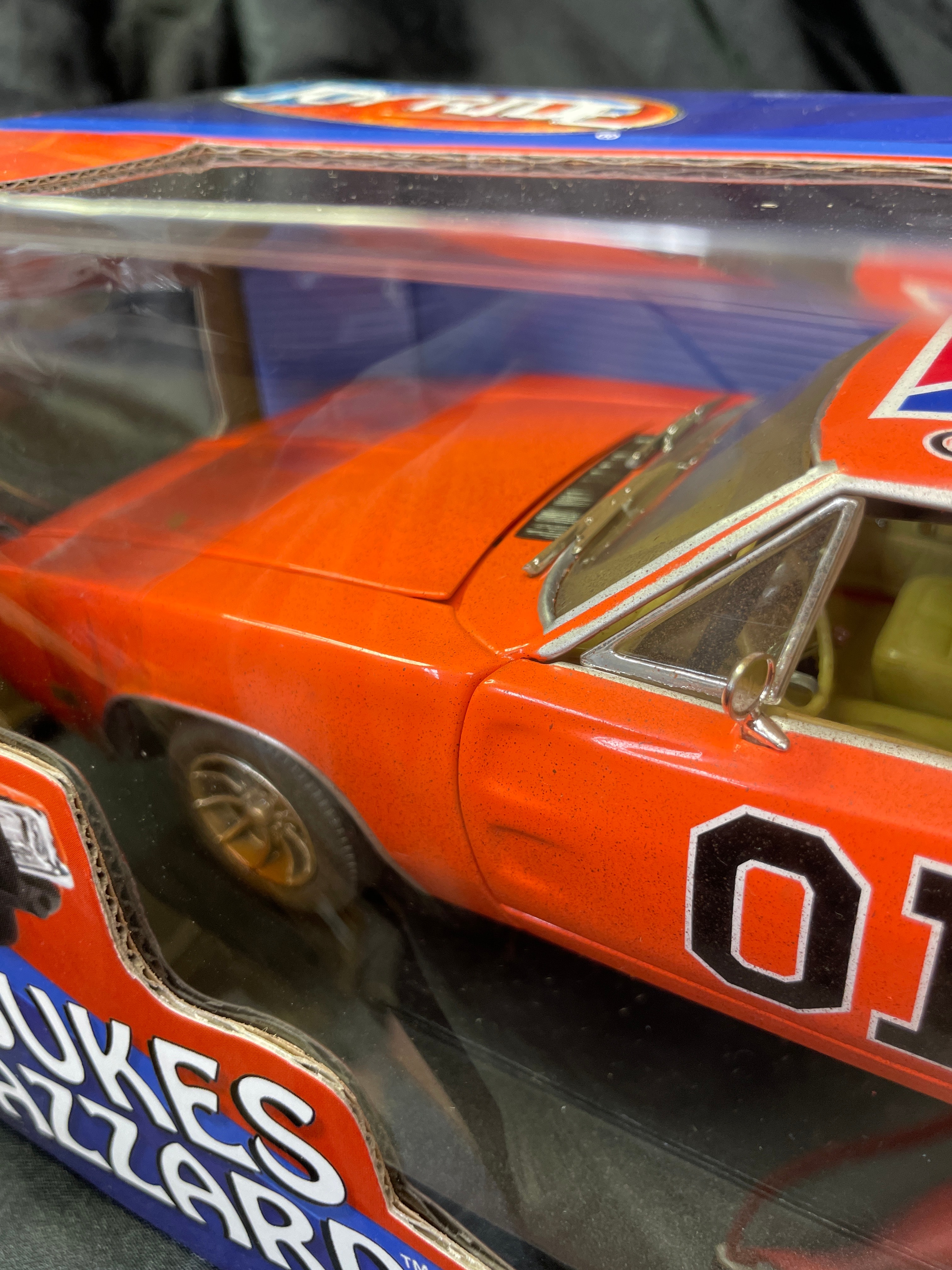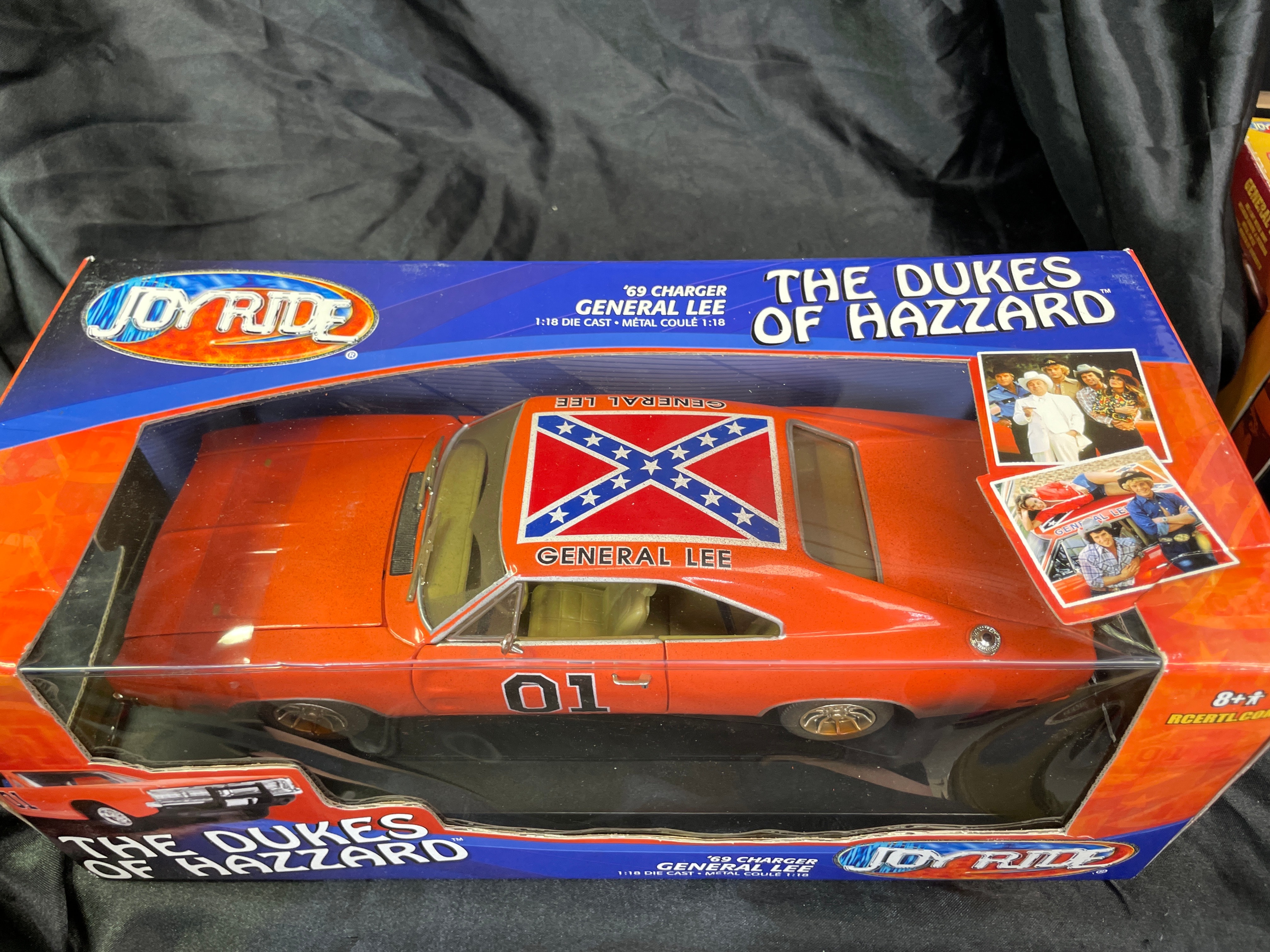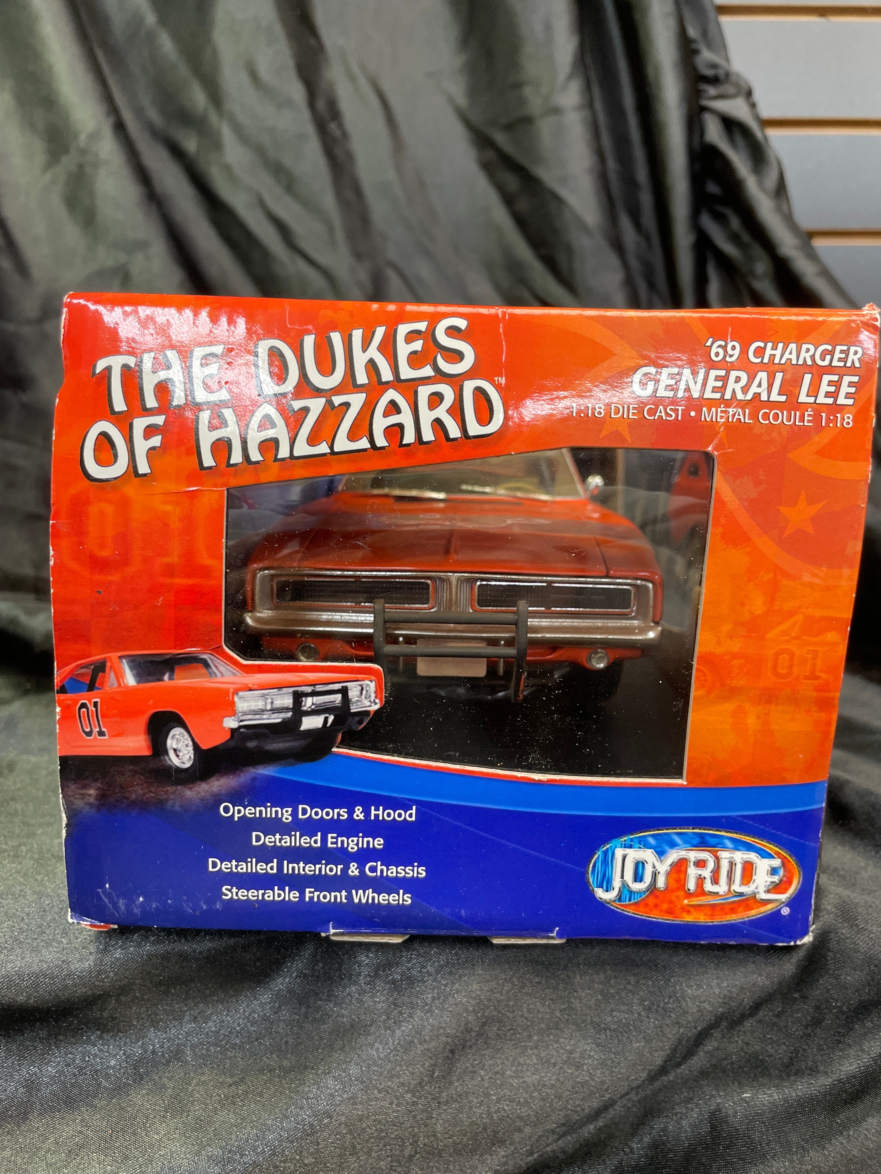 A 1:18 scale die-cast model car, replicating the ‘General Lee,’ a 1969 Dodge Charger from “The Dukes of Hazzard” television series, identified by market consensus as a ‘Dirty Edition’ due to its speckled finish. The model features an orange body with the number “01” on the doors, “GENERAL LEE” lettering, and a Confederate battle flag decal on the roof. Constructed from die-cast metal with plastic components for the interior and details, it is housed in its original, unopened cardboard and plastic window box packaging. The packaging identifies the manufacturer as RC2 Brands, Inc., dated ©2005, and states “Made in China / Fabriqué en Chine.” Other visible markings on the box include “JOY RIDE” branding, “ITEM NO. 32485 / NO. D’ARTICLE 32485,” a “WB” (Warner Bros.) logo, and a “DODGE Official Licensed Product” logo. The model features opening doors and hood, a detailed engine, interior, and chassis, and steerable front wheels. The packaging also notes it “CONFORMS TO SAFETY REQUIREMENTS OF ASTM F963-03 / CONFORME AUX EXIGENCES DE SÉCURITÉ DE ASTM F963-03.” This model is often associated with the Ertl American Muscle line in the collector’s market.