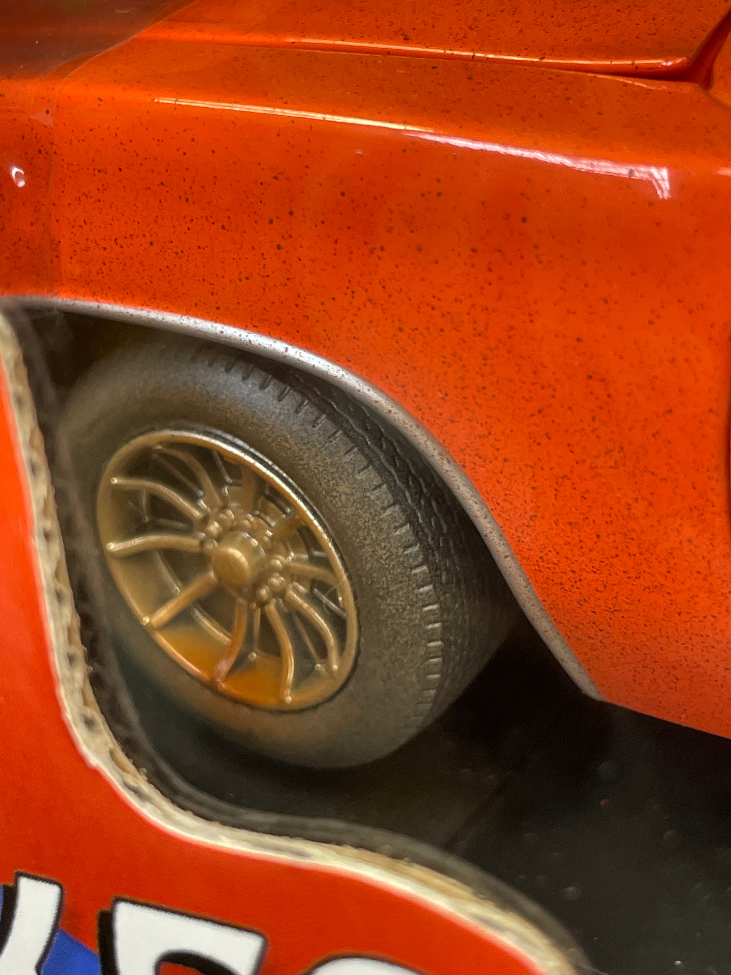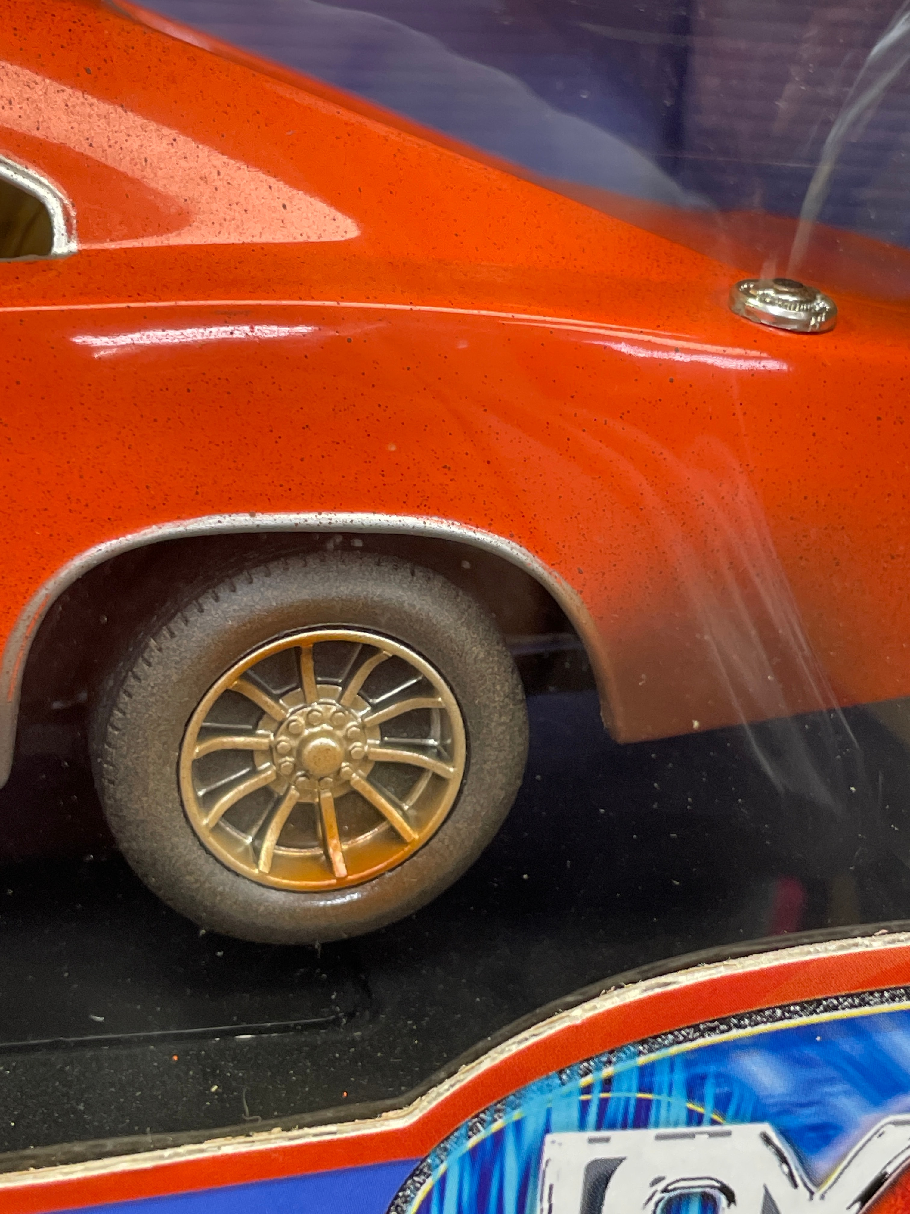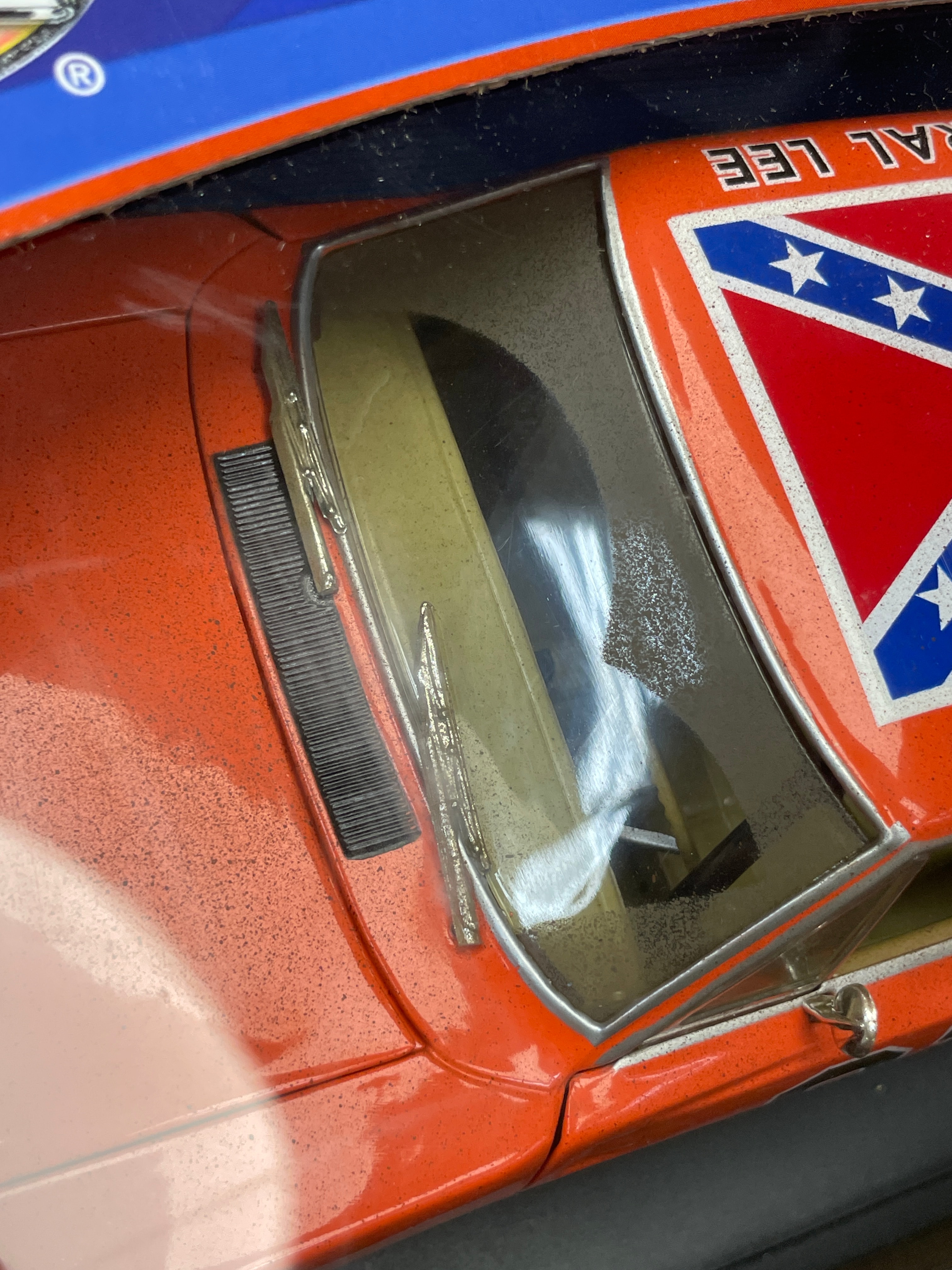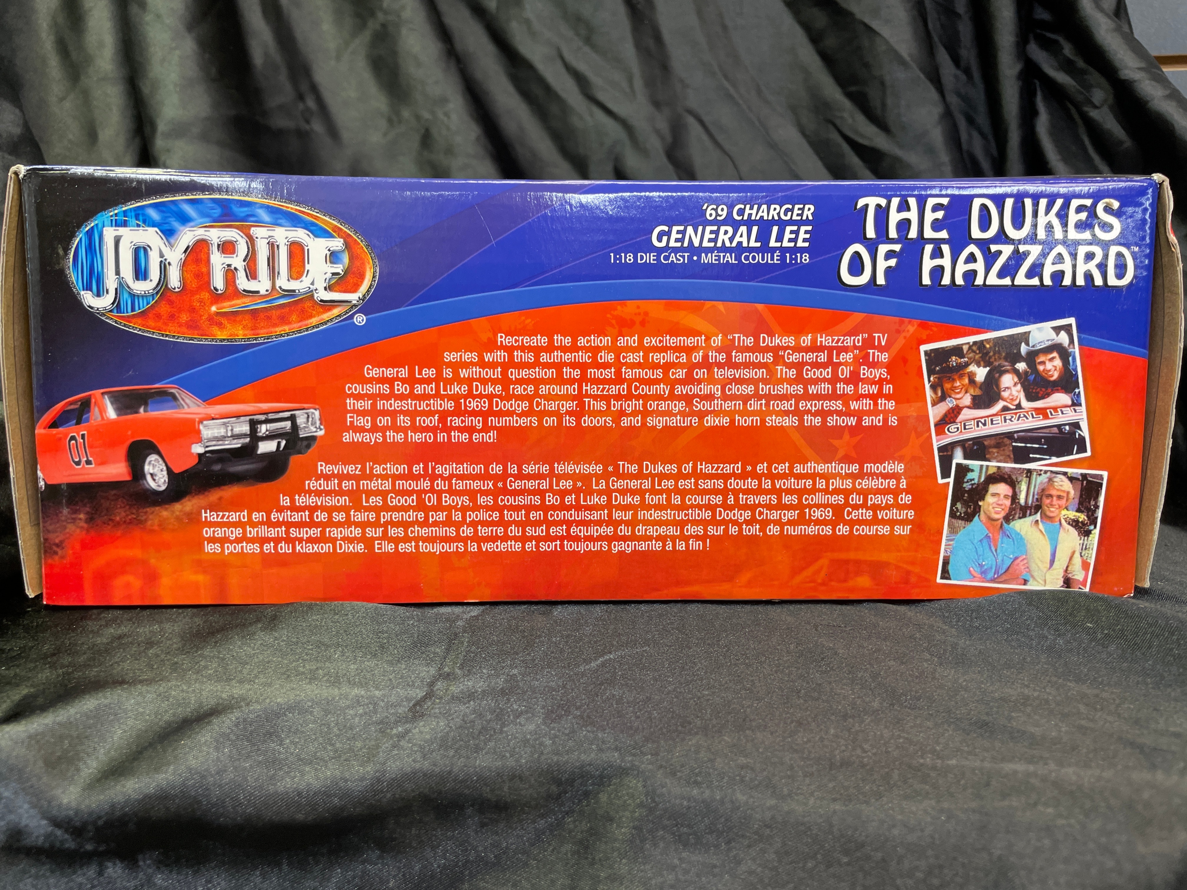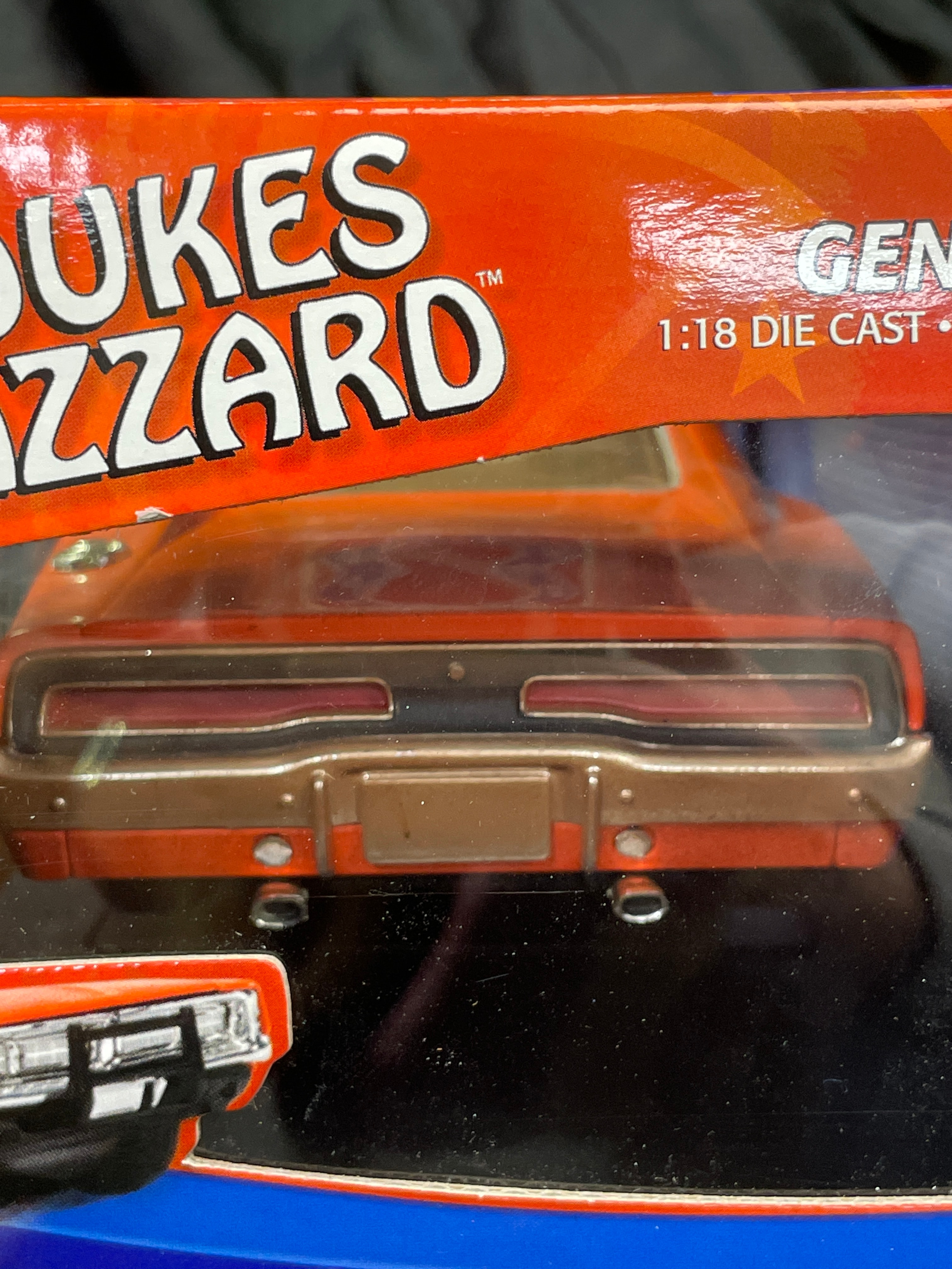 A 1:18 scale die-cast model car, replicating the ‘General Lee,’ a 1969 Dodge Charger from “The Dukes of Hazzard” television series, identified by market consensus as a ‘Dirty Edition’ due to its speckled finish. The model features an orange body with the number “01” on the doors, “GENERAL LEE” lettering, and a Confederate battle flag decal on the roof. Constructed from die-cast metal with plastic components for the interior and details, it is housed in its original, unopened cardboard and plastic window box packaging. The packaging identifies the manufacturer as RC2 Brands, Inc., dated ©2005, and states “Made in China / Fabriqué en Chine.” Other visible markings on the box include “JOY RIDE” branding, “ITEM NO. 32485 / NO. D’ARTICLE 32485,” a “WB” (Warner Bros.) logo, and a “DODGE Official Licensed Product” logo. The model features opening doors and hood, a detailed engine, interior, and chassis, and steerable front wheels. The packaging also notes it “CONFORMS TO SAFETY REQUIREMENTS OF ASTM F963-03 / CONFORME AUX EXIGENCES DE SÉCURITÉ DE ASTM F963-03.” This model is often associated with the Ertl American Muscle line in the collector’s market.