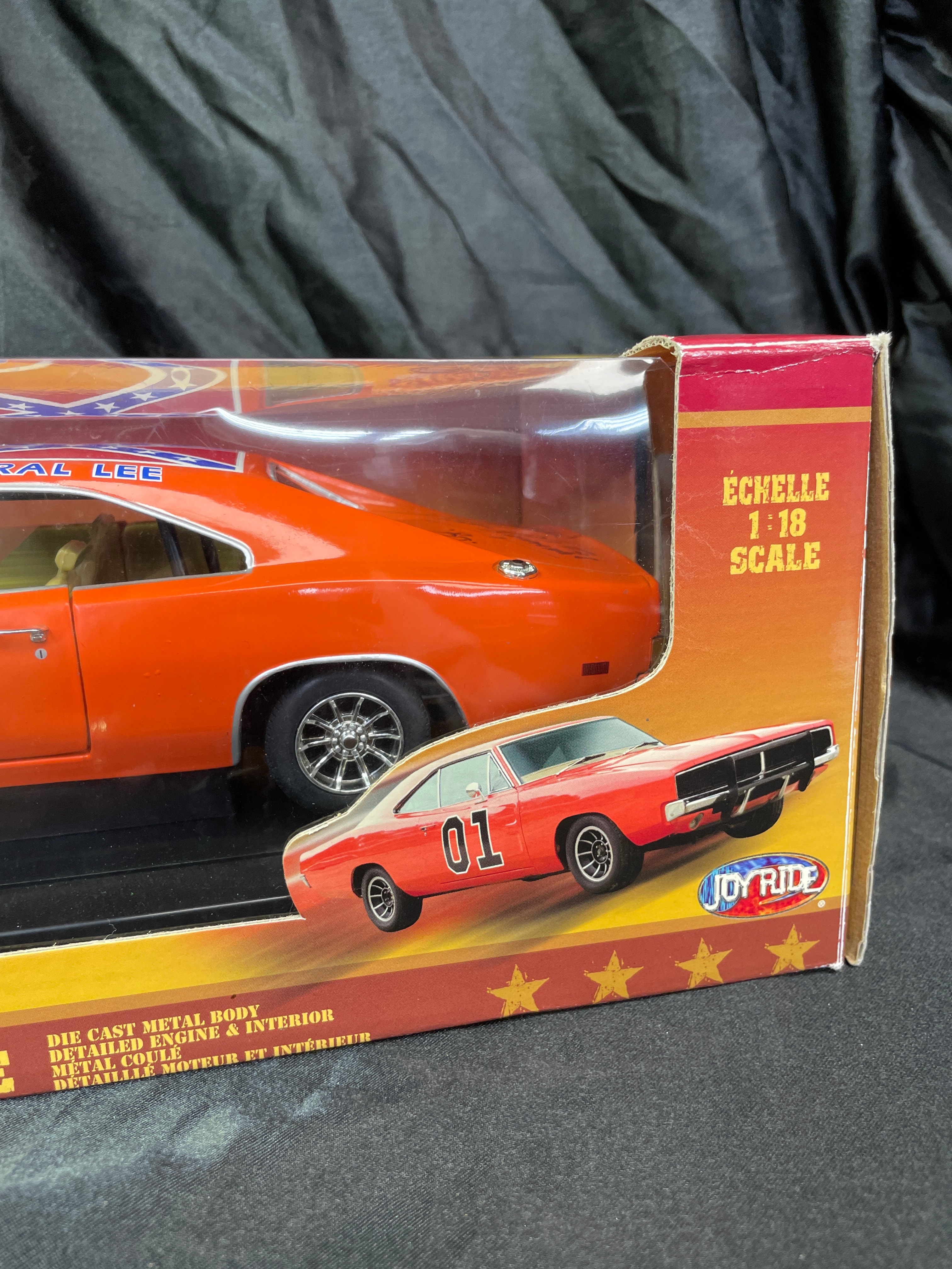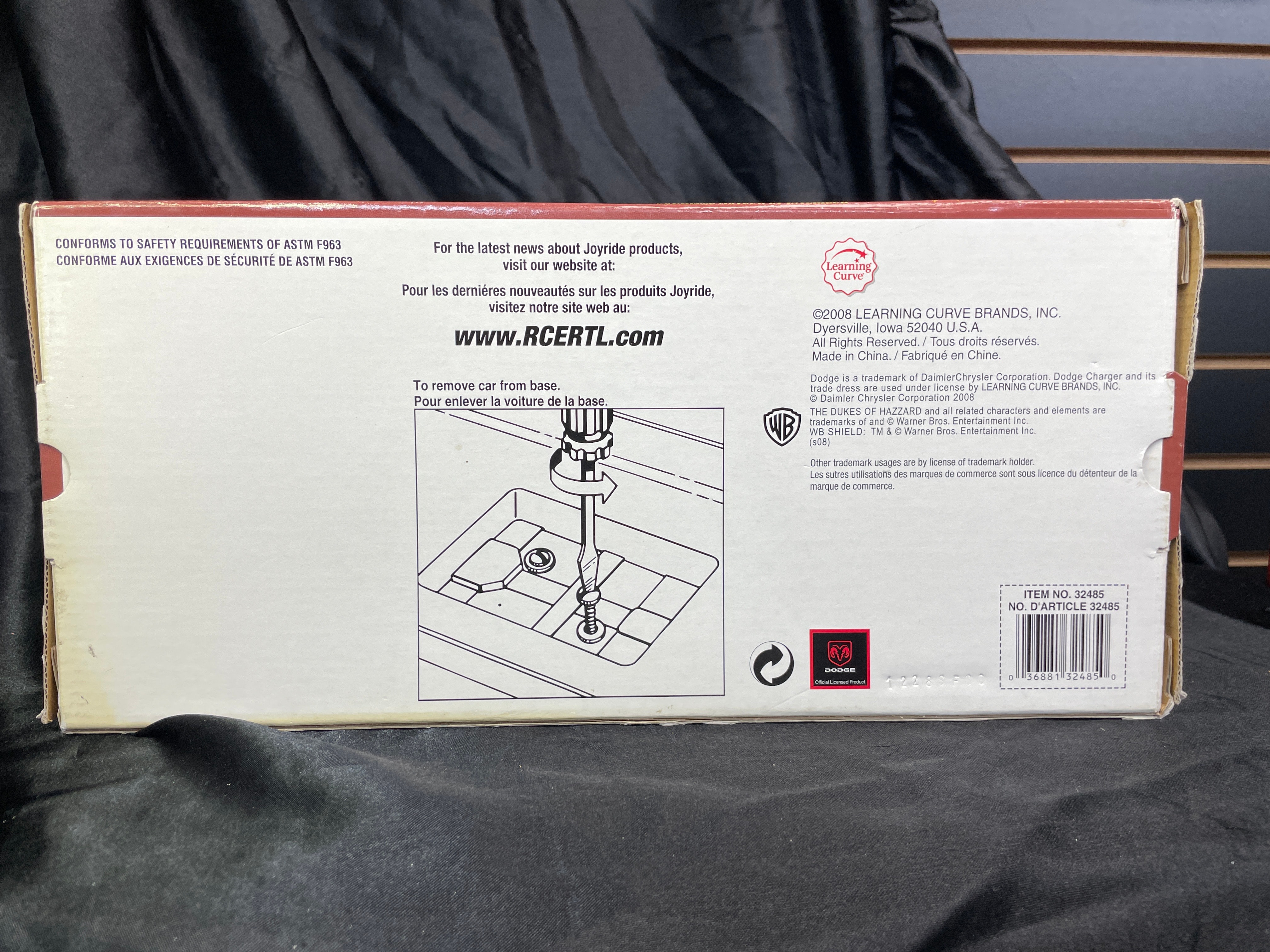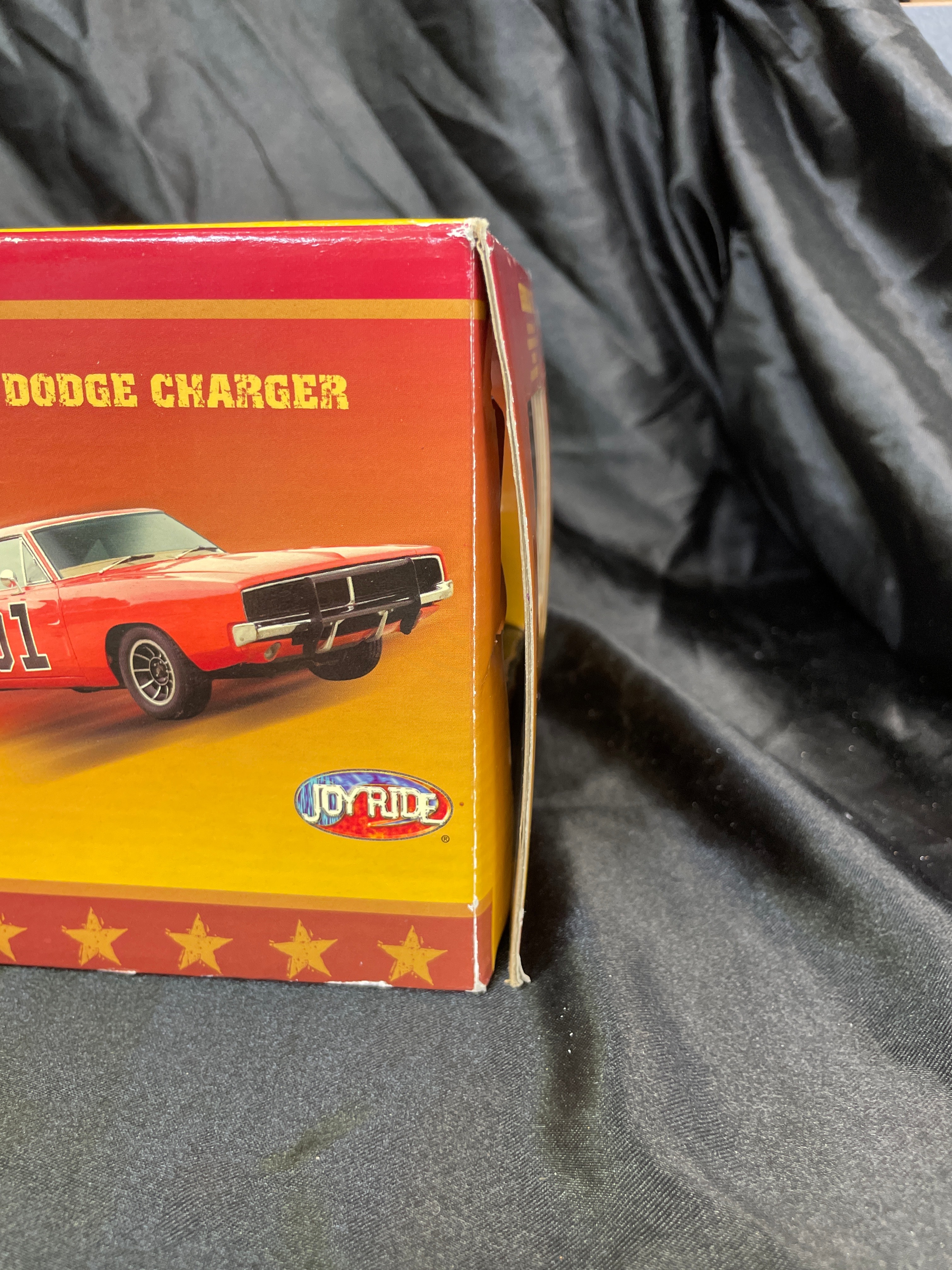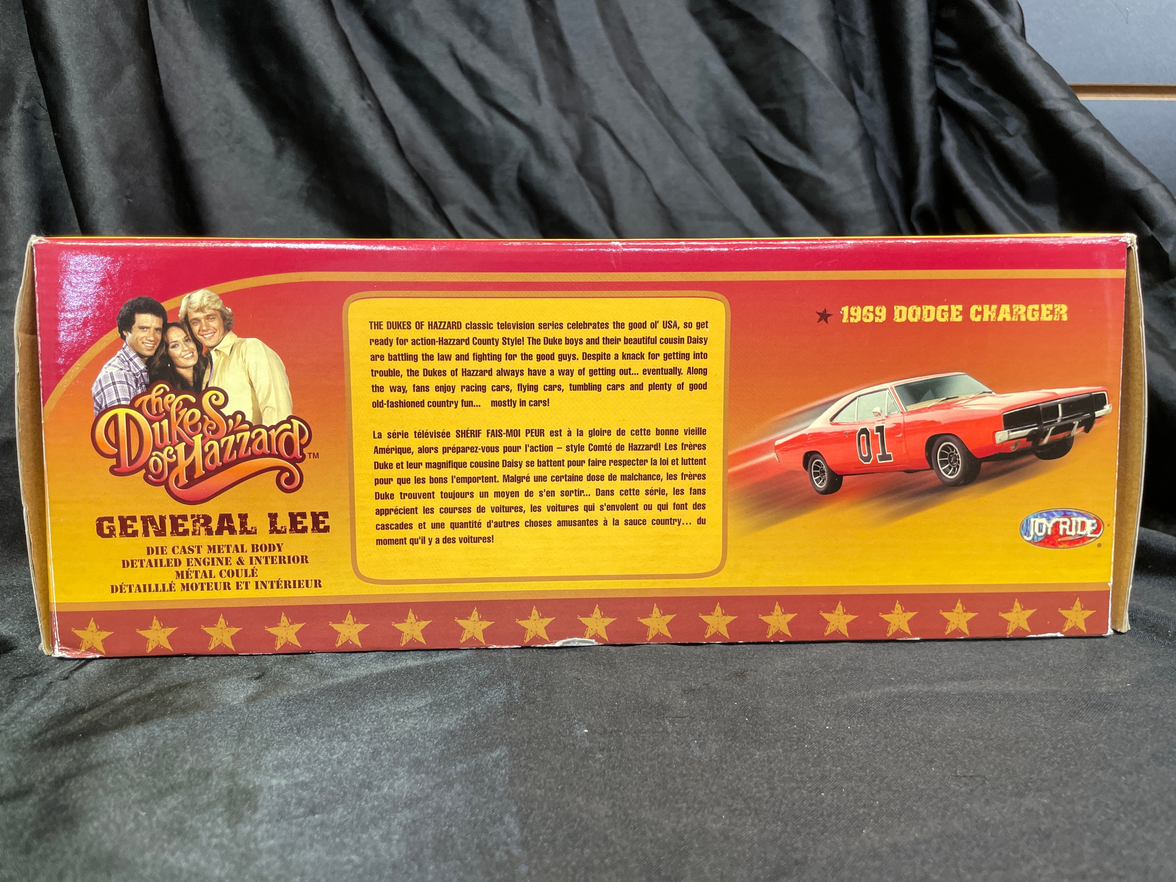 A Joy Ride ‘The Dukes of Hazzard’ General Lee 1969 Dodge Charger 1:18 scale die-cast model. This bright orange die-cast metal body model features black ’01’ decals on the doors and a Confederate battle flag decal with ‘GENERAL LEE’ text on the roof. Beneath the roof decal, a red ink signature is visible, reading ‘Best wishes! John Schneider ‘Bo.’ 80.’ The model features a detailed engine and interior. It is presented new in its original cardboard display box with a clear plastic window. The packaging identifies the producer as ‘Joy Ride’, copyrighted 2008 by Learning Curve Brands, Inc., and states ‘Made in China’. The box also includes character images and a brief synopsis of the TV series in both French and English.