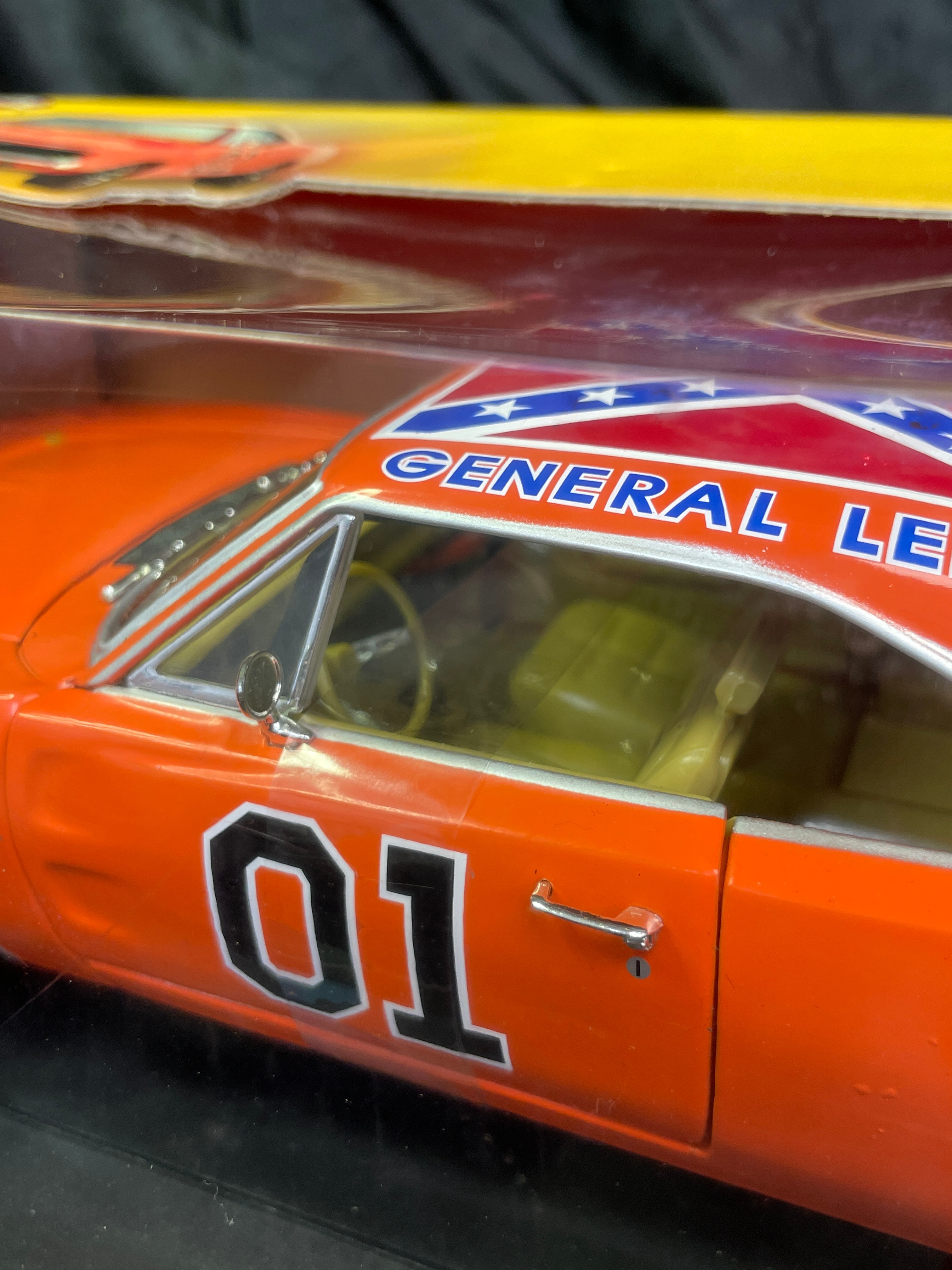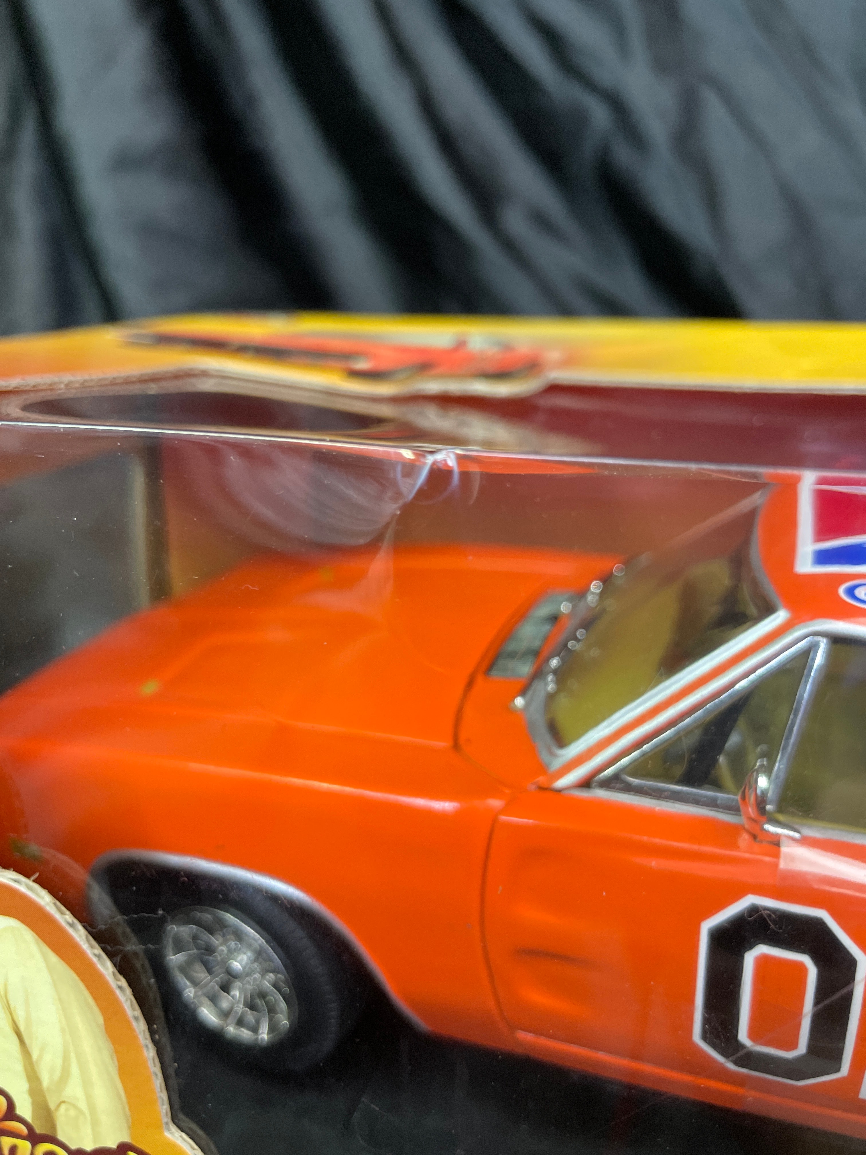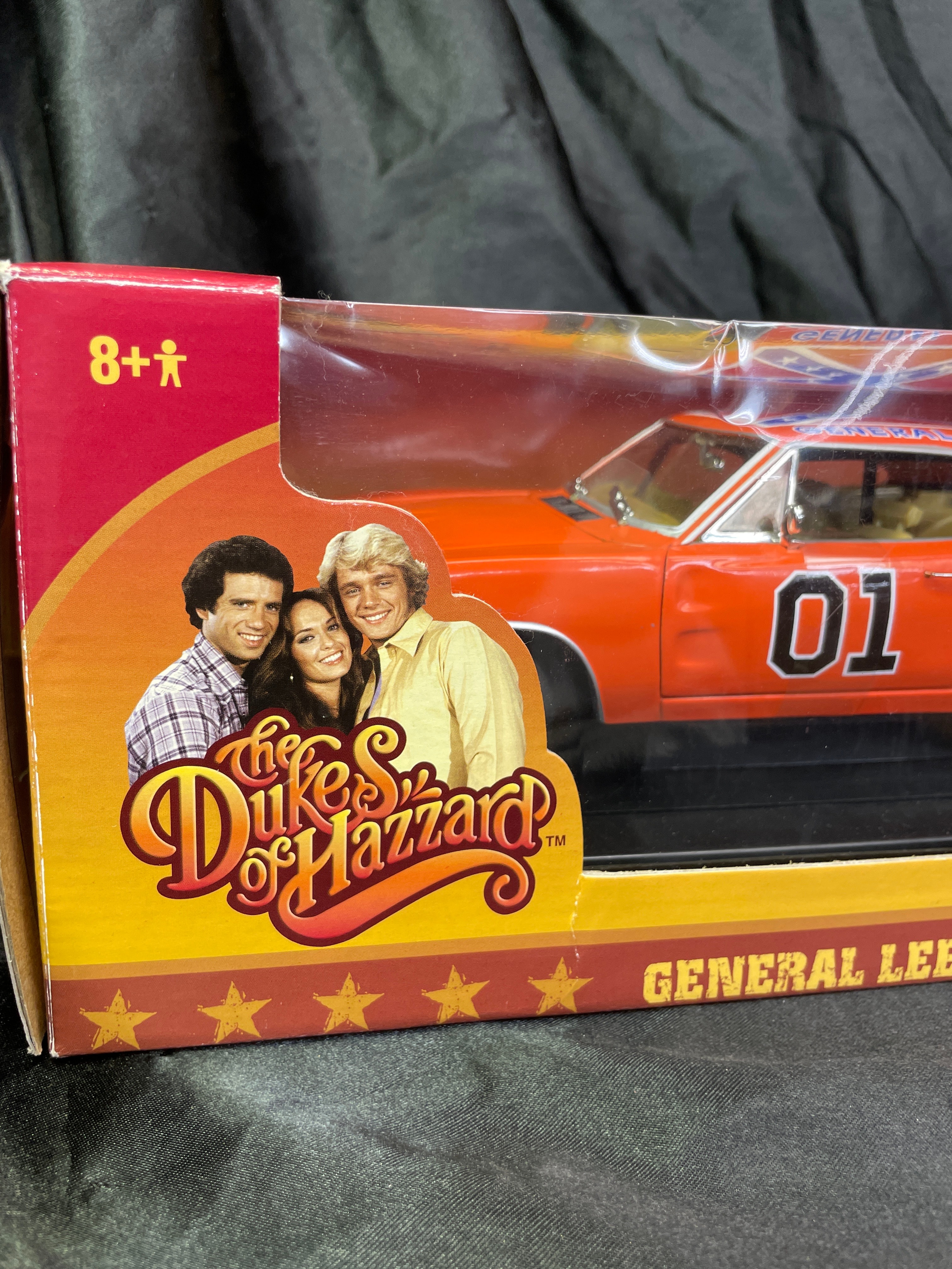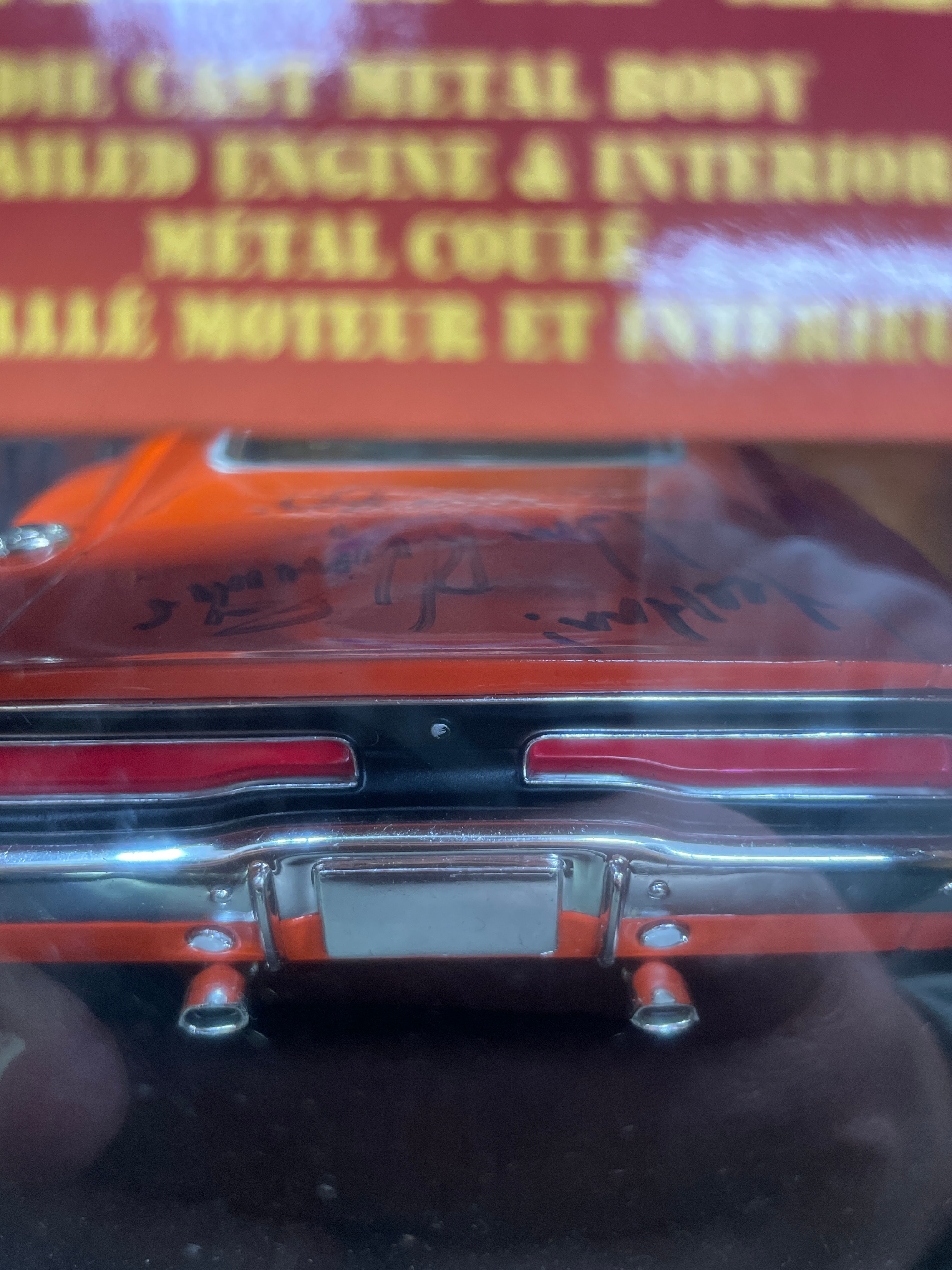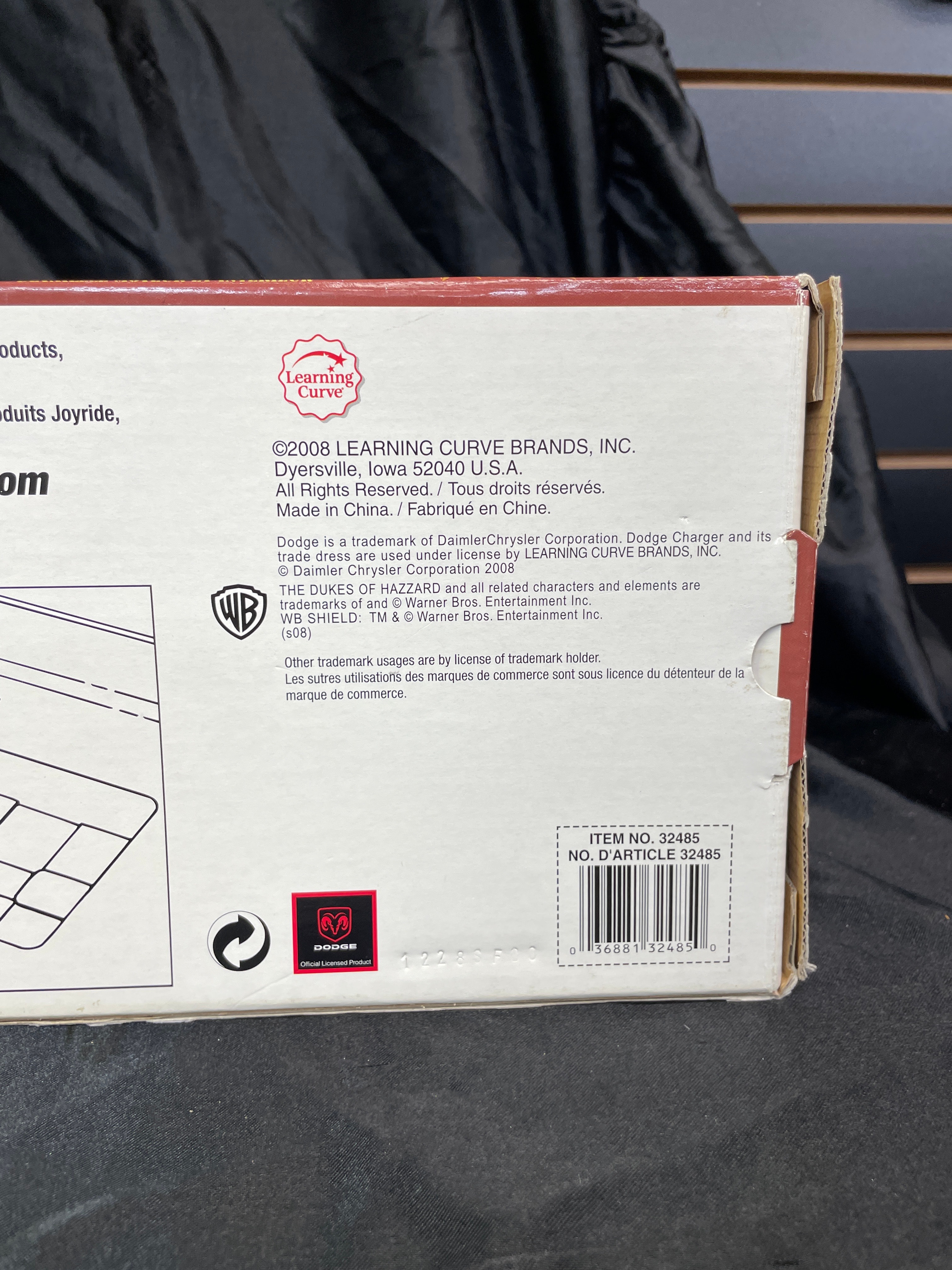 A Joy Ride ‘The Dukes of Hazzard’ General Lee 1969 Dodge Charger 1:18 scale die-cast model. This bright orange die-cast metal body model features black ’01’ decals on the doors and a Confederate battle flag decal with ‘GENERAL LEE’ text on the roof. Beneath the roof decal, a red ink signature is visible, reading ‘Best wishes! John Schneider ‘Bo.’ 80.’ The model features a detailed engine and interior. It is presented new in its original cardboard display box with a clear plastic window. The packaging identifies the producer as ‘Joy Ride’, copyrighted 2008 by Learning Curve Brands, Inc., and states ‘Made in China’. The box also includes character images and a brief synopsis of the TV series in both French and English.