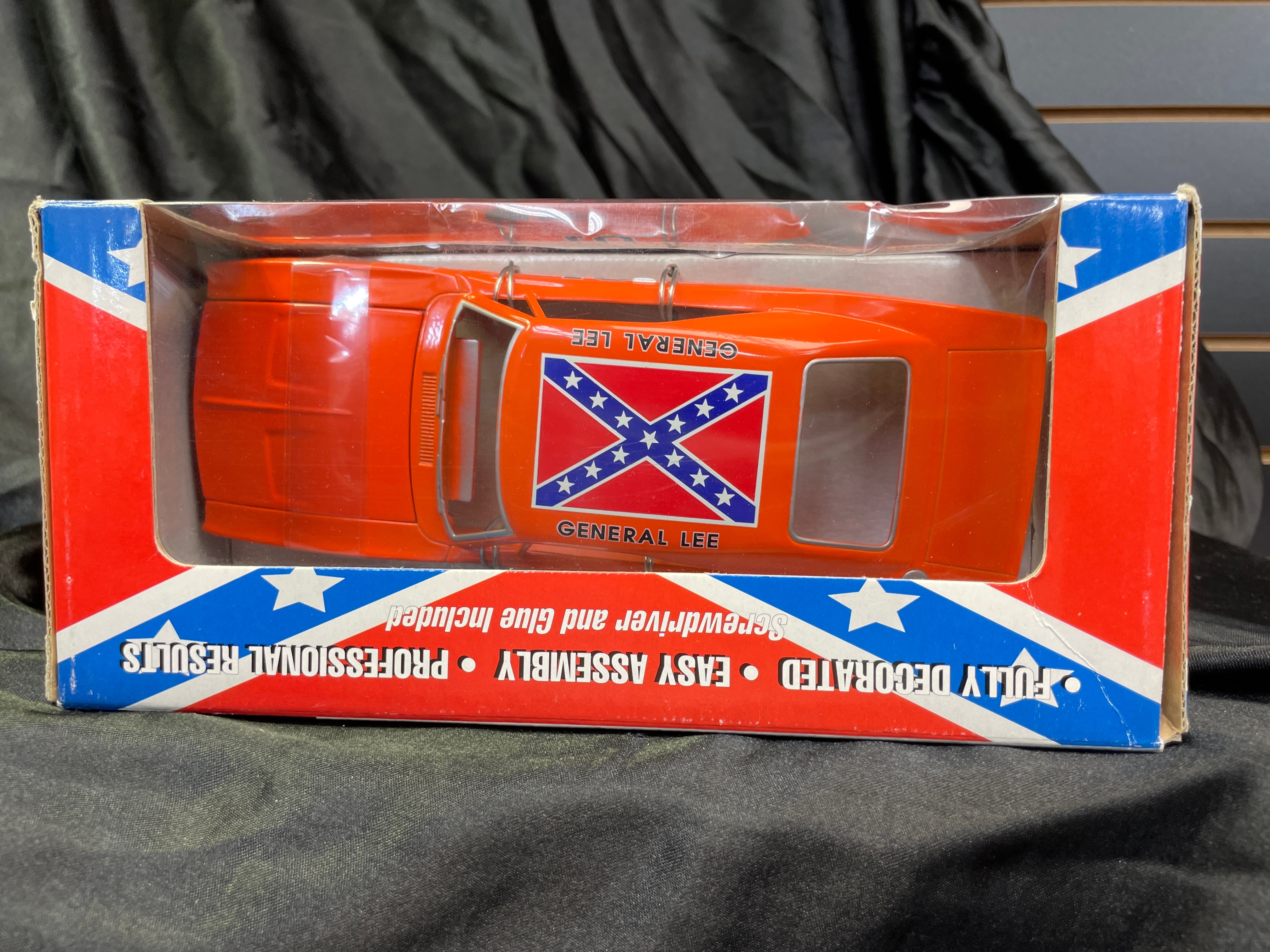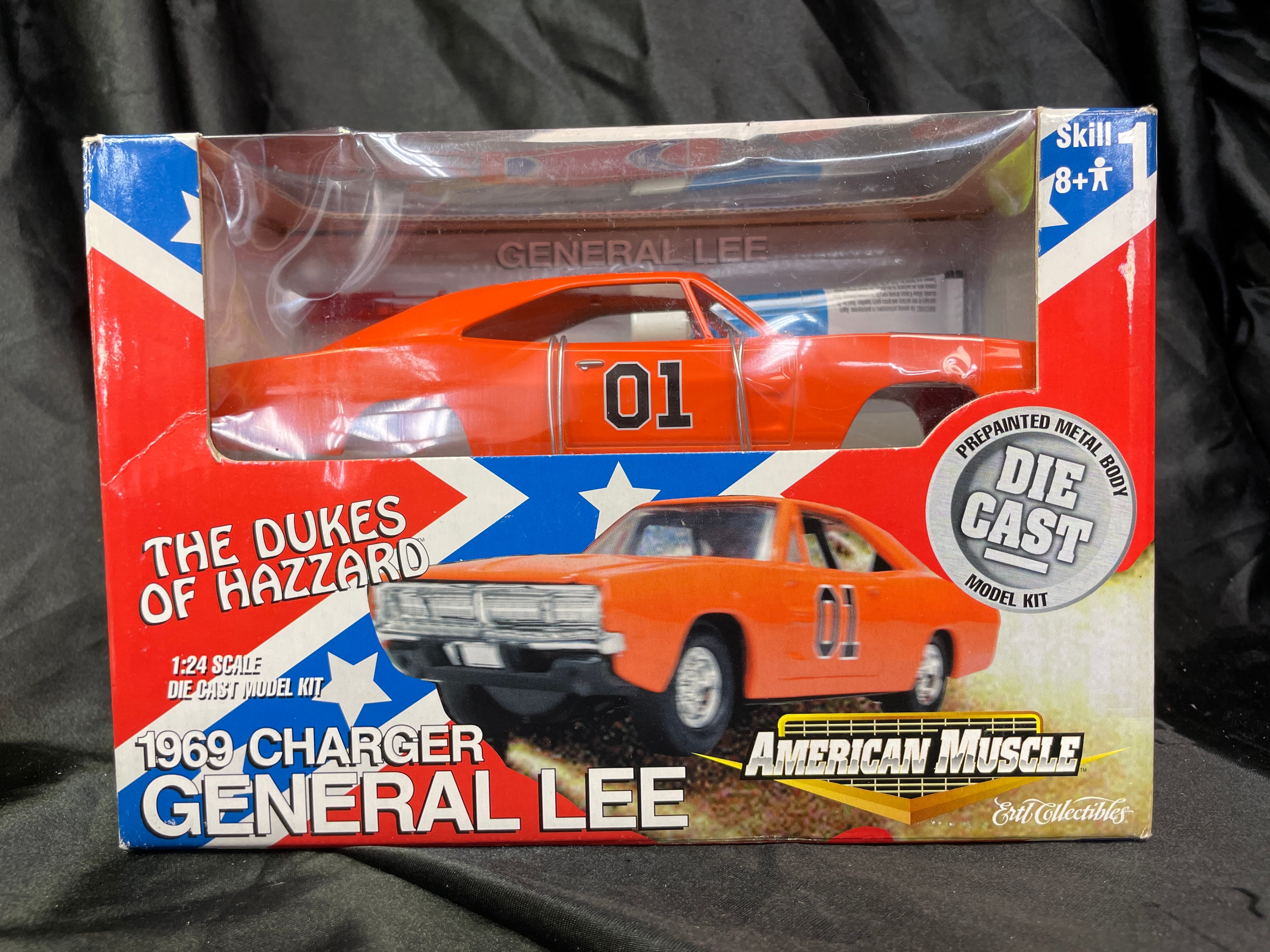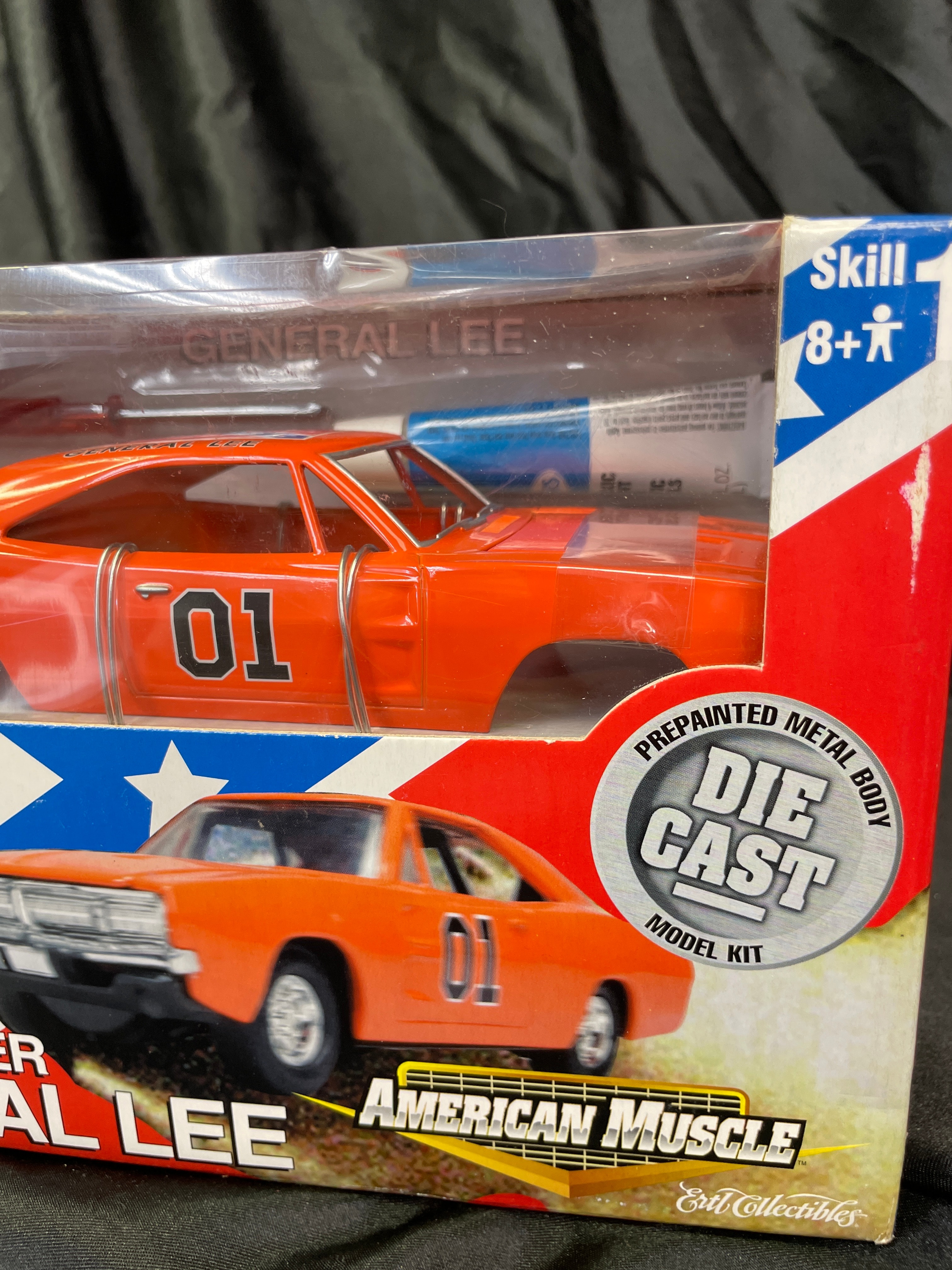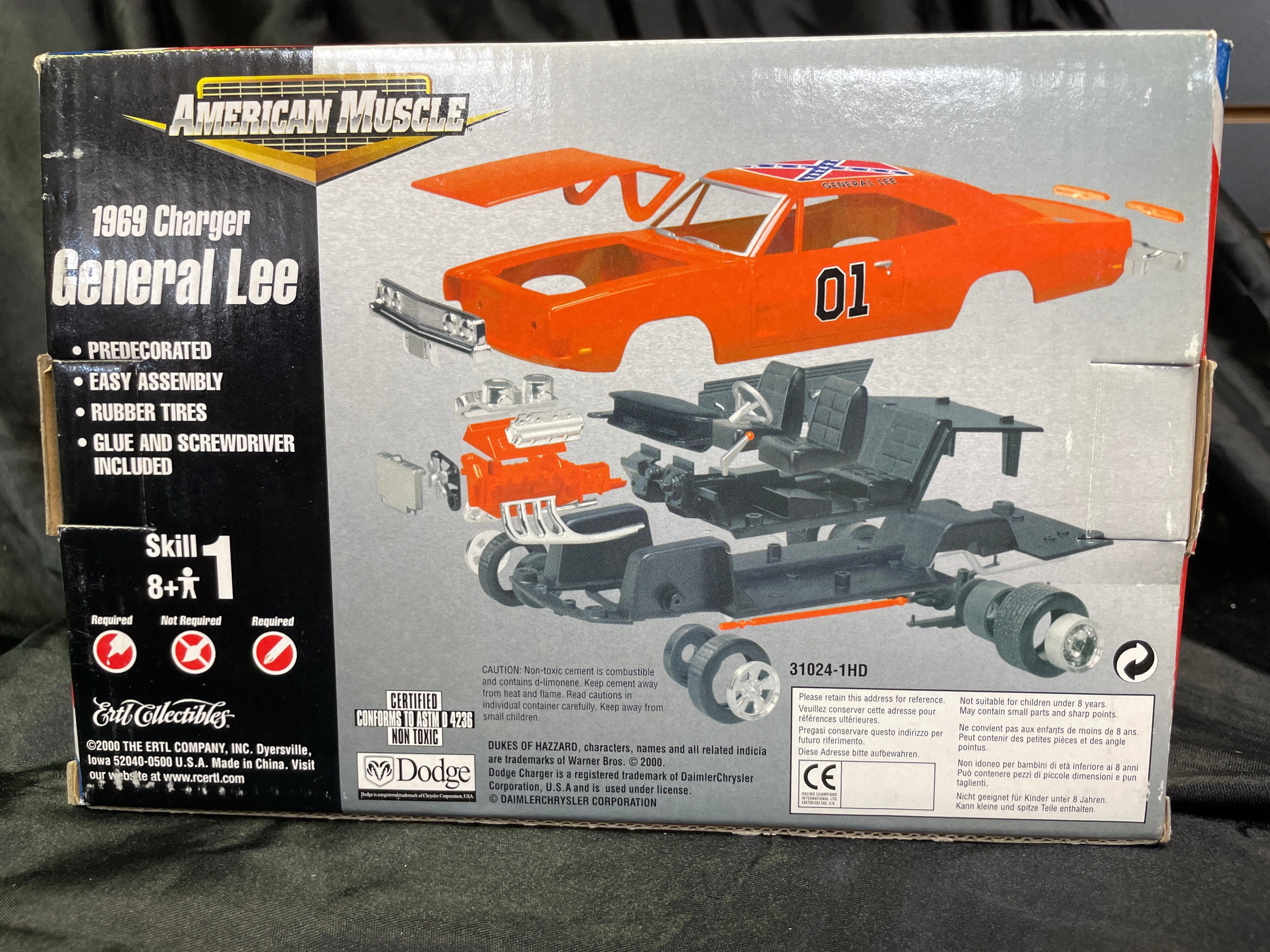 An Ertl Collectibles ‘The Dukes of Hazzard’ General Lee 1969 Dodge Charger 1:24 Scale Die-Cast Model Kit, Model 7967, produced in 2000 under the “American Muscle CustomShop” line. This new-in-box kit features a prepainted orange metal body with “01” on the doors and a prominent Confederate flag decal on the roof, replicating the iconic vehicle’s design. The packaging specifies “PREPAINTED METAL BODY, ” “DIE CAST MODEL KIT, ” “RUBBER TIRES, ” and “FULLY DECORATED.” Glue and a screwdriver are included for “EASY ASSEMBLY” for “Skill 8+^.” The packaging also includes multi-language safety warnings.