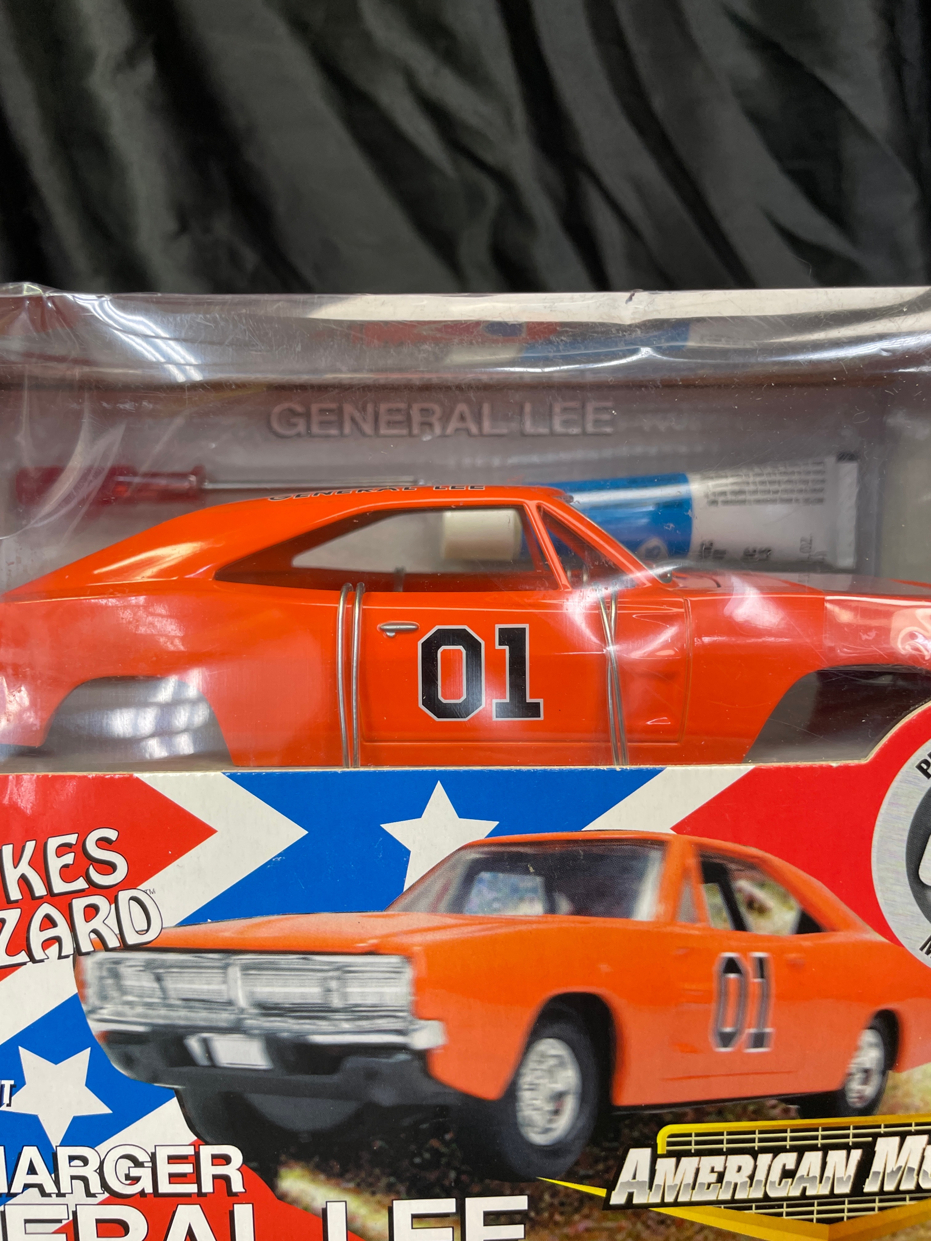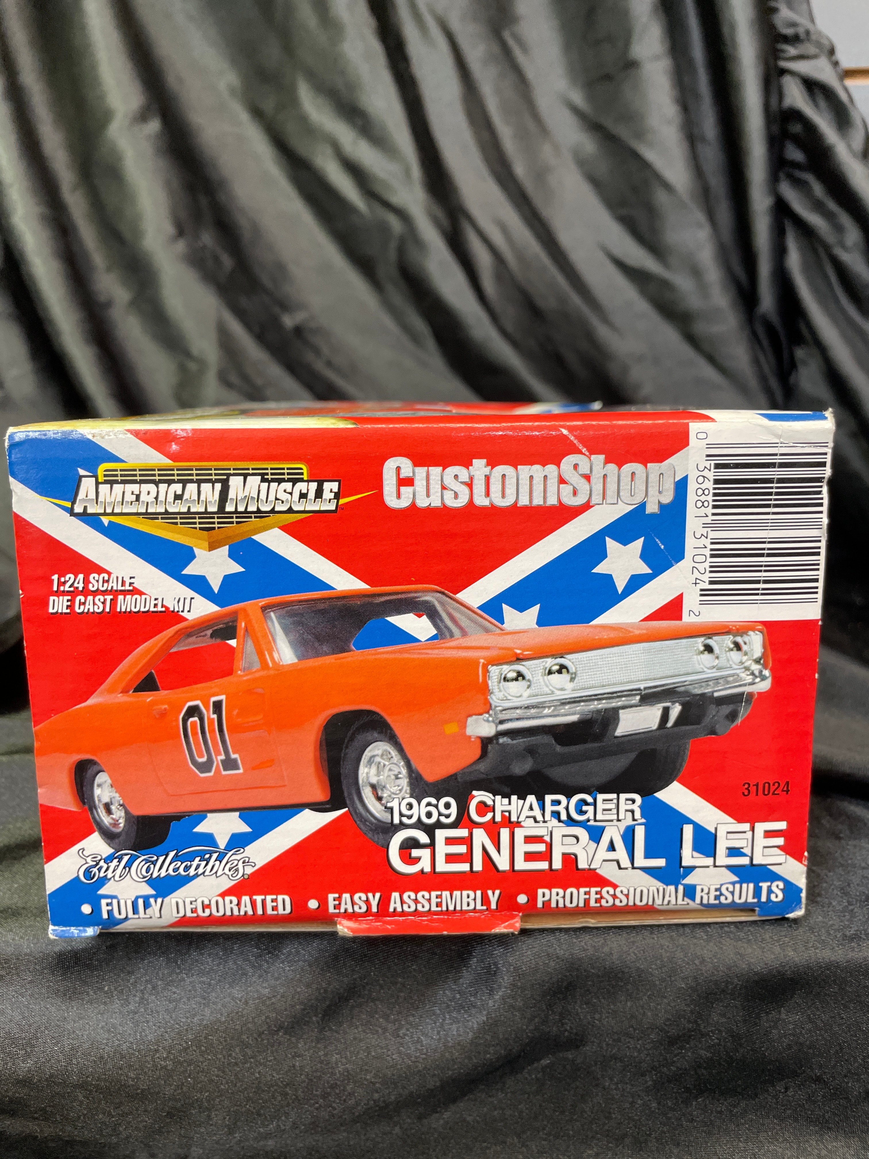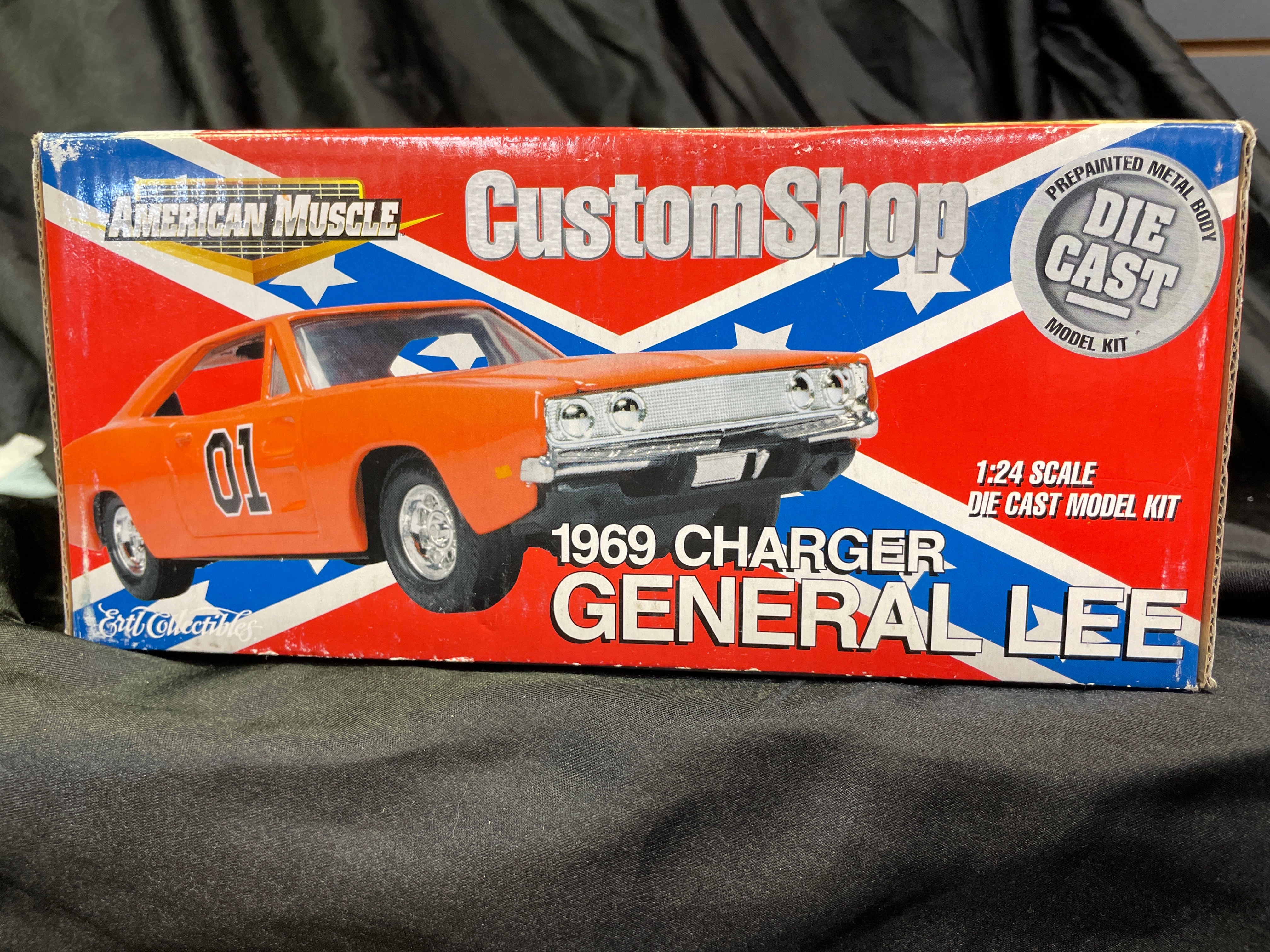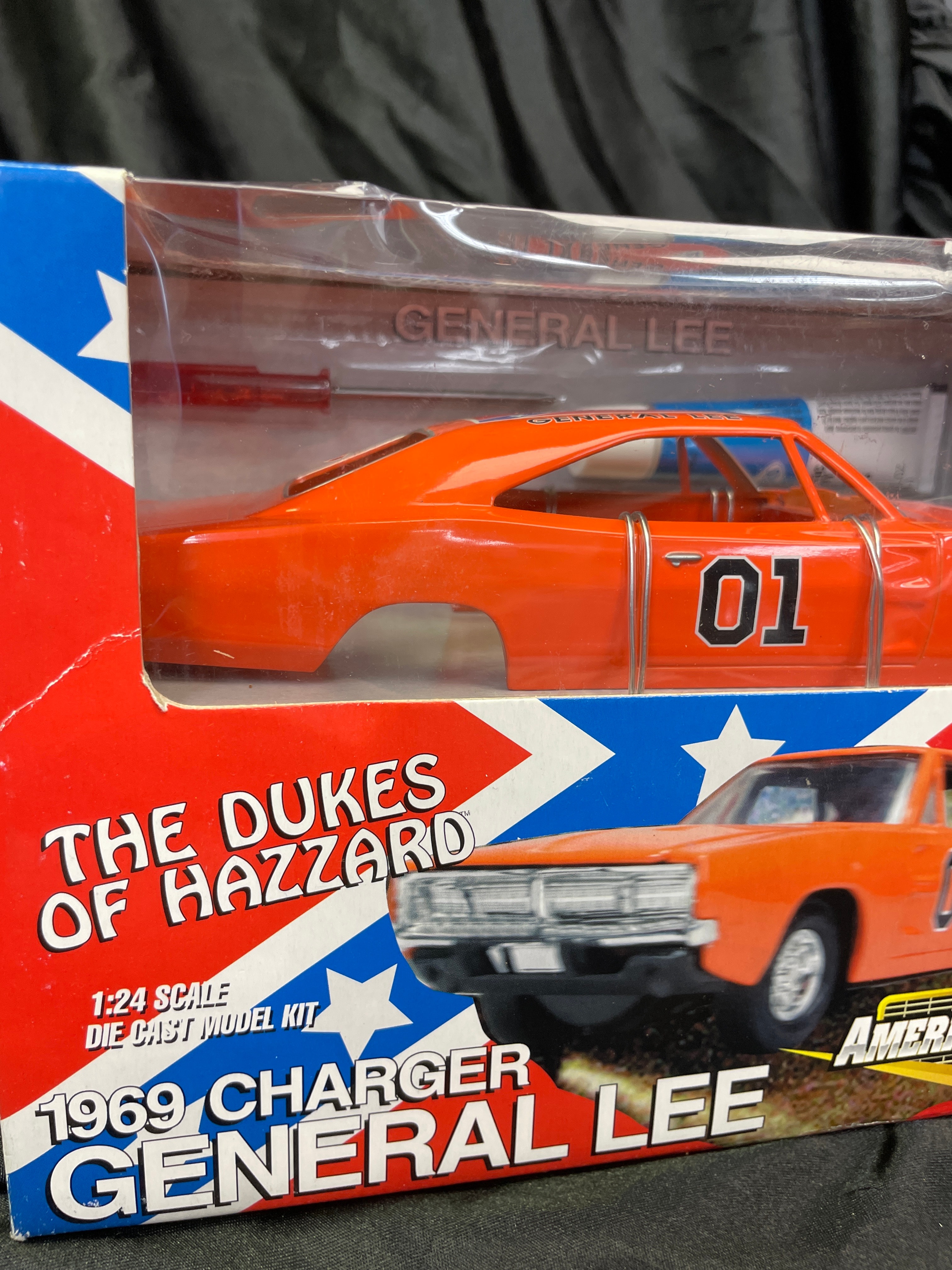 An Ertl Collectibles ‘The Dukes of Hazzard’ General Lee 1969 Dodge Charger 1:24 Scale Die-Cast Model Kit, Model 7967, produced in 2000 under the “American Muscle CustomShop” line. This new-in-box kit features a prepainted orange metal body with “01” on the doors and a prominent Confederate flag decal on the roof, replicating the iconic vehicle’s design. The packaging specifies “PREPAINTED METAL BODY, ” “DIE CAST MODEL KIT, ” “RUBBER TIRES, ” and “FULLY DECORATED.” Glue and a screwdriver are included for “EASY ASSEMBLY” for “Skill 8+^.” The packaging also includes multi-language safety warnings.