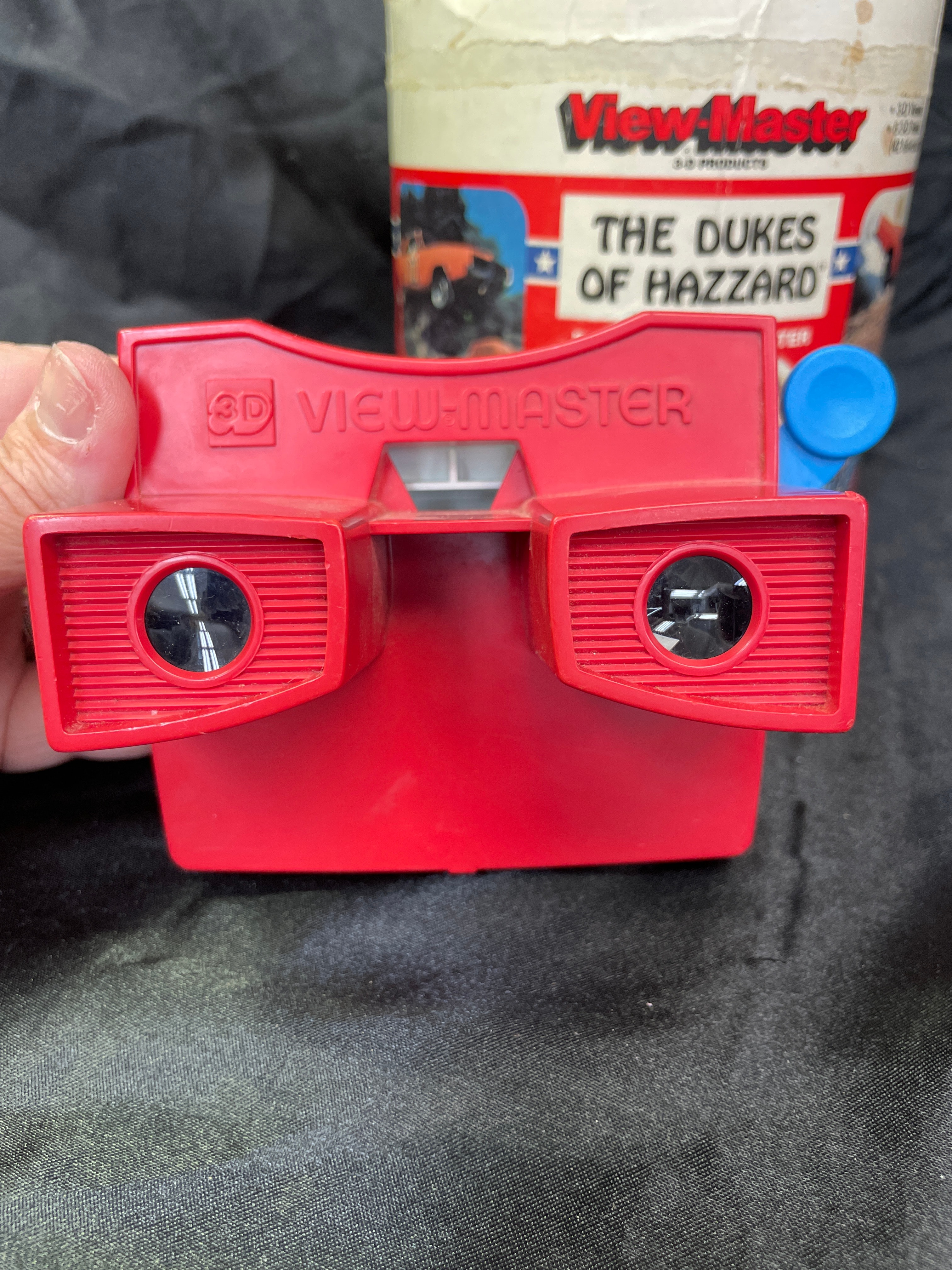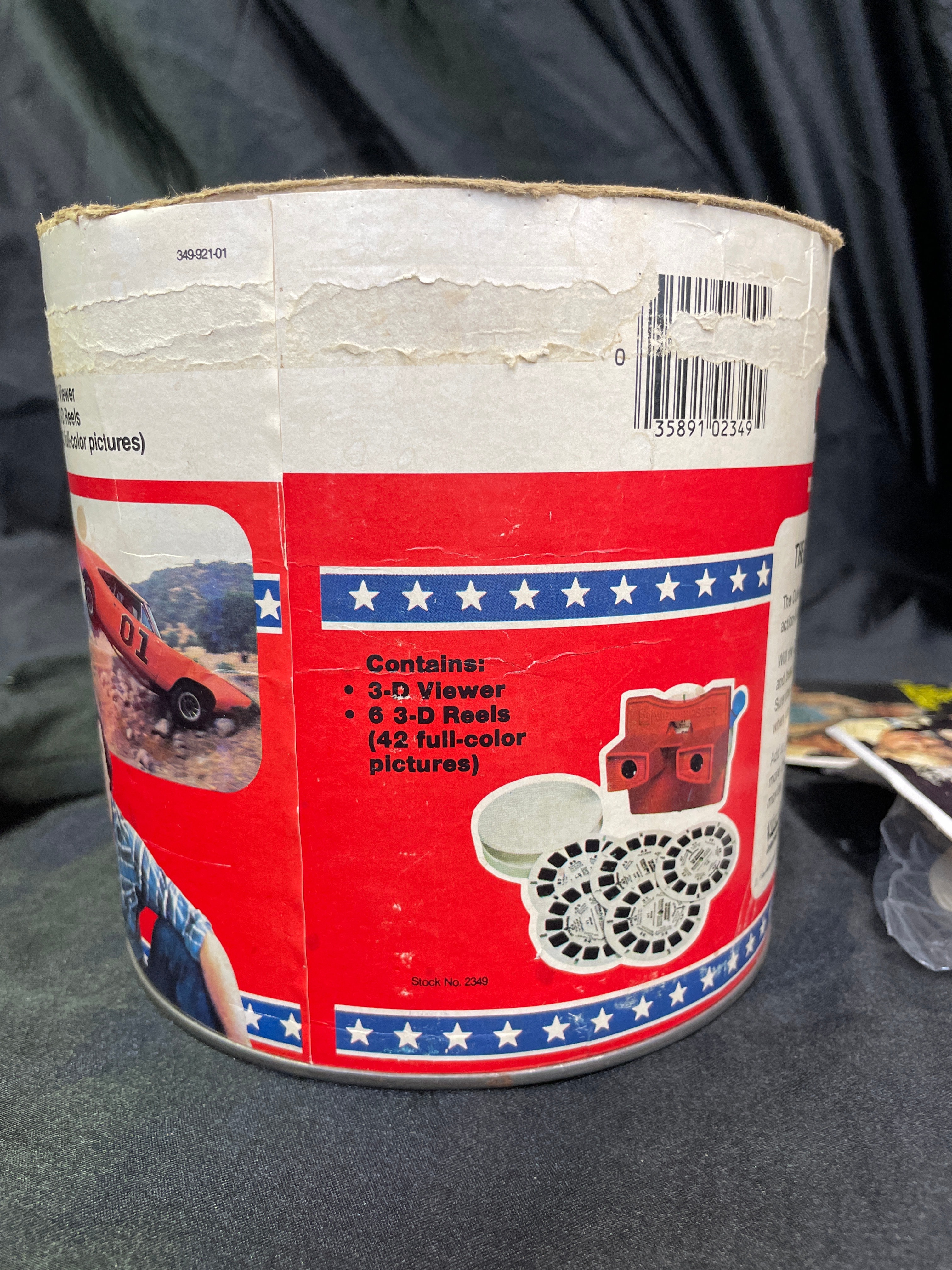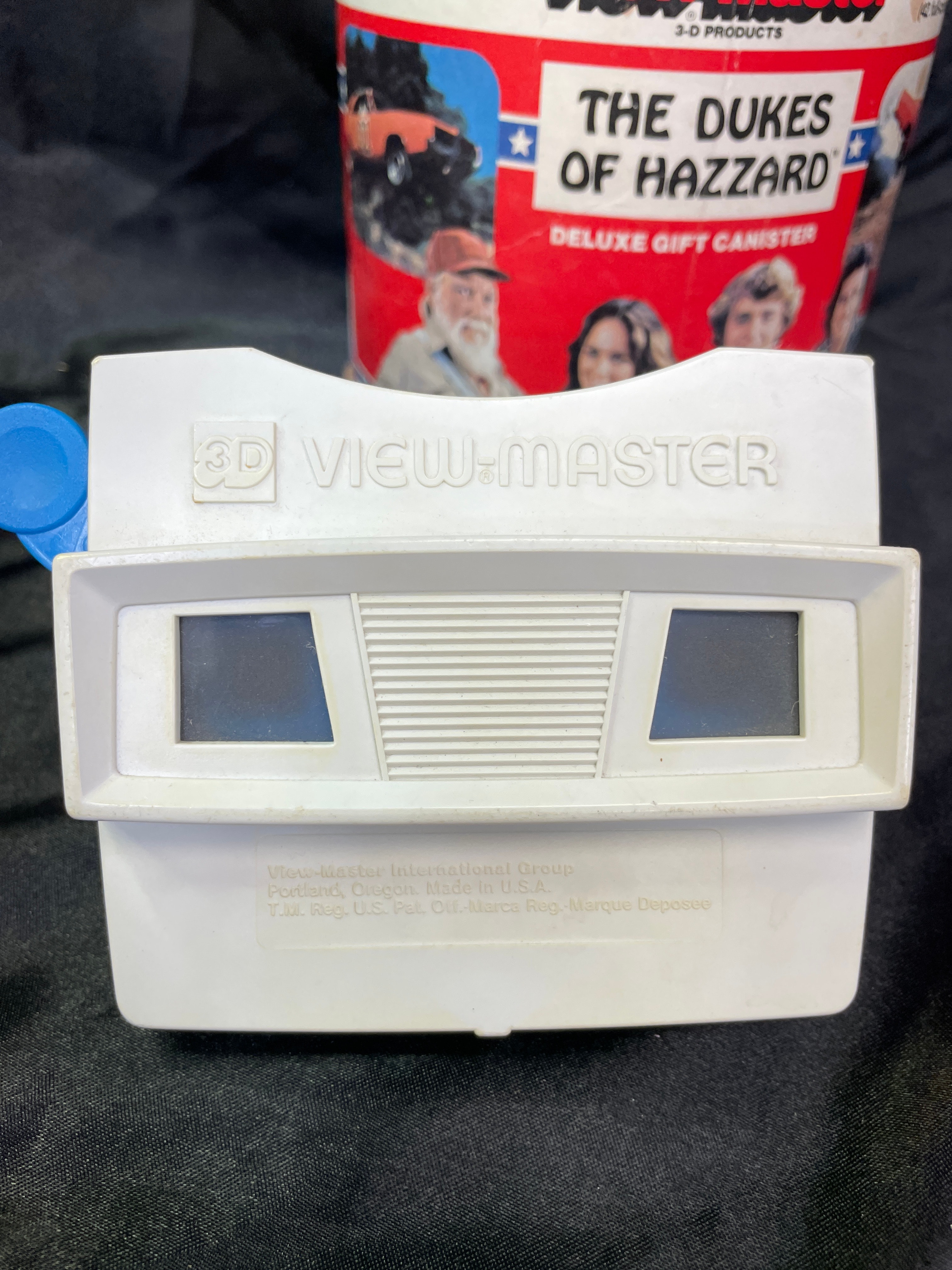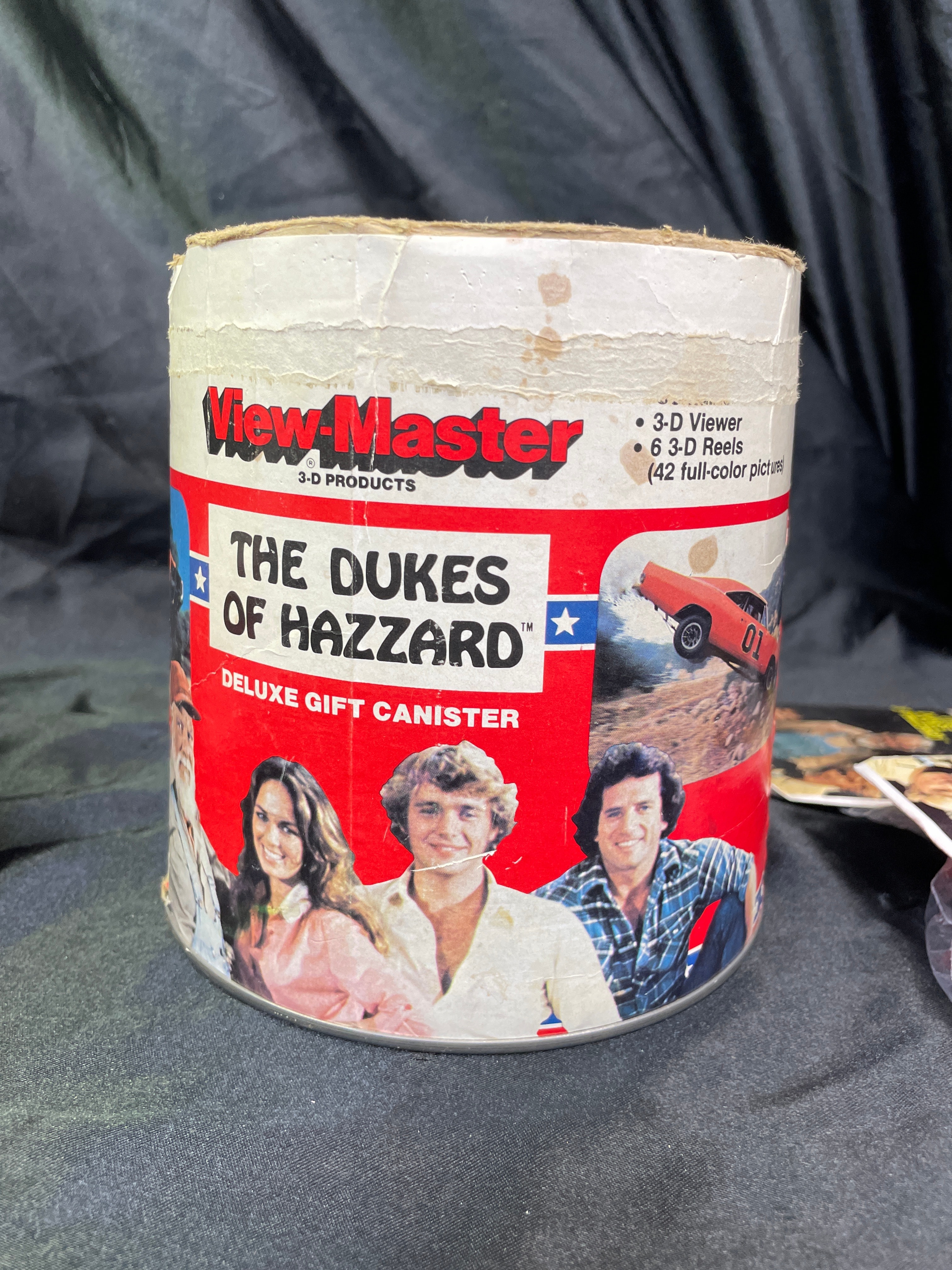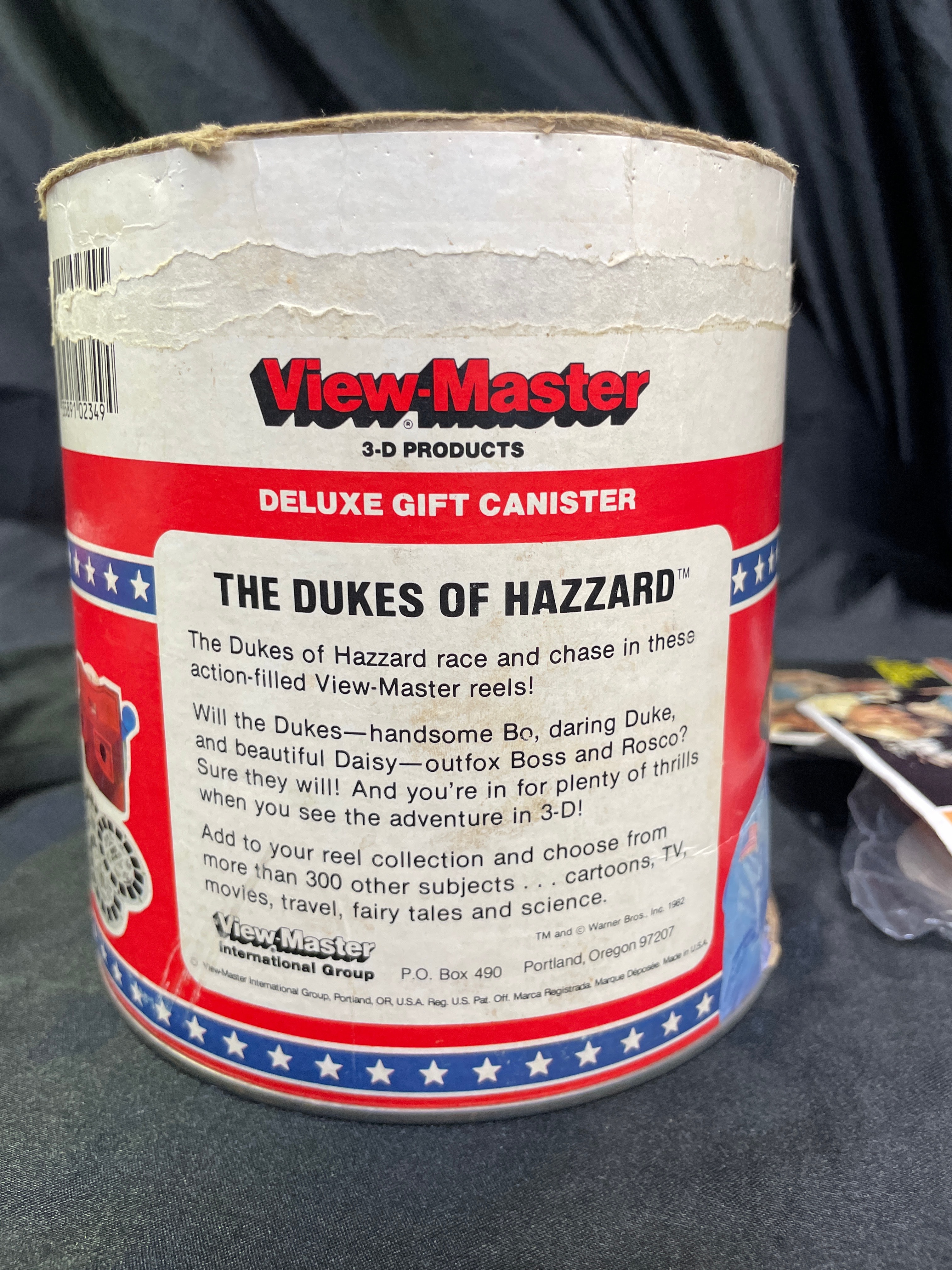 A 1982 View-Master ‘The Dukes of Hazzard’ Deluxe Gift Canister. This cylindrical cardboard canister, originally intended to hold a 3-D Viewer and 6 3-D Reels, features ‘The Dukes of Hazzard’ branding (© Warner Bros., Inc. 1982). Accompanying the canister are two plastic View-Master 3D viewers; one white with a blue button, marked ‘View-Master International Group Portland, Oregon Made in U.S.A.’, and one red with a blue button. The collection further includes three GAF ‘SHOWTIME’ ‘The Dukes of Hazzard’ 3D picture packets (© Warner Bros., Inc. 1980), each designed to contain three reels and an illustrated booklet. Several loose View-Master reels are present, including one for ‘The Dukes of Hazzard’ and another titled ‘JOE FORRESTER An NBC Television Series: The Boy Next Door’ (© 1976 Columbia Pictures Industries Inc.). A white plastic View-Master brand reel storage lid completes the lot.