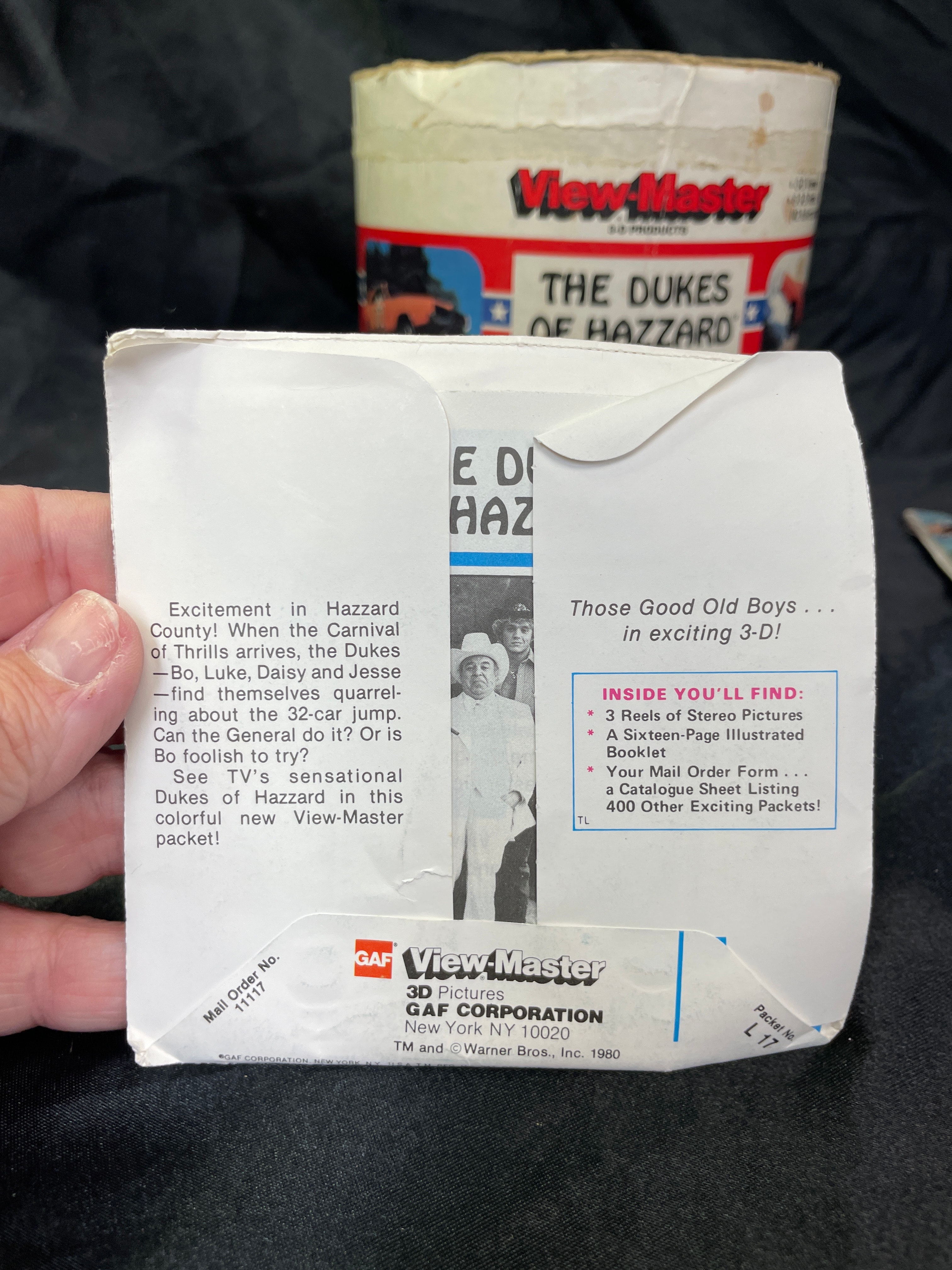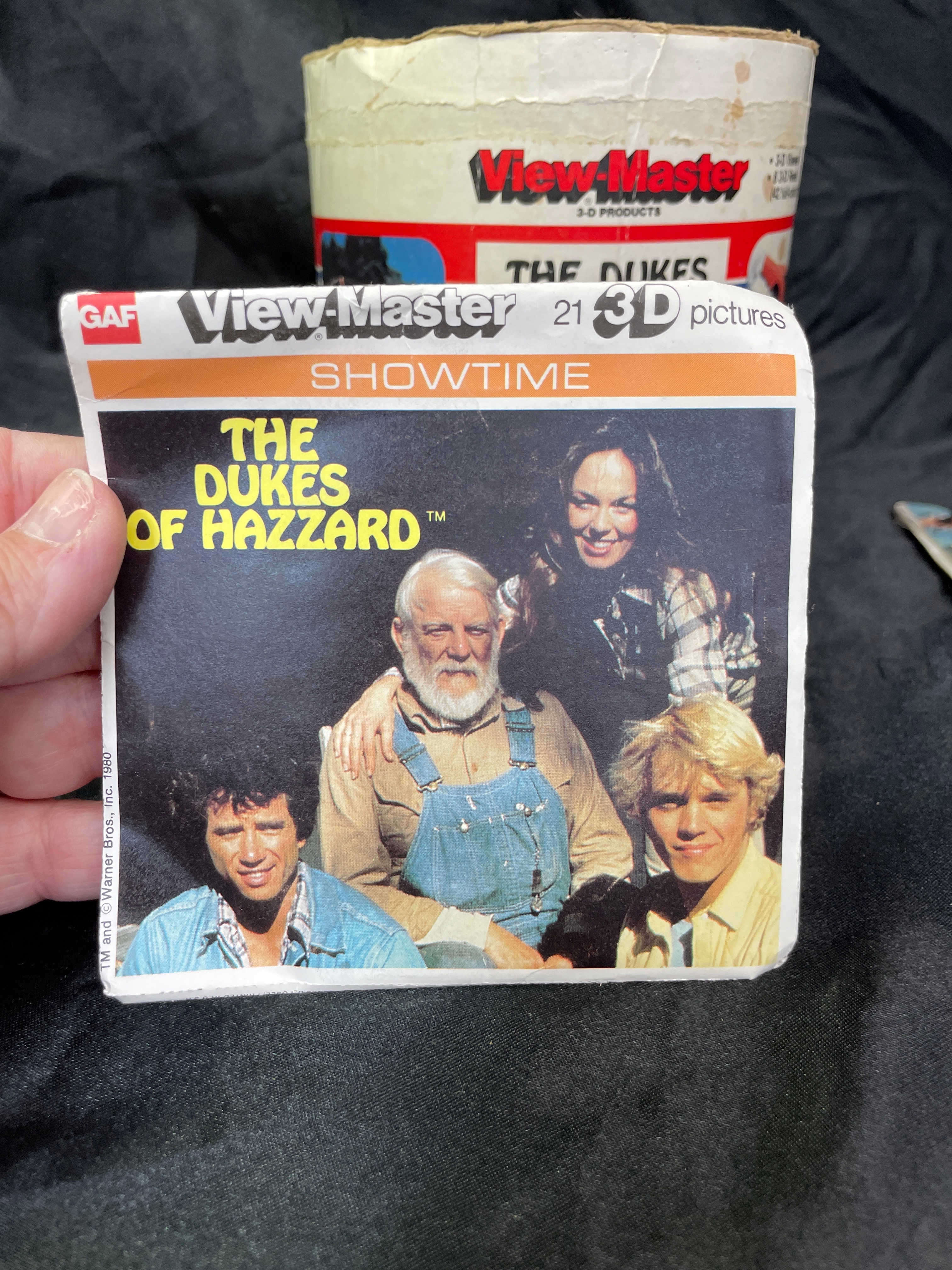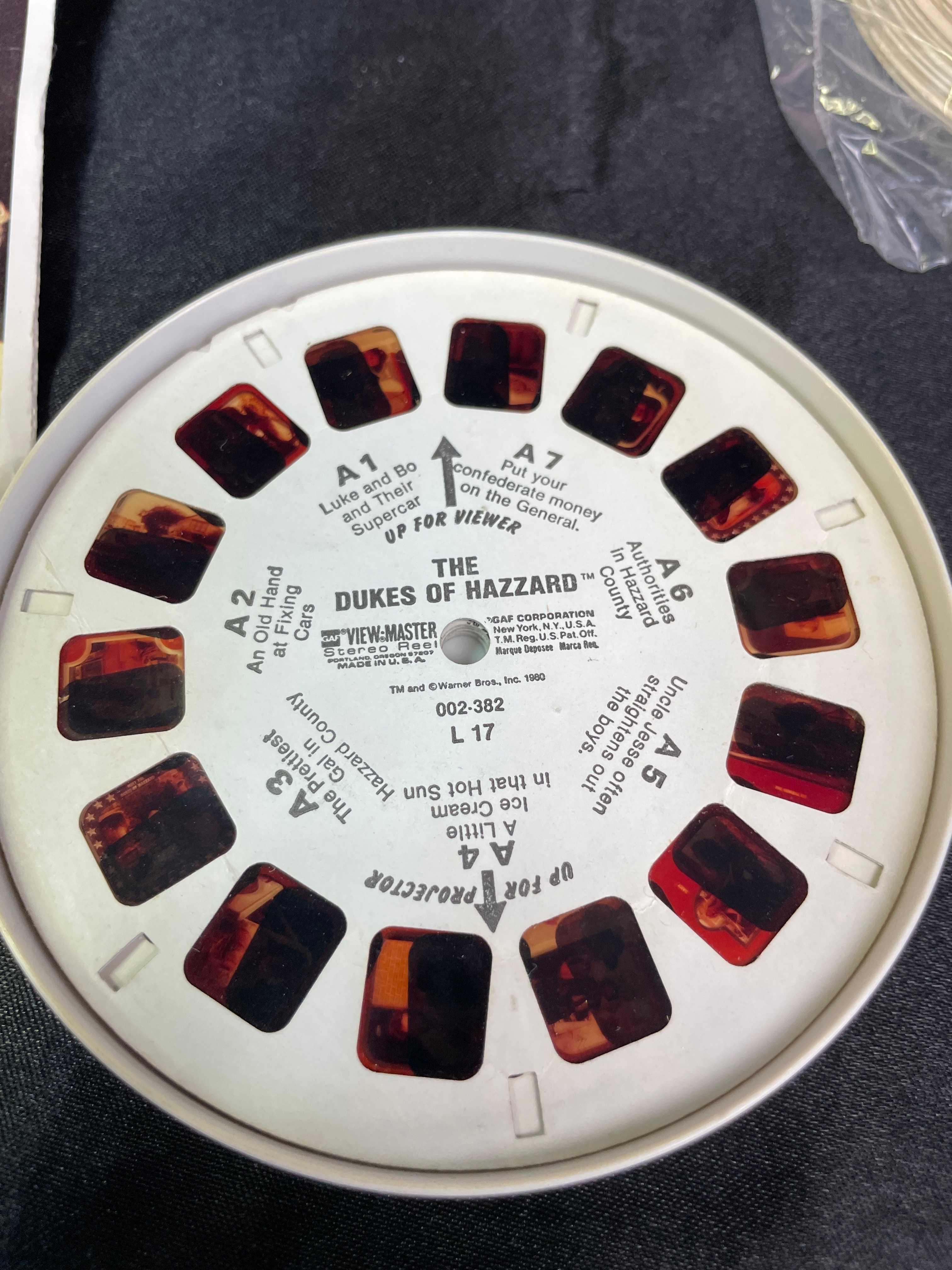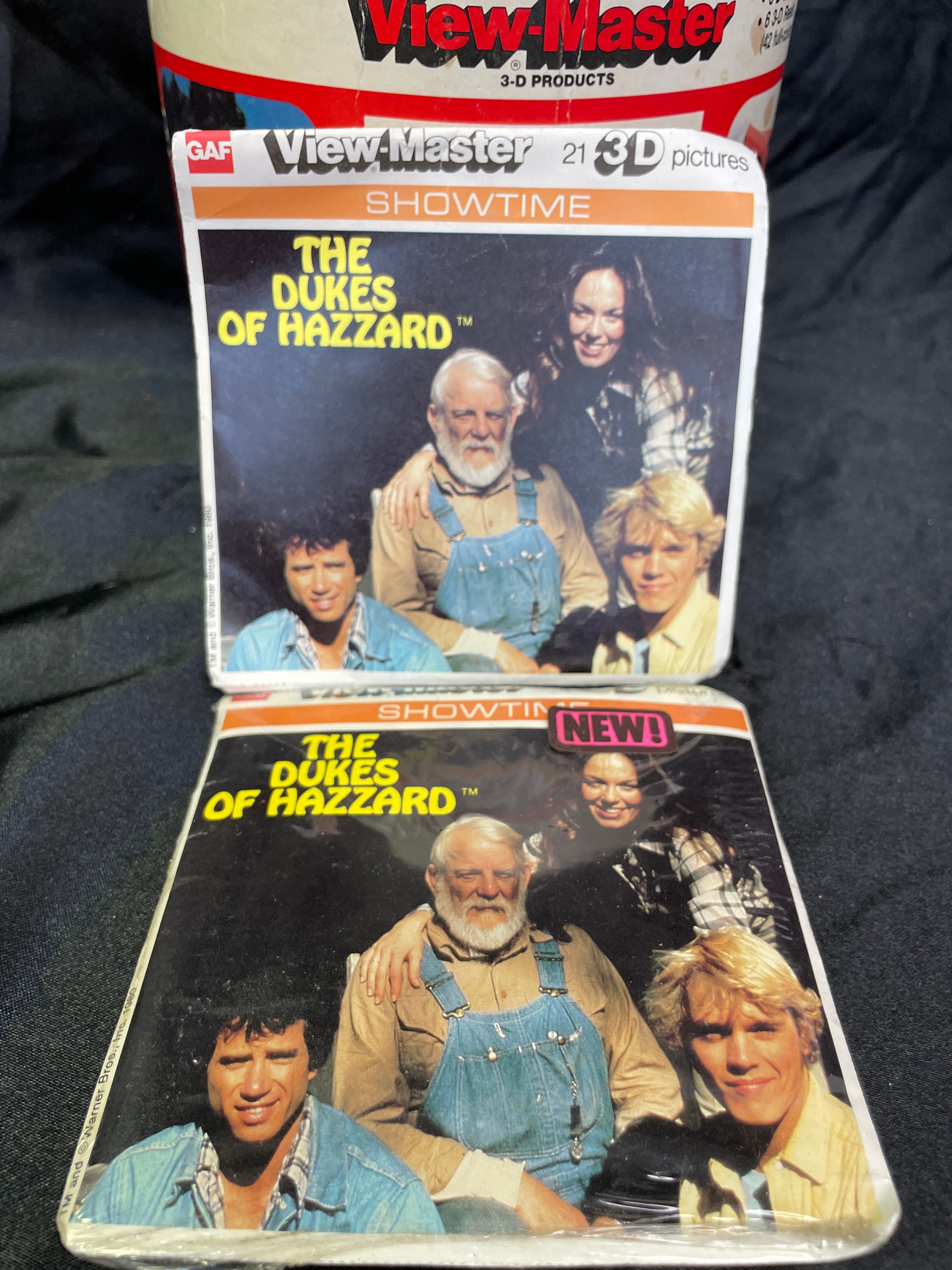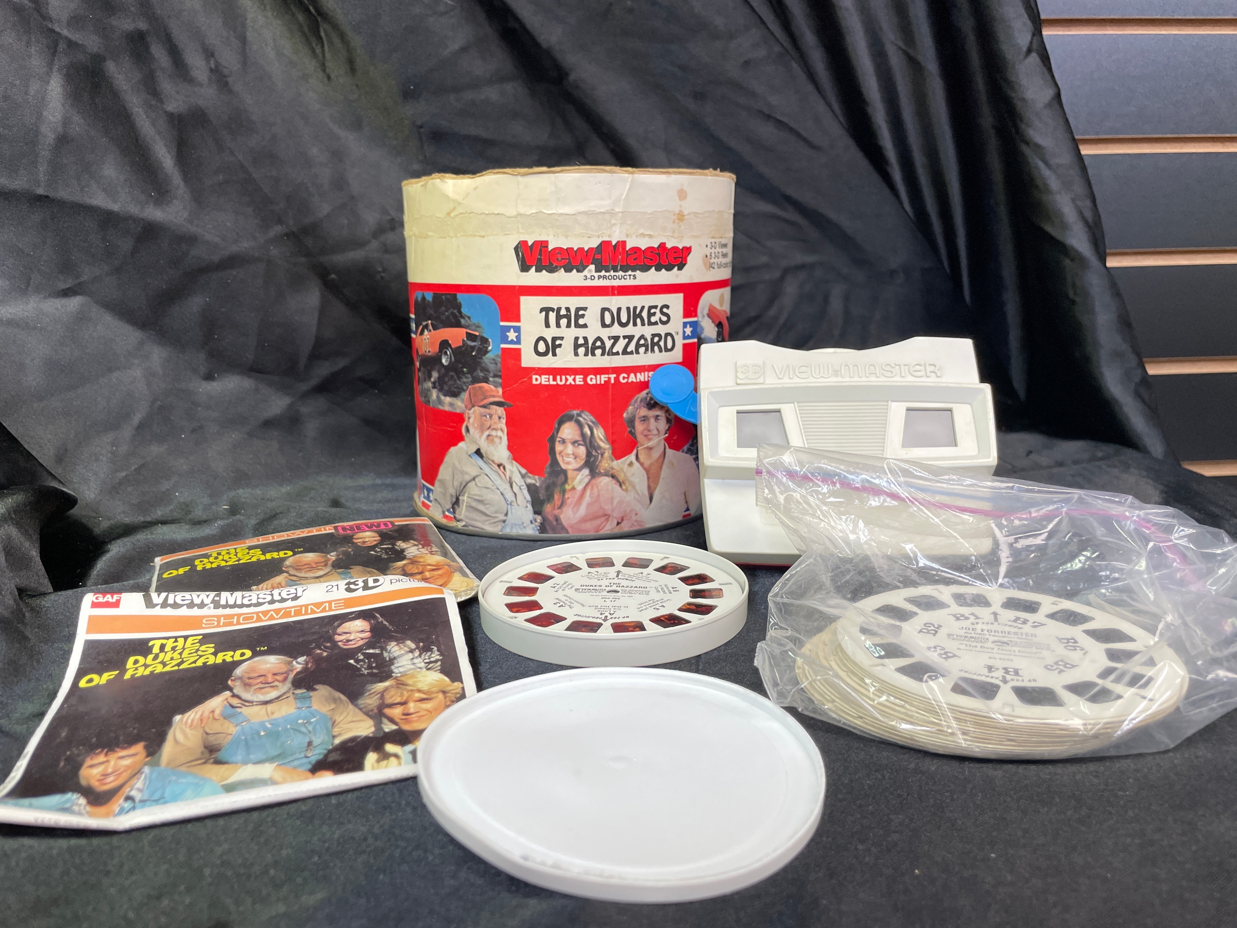 A 1982 View-Master ‘The Dukes of Hazzard’ Deluxe Gift Canister. This cylindrical cardboard canister, originally intended to hold a 3-D Viewer and 6 3-D Reels, features ‘The Dukes of Hazzard’ branding (© Warner Bros., Inc. 1982). Accompanying the canister are two plastic View-Master 3D viewers; one white with a blue button, marked ‘View-Master International Group Portland, Oregon Made in U.S.A.’, and one red with a blue button. The collection further includes three GAF ‘SHOWTIME’ ‘The Dukes of Hazzard’ 3D picture packets (© Warner Bros., Inc. 1980), each designed to contain three reels and an illustrated booklet. Several loose View-Master reels are present, including one for ‘The Dukes of Hazzard’ and another titled ‘JOE FORRESTER An NBC Television Series: The Boy Next Door’ (© 1976 Columbia Pictures Industries Inc.). A white plastic View-Master brand reel storage lid completes the lot.