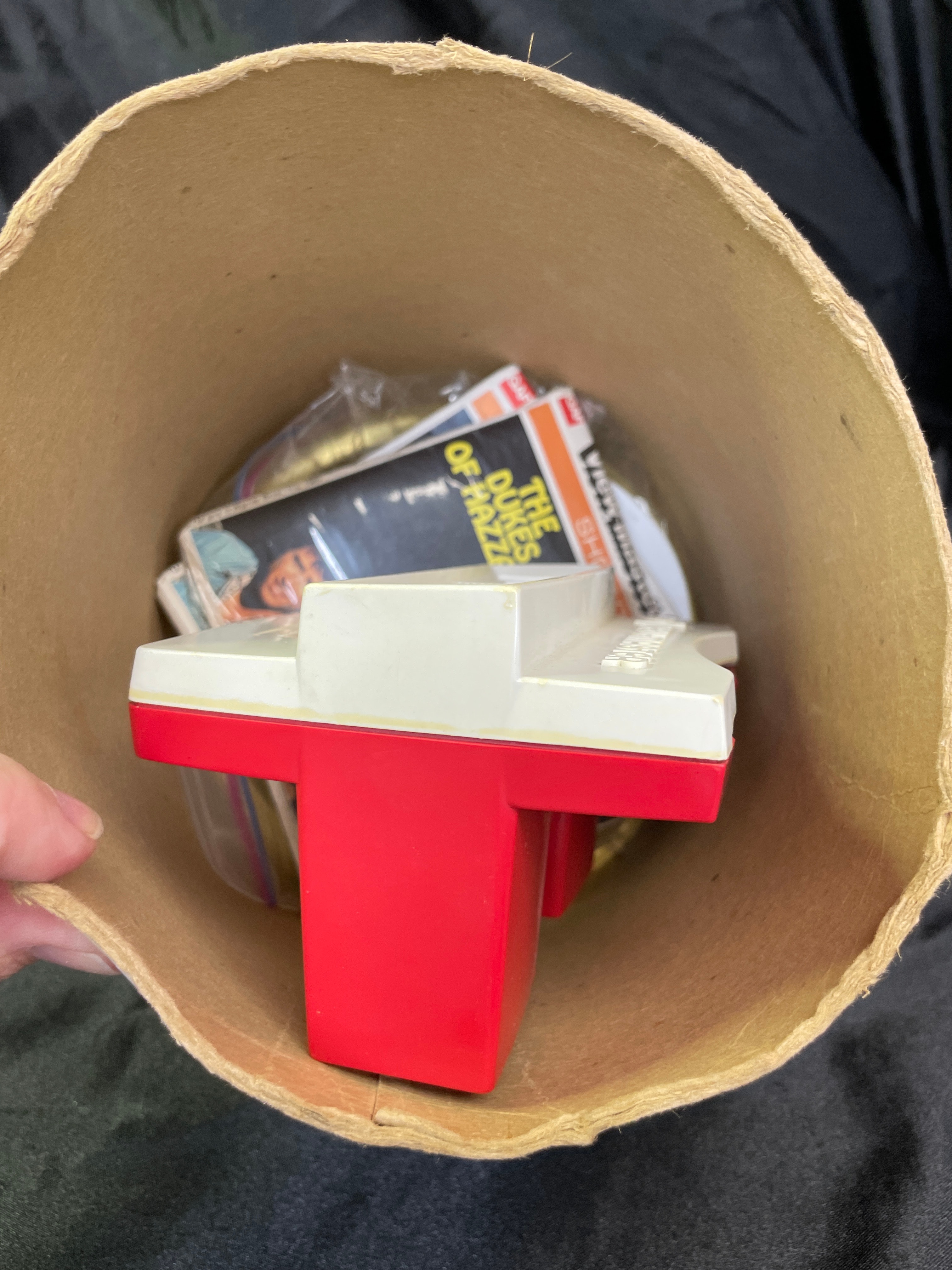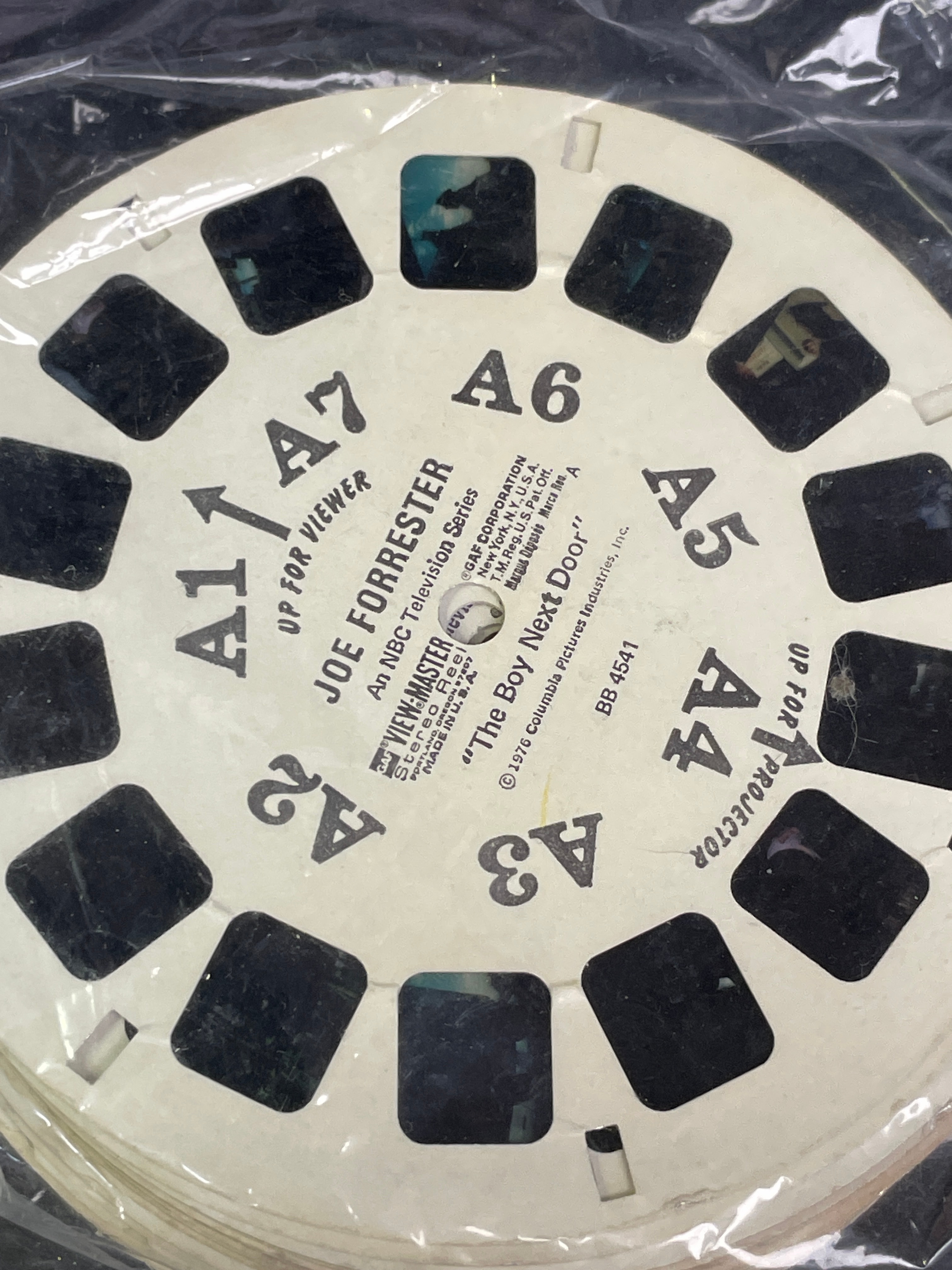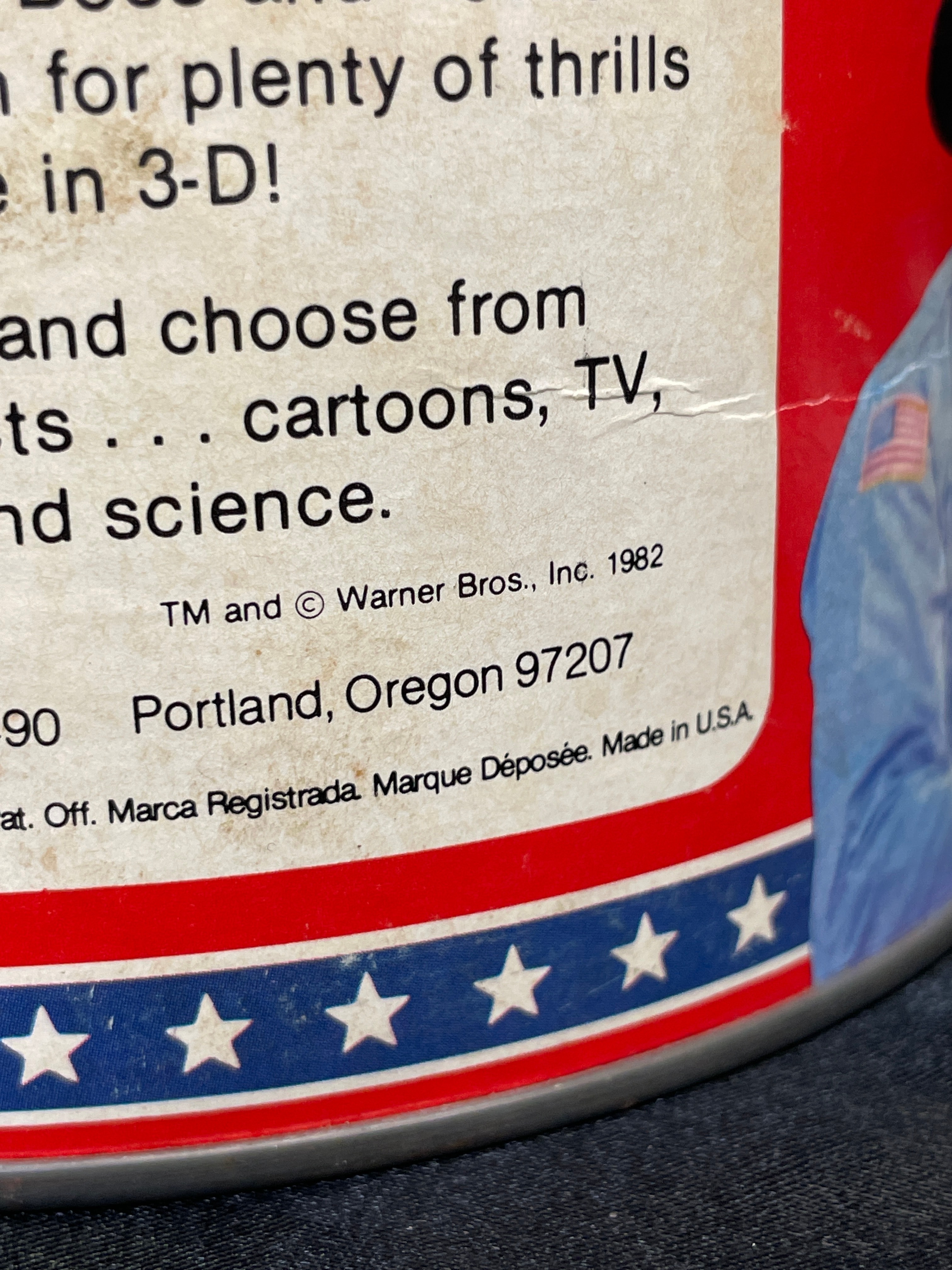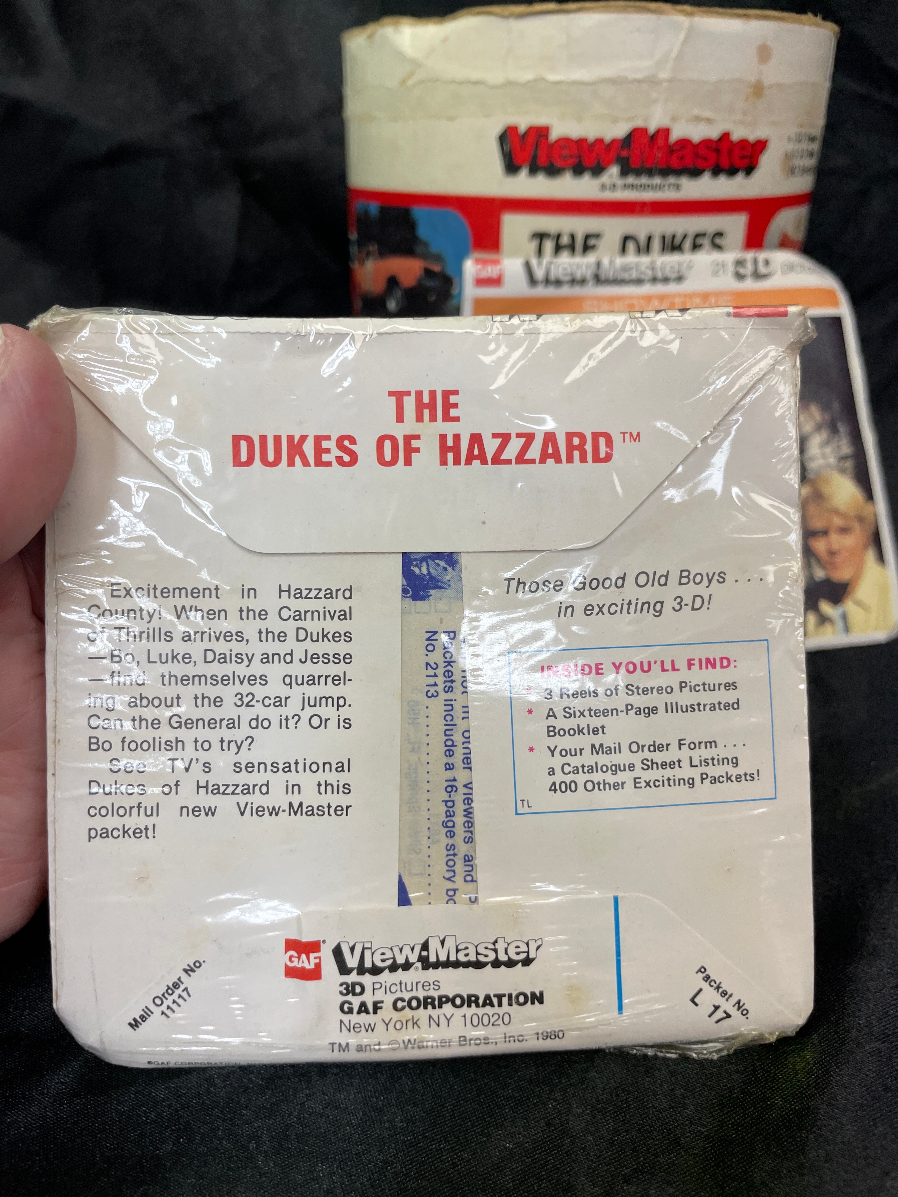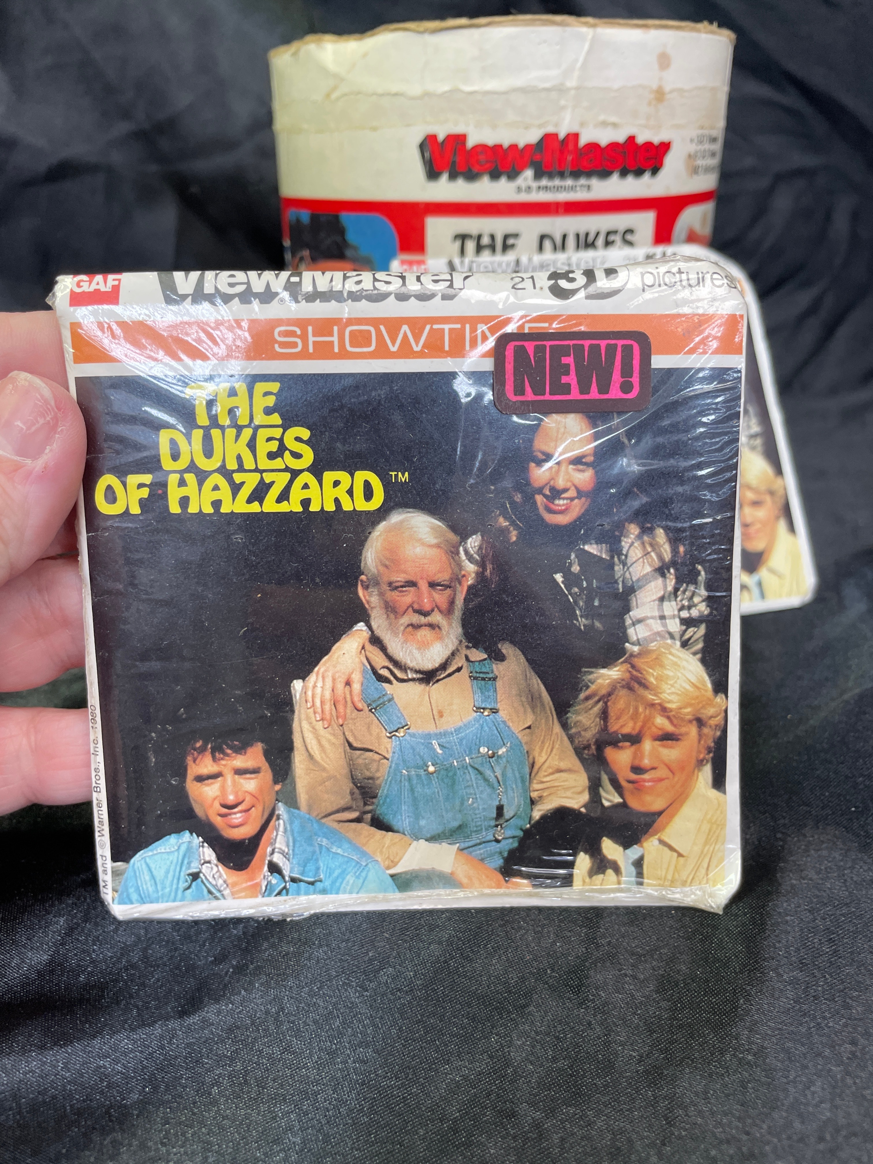 A 1982 View-Master ‘The Dukes of Hazzard’ Deluxe Gift Canister. This cylindrical cardboard canister, originally intended to hold a 3-D Viewer and 6 3-D Reels, features ‘The Dukes of Hazzard’ branding (© Warner Bros., Inc. 1982). Accompanying the canister are two plastic View-Master 3D viewers; one white with a blue button, marked ‘View-Master International Group Portland, Oregon Made in U.S.A.’, and one red with a blue button. The collection further includes three GAF ‘SHOWTIME’ ‘The Dukes of Hazzard’ 3D picture packets (© Warner Bros., Inc. 1980), each designed to contain three reels and an illustrated booklet. Several loose View-Master reels are present, including one for ‘The Dukes of Hazzard’ and another titled ‘JOE FORRESTER An NBC Television Series: The Boy Next Door’ (© 1976 Columbia Pictures Industries Inc.). A white plastic View-Master brand reel storage lid completes the lot.