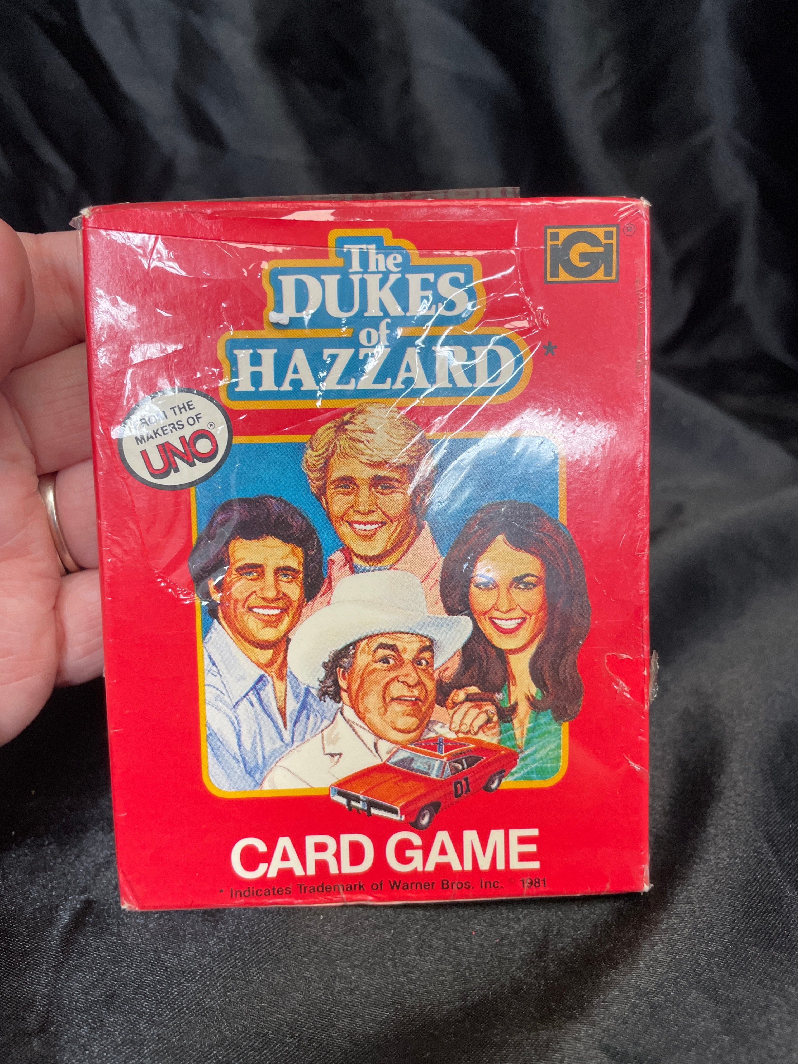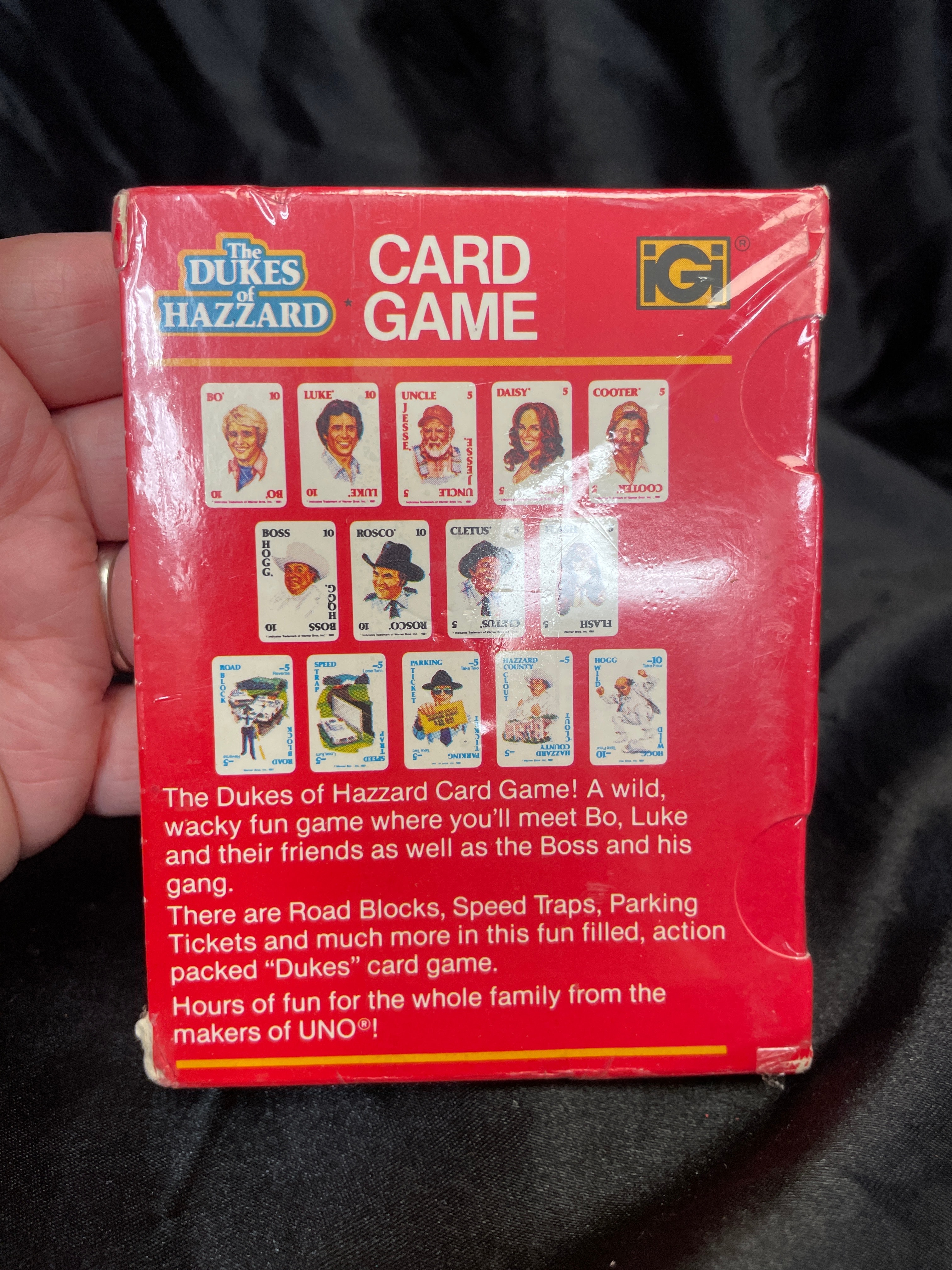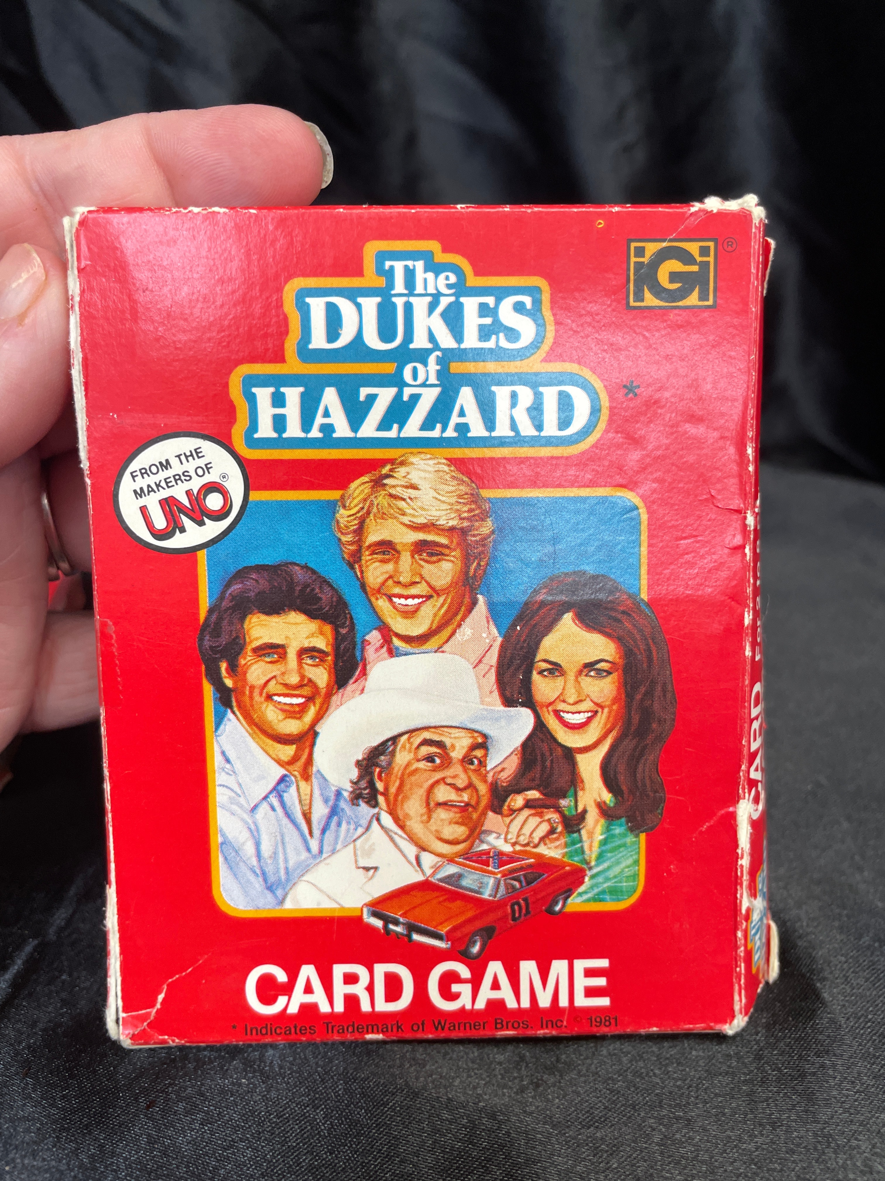 A pair of IGI “The Dukes of Hazzard” card games, dating from 1981. Each game is housed in a red cardboard box featuring illustrations of the television series characters including Bo, Luke, Uncle Jesse, Daisy, and Boss Hogg, alongside a depiction of the General Lee car. The boxes also display the “IGI” logo and are prominently advertised as “FROM THE MAKERS OF UNO.” The playing cards, constructed from paper/card stock, feature character illustrations such as “ROSCO,” “BOSS HOGG,” and “JESSE,” in addition to action cards like “ROAD BLOCK” and “PARKING TICKET.” The visible Warner Bros. Inc. trademark markings confirm the 1981 date.