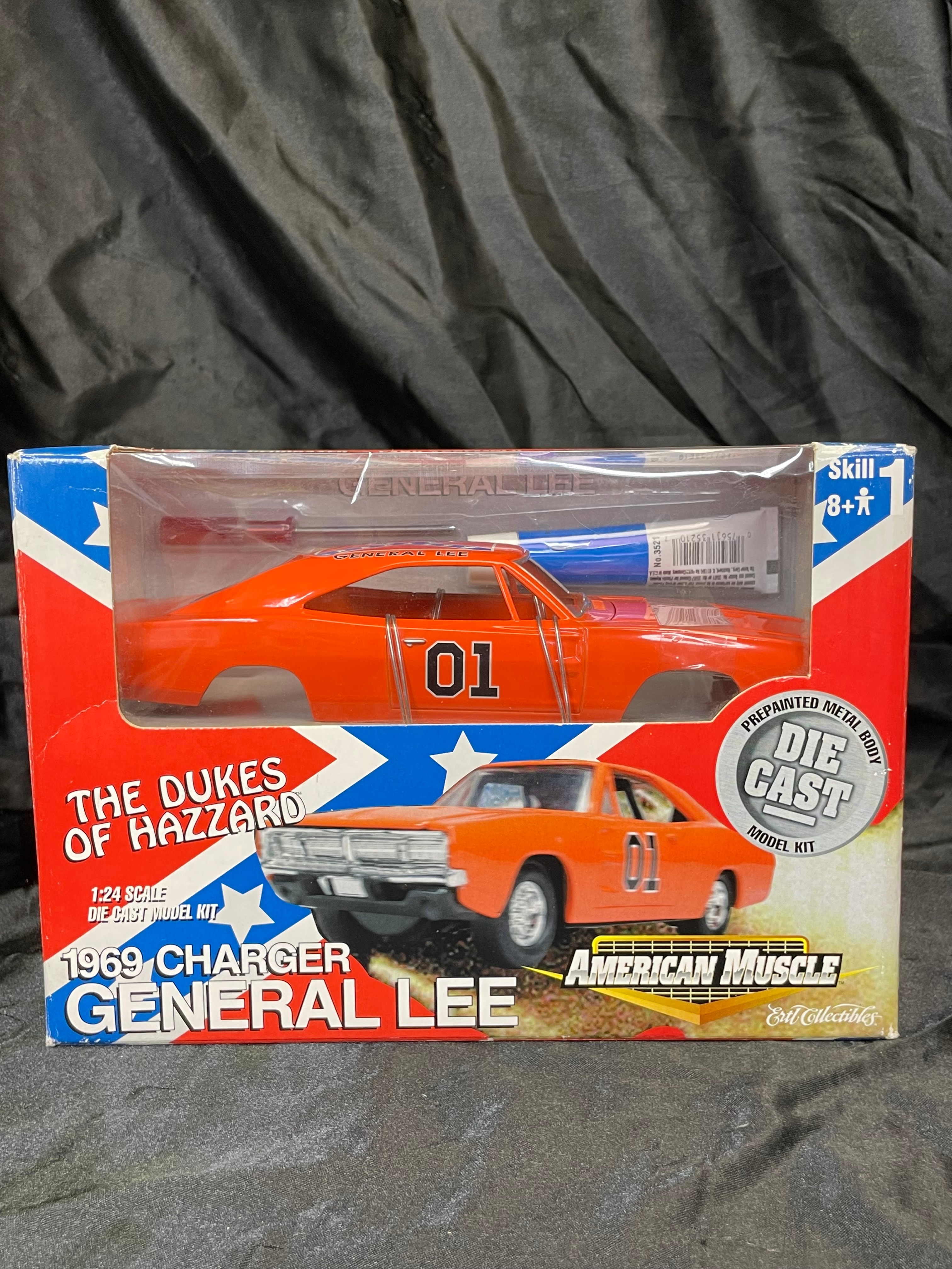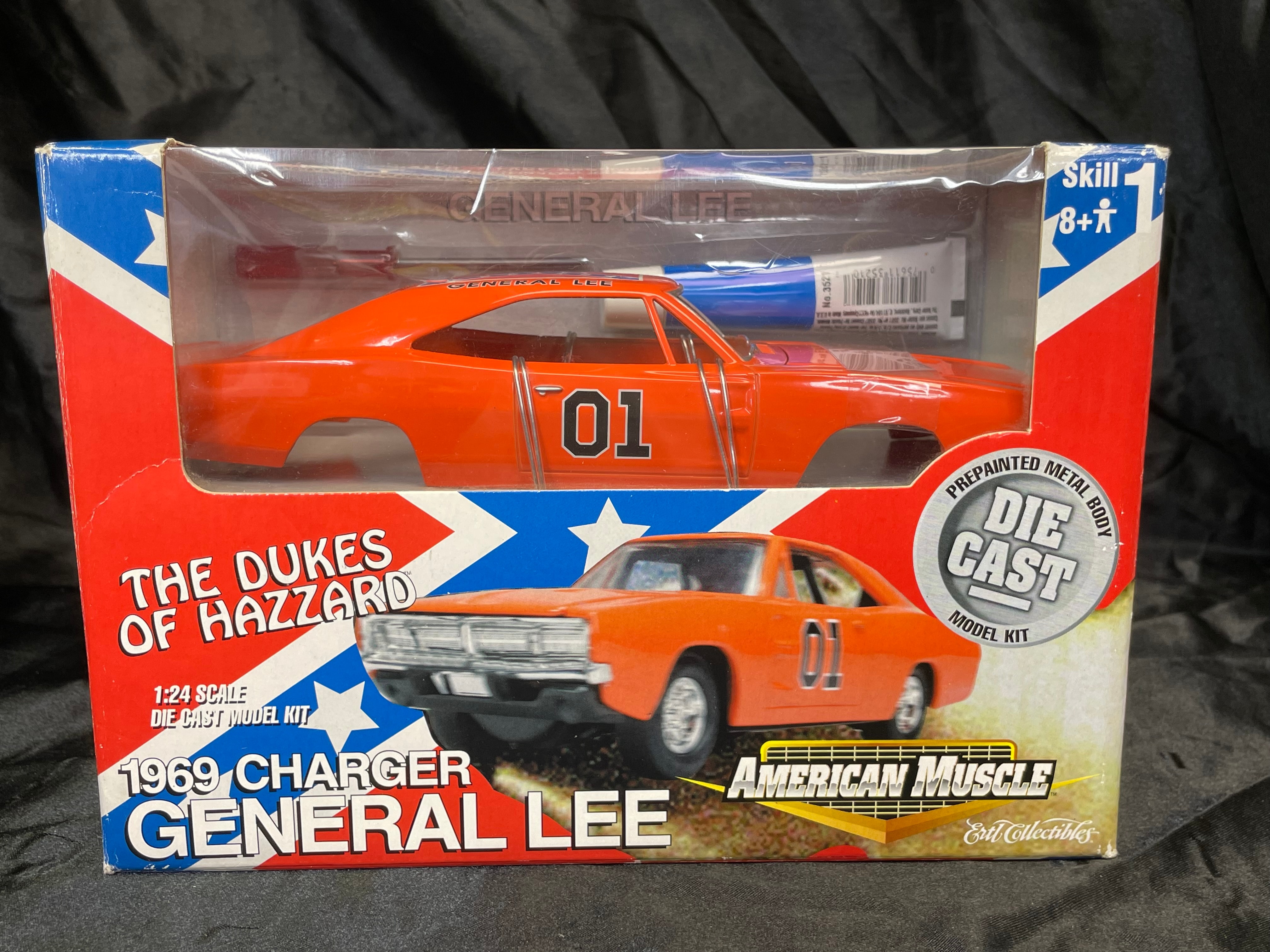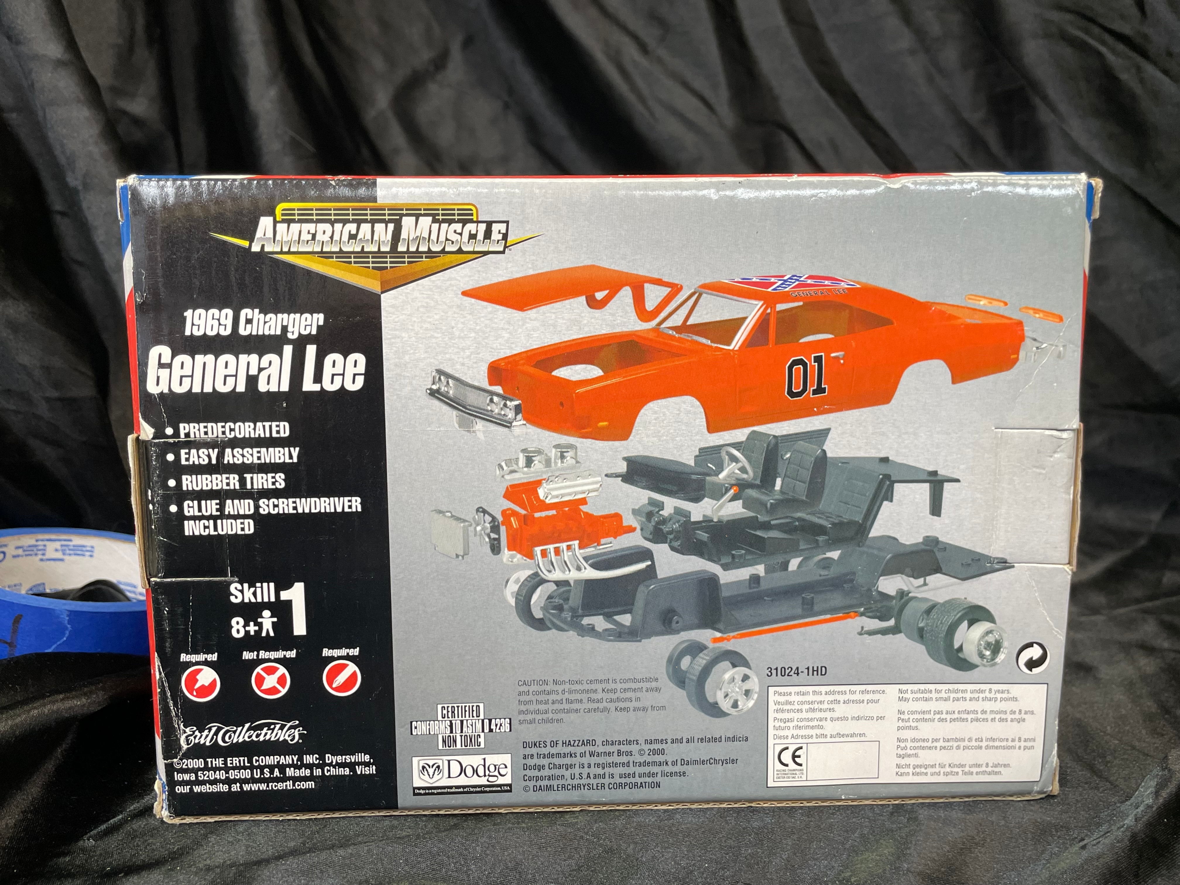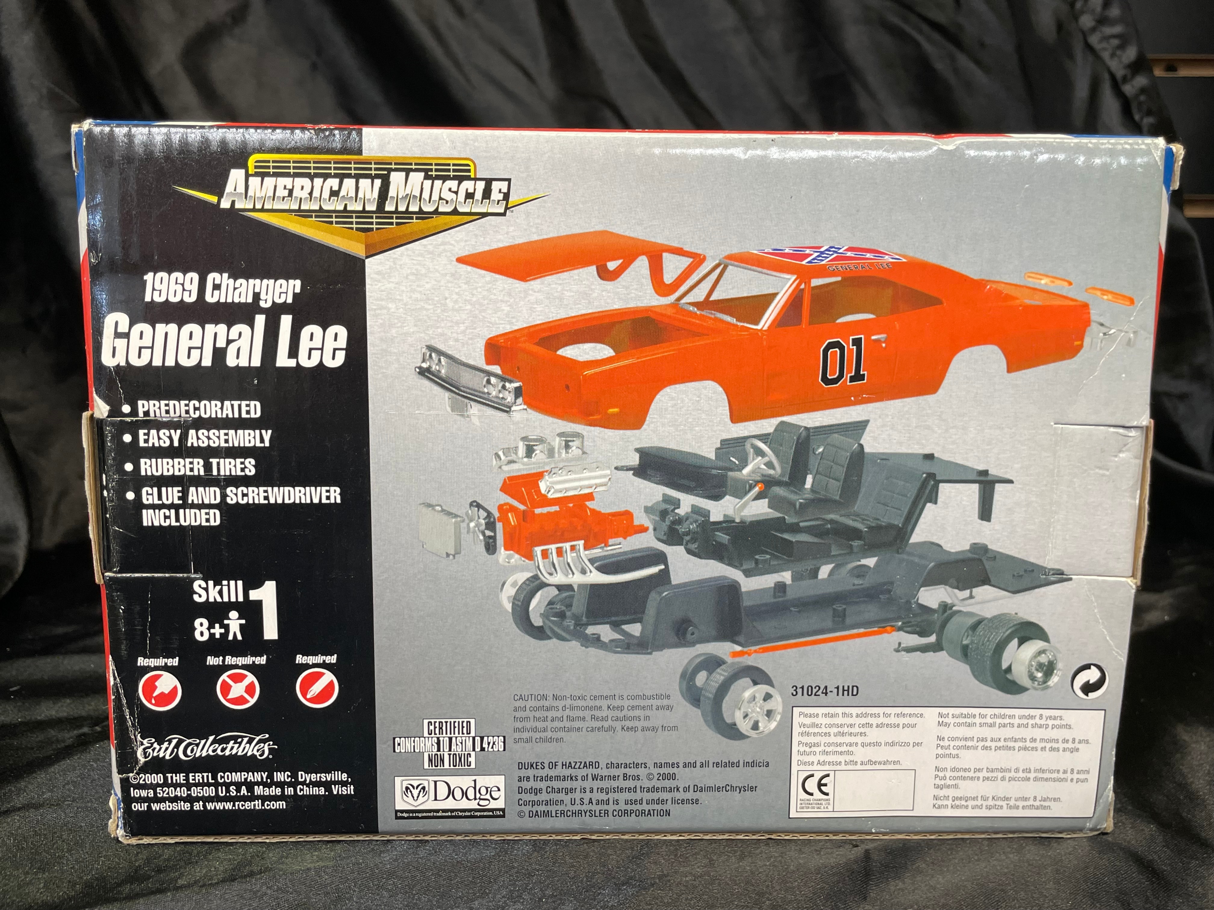 An Ertl Company “American Muscle CustomShop” 1:24 scale die-cast model kit of the 1969 Dodge Charger “General Lee” from “The Dukes of Hazzard, ” produced in 2000. The kit features a pre-painted orange metal body with “01” on the side and a Confederate battle flag graphic on the roof, labeled “GENERAL LEE.” It includes rubber tires, glue, and a screwdriver. The packaging, adorned with a red, white, and blue Confederate battle flag motif, indicates a “Skill 1” level for ages 8+ and notes that the product is “PREDECORATED, ” “EASY ASSEMBLY, ” and “NON TOXIC” (conforming to ASTM D 4236). The car body and a tube of cement are visible through the clear plastic window.