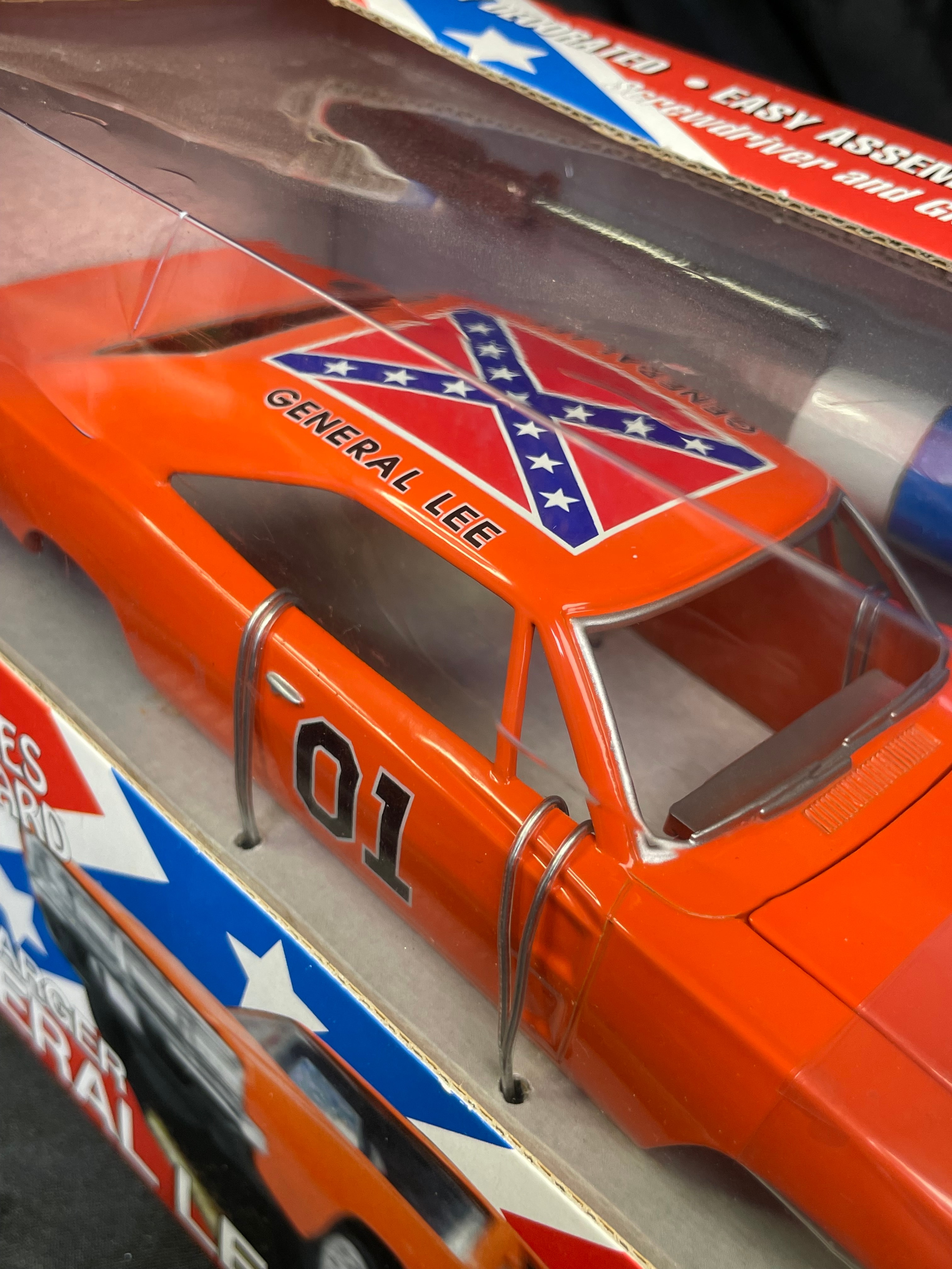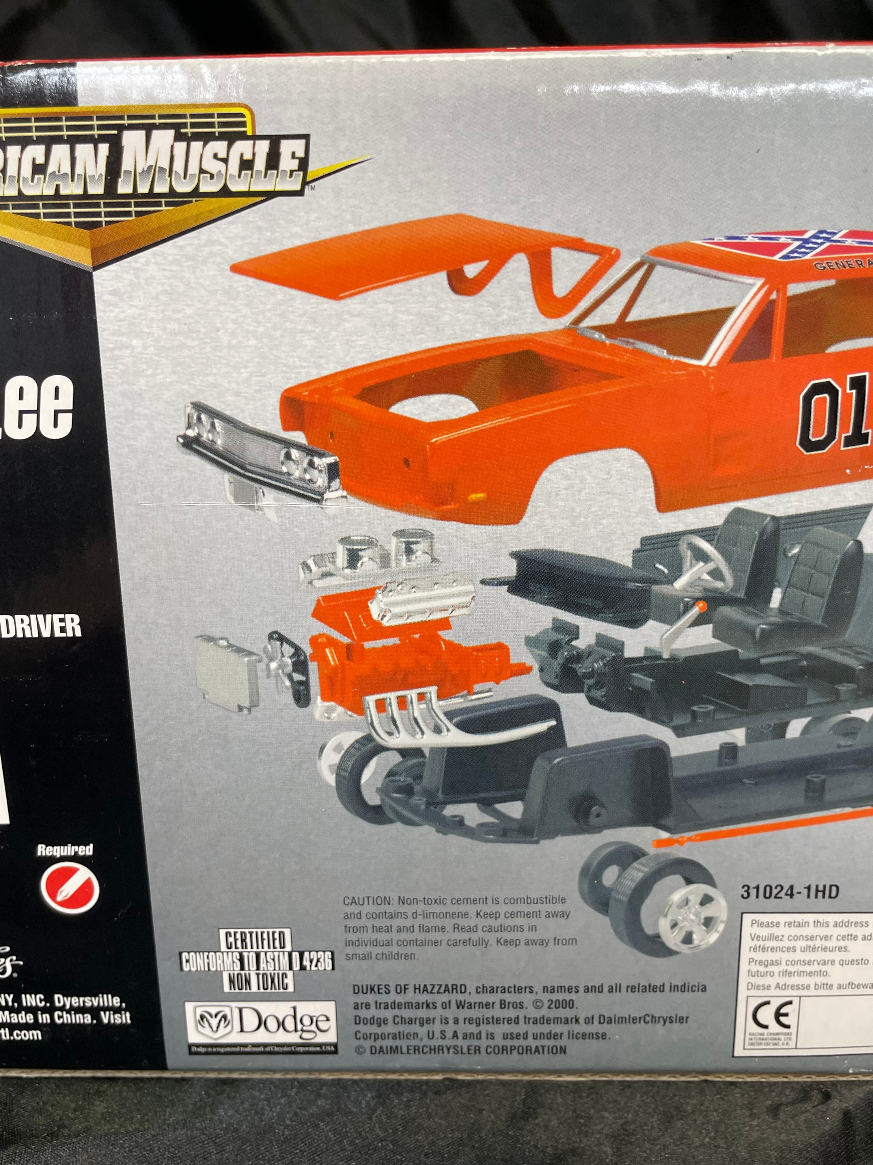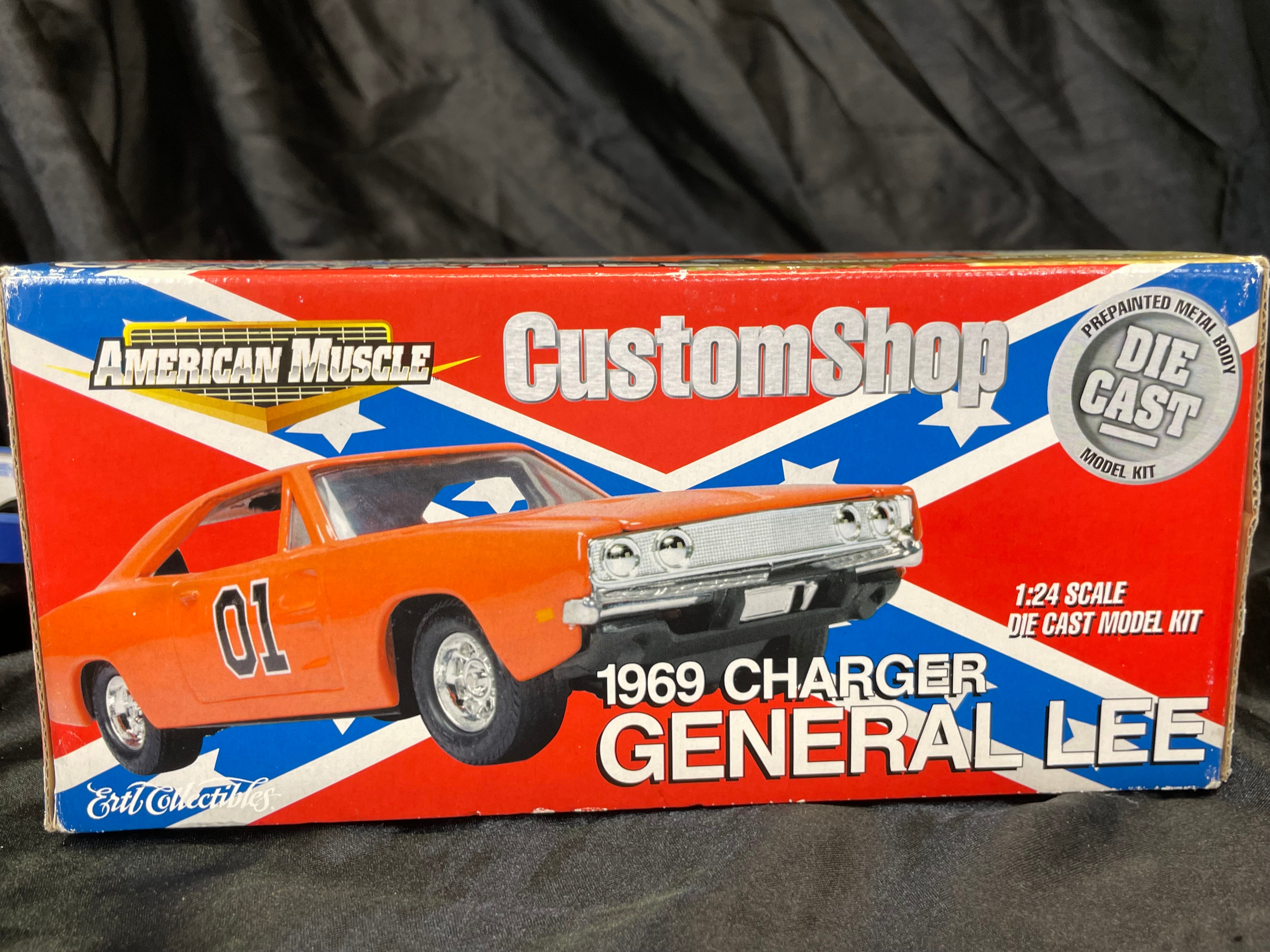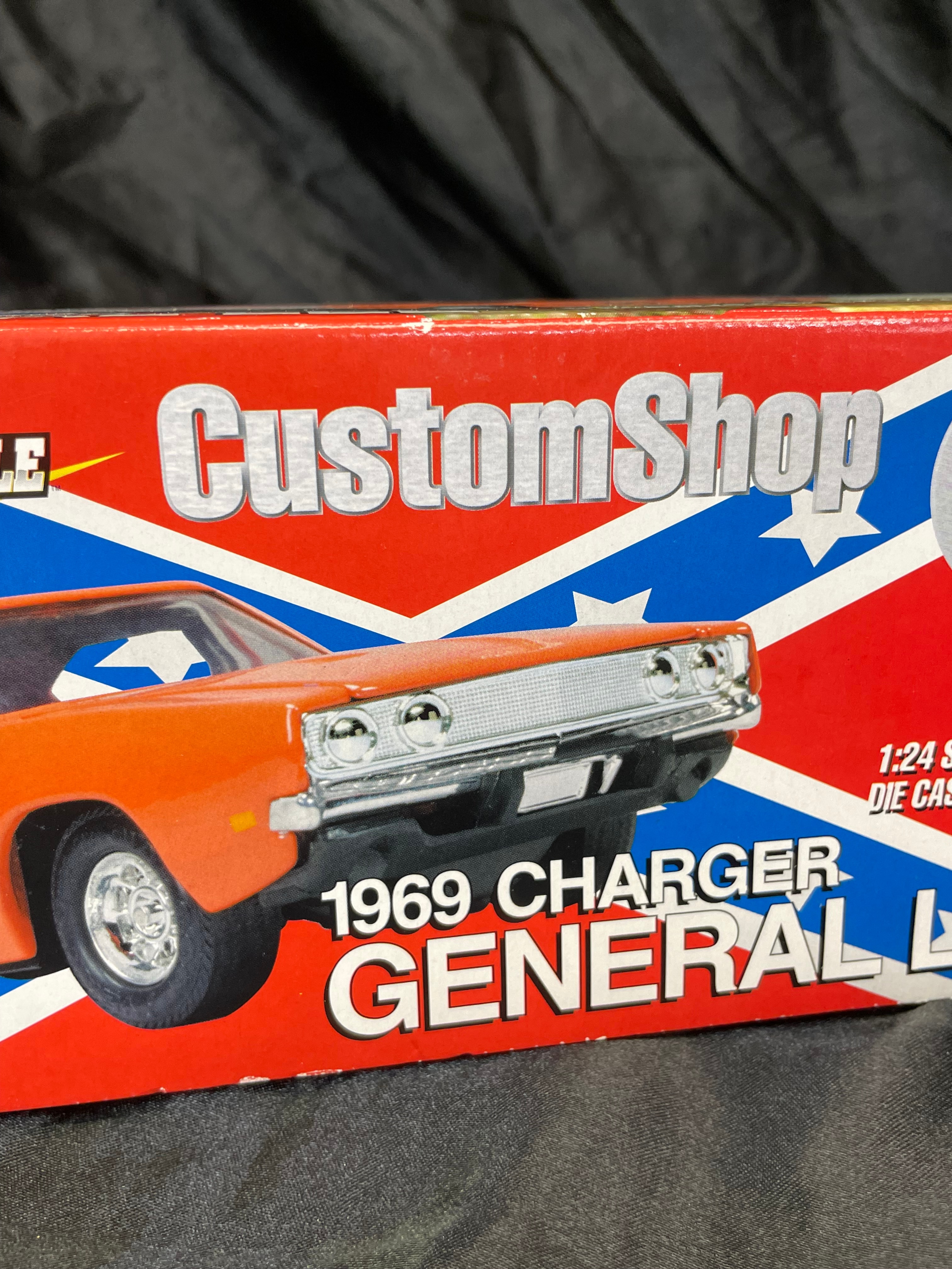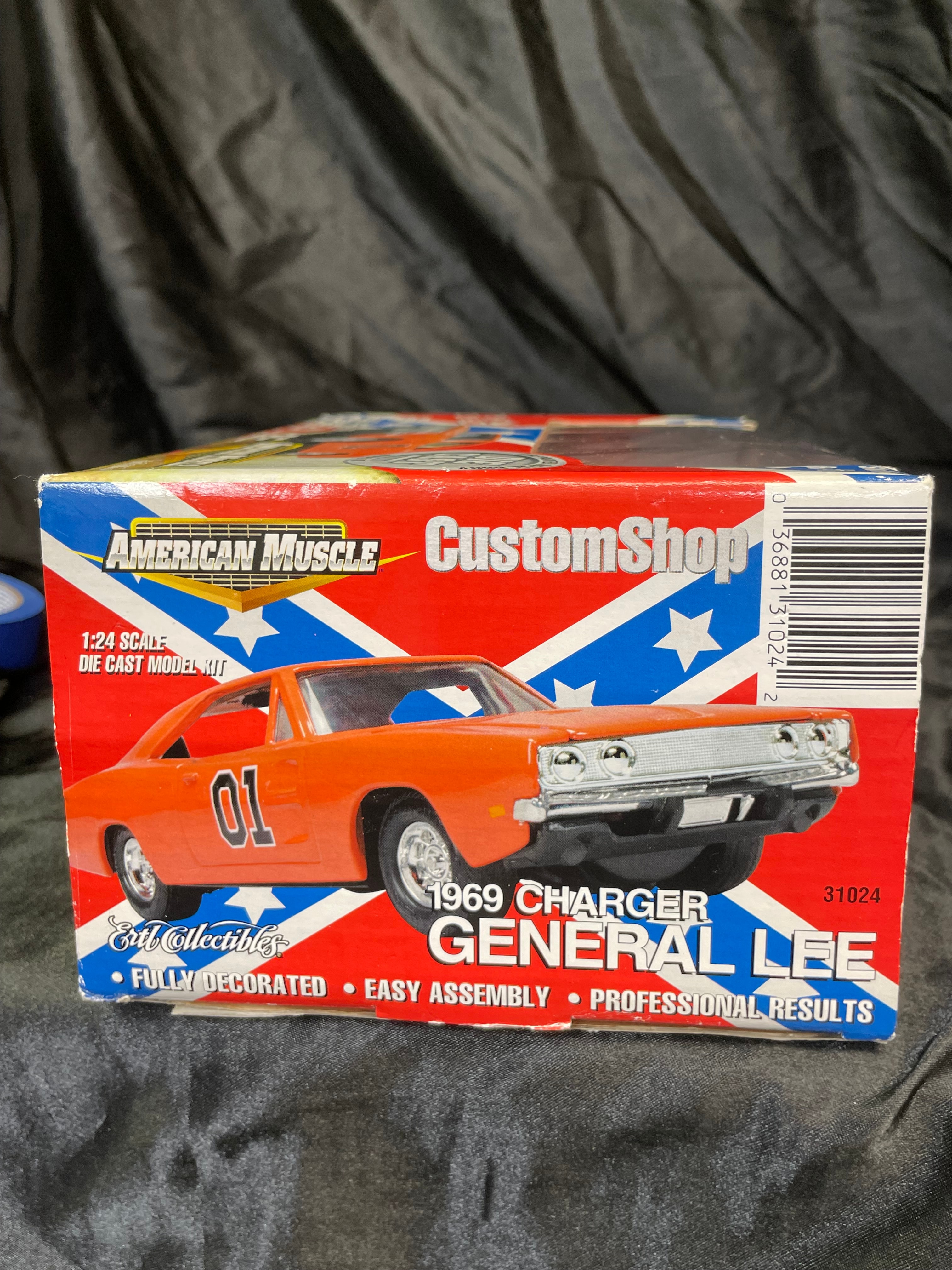 An Ertl Company “American Muscle CustomShop” 1:24 scale die-cast model kit of the 1969 Dodge Charger “General Lee” from “The Dukes of Hazzard, ” produced in 2000. The kit features a pre-painted orange metal body with “01” on the side and a Confederate battle flag graphic on the roof, labeled “GENERAL LEE.” It includes rubber tires, glue, and a screwdriver. The packaging, adorned with a red, white, and blue Confederate battle flag motif, indicates a “Skill 1” level for ages 8+ and notes that the product is “PREDECORATED, ” “EASY ASSEMBLY, ” and “NON TOXIC” (conforming to ASTM D 4236). The car body and a tube of cement are visible through the clear plastic window.