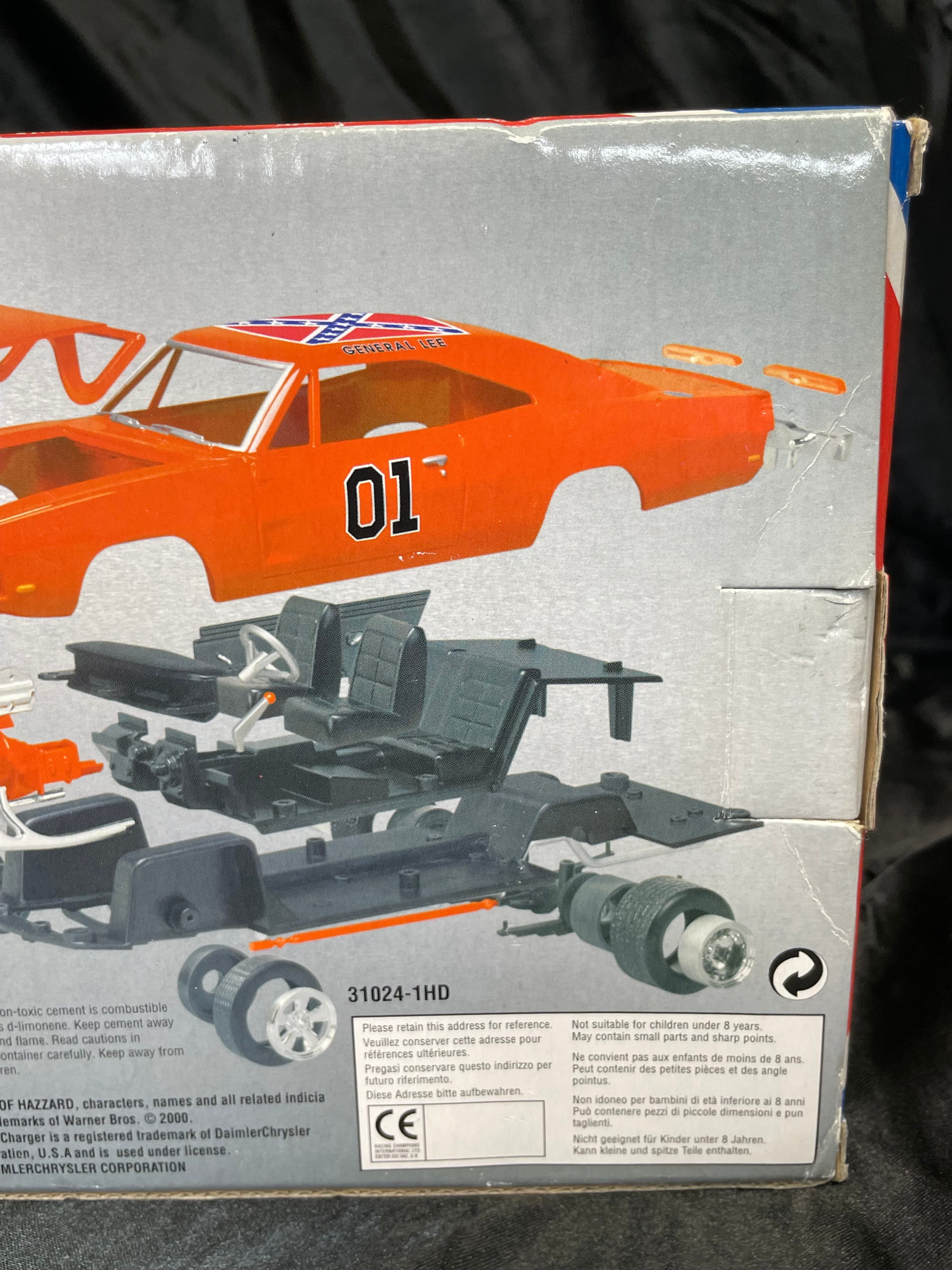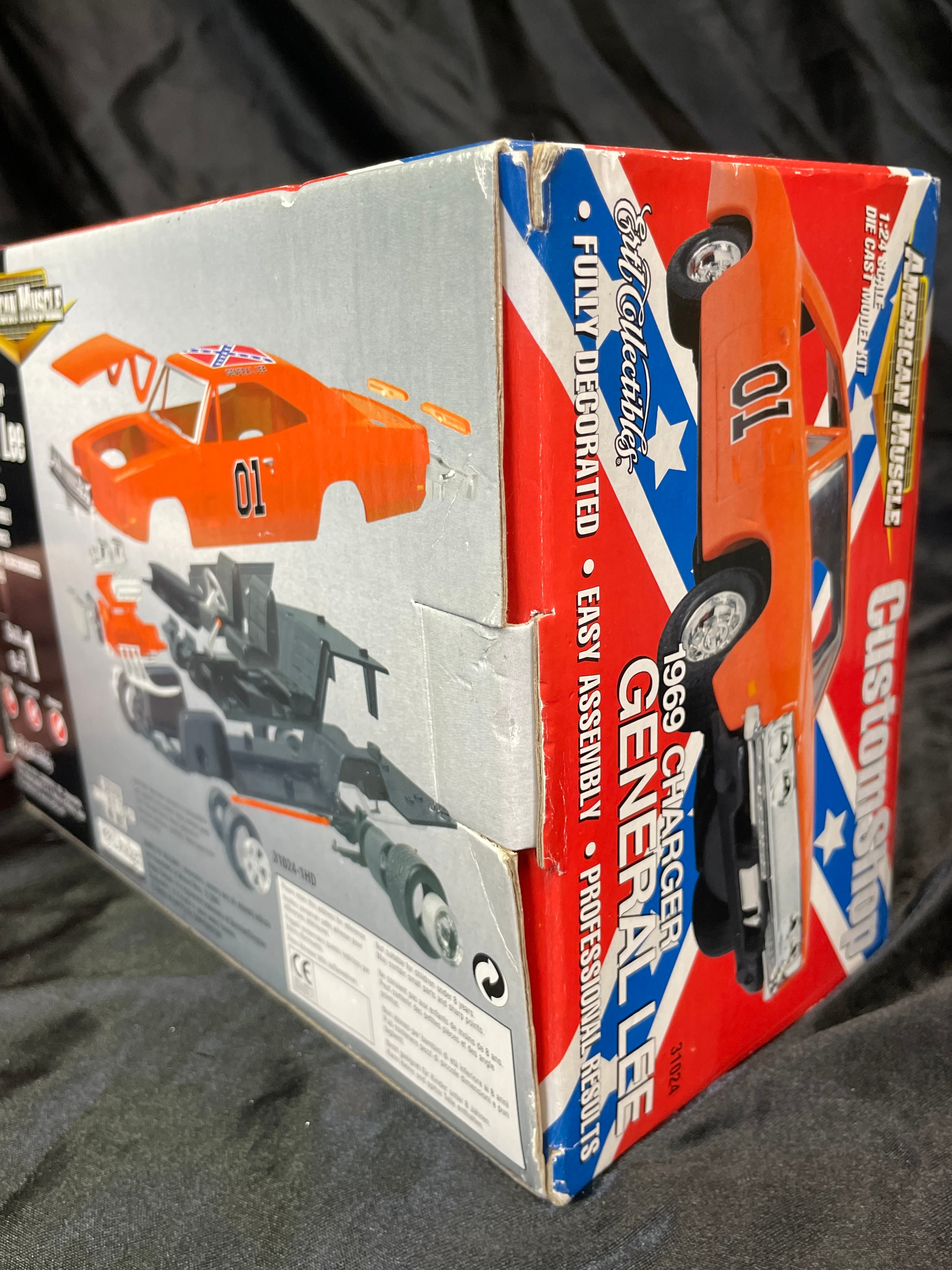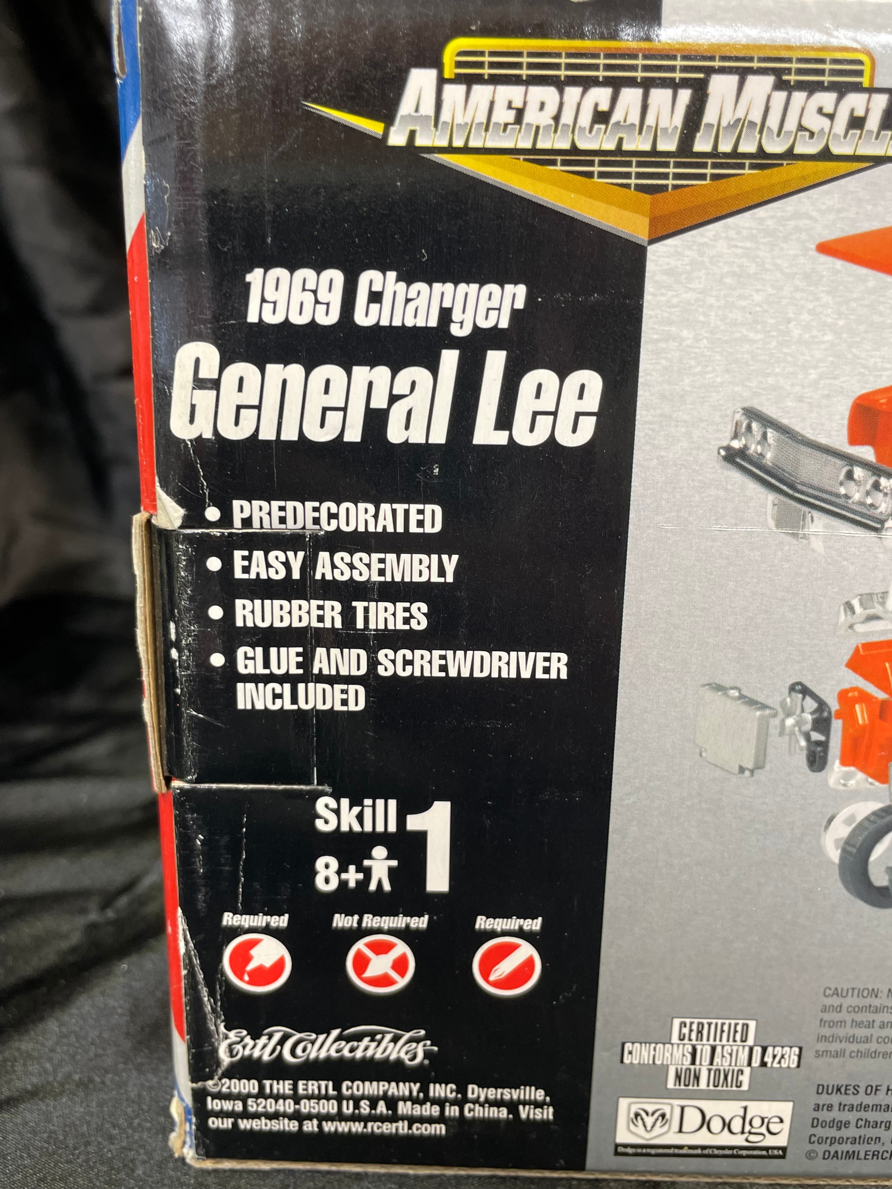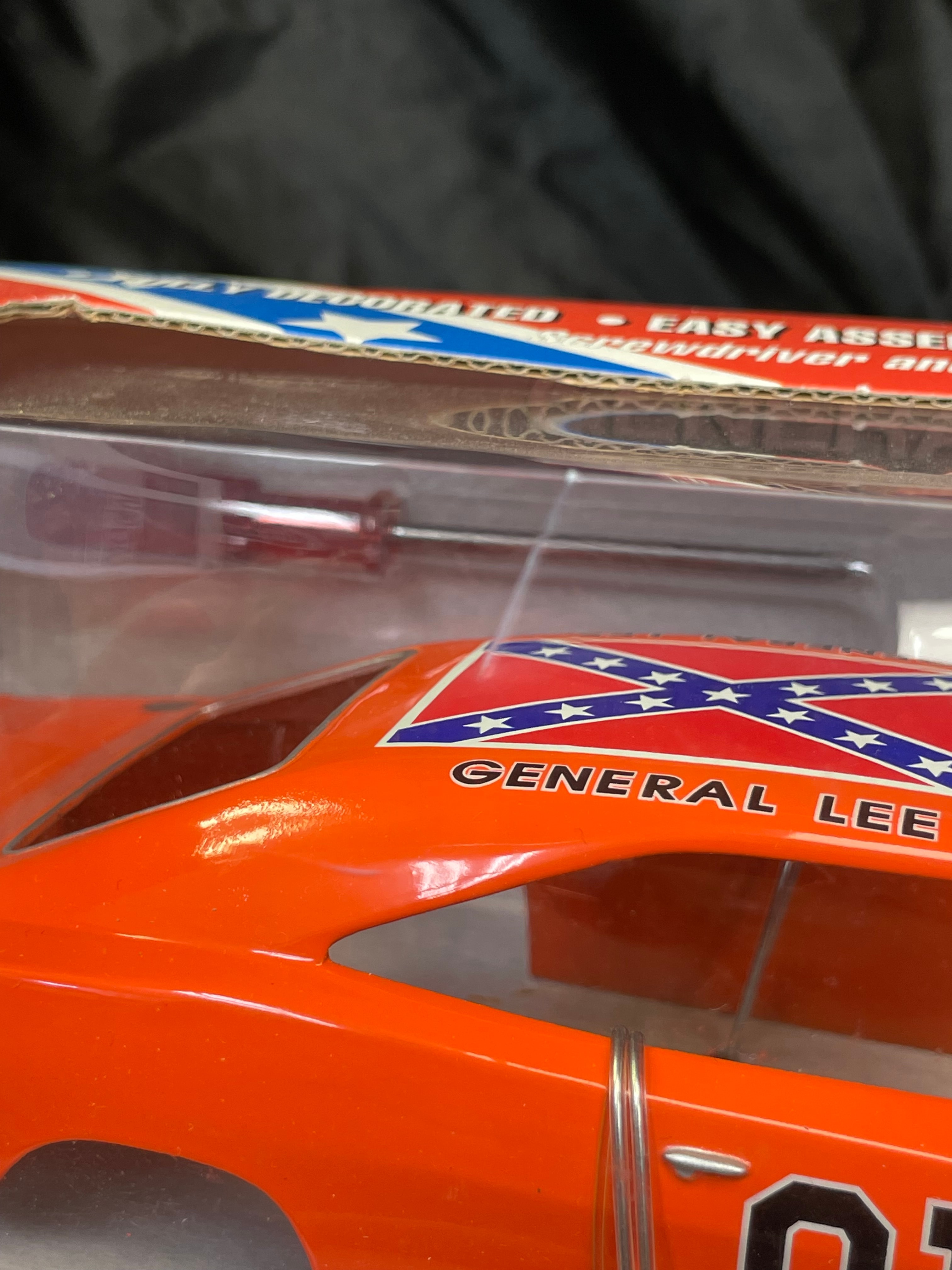 An Ertl Company “American Muscle CustomShop” 1:24 scale die-cast model kit of the 1969 Dodge Charger “General Lee” from “The Dukes of Hazzard, ” produced in 2000. The kit features a pre-painted orange metal body with “01” on the side and a Confederate battle flag graphic on the roof, labeled “GENERAL LEE.” It includes rubber tires, glue, and a screwdriver. The packaging, adorned with a red, white, and blue Confederate battle flag motif, indicates a “Skill 1” level for ages 8+ and notes that the product is “PREDECORATED, ” “EASY ASSEMBLY, ” and “NON TOXIC” (conforming to ASTM D 4236). The car body and a tube of cement are visible through the clear plastic window.