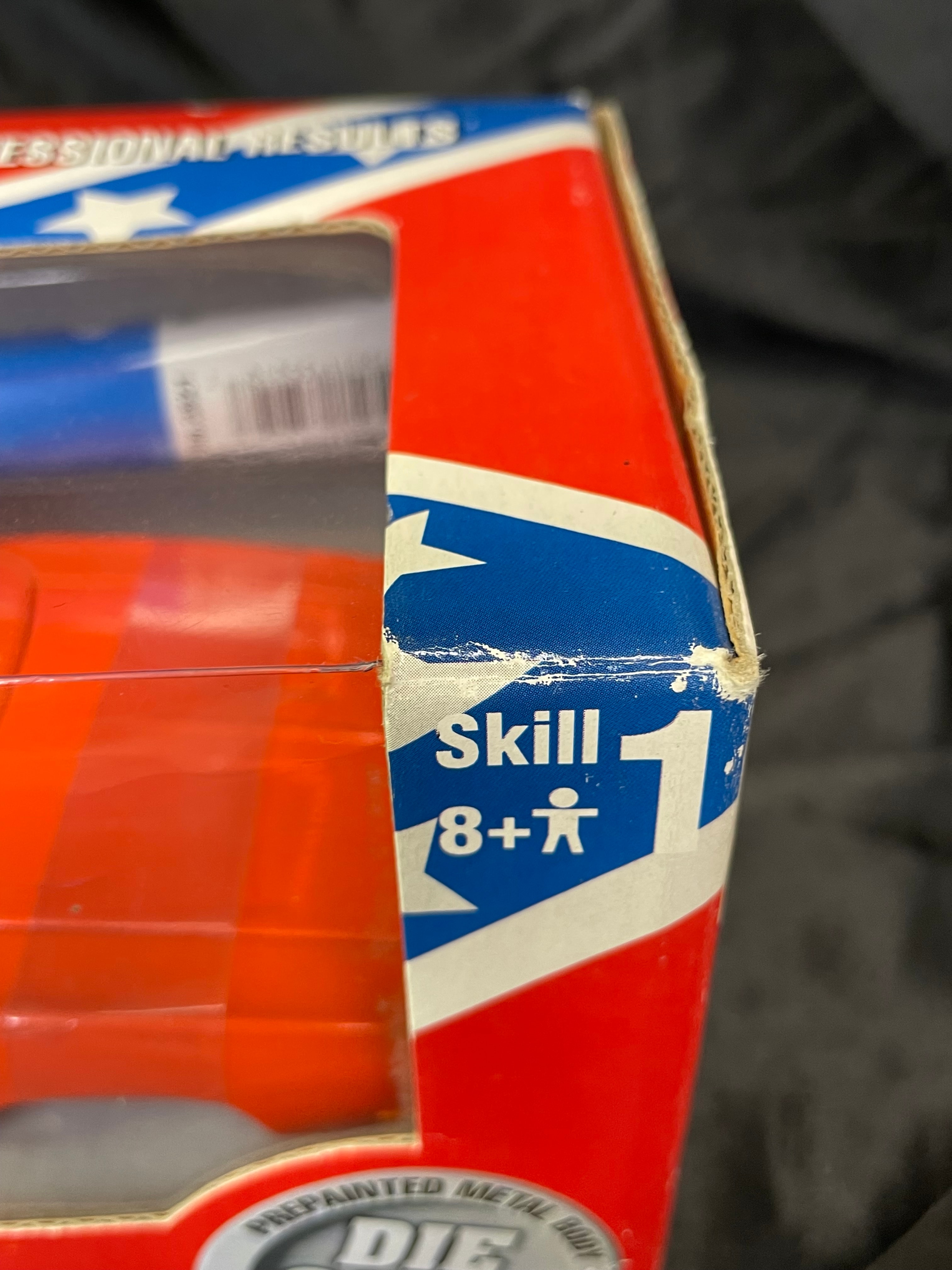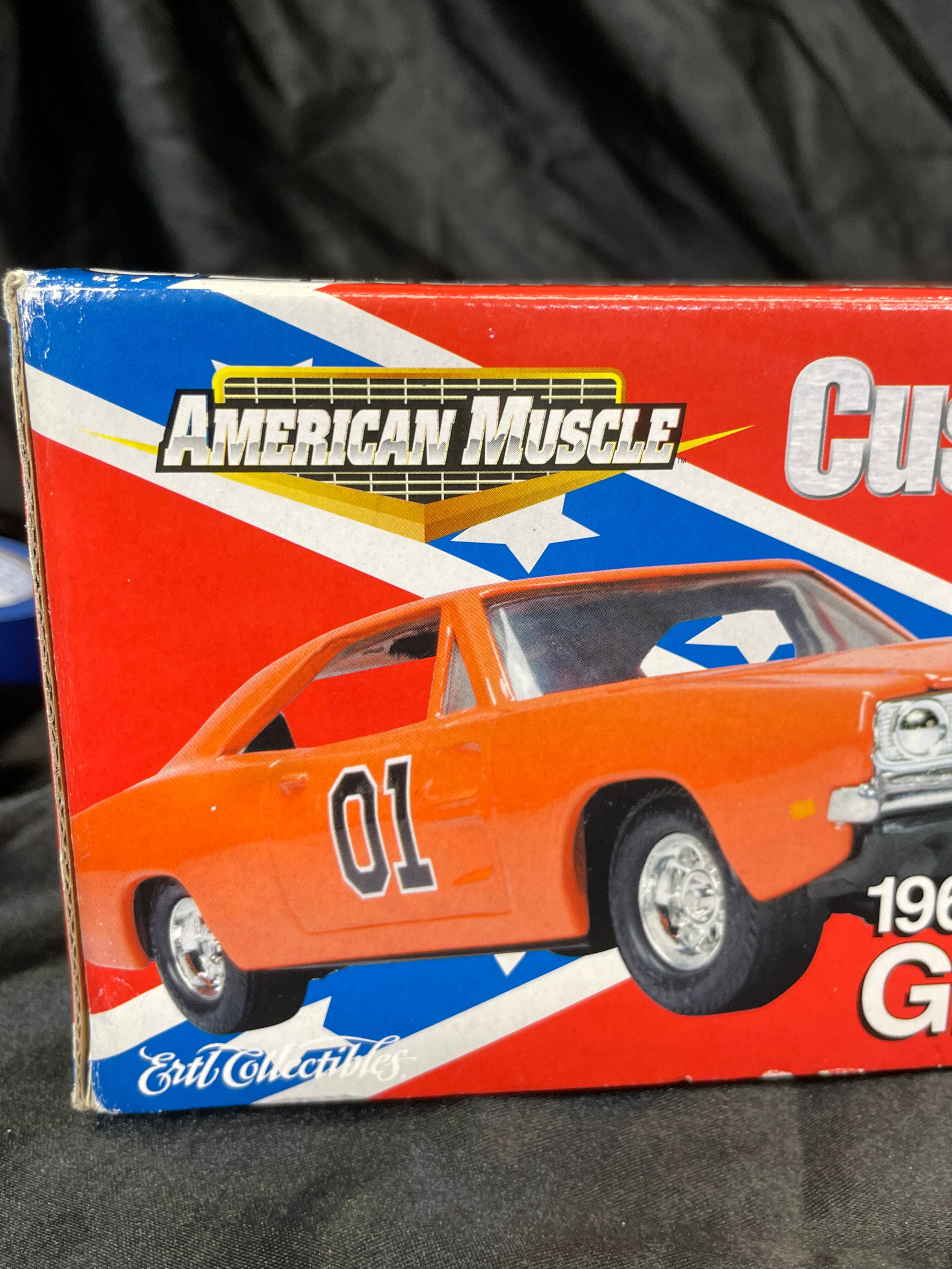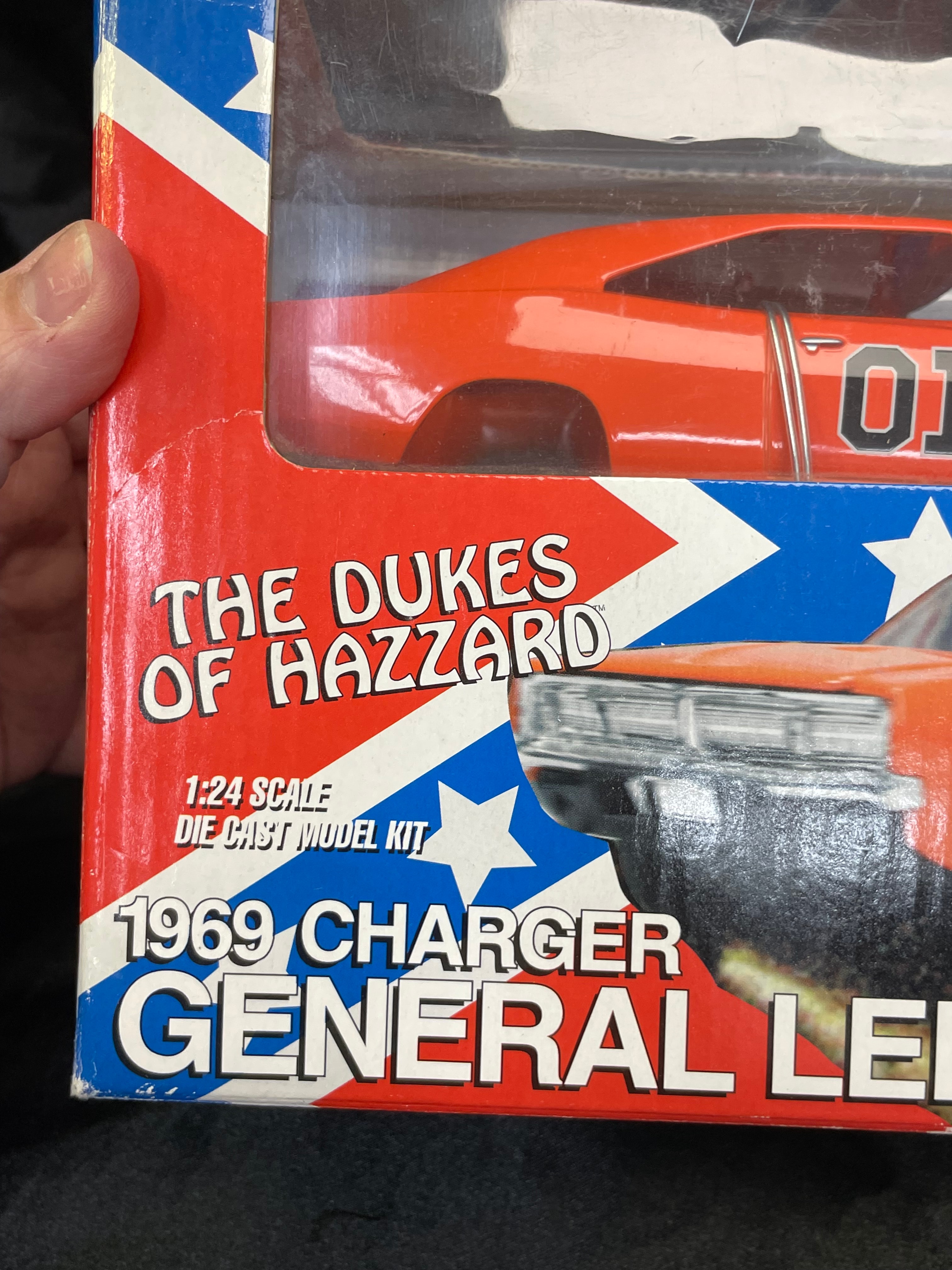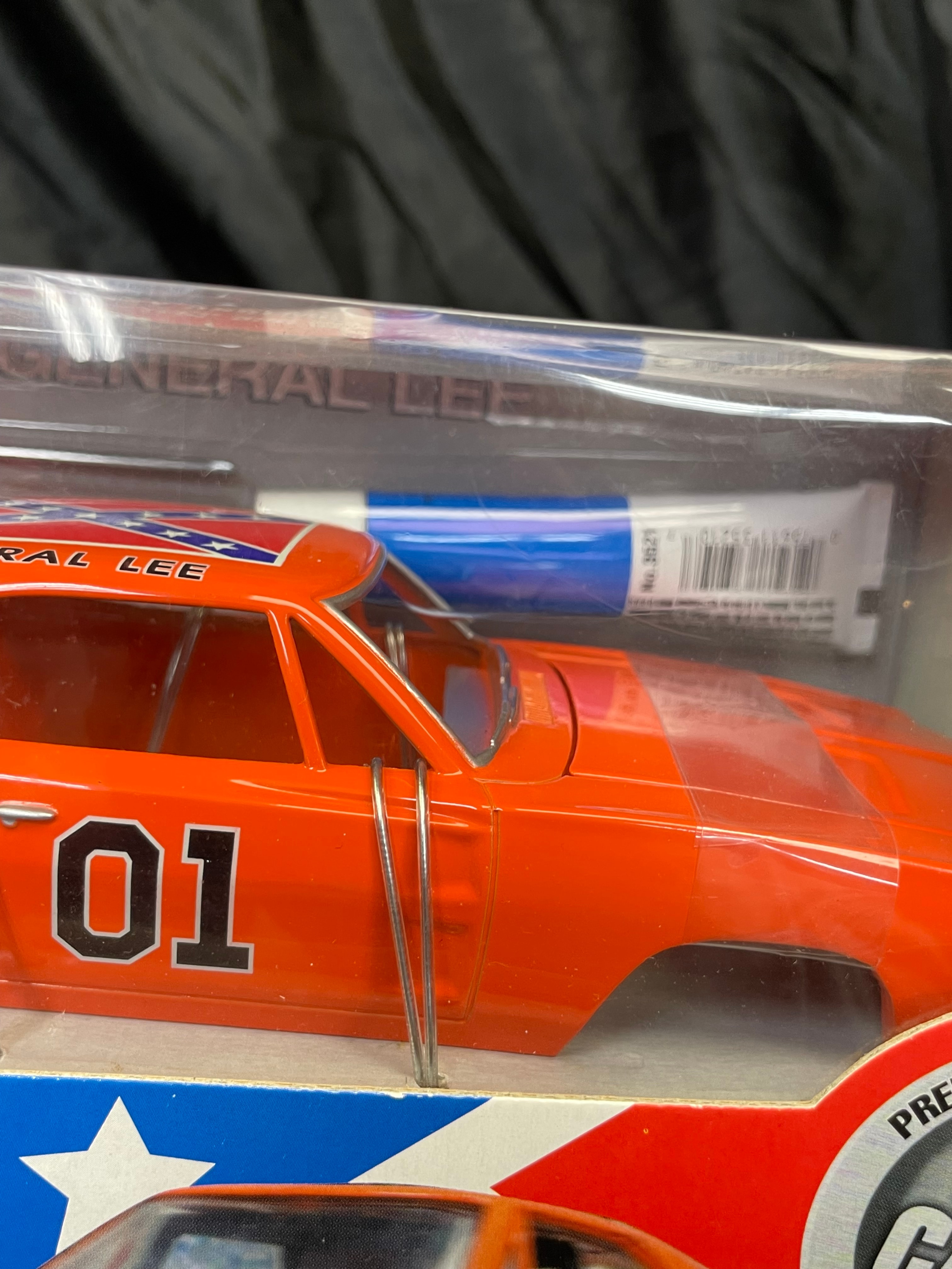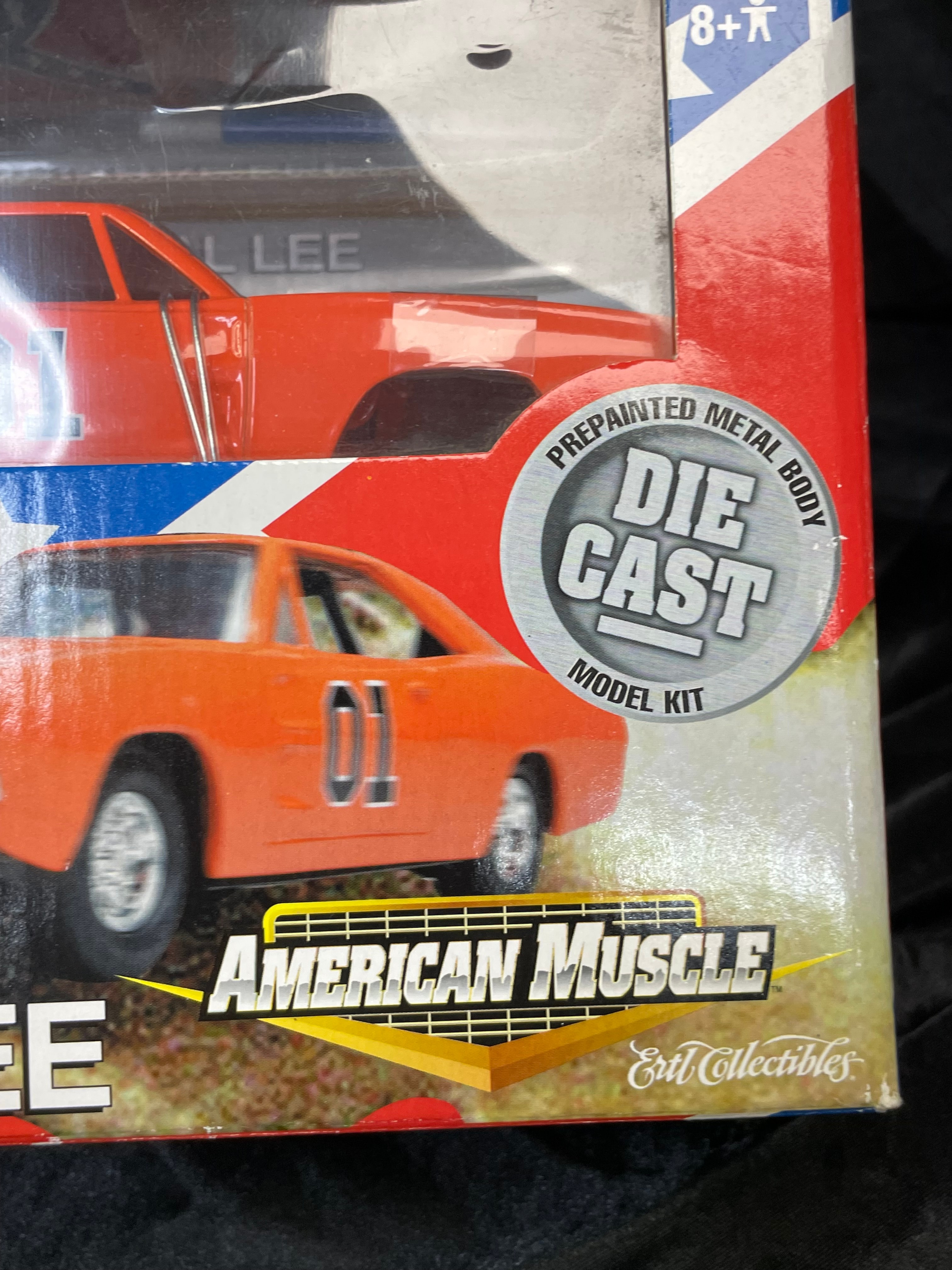 An Ertl Company “American Muscle CustomShop” 1:24 scale die-cast model kit of the 1969 Dodge Charger “General Lee” from “The Dukes of Hazzard, ” produced in 2000. The kit features a pre-painted orange metal body with “01” on the side and a Confederate battle flag graphic on the roof, labeled “GENERAL LEE.” It includes rubber tires, glue, and a screwdriver. The packaging, adorned with a red, white, and blue Confederate battle flag motif, indicates a “Skill 1” level for ages 8+ and notes that the product is “PREDECORATED, ” “EASY ASSEMBLY, ” and “NON TOXIC” (conforming to ASTM D 4236). The car body and a tube of cement are visible through the clear plastic window.