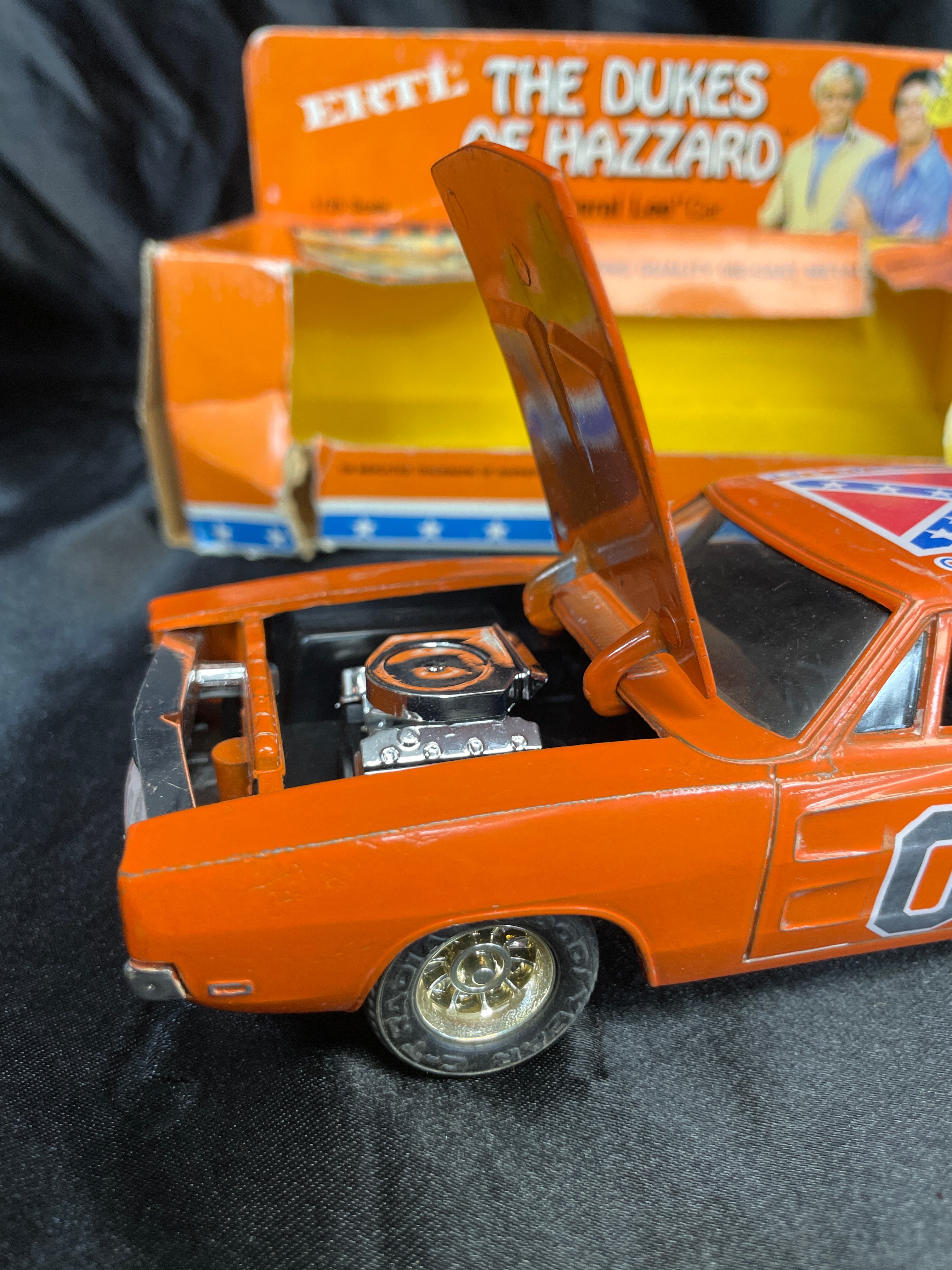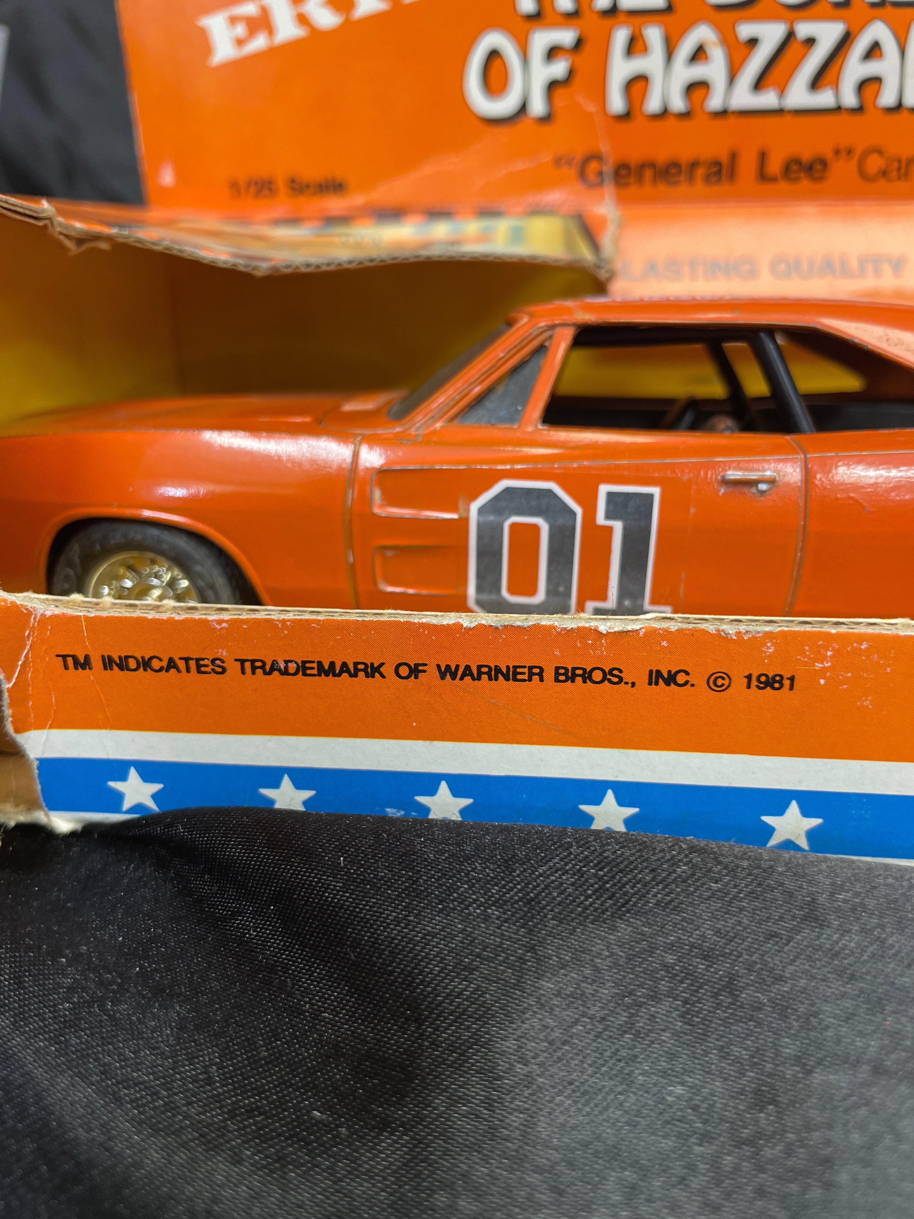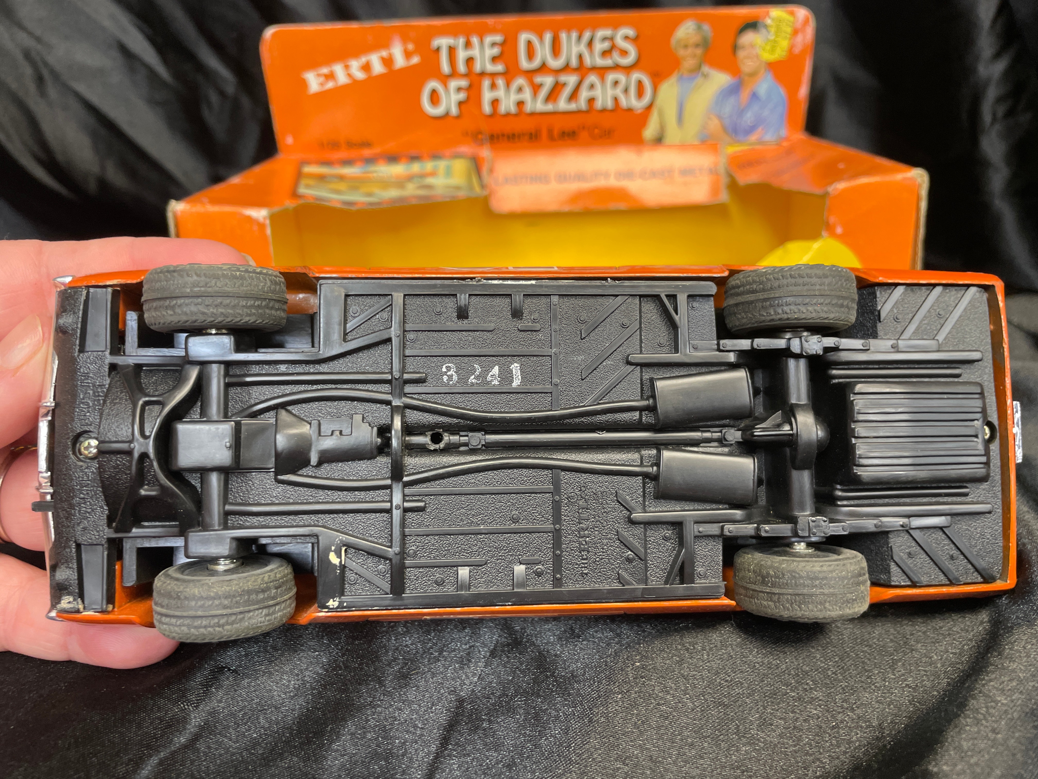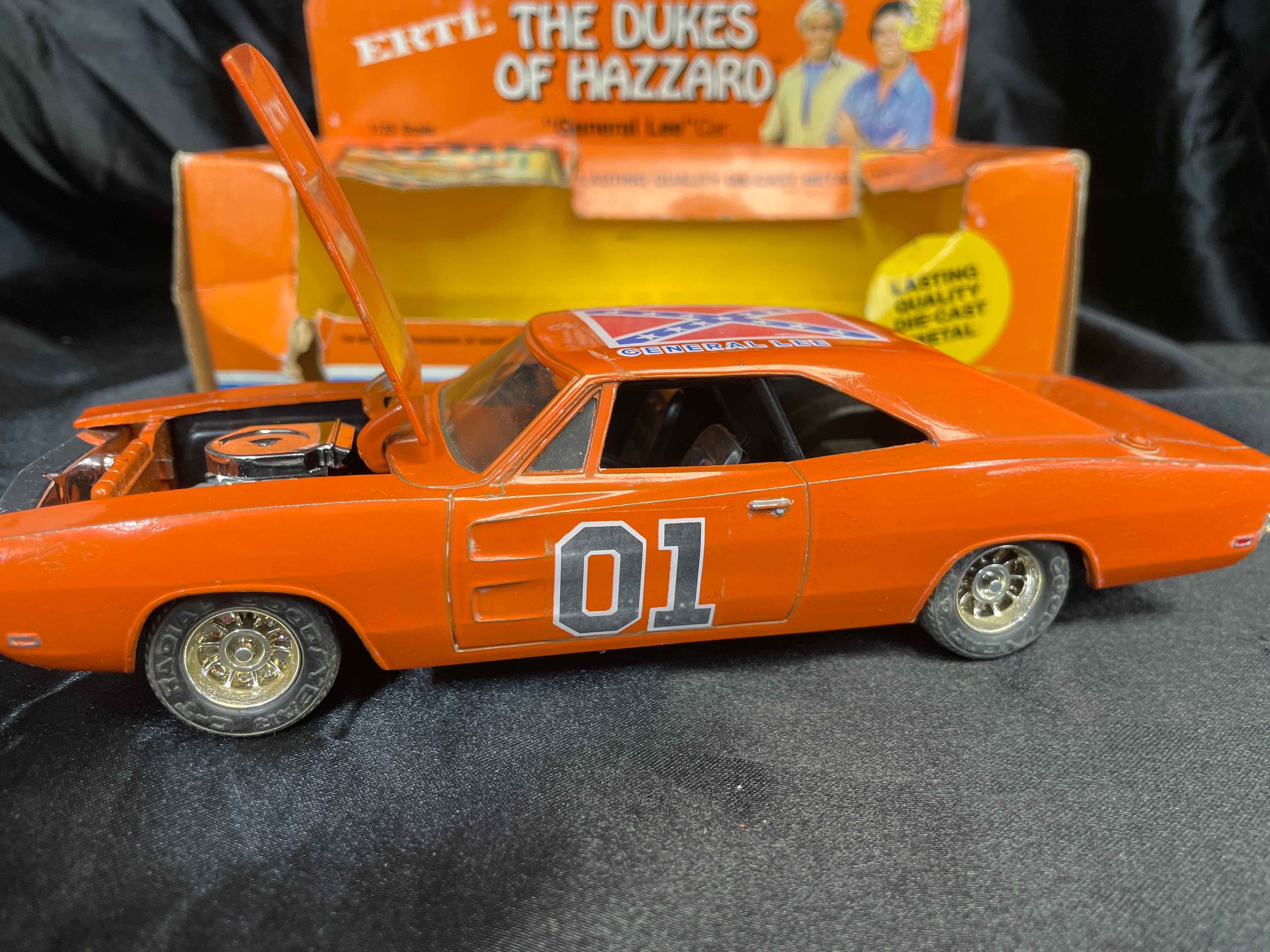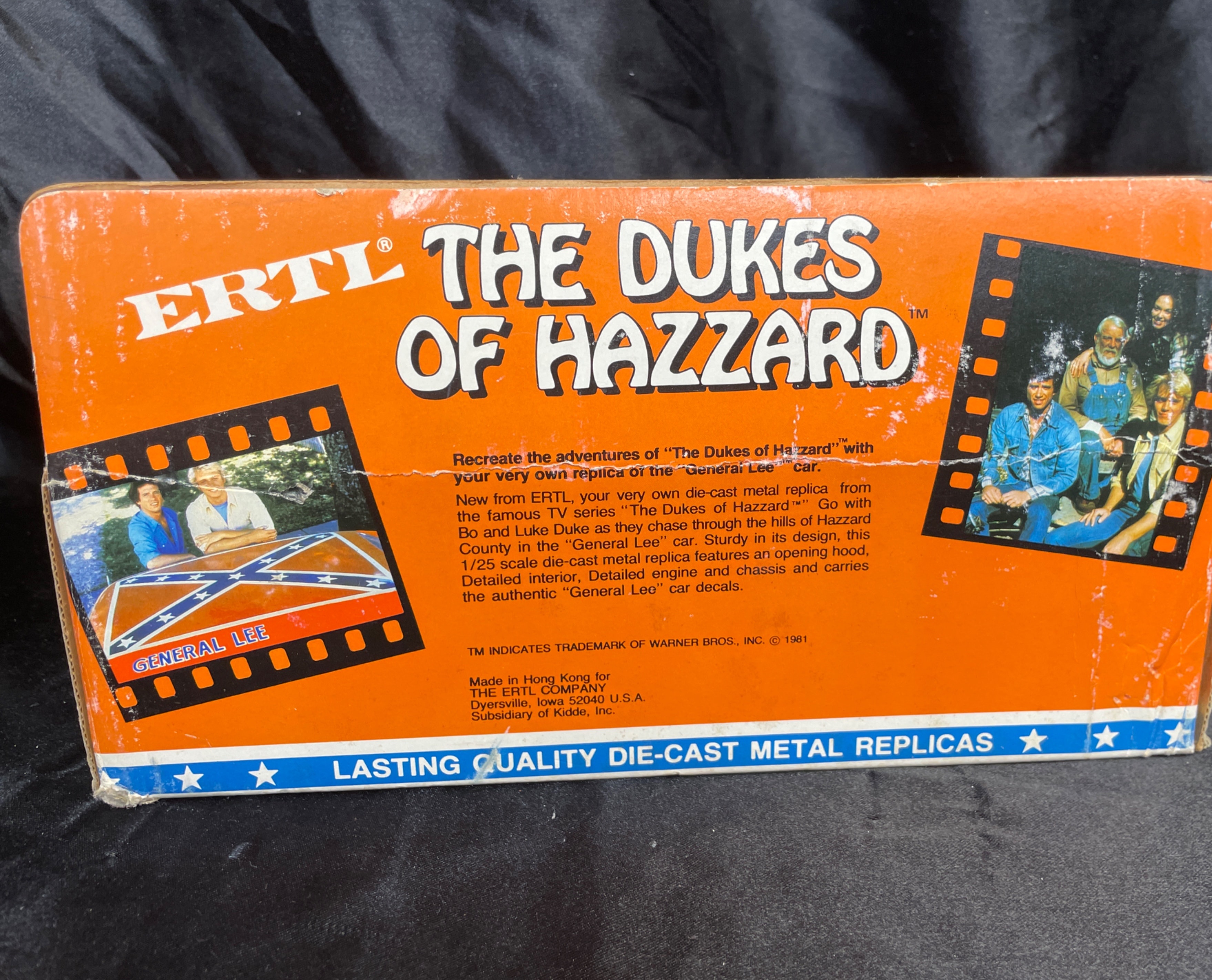 An ERTL ‘The Dukes of Hazzard’ ‘General Lee’ die-cast metal model car, 1/25 scale, dated 1981. The orange replica features “01” prominently on the doors and a Confederate battle flag graphic with “GENERAL LEE” text on the roof. The car has an opening hood that reveals engine detail. Molded text on the car’s underside includes “ERTL®,” “DYERSVILLE, IOWA USA,” and “MADE IN HONG KONG,” alongside a stamped number “3241.” The car is presented within its original orange and yellow cardboard packaging, which is marked with “THE DUKES OF HAZZARD,” “LASTING QUALITY DIE-CAST METAL,” and “TM INDICATES TRADEMARK OF WARNER BROS., INC. © 1981,” and also displays images of characters from the show.