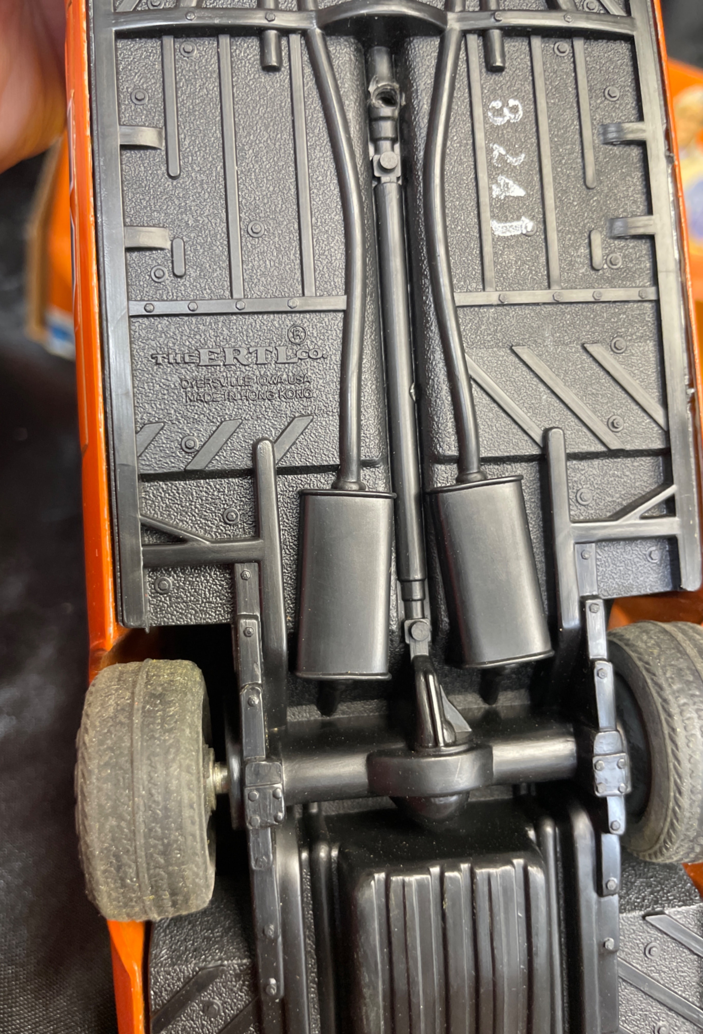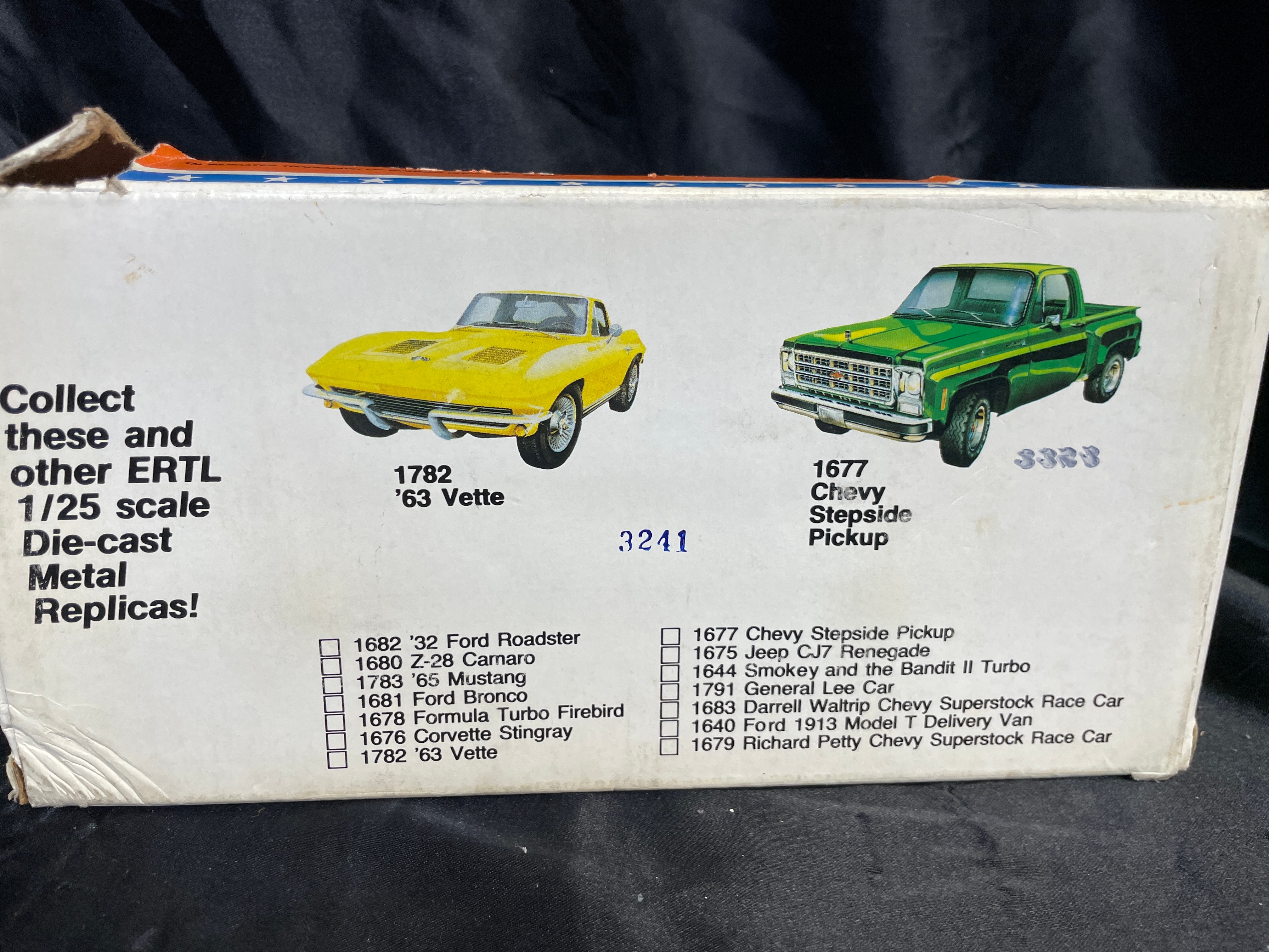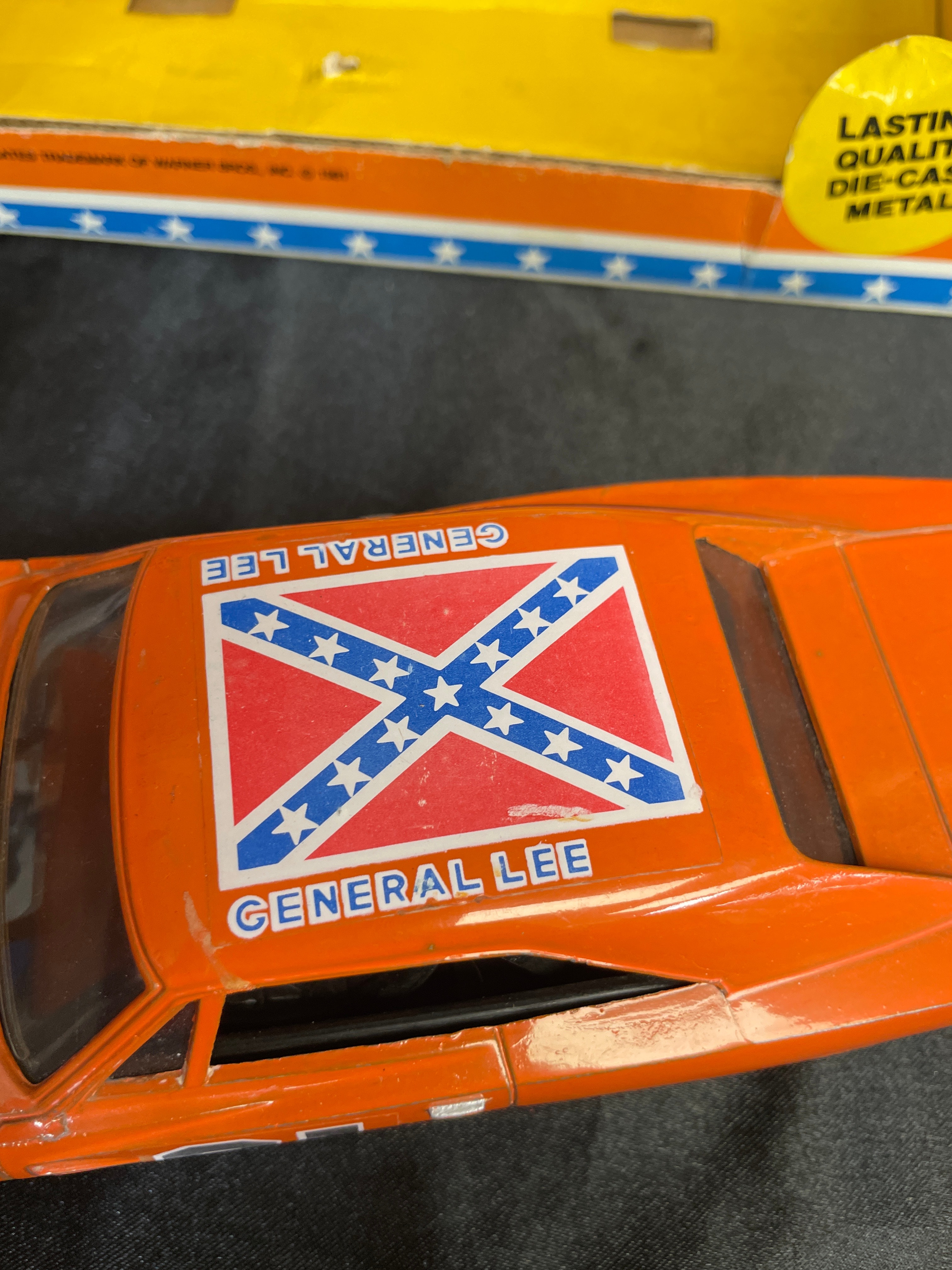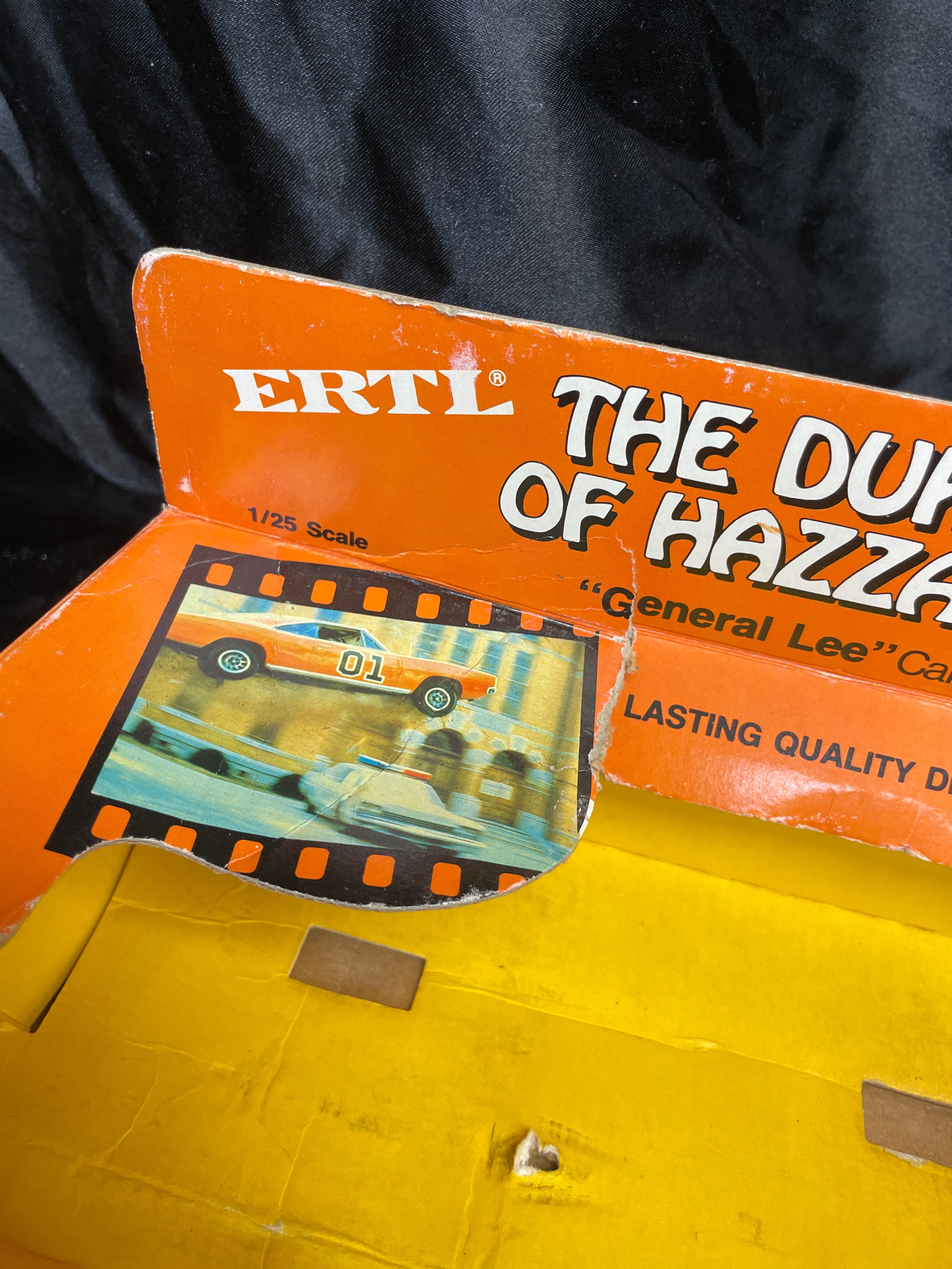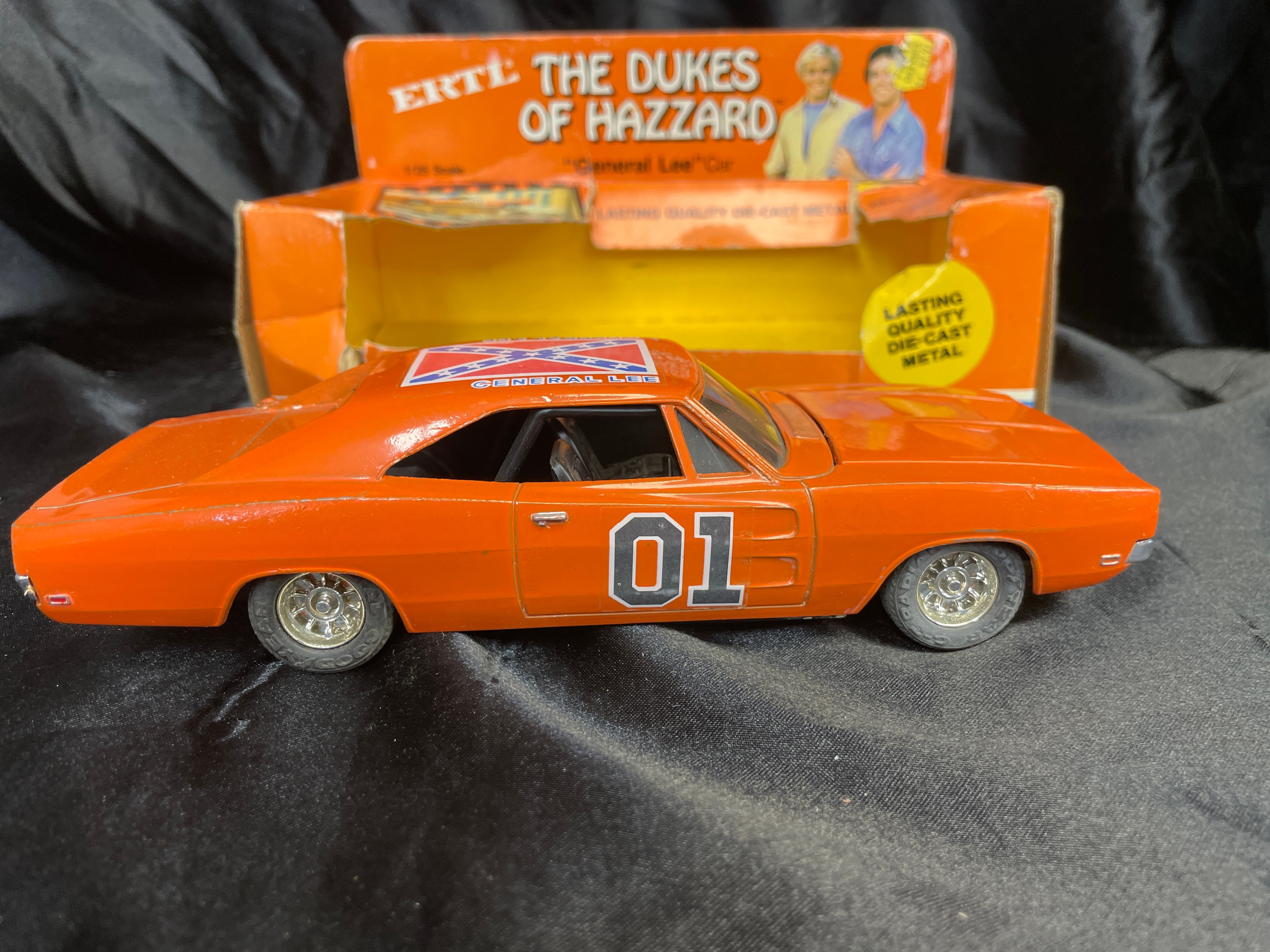 An ERTL ‘The Dukes of Hazzard’ ‘General Lee’ die-cast metal model car, 1/25 scale, dated 1981. The orange replica features “01” prominently on the doors and a Confederate battle flag graphic with “GENERAL LEE” text on the roof. The car has an opening hood that reveals engine detail. Molded text on the car’s underside includes “ERTL®,” “DYERSVILLE, IOWA USA,” and “MADE IN HONG KONG,” alongside a stamped number “3241.” The car is presented within its original orange and yellow cardboard packaging, which is marked with “THE DUKES OF HAZZARD,” “LASTING QUALITY DIE-CAST METAL,” and “TM INDICATES TRADEMARK OF WARNER BROS., INC. © 1981,” and also displays images of characters from the show.