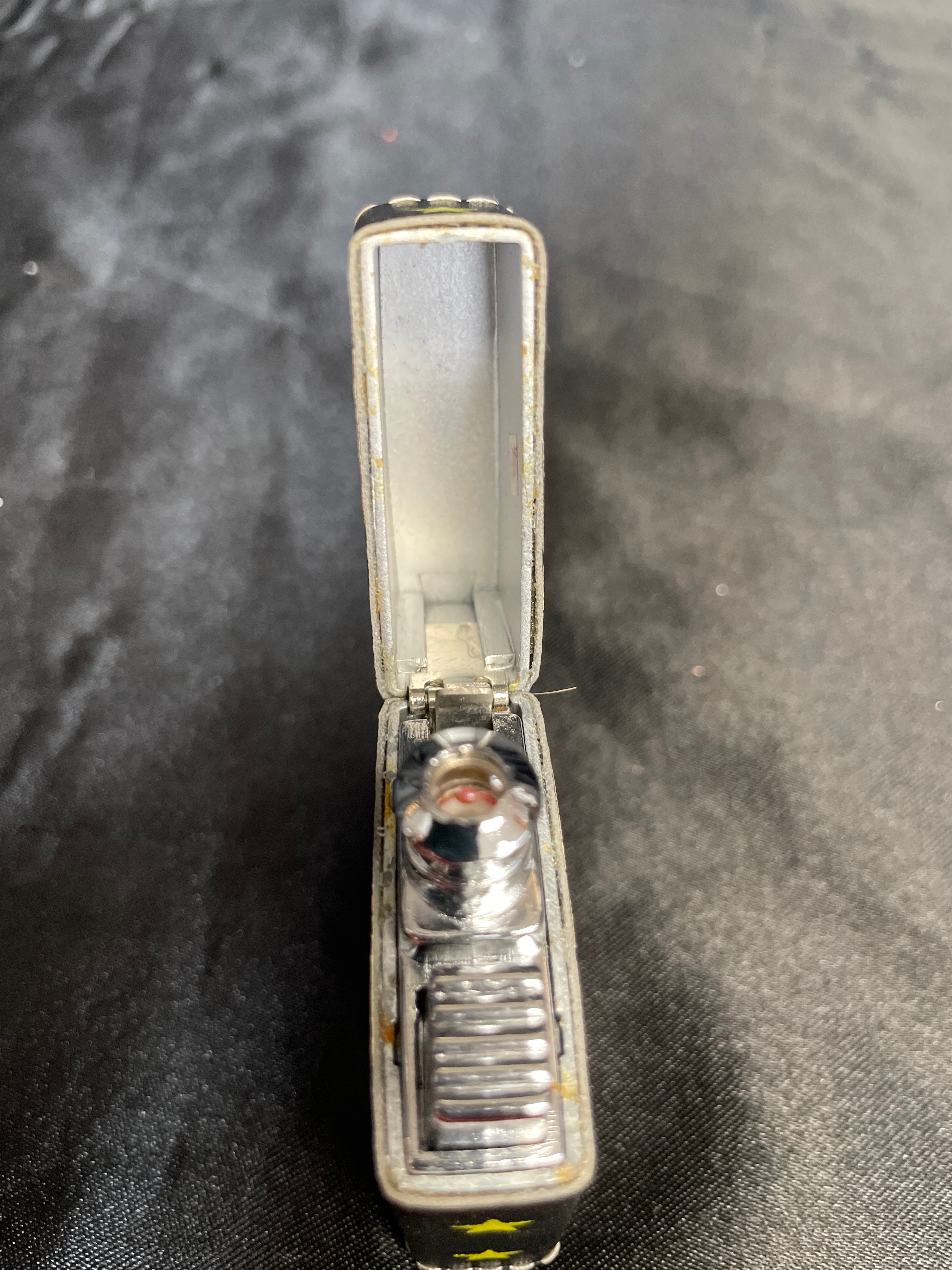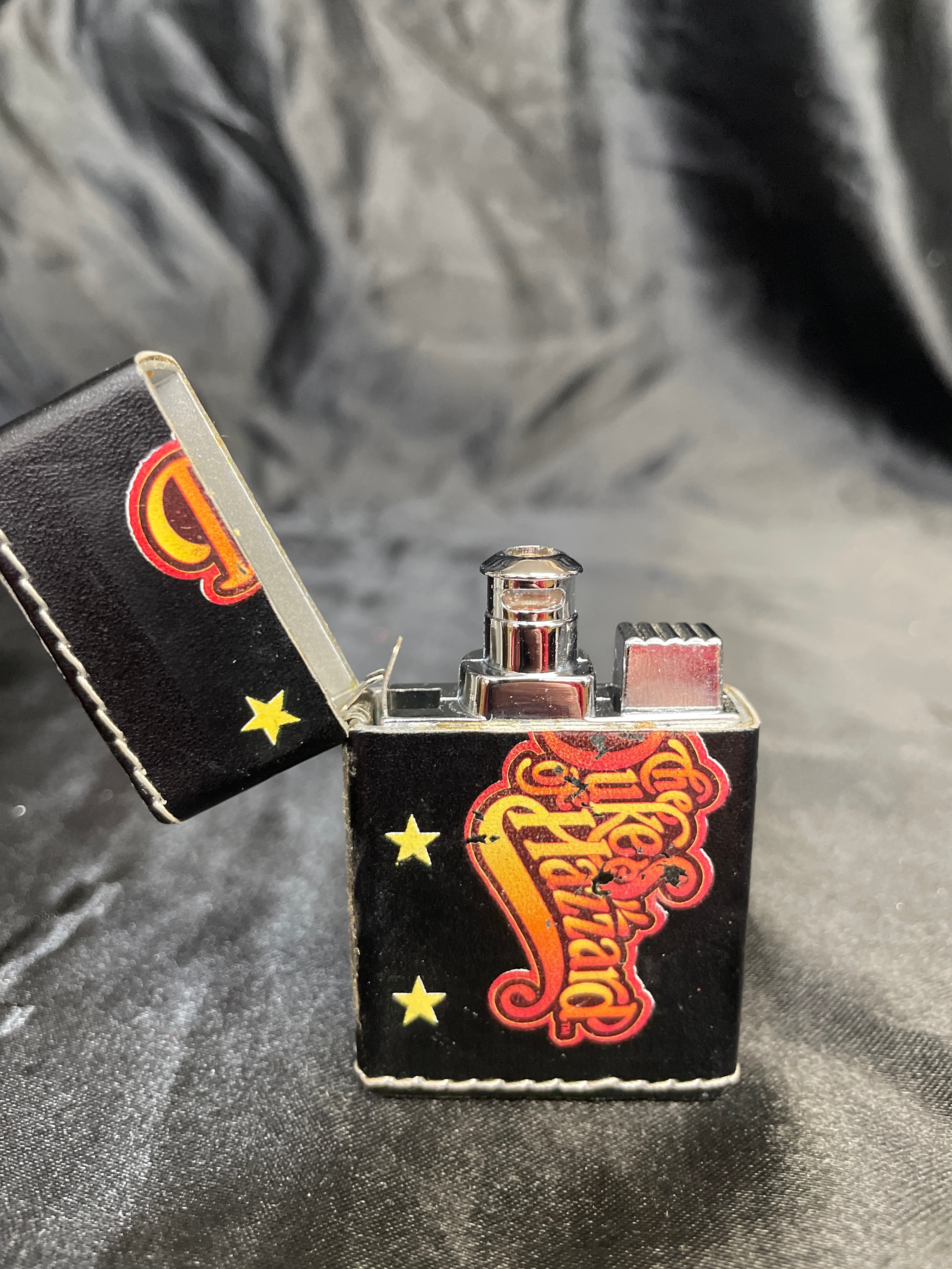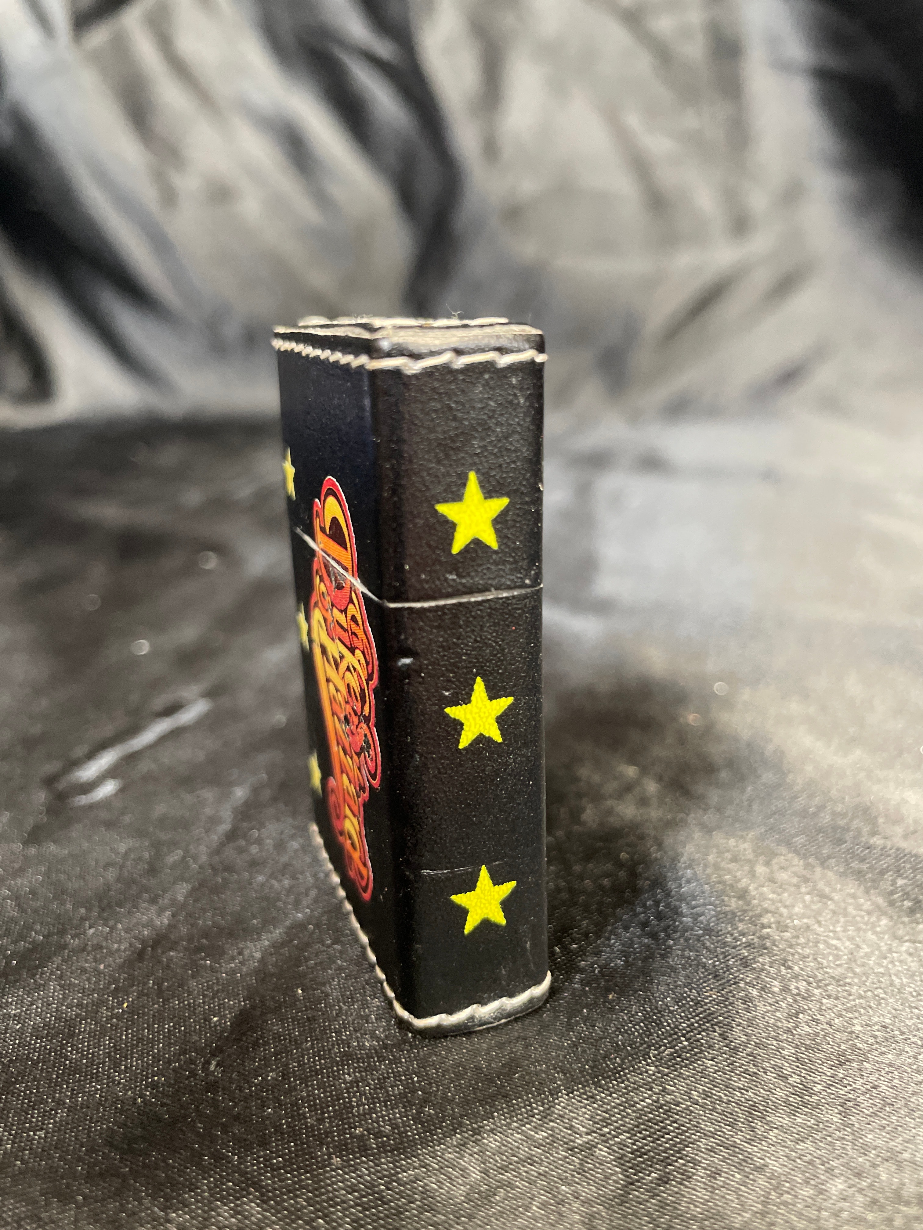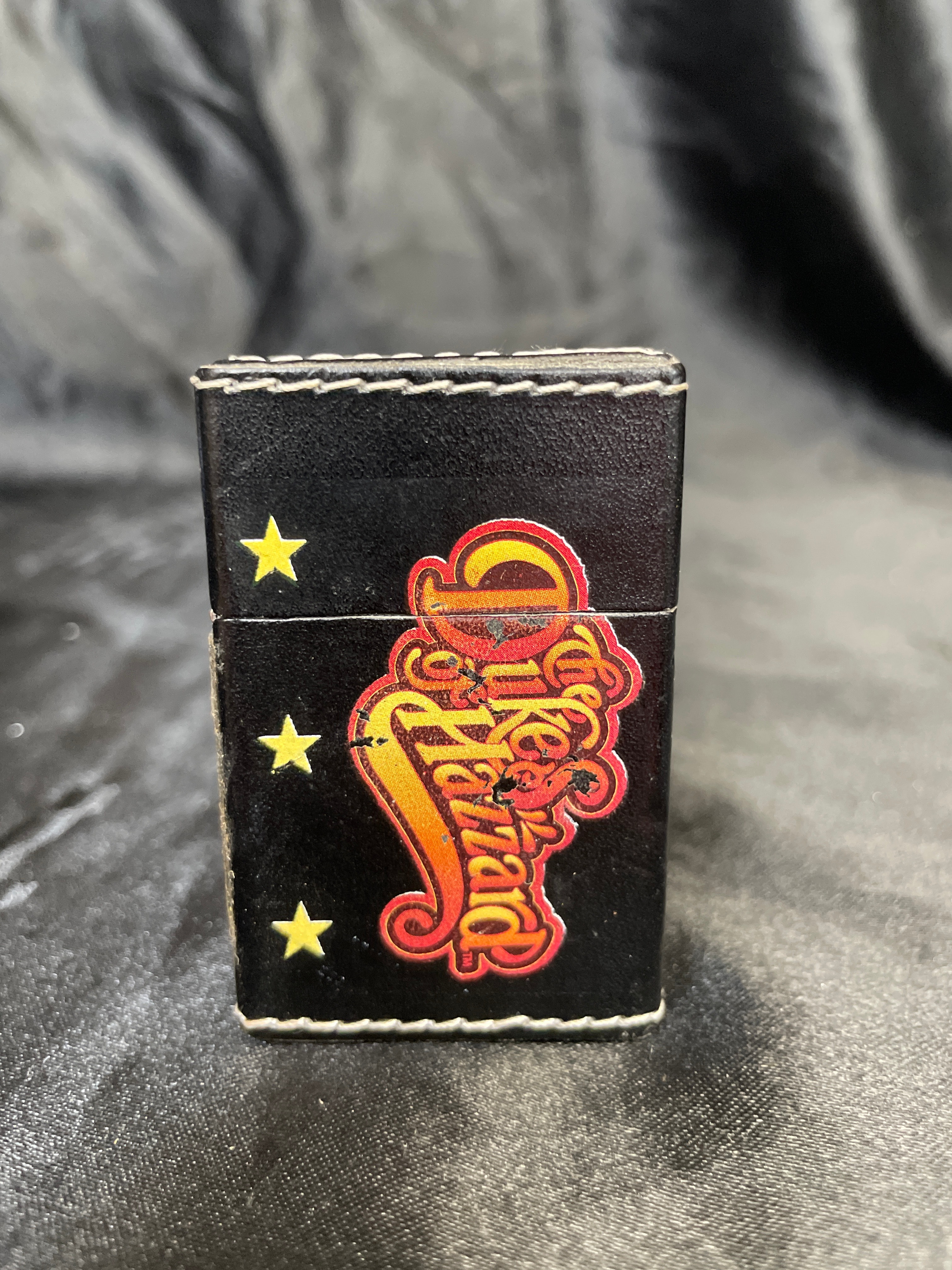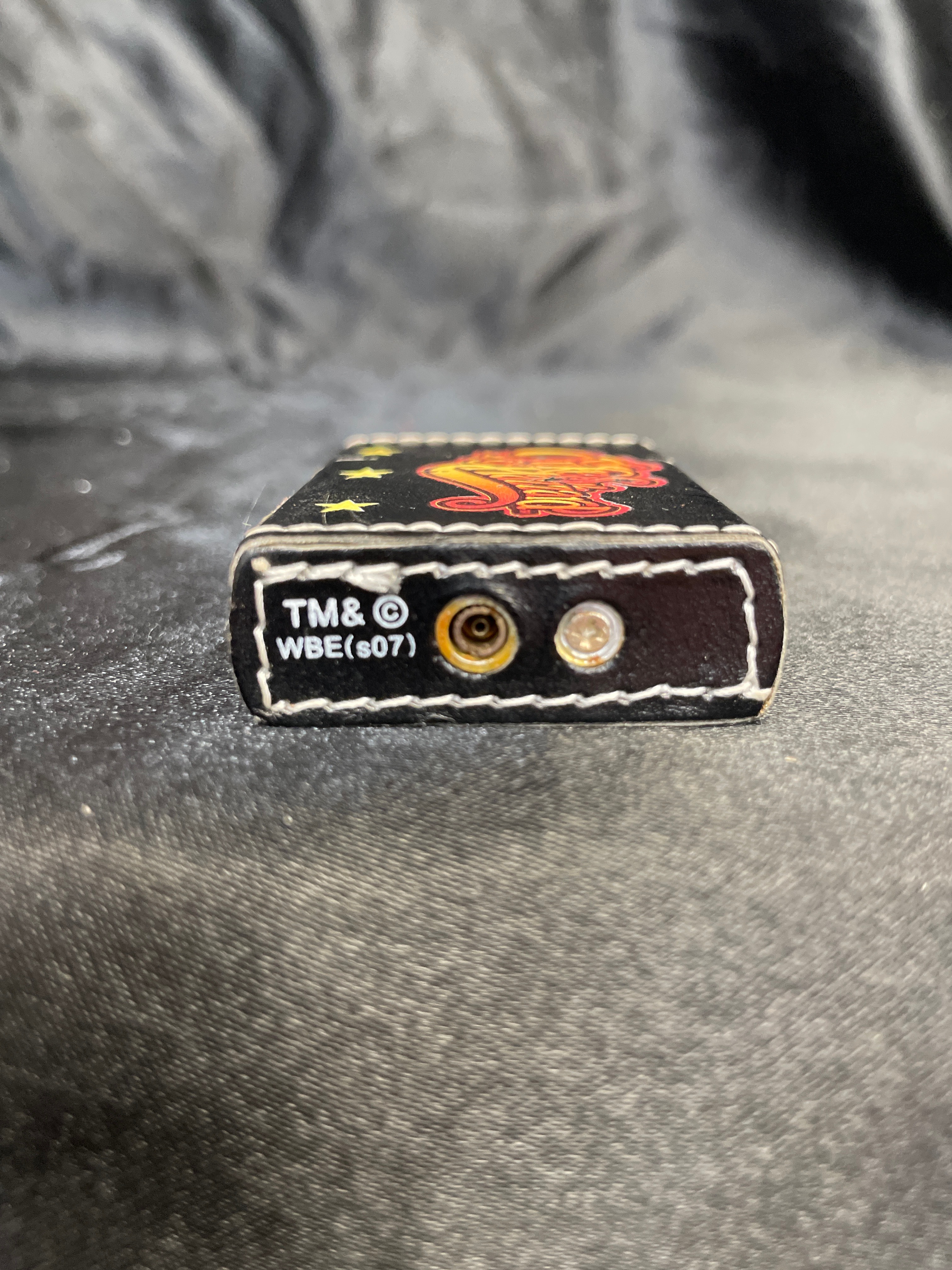A rectangular, hinged flip-top lighter, predominantly black with a white stitched border, featuring a faux leather or similar textured wrap over a metal body. The front is decorated with a vibrant, stylized graphic depicting three yellow stars vertically aligned on the left and a large, gradient orange-to-red text reading ‘Dukes of Hazzard’ on the right. The internal mechanism is a chrome-finished metal insert. The base of the lighter is marked ‘TM & © WBE (s07),’ indicating a Warner Bros. Entertainment copyright from 2007.