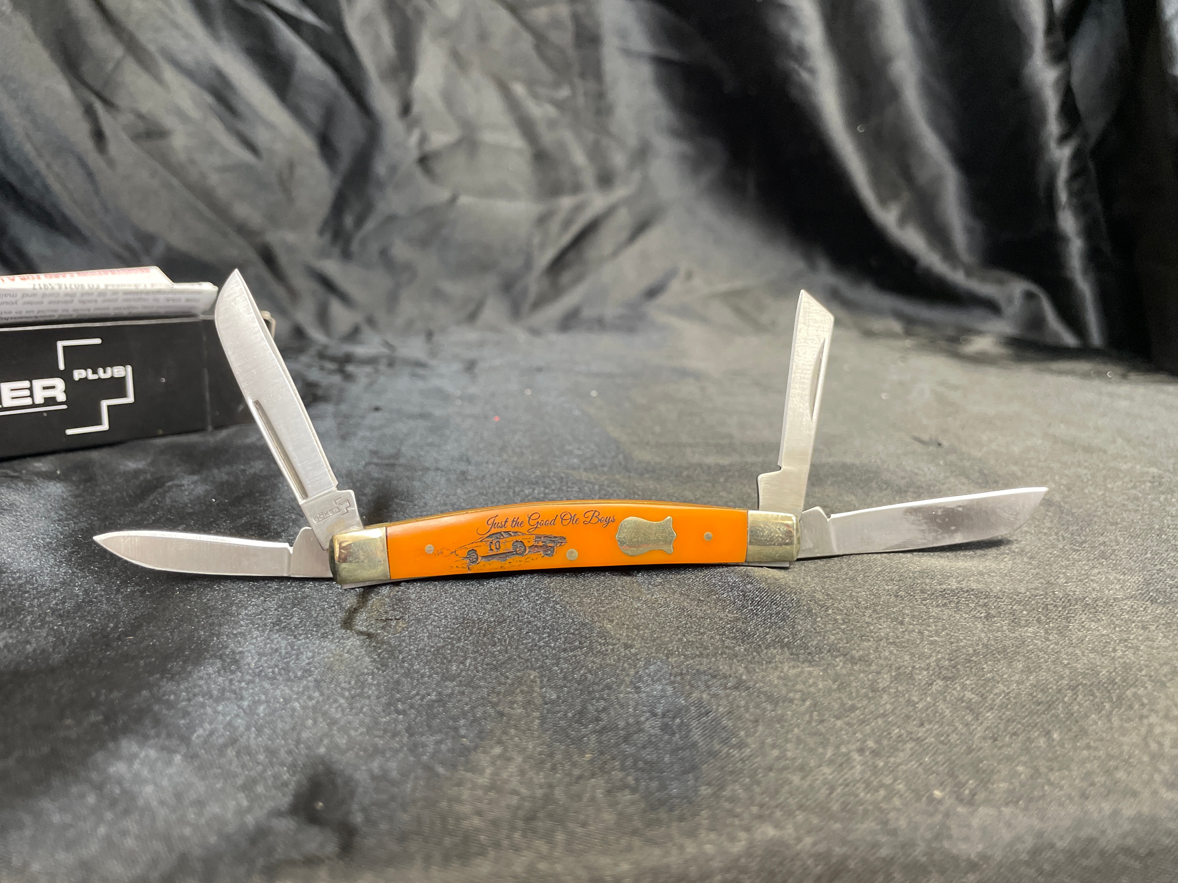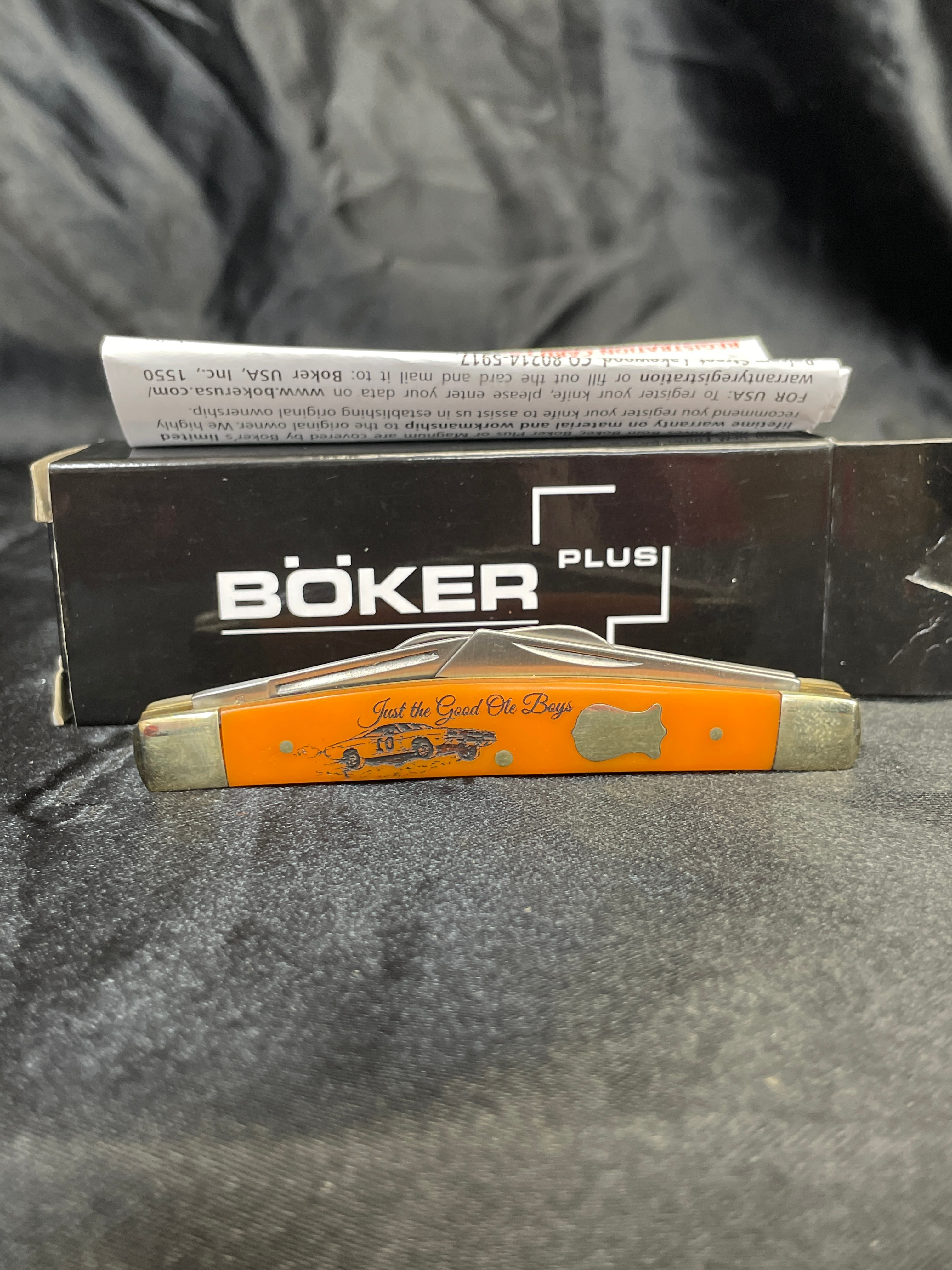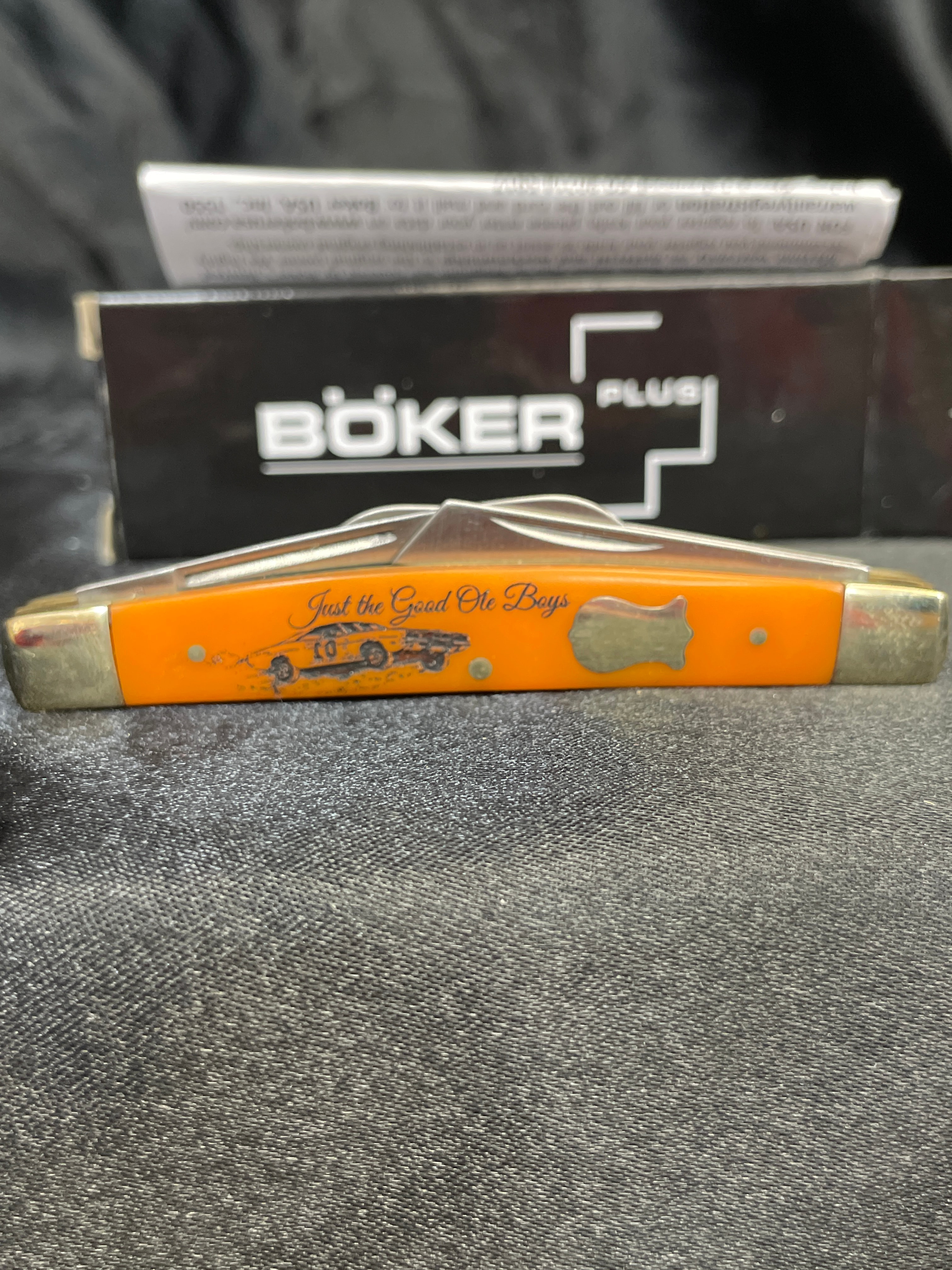 A Boker Plus multi-blade folding pocket knife, featuring an orange handle with brass-toned bolsters and three polished stainless steel blades. The scales are decorated with a printed graphic depicting a race car (marked with “10”) and a map-like outline, accompanied by the English text “Just the Good Ole Boys,” strongly suggesting a theme related to “The Dukes of Hazzard” and the General Lee. The main blade tang is clearly marked “BÖKER PLUS,” “0260,” and “440C.” The knife is presented in its original Boker Plus branded box with a partial warranty registration insert visible.