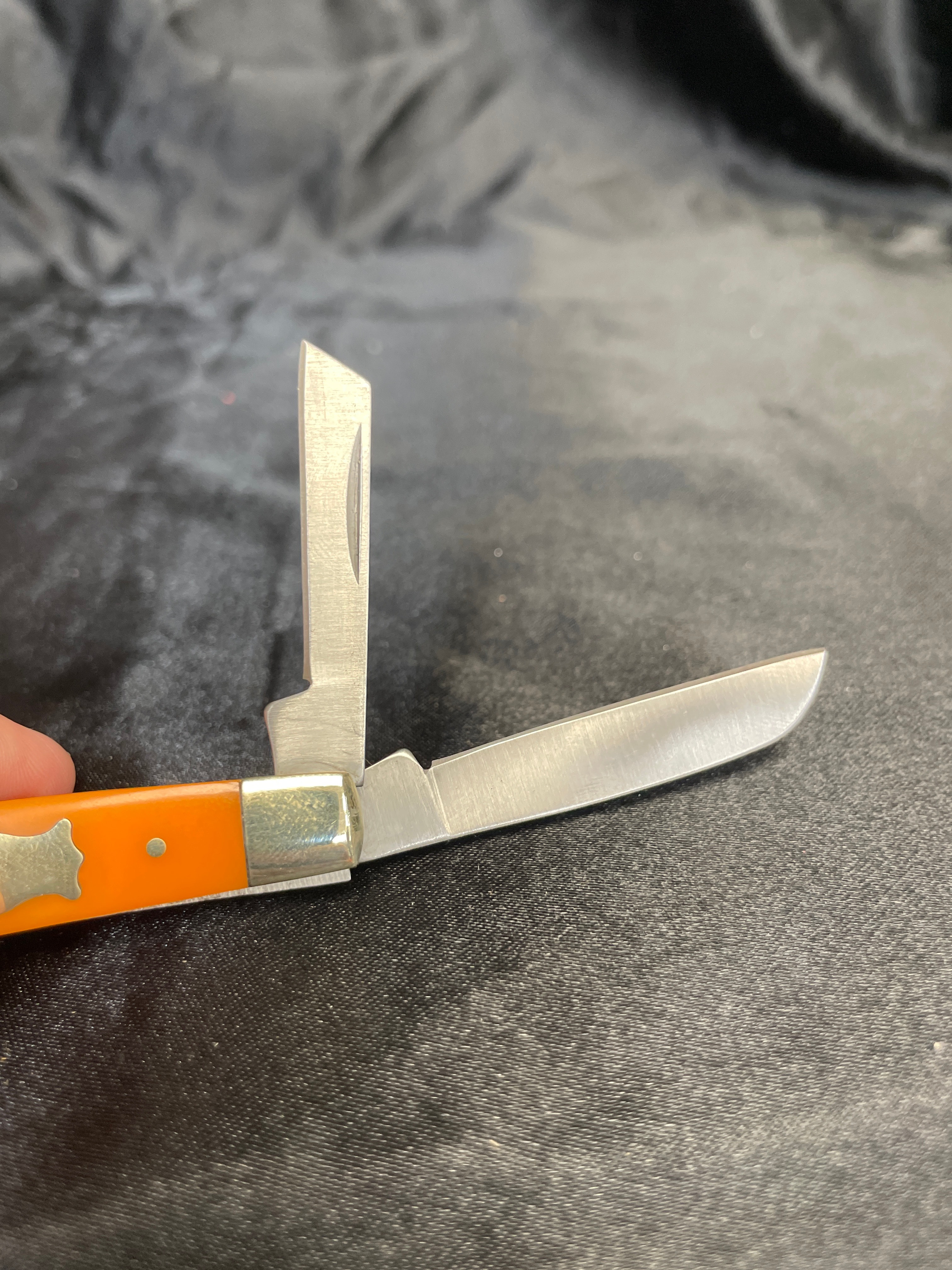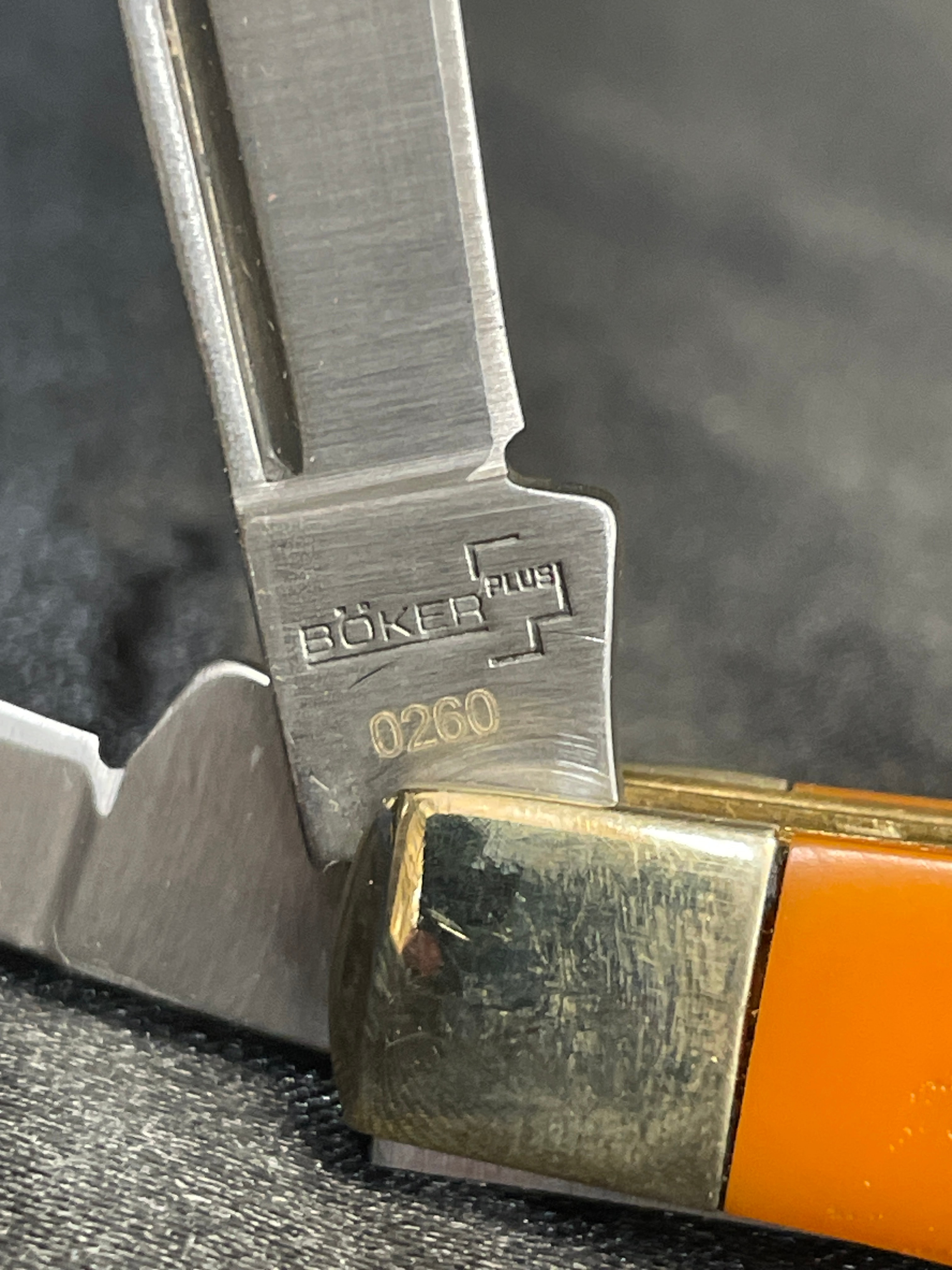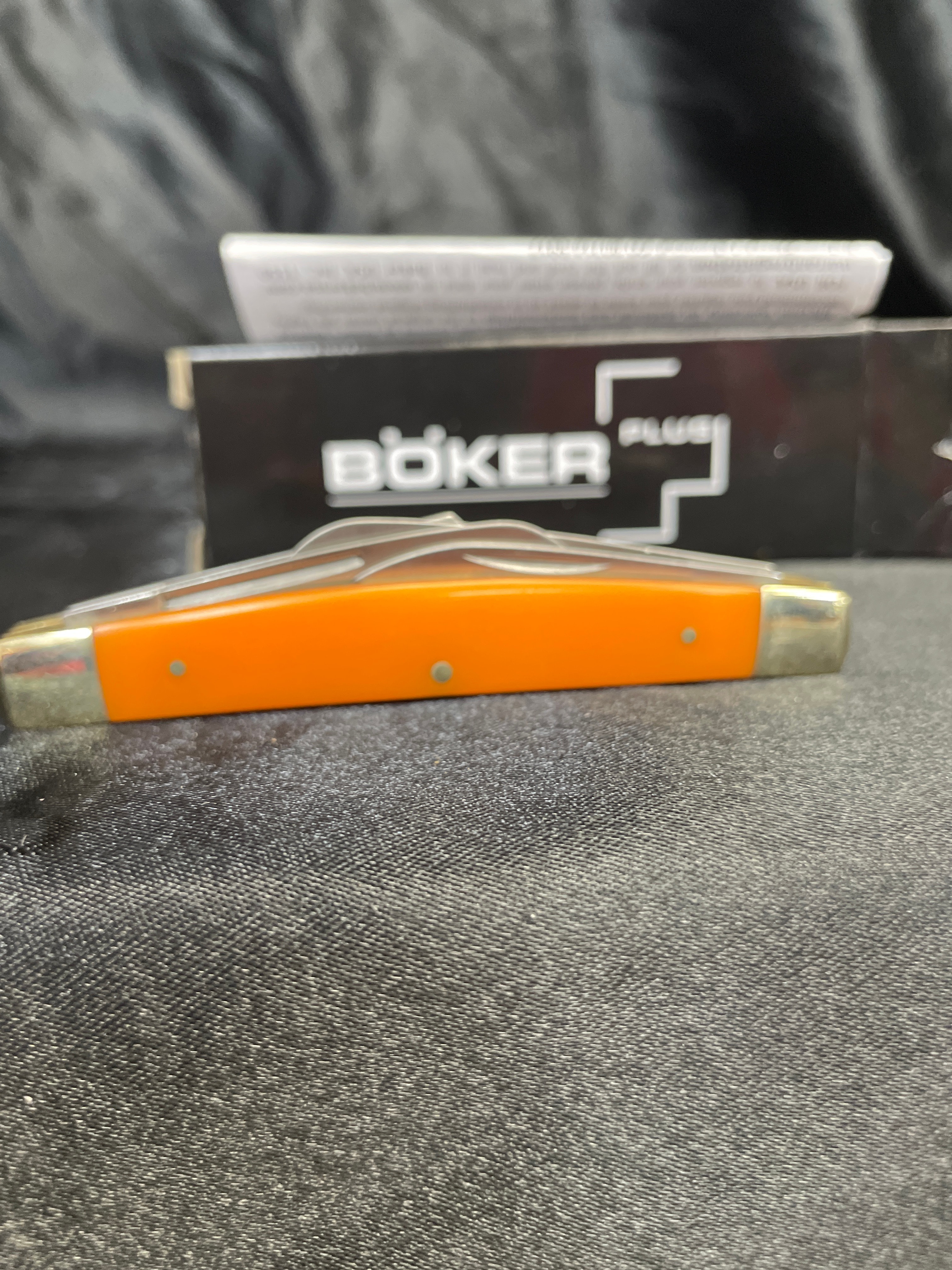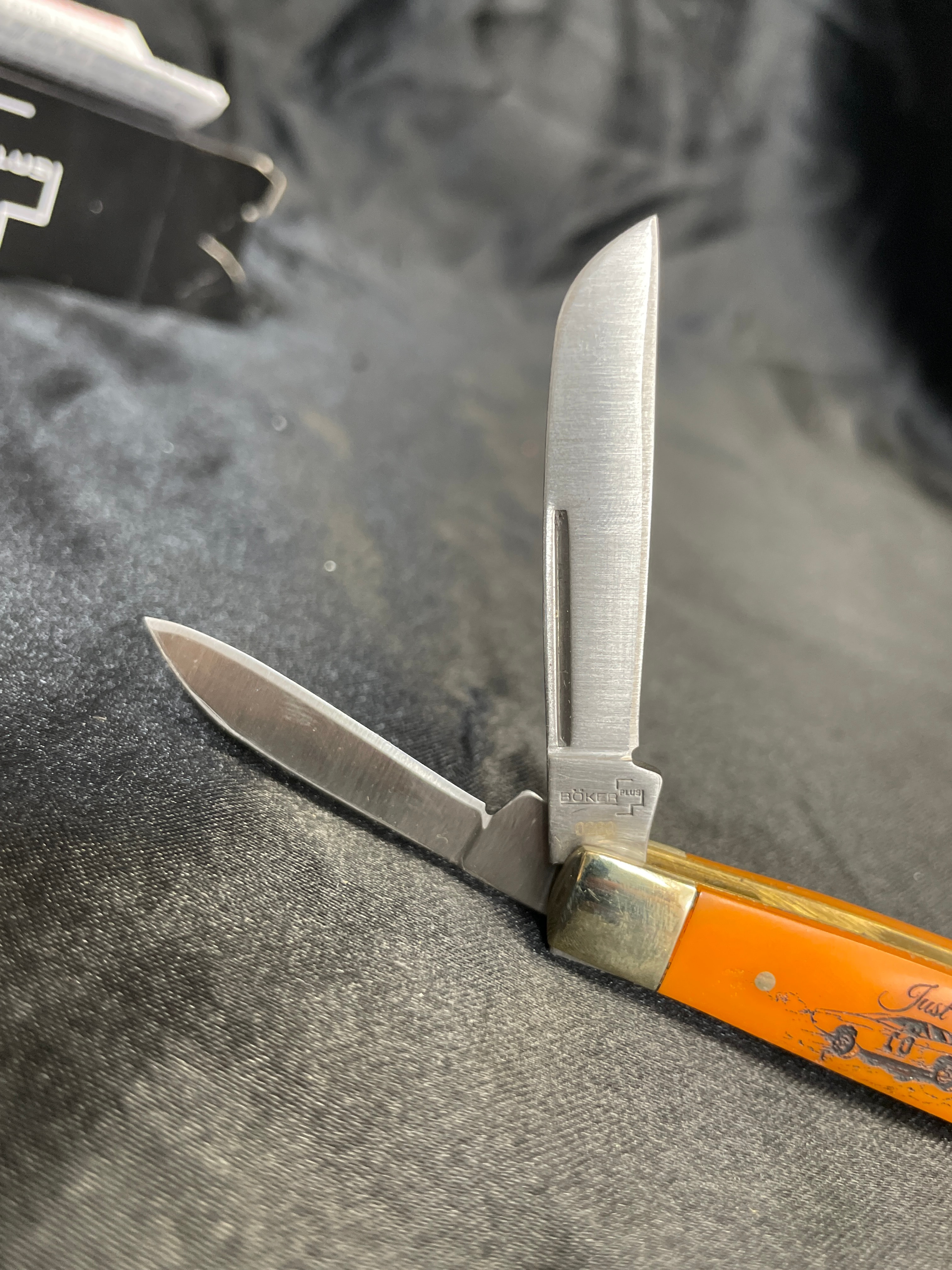A Boker Plus multi-blade folding pocket knife, featuring an orange handle with brass-toned bolsters and three polished stainless steel blades. The scales are decorated with a printed graphic depicting a race car (marked with “10”) and a map-like outline, accompanied by the English text “Just the Good Ole Boys,” strongly suggesting a theme related to “The Dukes of Hazzard” and the General Lee. The main blade tang is clearly marked “BÖKER PLUS,” “0260,” and “440C.” The knife is presented in its original Boker Plus branded box with a partial warranty registration insert visible.