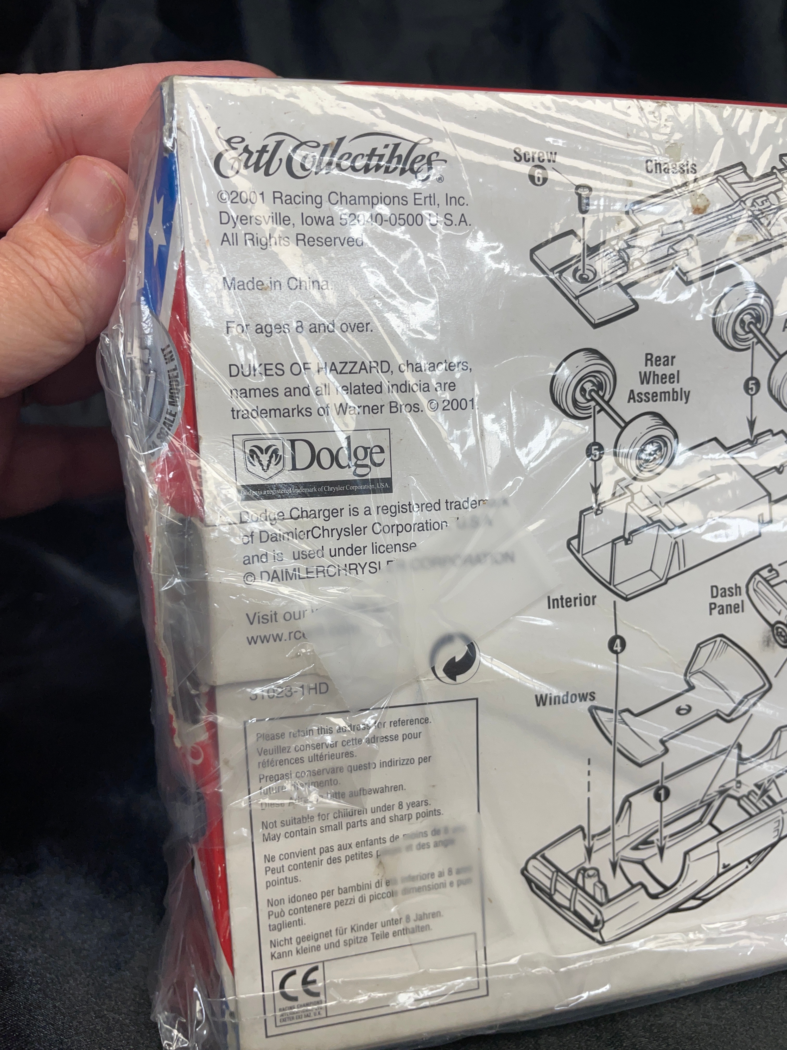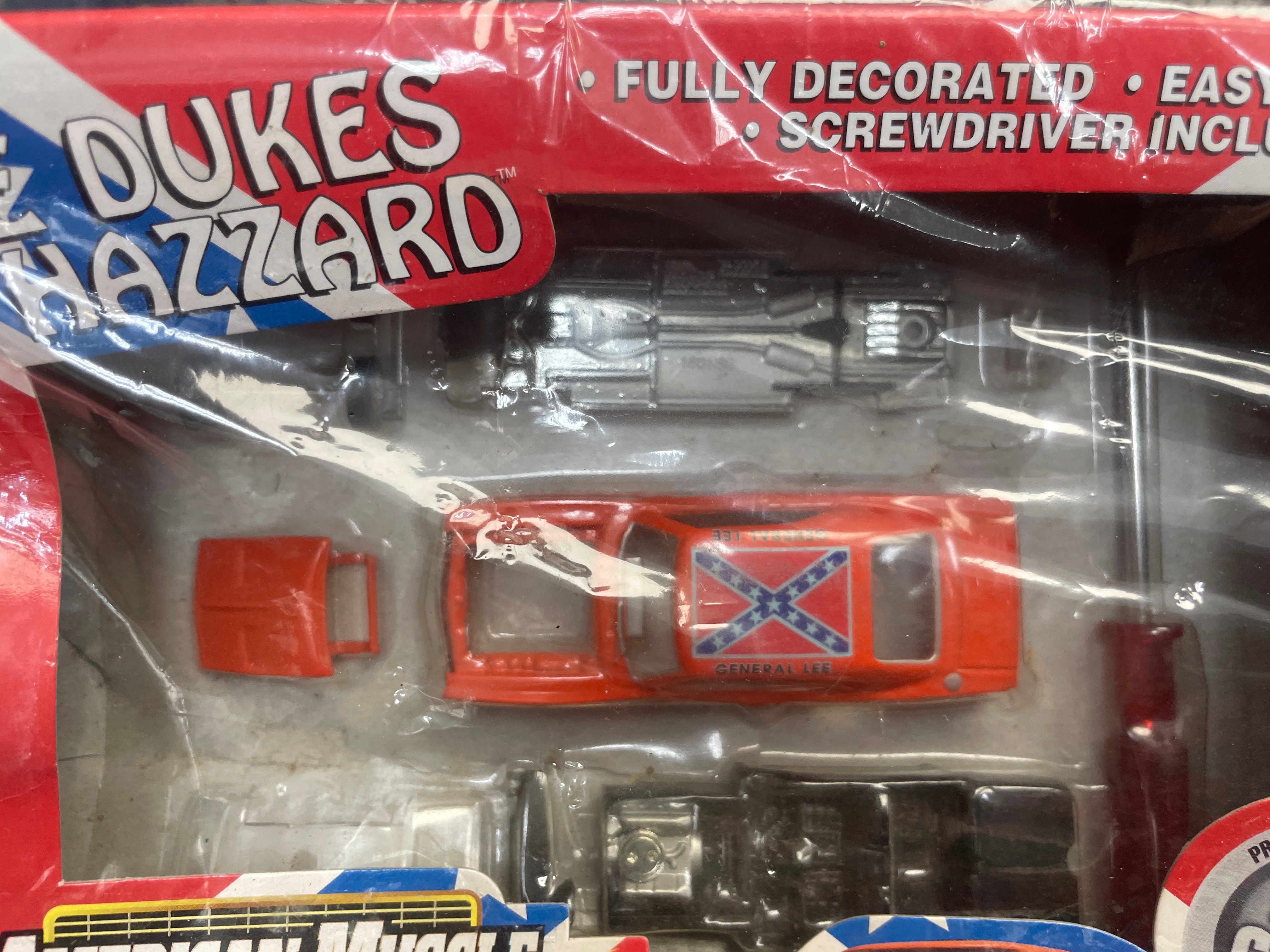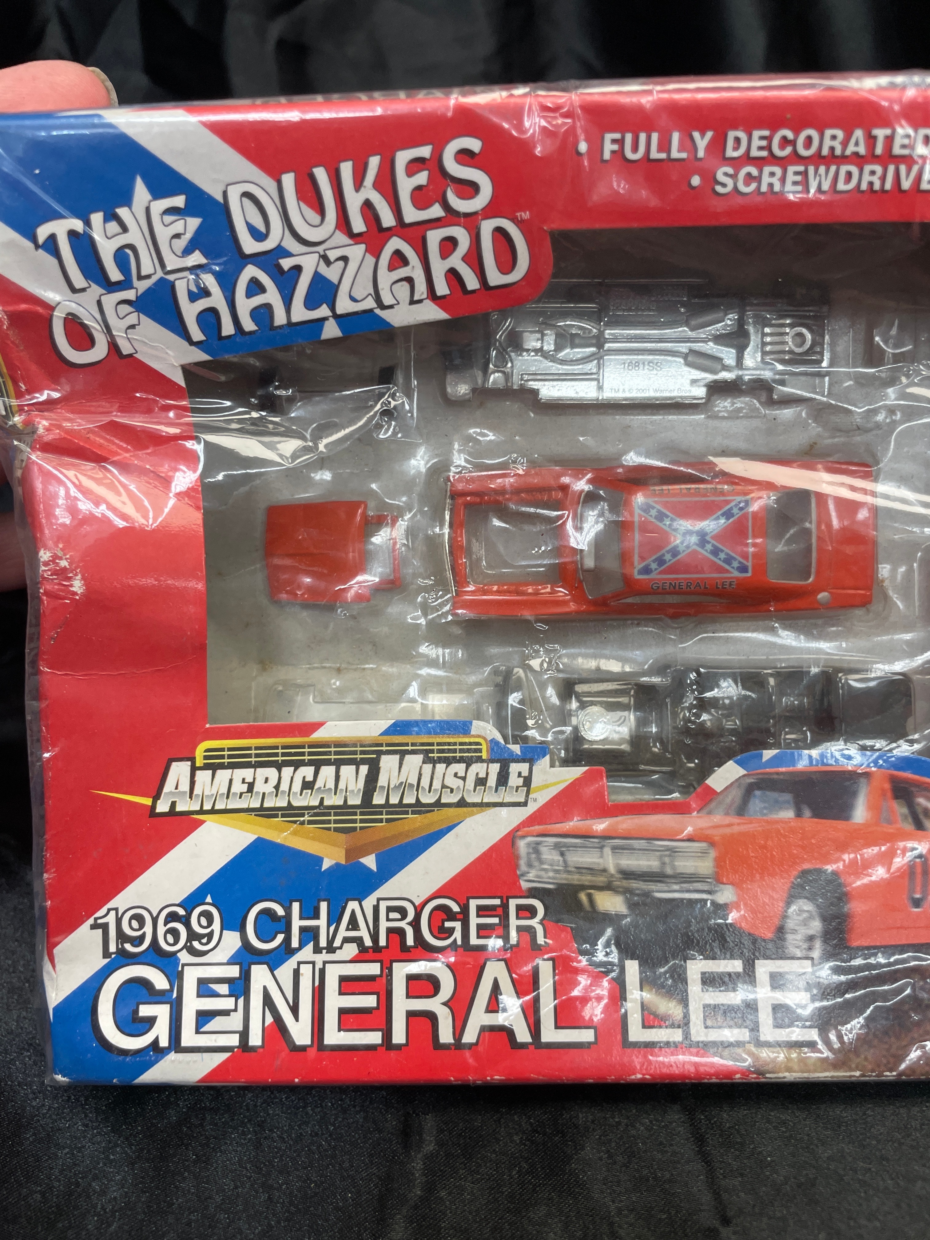 An ERTL American Muscle The Dukes of Hazzard 1969 Dodge Charger General Lee 1:64 scale die-cast model kit, copyrighted 2001 by Racing Champions Ertl, Inc. and Warner Bros. This kit is designed for ages 8 and over and includes a prepainted metal body, additional plastic components, and a screwdriver for easy assembly. The model car’s visible components feature a pre-painted orange body with a Confederate flag graphic and “GENERAL LEE” text on the roof, along with silver-colored chassis and engine parts. The item is presented in its original brightly colored cardboard packaging with patriotic red, white, and blue stripes and the “Dodge” logo. Text on the reverse indicates “Made in China” and provides multi-language safety warnings, including in English, French, Italian, and German, stating the item is “Not suitable for children under 8 years. May contain small parts and sharp points.”