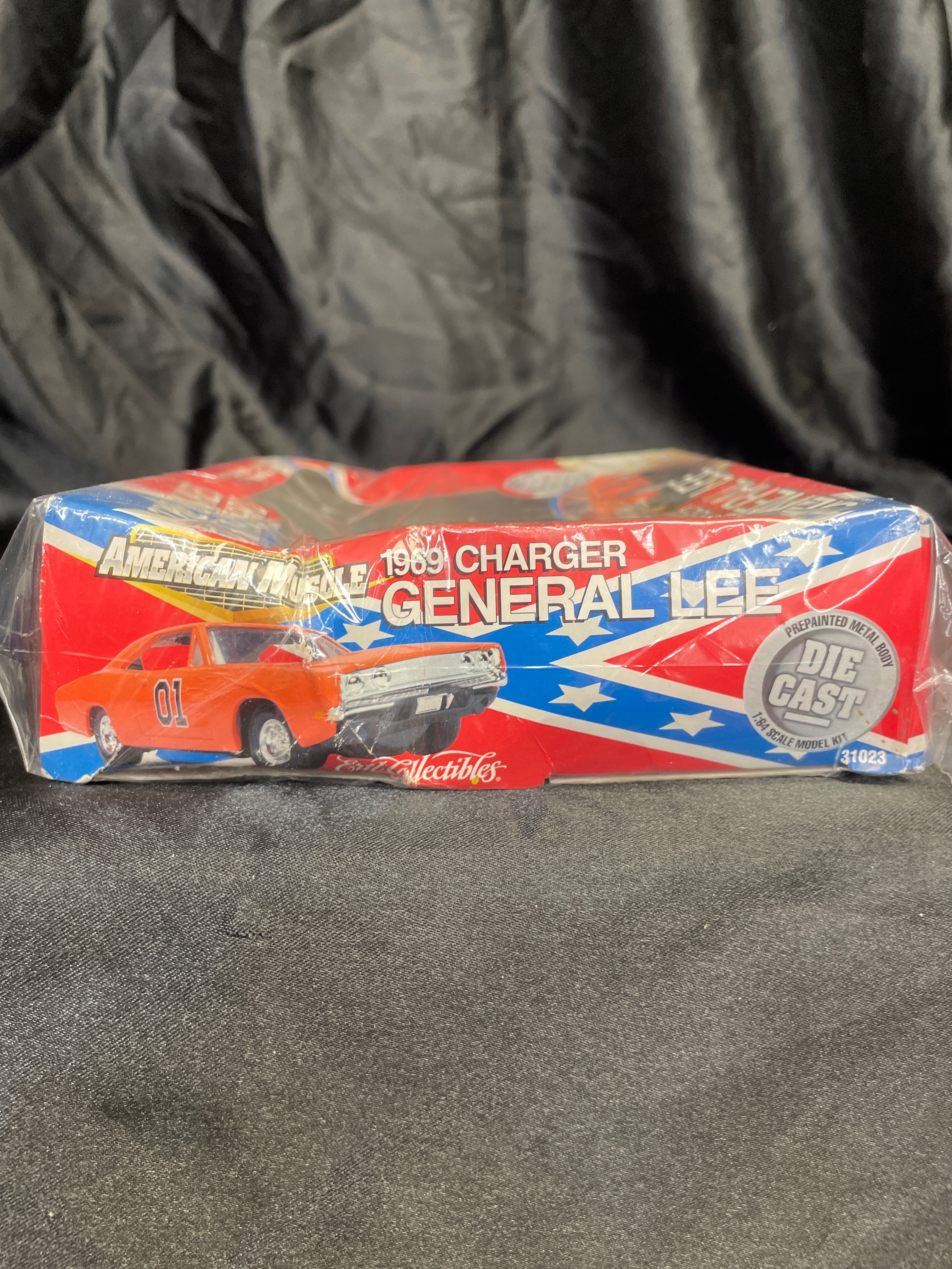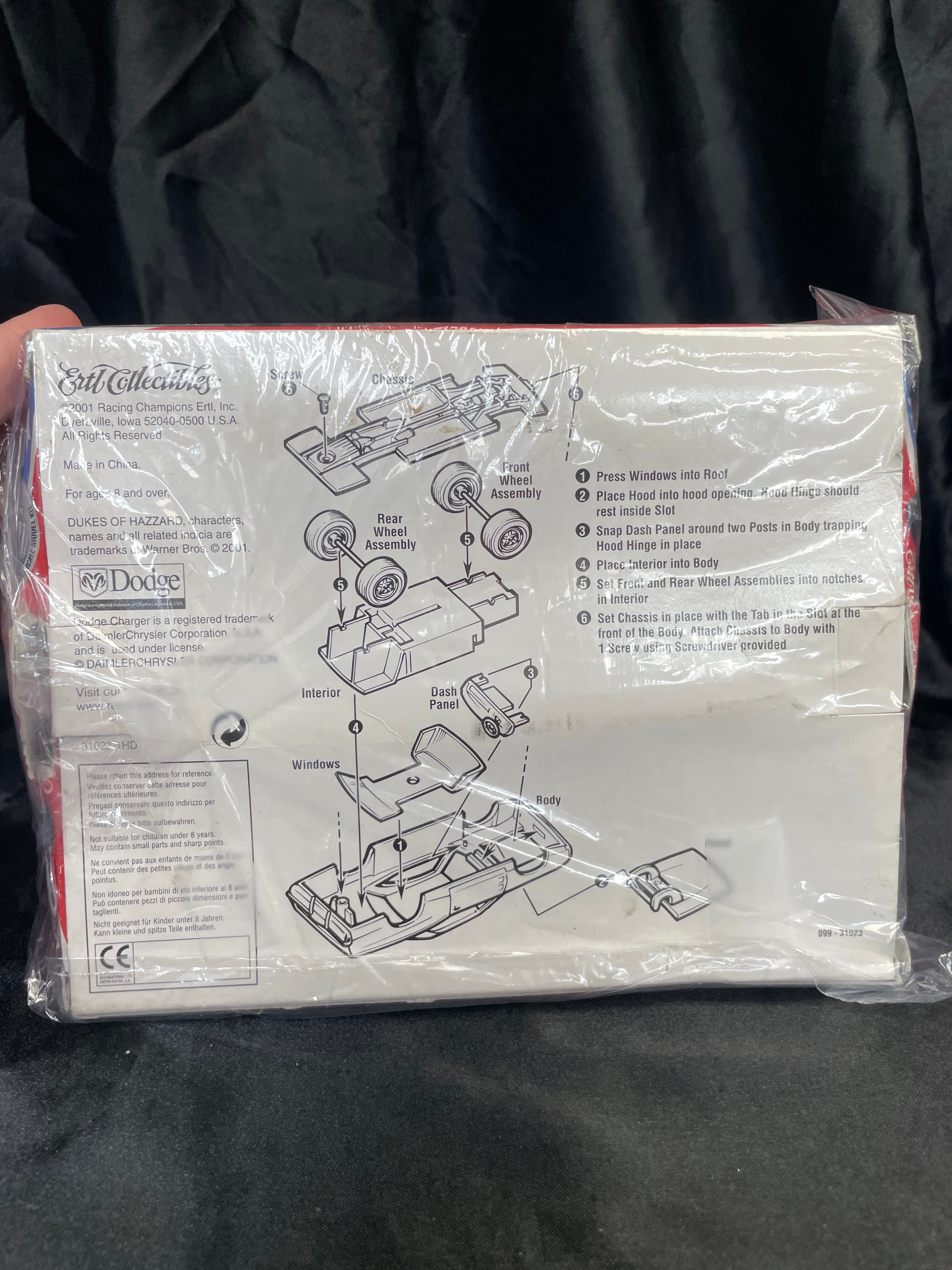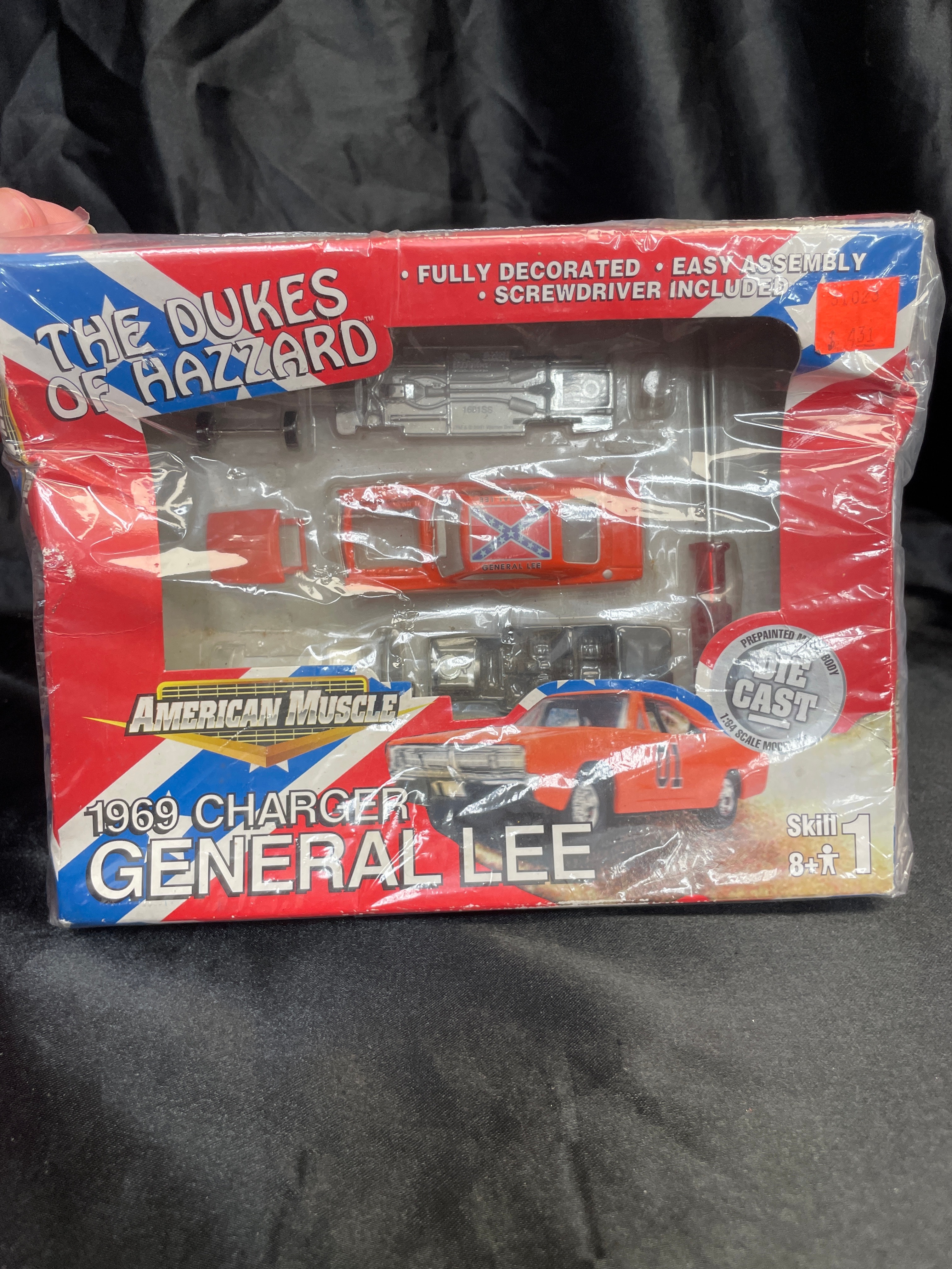 An ERTL American Muscle The Dukes of Hazzard 1969 Dodge Charger General Lee 1:64 scale die-cast model kit, copyrighted 2001 by Racing Champions Ertl, Inc. and Warner Bros. This kit is designed for ages 8 and over and includes a prepainted metal body, additional plastic components, and a screwdriver for easy assembly. The model car’s visible components feature a pre-painted orange body with a Confederate flag graphic and “GENERAL LEE” text on the roof, along with silver-colored chassis and engine parts. The item is presented in its original brightly colored cardboard packaging with patriotic red, white, and blue stripes and the “Dodge” logo. Text on the reverse indicates “Made in China” and provides multi-language safety warnings, including in English, French, Italian, and German, stating the item is “Not suitable for children under 8 years. May contain small parts and sharp points.”