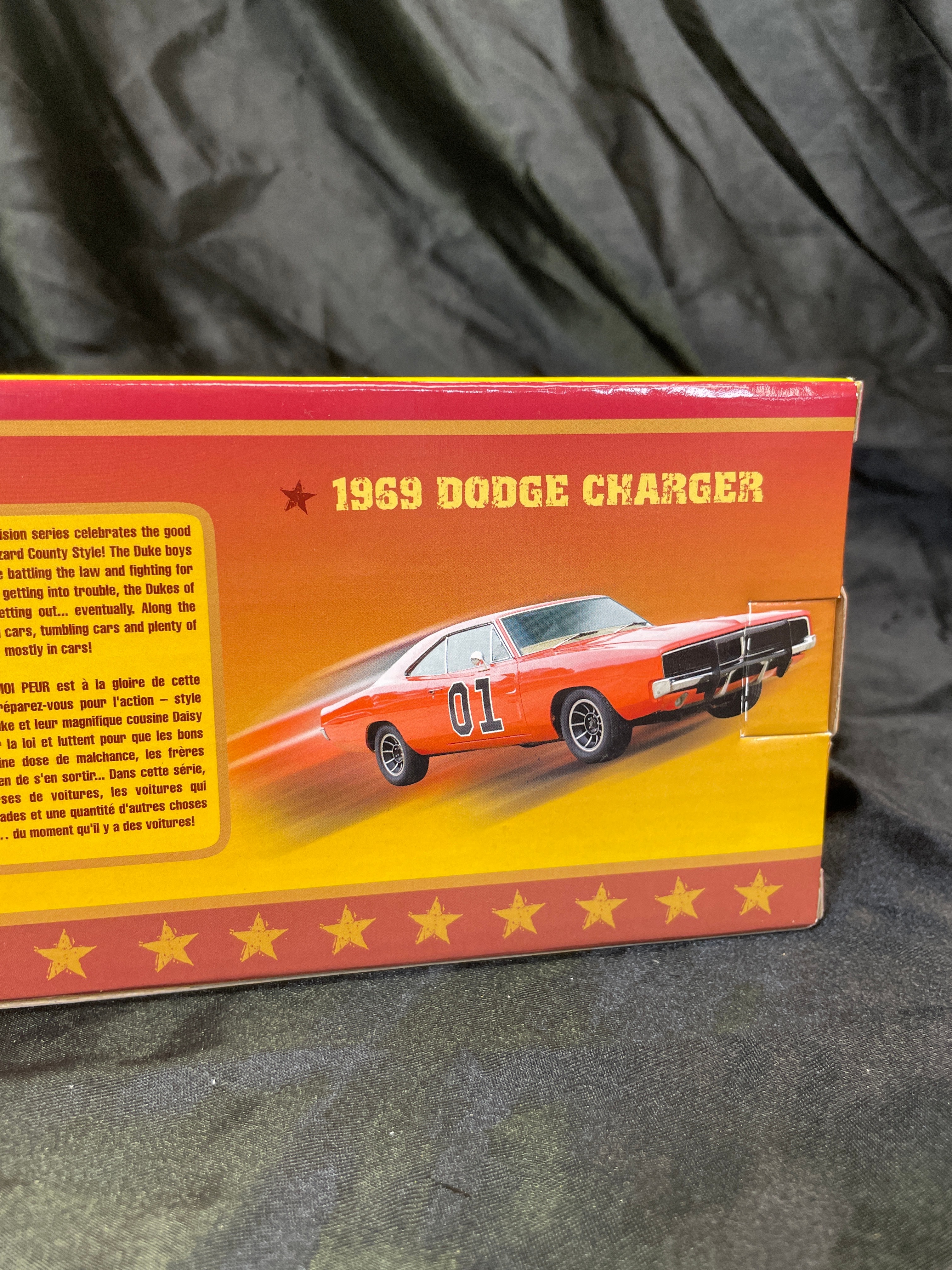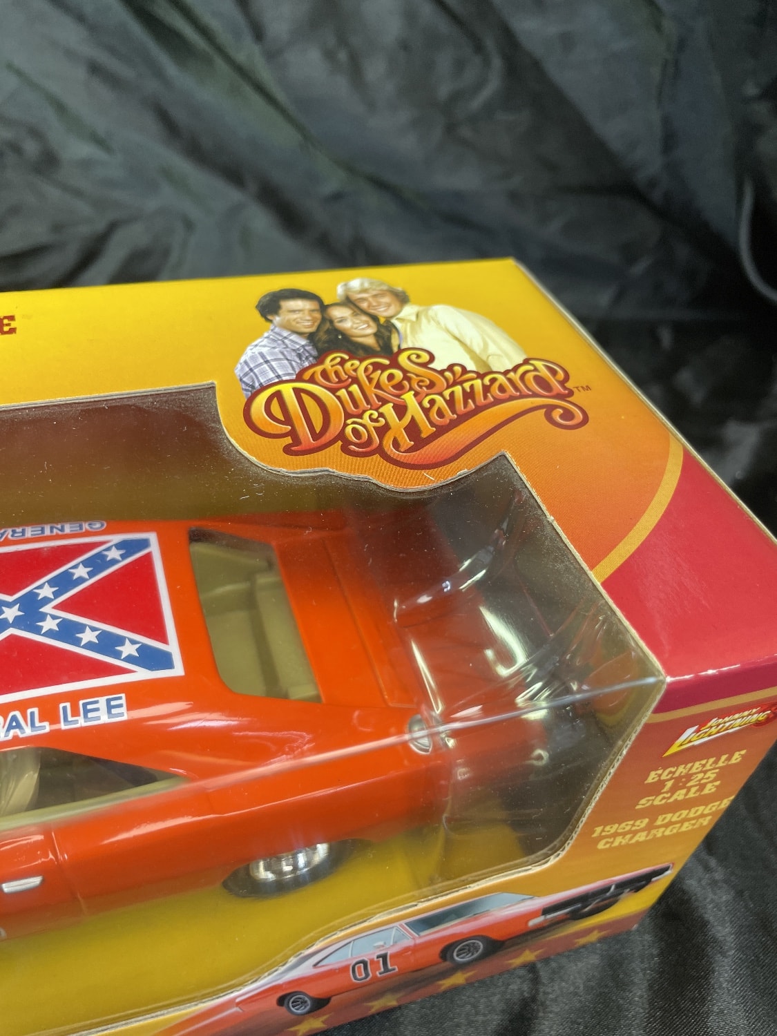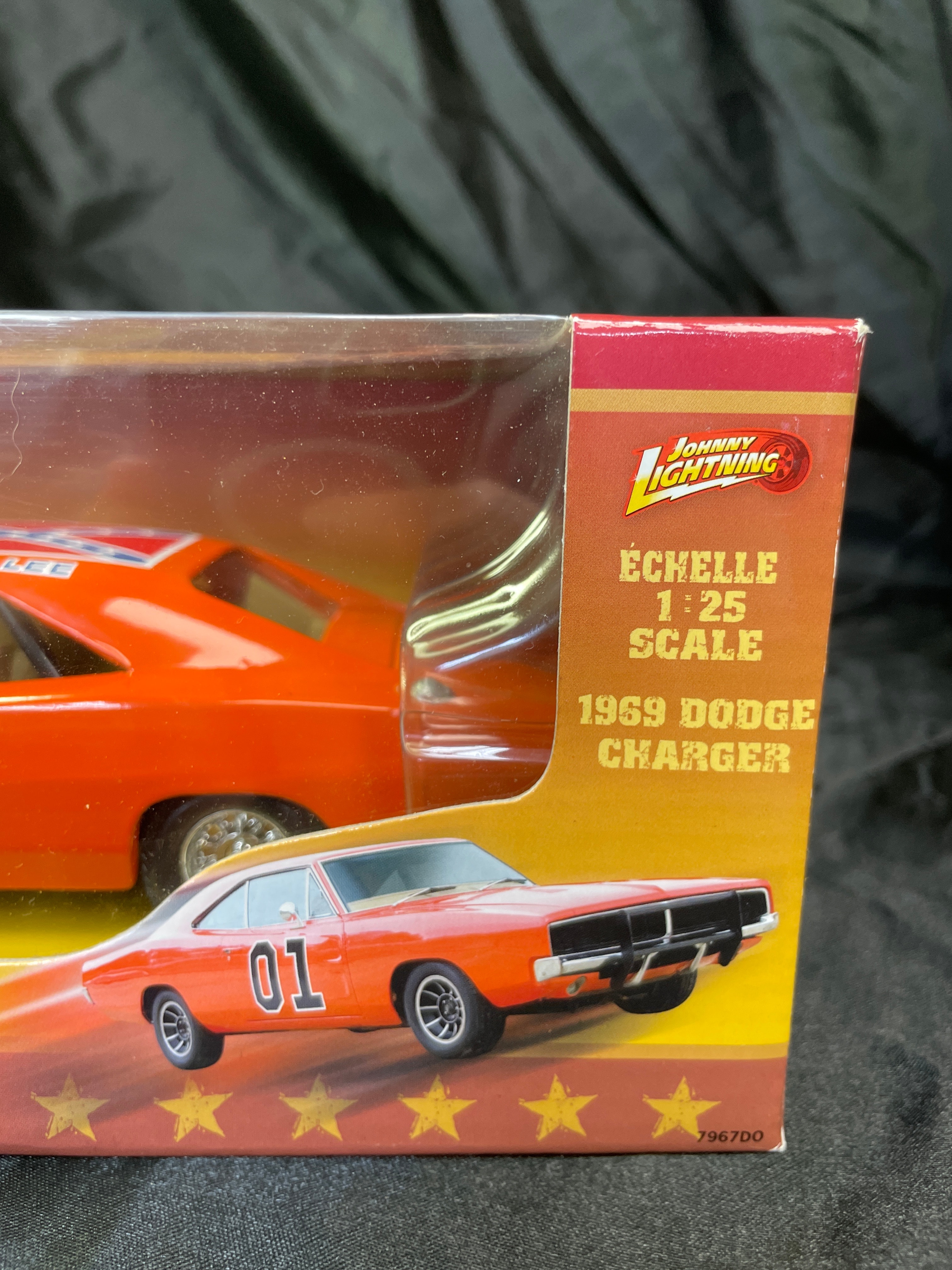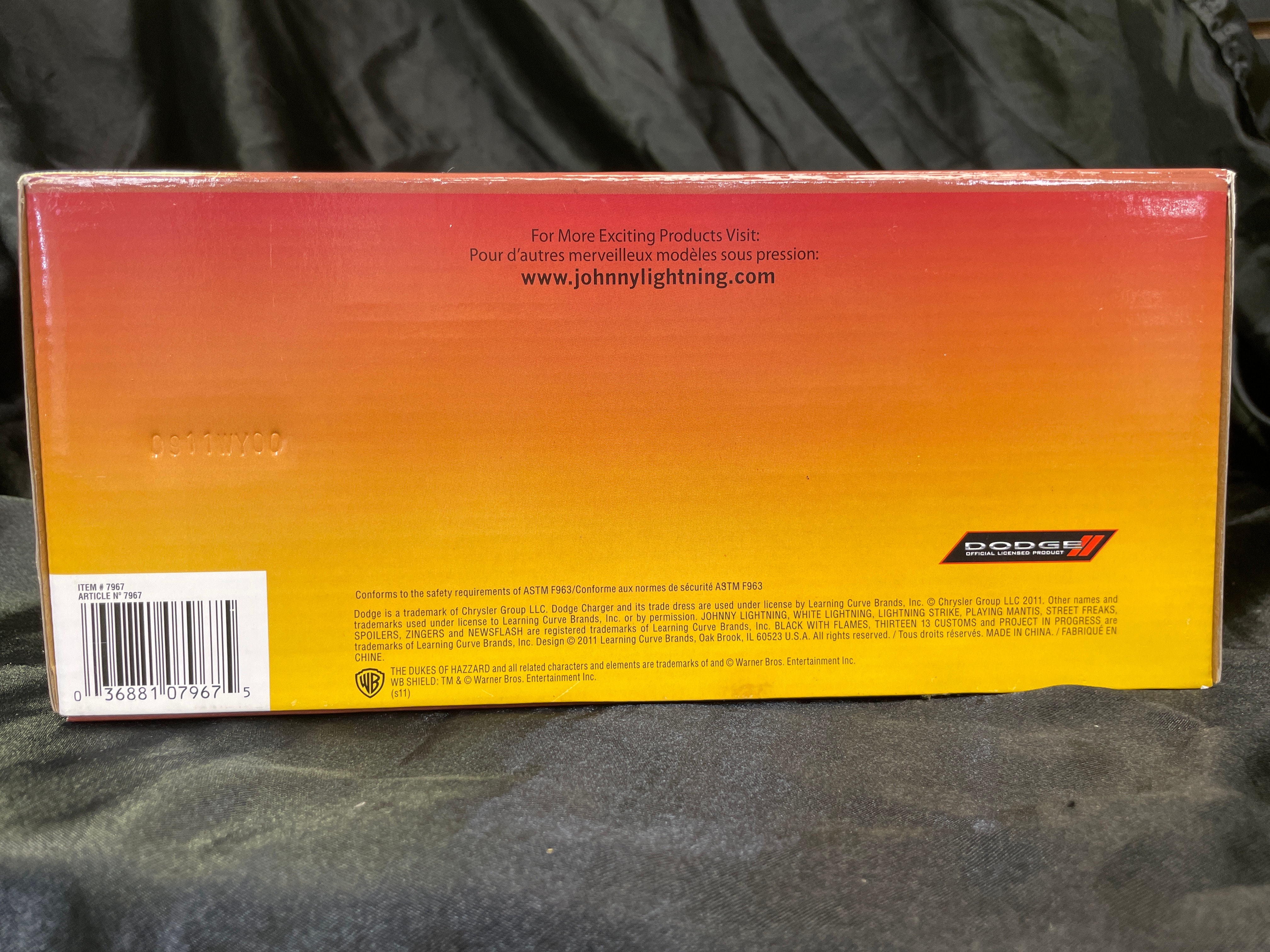 A Johnny Lightning ‘The Dukes of Hazzard’ General Lee 1969 Dodge Charger 1:25 scale die-cast metal model. The model features a bright orange finish with “01” on the doors and a depiction of the Confederate battle flag with “GENERAL LEE” on the roof. It has an opening hood revealing engine details. The item is presented new in its original clear plastic and cardboard box. The packaging is themed after “The Dukes of Hazzard” television series (known as “Shérif, Fais-moi Peur!” in French), prominently displaying character images, series branding, and identifies the item as “ITEM # 7967.” It was produced in China under a 2011 copyright by Learning Curve Brands and Warner Bros. Entertainment Inc.