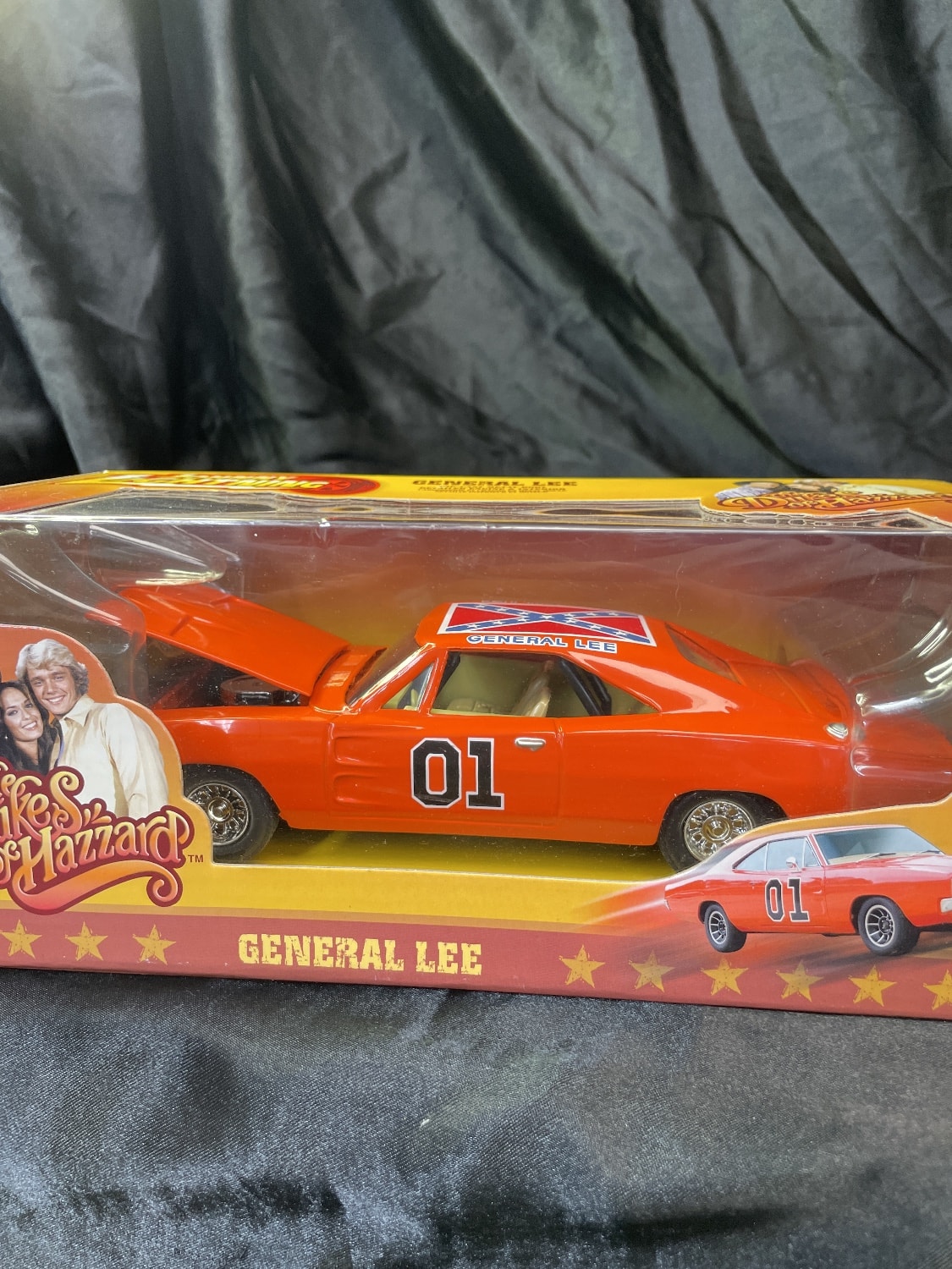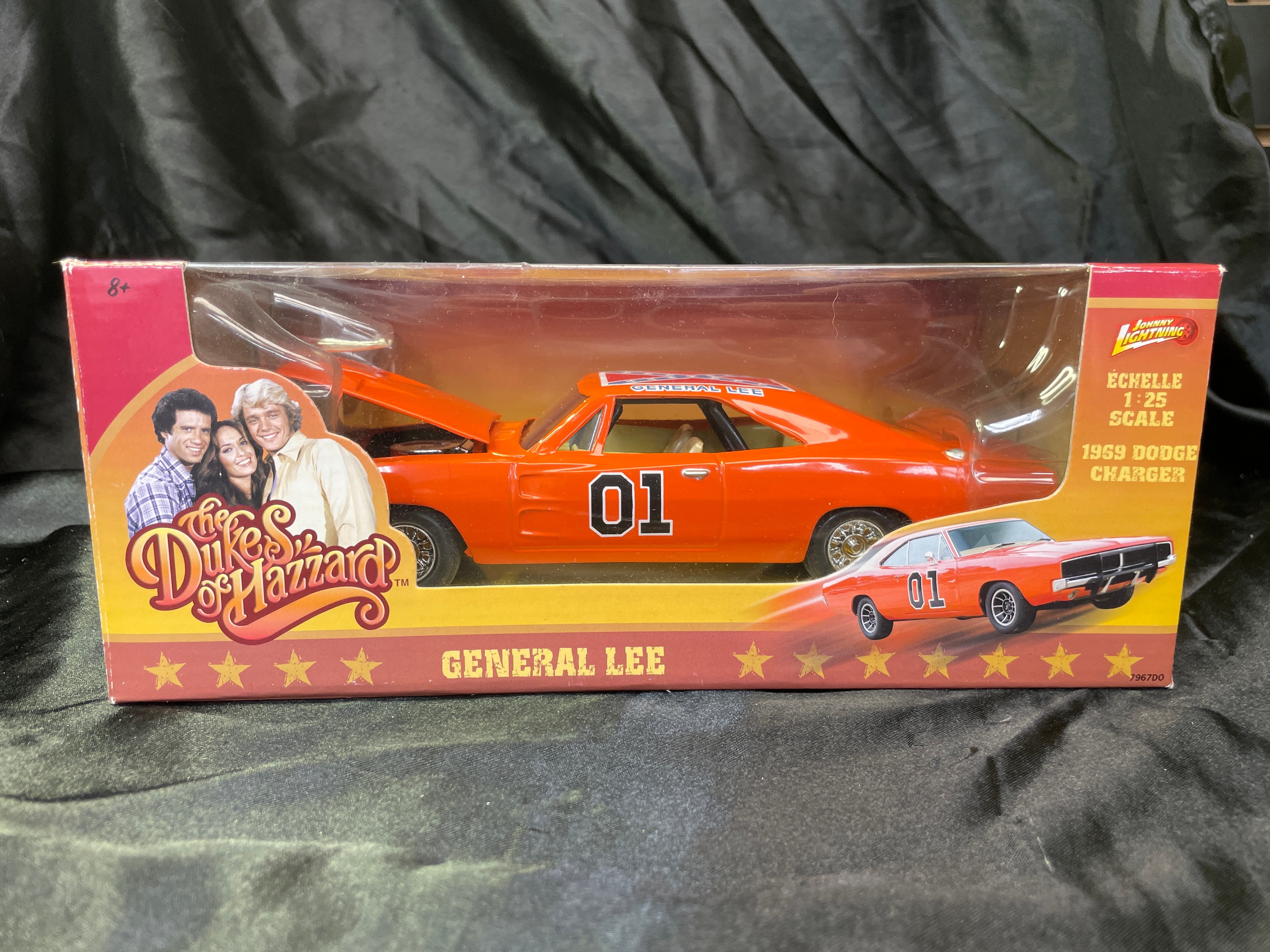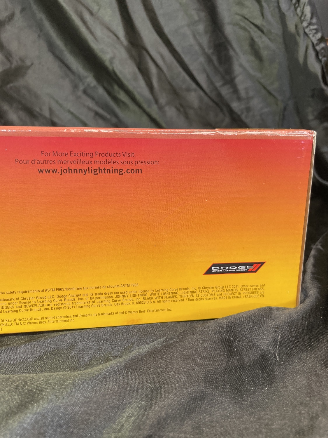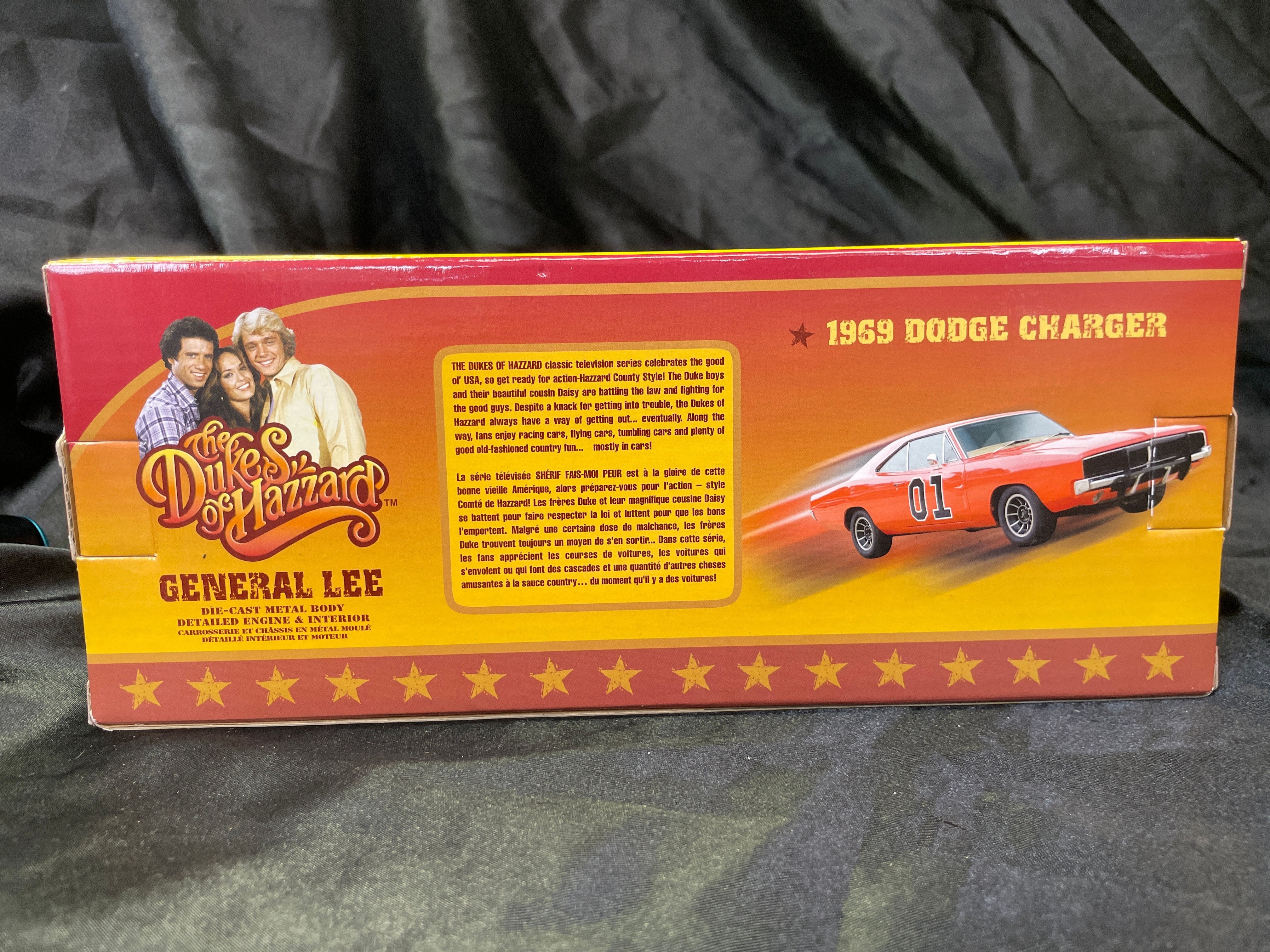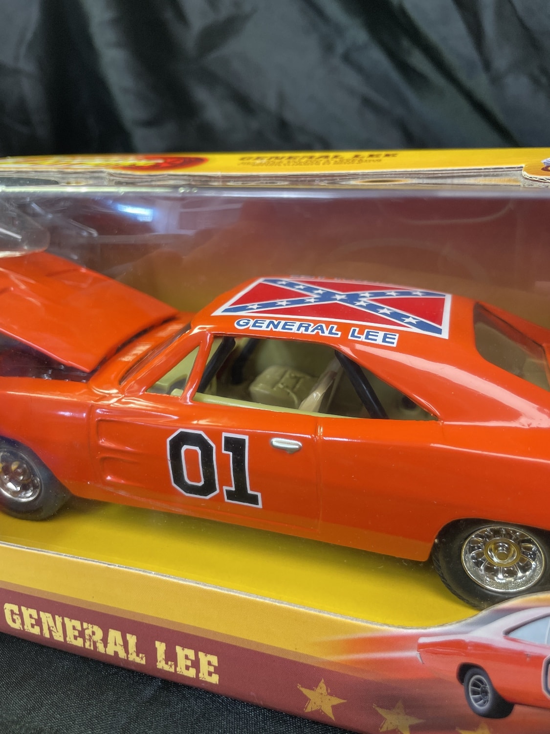 A Johnny Lightning ‘The Dukes of Hazzard’ General Lee 1969 Dodge Charger 1:25 scale die-cast metal model. The model features a bright orange finish with “01” on the doors and a depiction of the Confederate battle flag with “GENERAL LEE” on the roof. It has an opening hood revealing engine details. The item is presented new in its original clear plastic and cardboard box. The packaging is themed after “The Dukes of Hazzard” television series (known as “Shérif, Fais-moi Peur!” in French), prominently displaying character images, series branding, and identifies the item as “ITEM # 7967.” It was produced in China under a 2011 copyright by Learning Curve Brands and Warner Bros. Entertainment Inc.