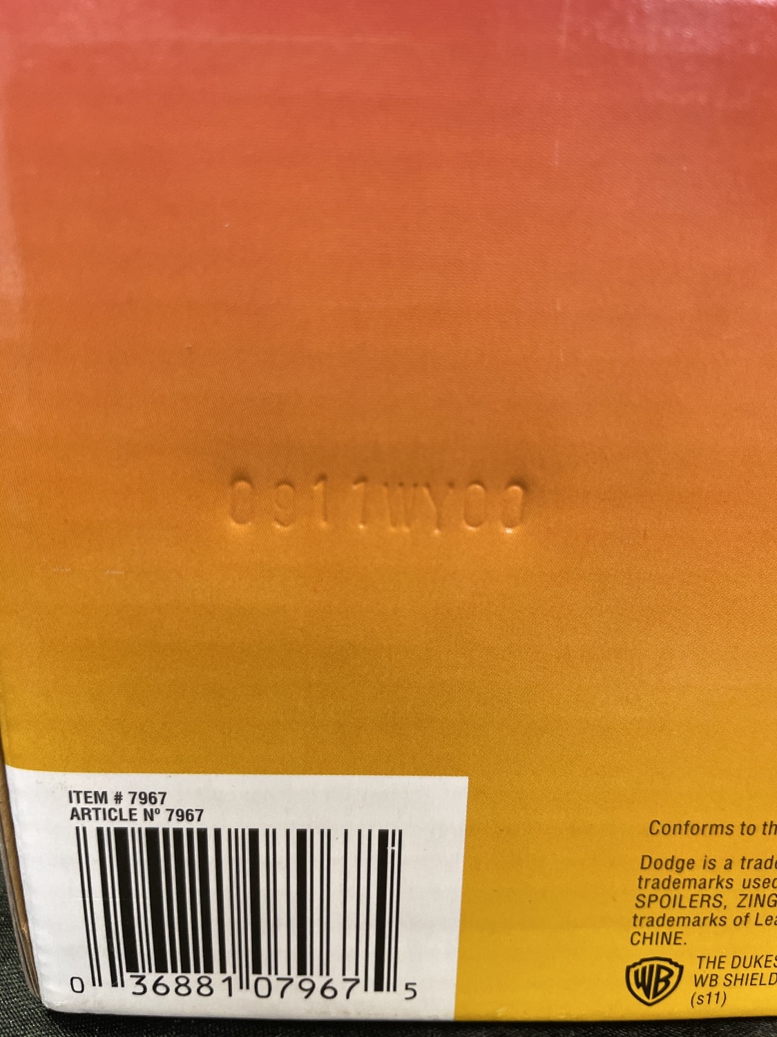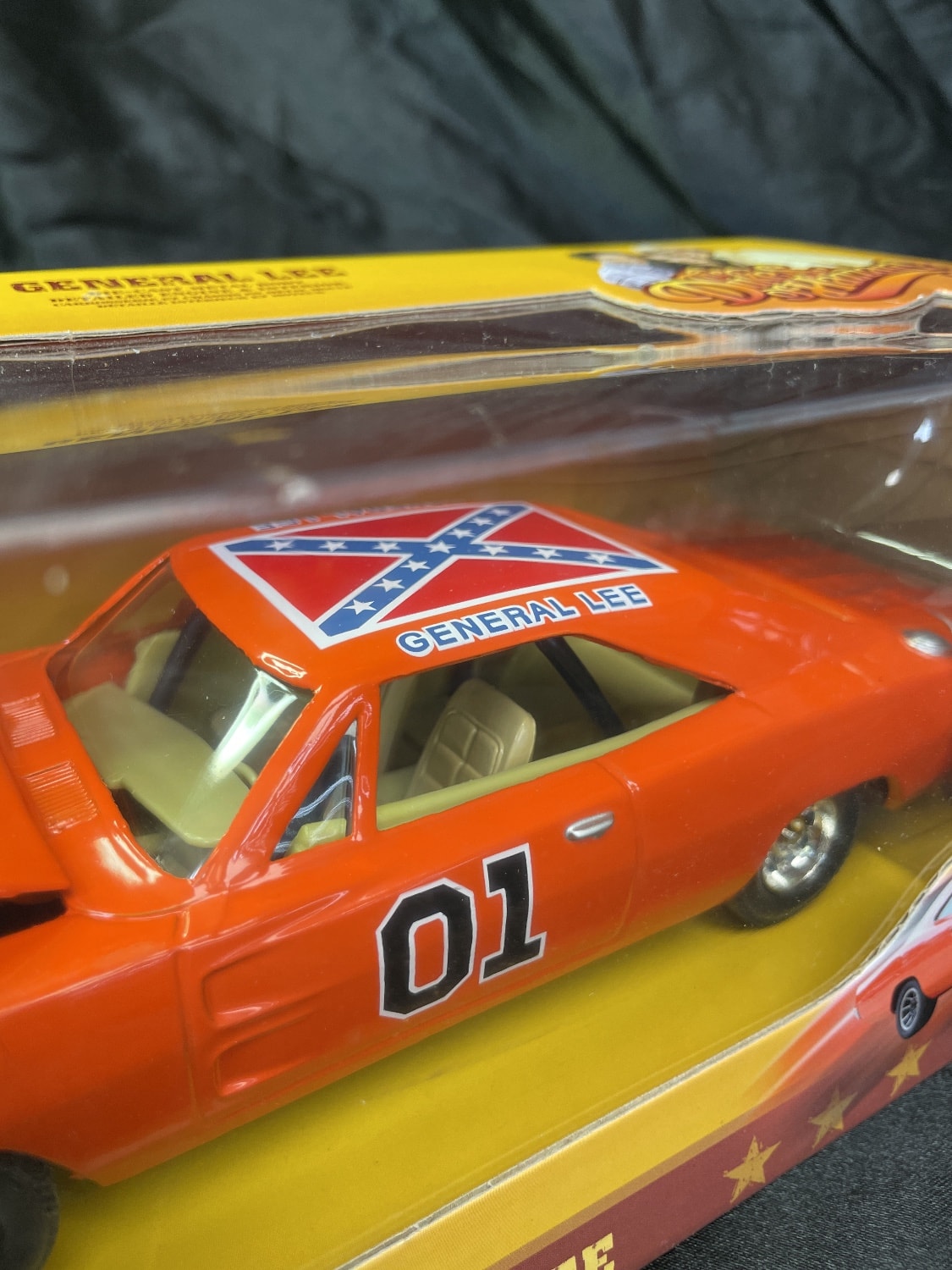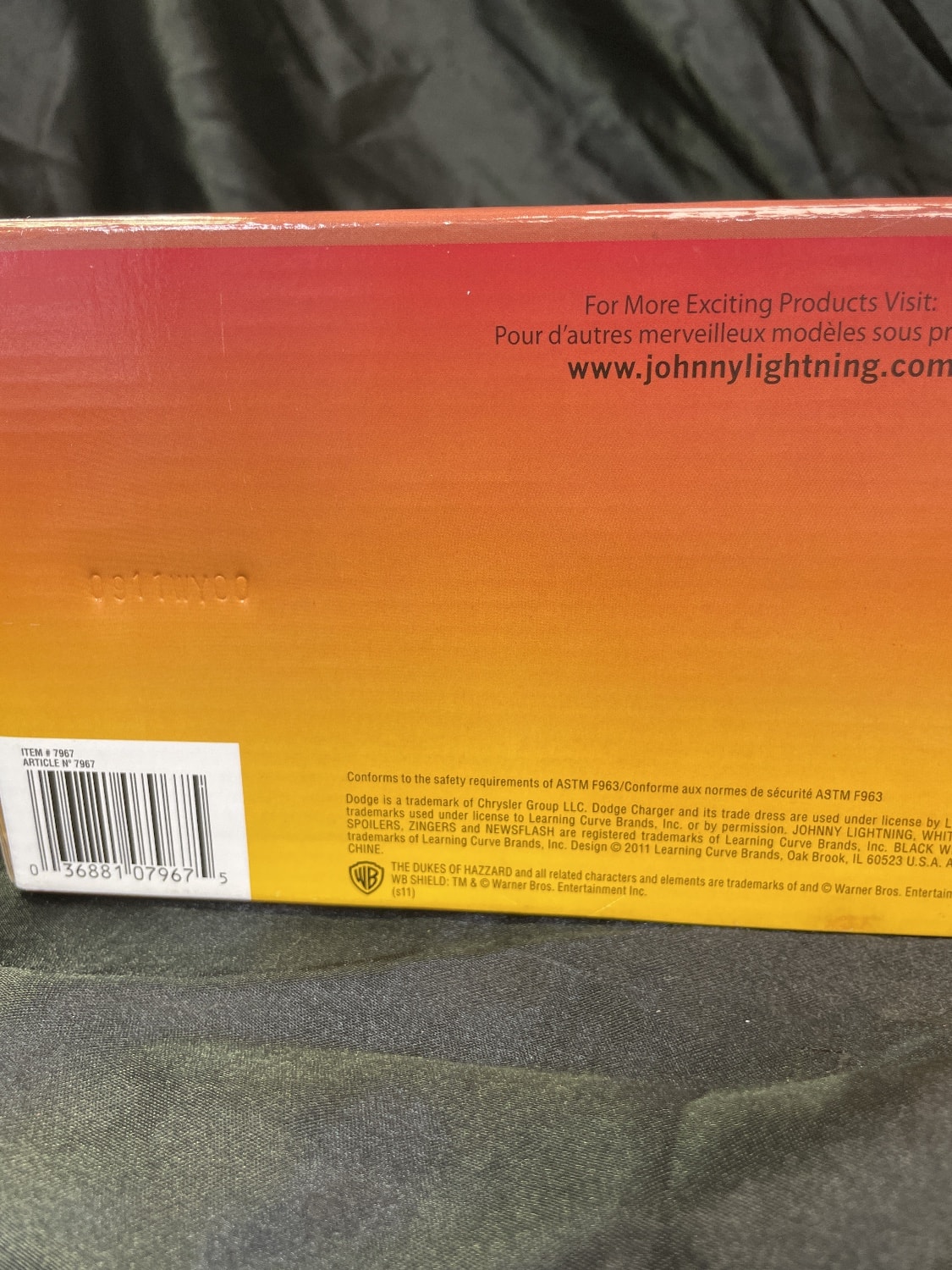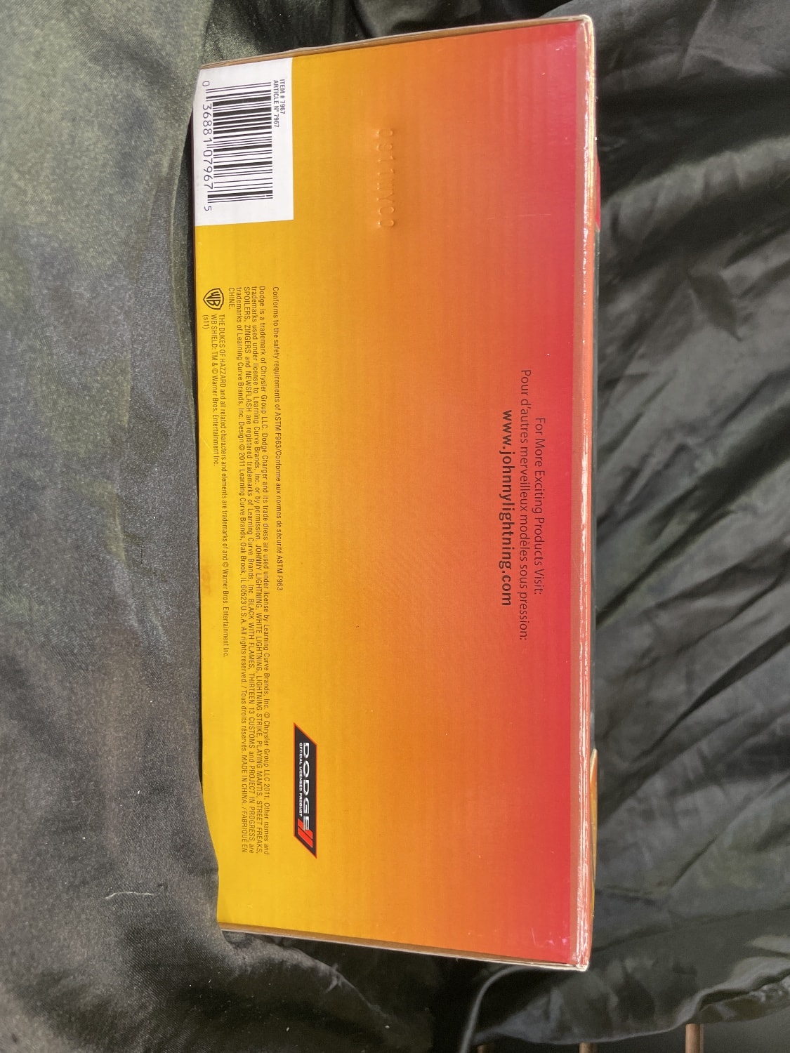 A Johnny Lightning ‘The Dukes of Hazzard’ General Lee 1969 Dodge Charger 1:25 scale die-cast metal model. The model features a bright orange finish with “01” on the doors and a depiction of the Confederate battle flag with “GENERAL LEE” on the roof. It has an opening hood revealing engine details. The item is presented new in its original clear plastic and cardboard box. The packaging is themed after “The Dukes of Hazzard” television series (known as “Shérif, Fais-moi Peur!” in French), prominently displaying character images, series branding, and identifies the item as “ITEM # 7967.” It was produced in China under a 2011 copyright by Learning Curve Brands and Warner Bros. Entertainment Inc.